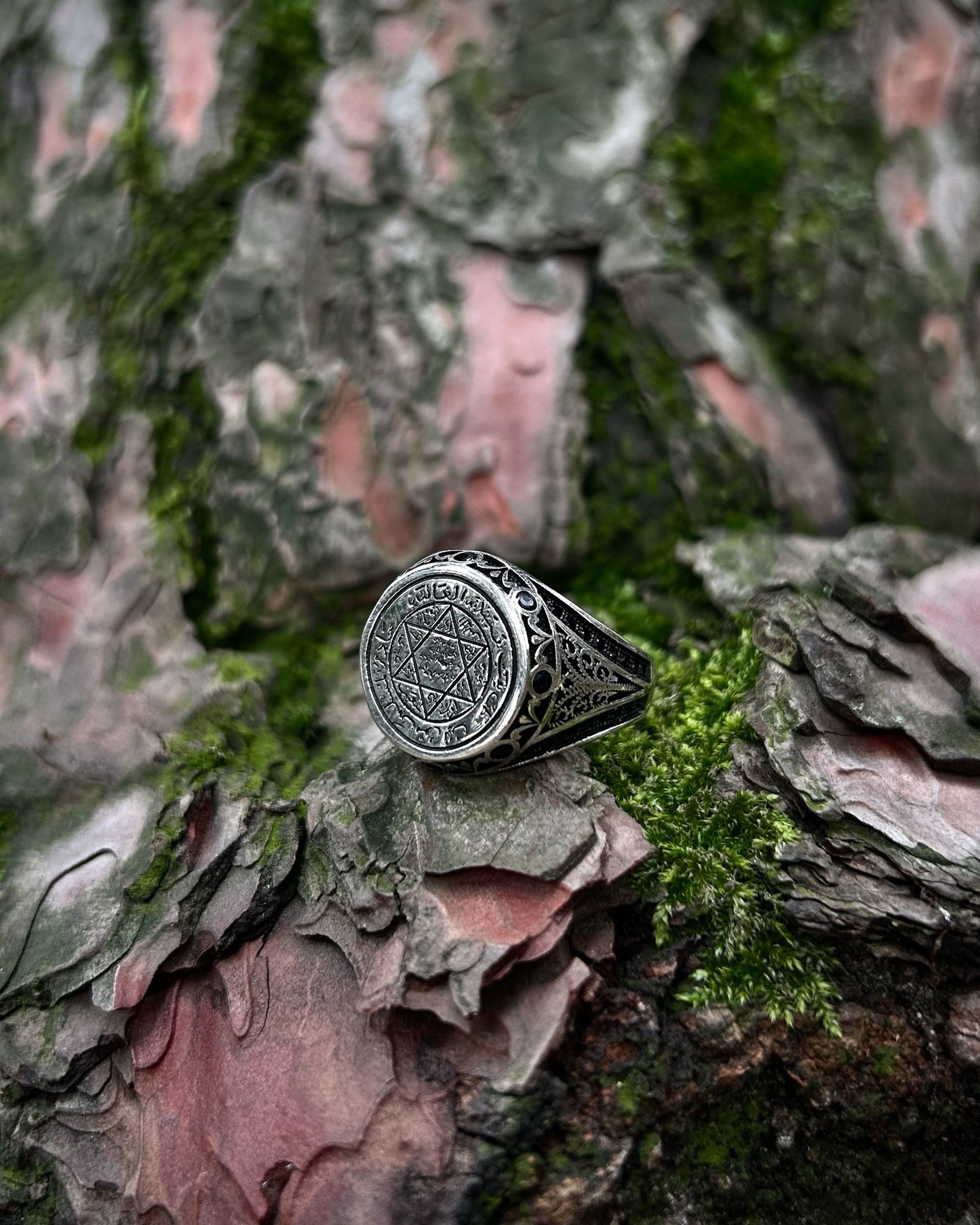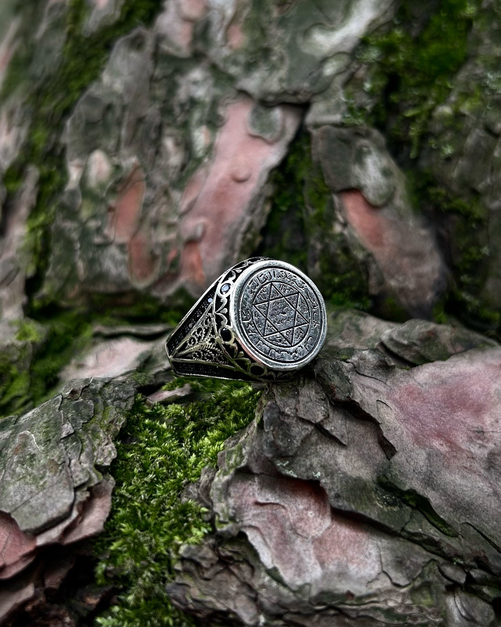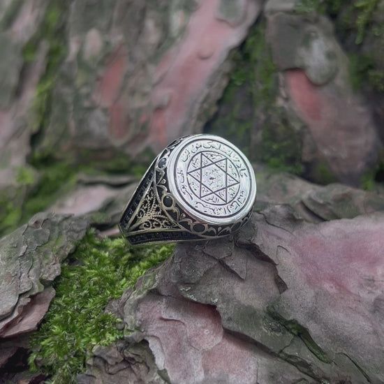 ▶ Le sceau de Salomon, attribué au roi Salomon et symbole de secrets ancestraux et de pouvoir divin, renaît dans cette bague authentique. Façonnée avec soin en argent sterling 925 et ornée de pierres noires sur les côtés, cette bague est un puissant talisman censé apporter à celui qui la porte protection, sagesse et équilibre spirituel.