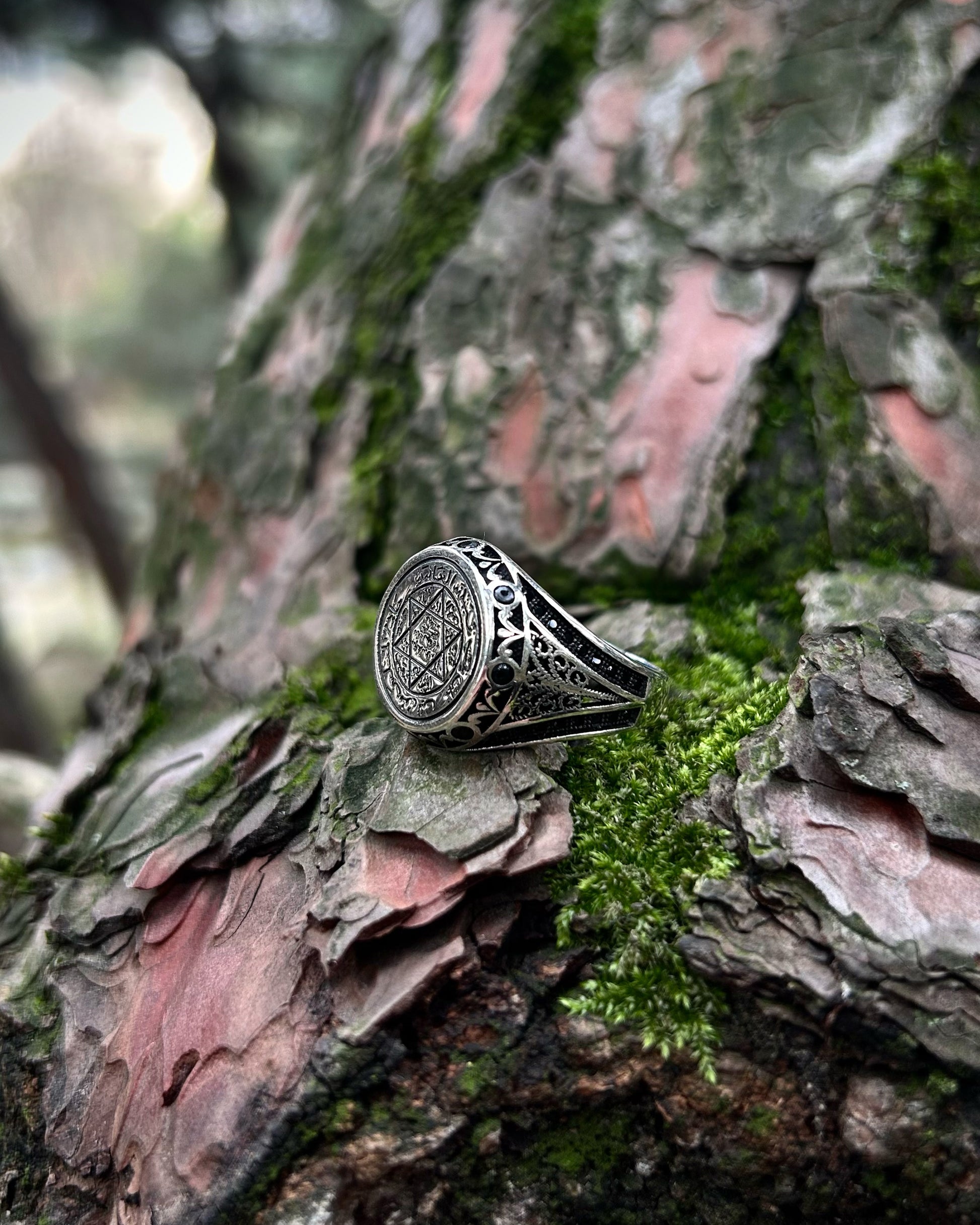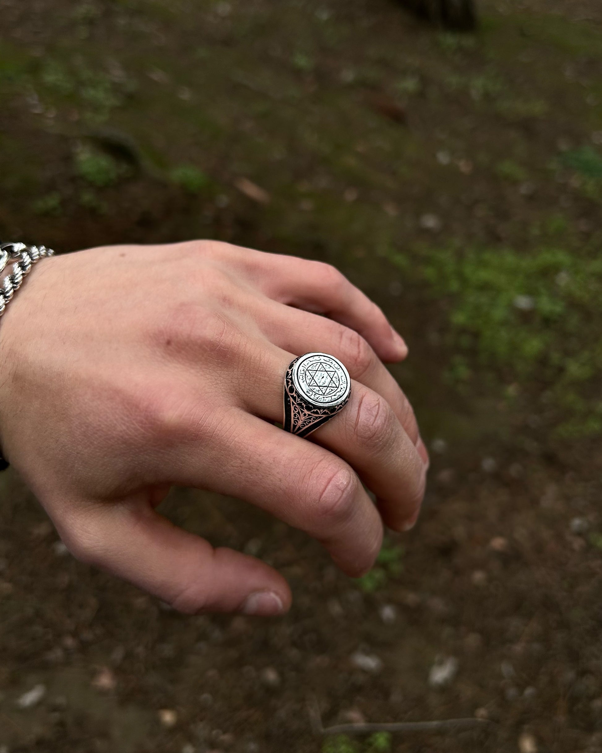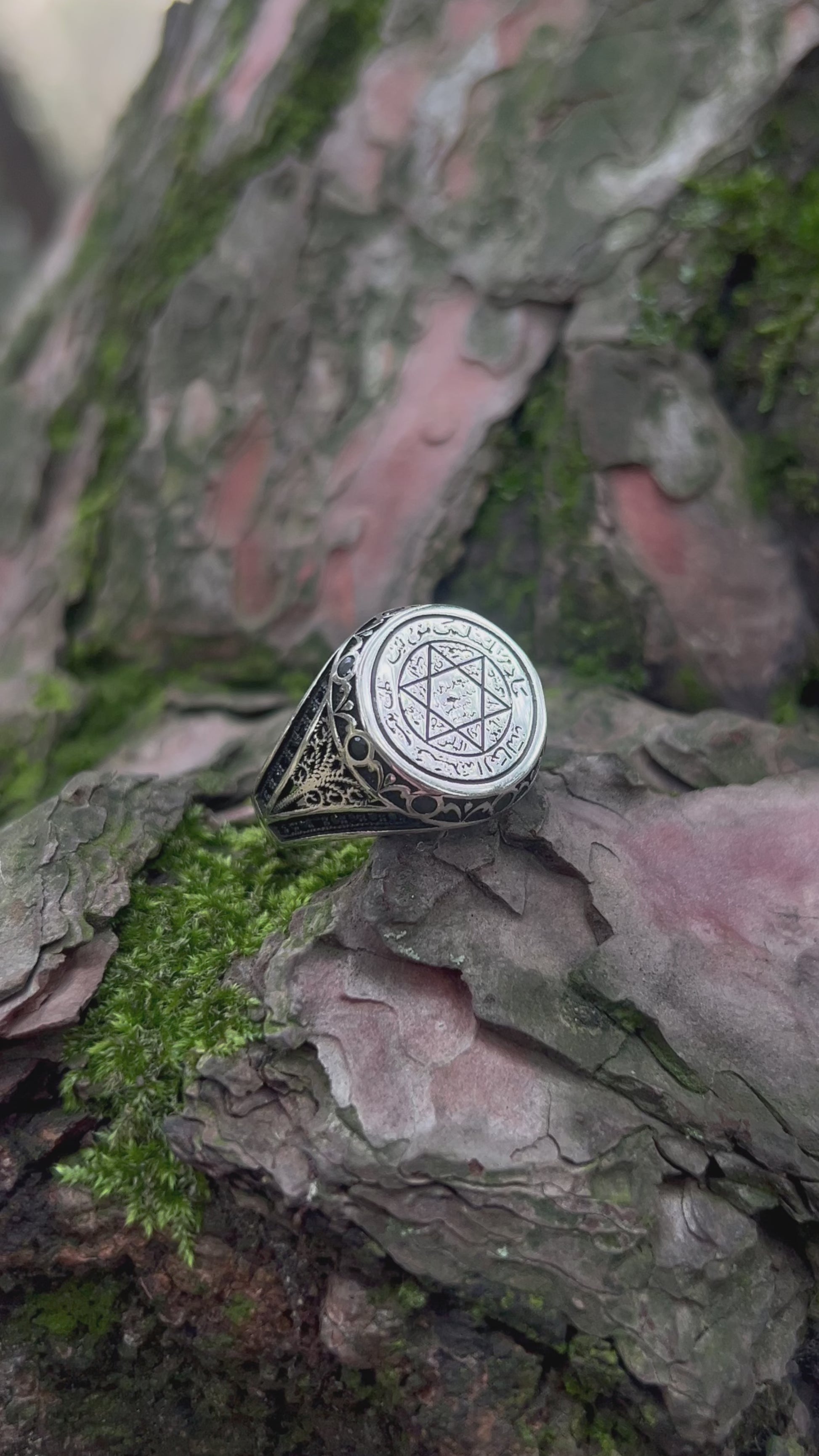 ▶ Le sceau de Salomon, attribué au roi Salomon et symbole de secrets ancestraux et de pouvoir divin, renaît dans cette bague authentique. Façonnée avec soin en argent sterling 925 et ornée de pierres noires sur les côtés, cette bague est un puissant talisman censé apporter à celui qui la porte protection, sagesse et équilibre spirituel.