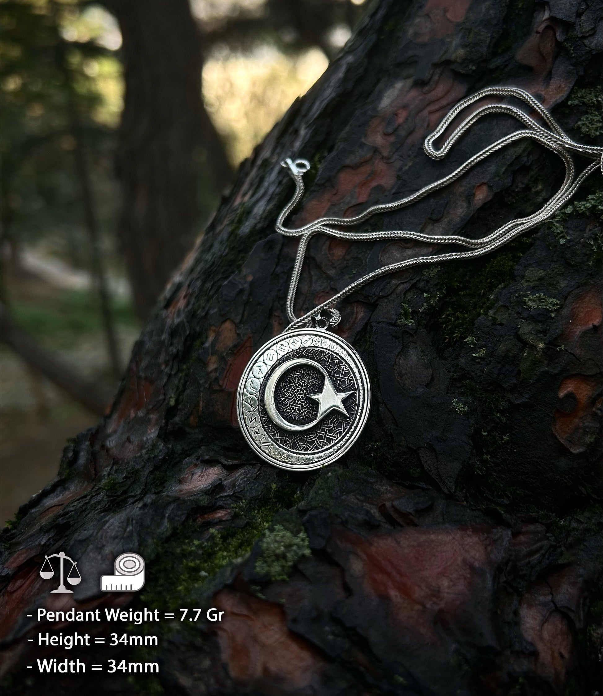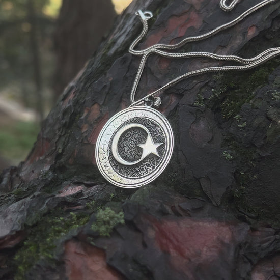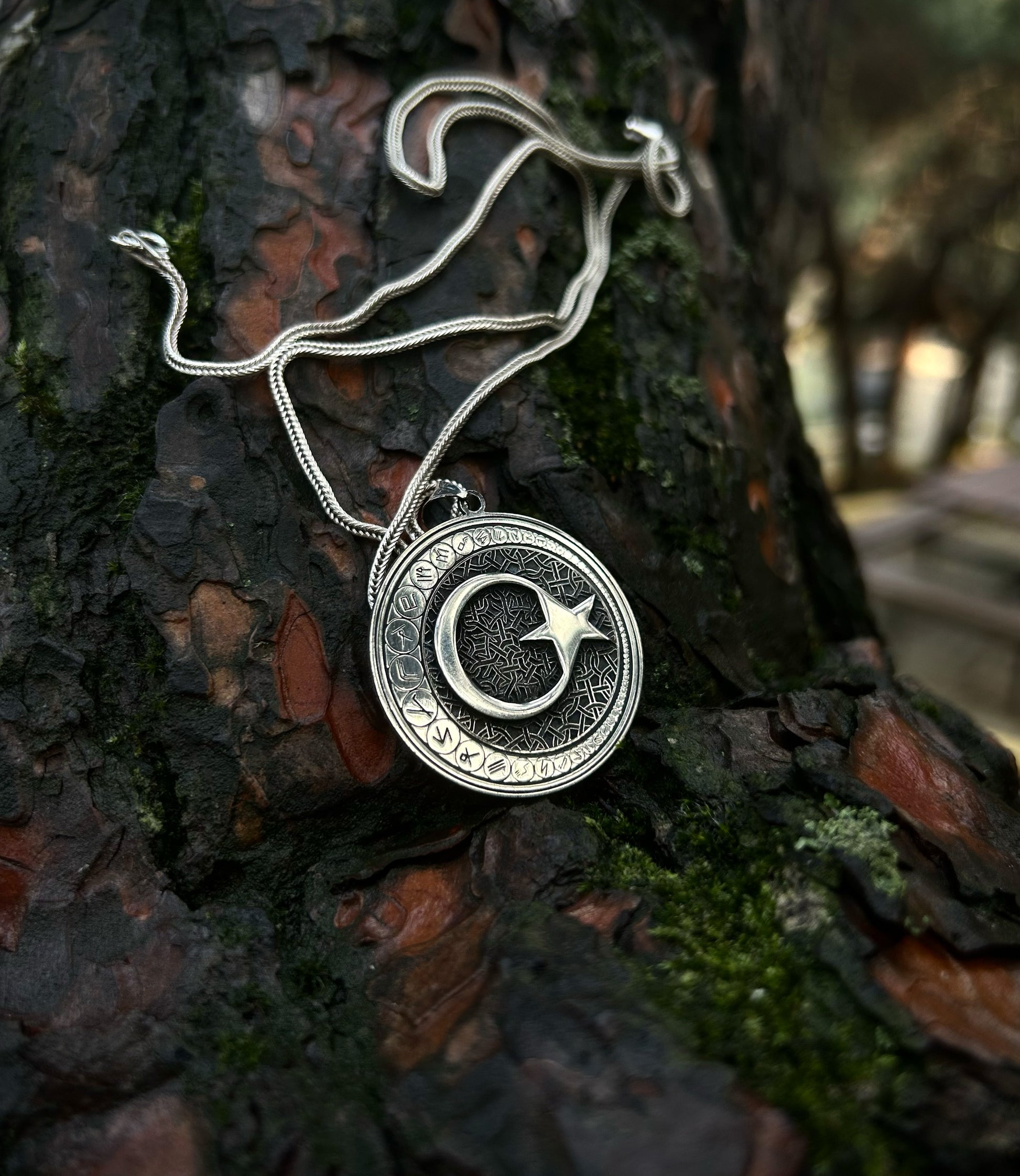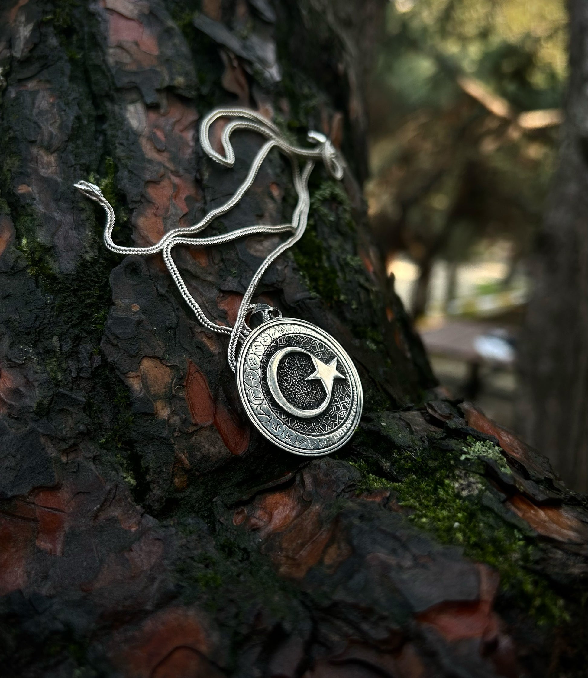 Notre symbole national, l'étoile et le croissant , s'associe dans ce bijou unique à notre patrimoine le plus ancien, l'alphabet göktürk . Gravé sur de l'argent sterling 925 selon une technique spéciale , ce collier incarne une force profonde, ancrée dans l'histoire. C'est une pièce unique et chargée de sens pour celles et ceux qui souhaitent exprimer leur fierté nationale et leur attachement à l'histoire turque ancestrale .