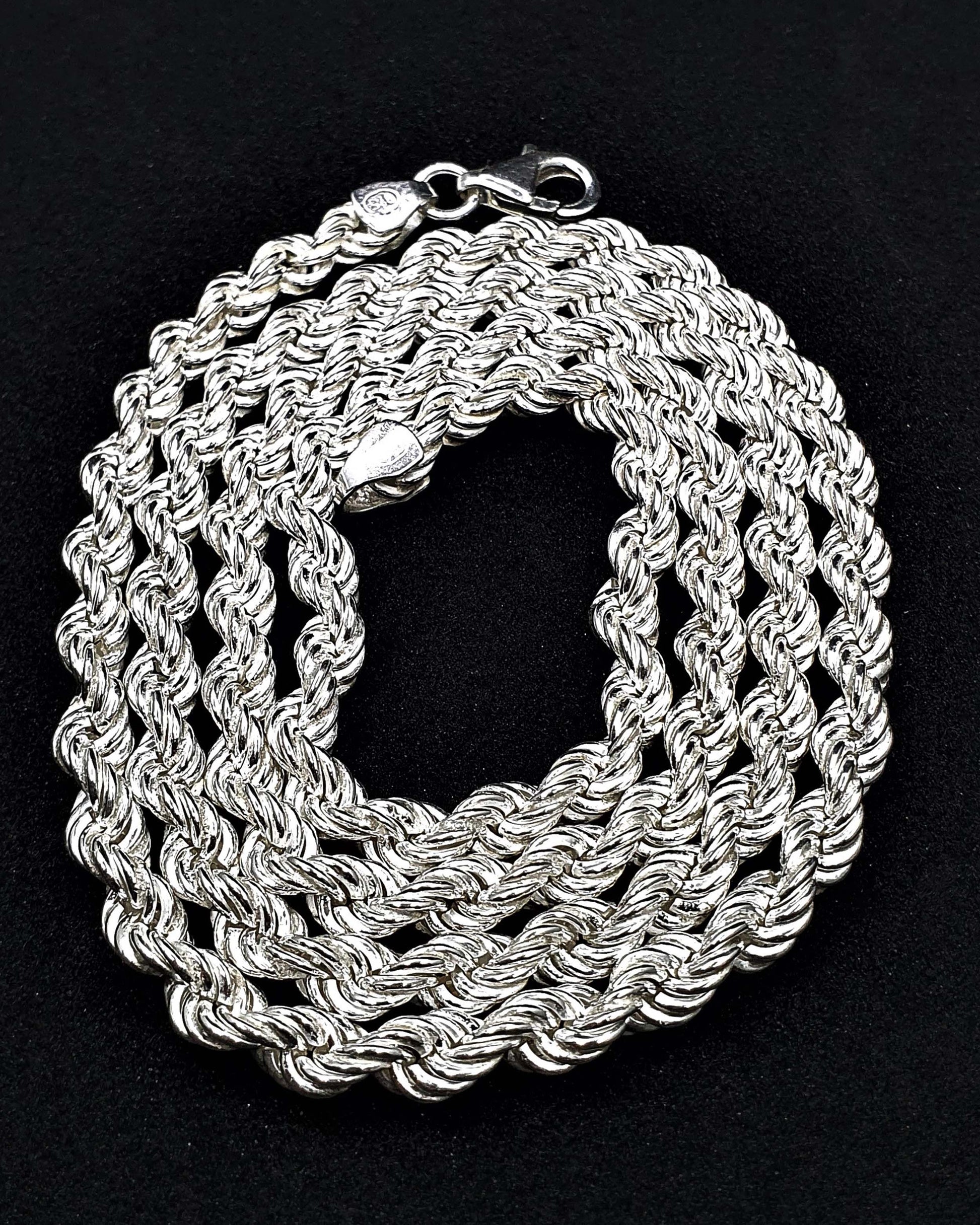 Bu el yapımı halat zincir kolye, yaklaşık 1000 adet gümüş halkanın tek tek örülmesiyle üretilmiş son derece zahmetli ve dayanıklı bir tasarımdır. 925 ayar gümüşten yapılan bu 8mm kalınlığındaki halat zincir, hem kadınlar hem erkekler için uygundur.