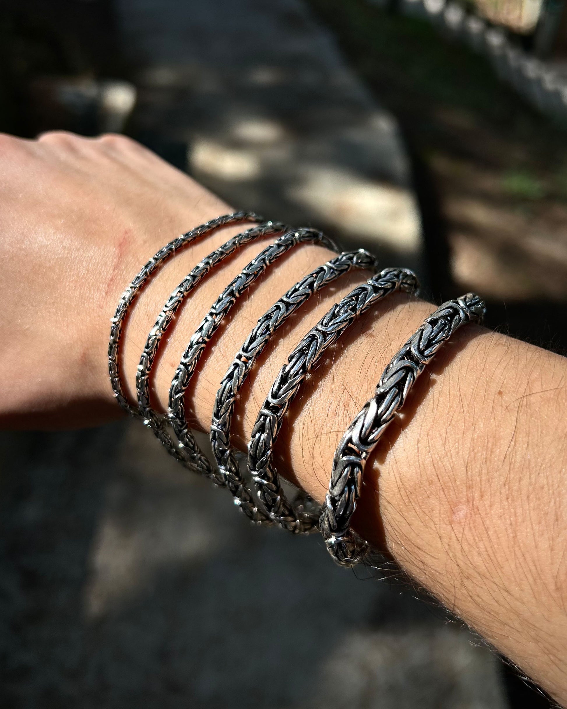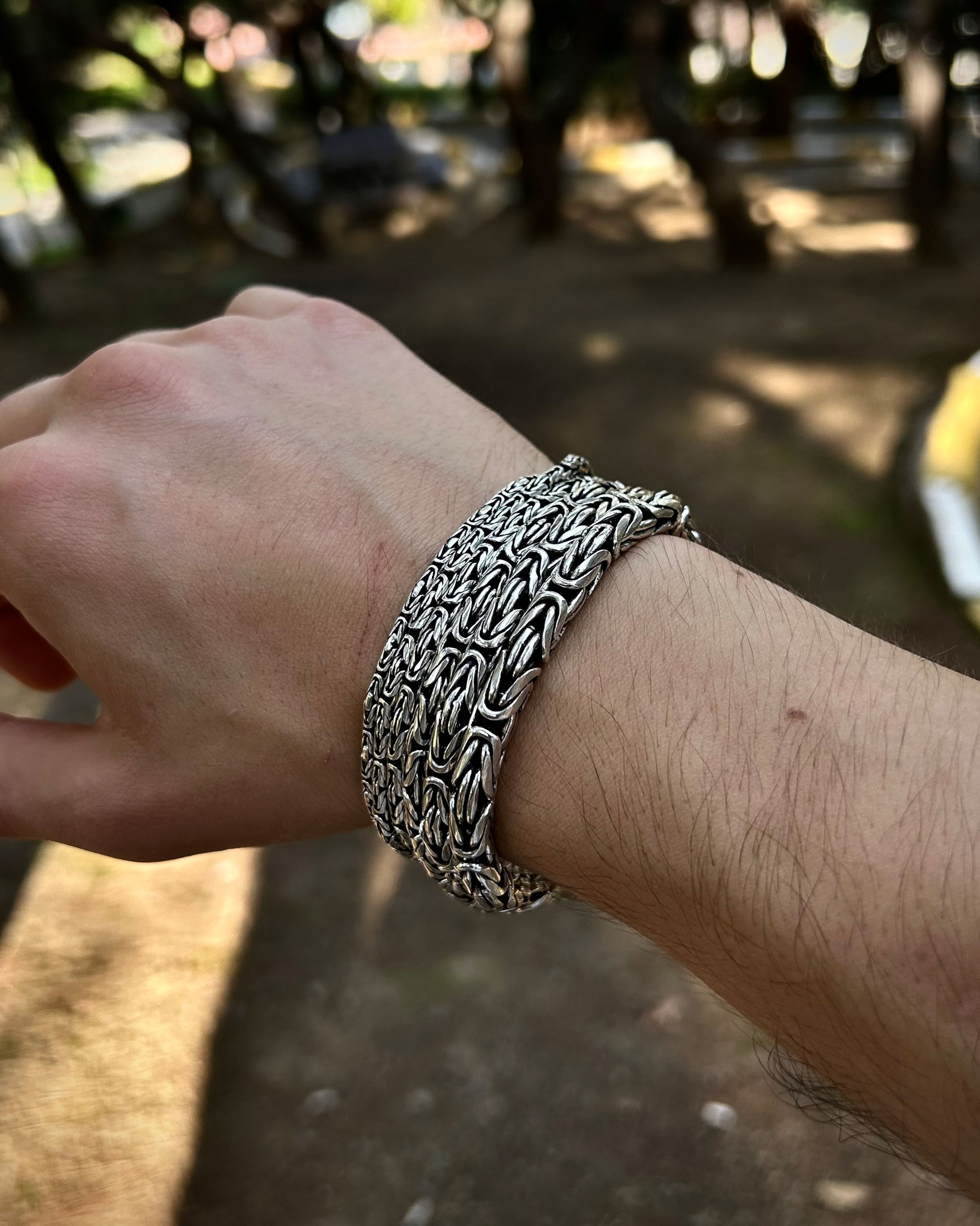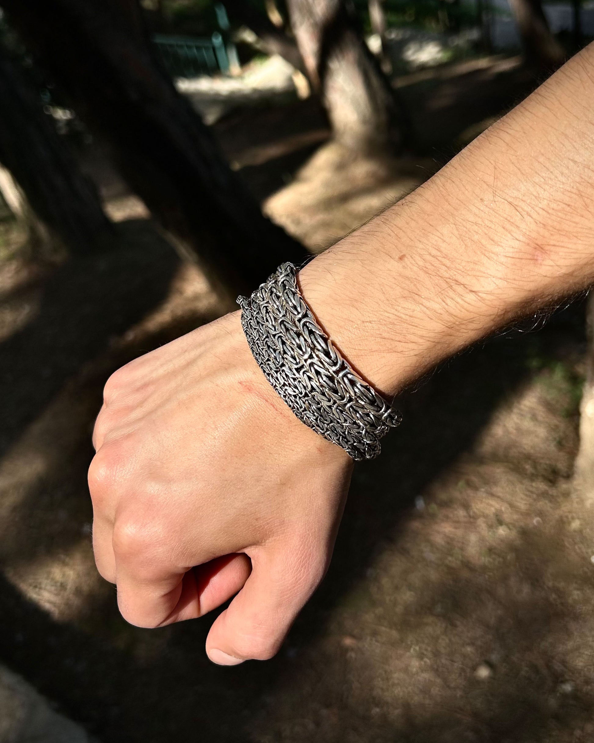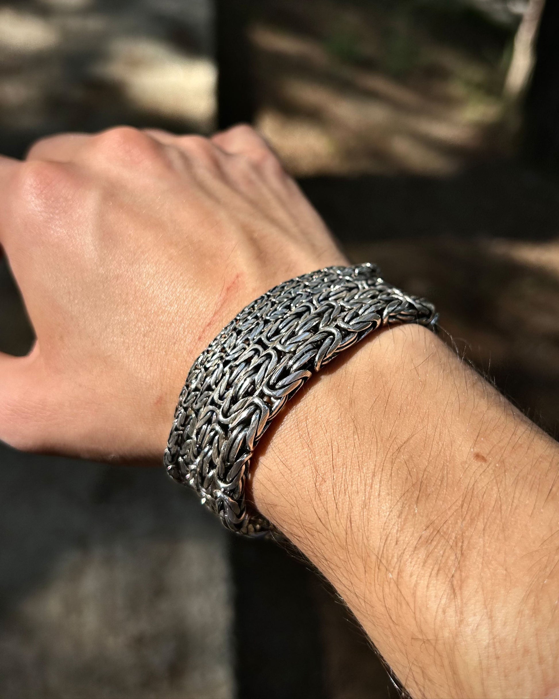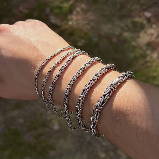 925 ayar gümüşten üretilmiş bu bileklik, yuvarlak halkalardan oluşan Bizans kral zincir tasarımına sahiptir. Ağır ve kalın sevenler için güçlü bir seçenek sunarken, daha minimal tercih edenler için de farklı ölçü alternatifleri mevcuttur.