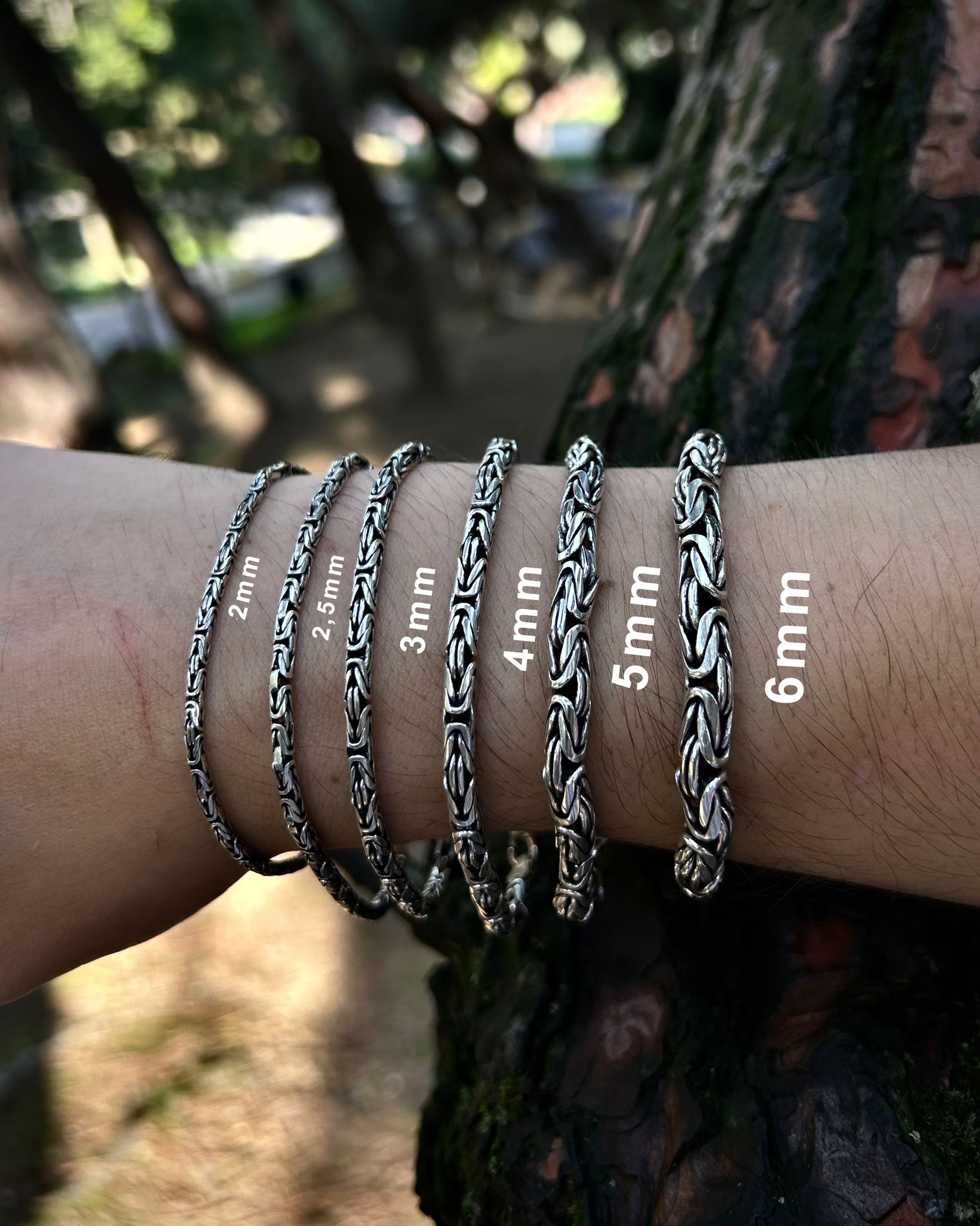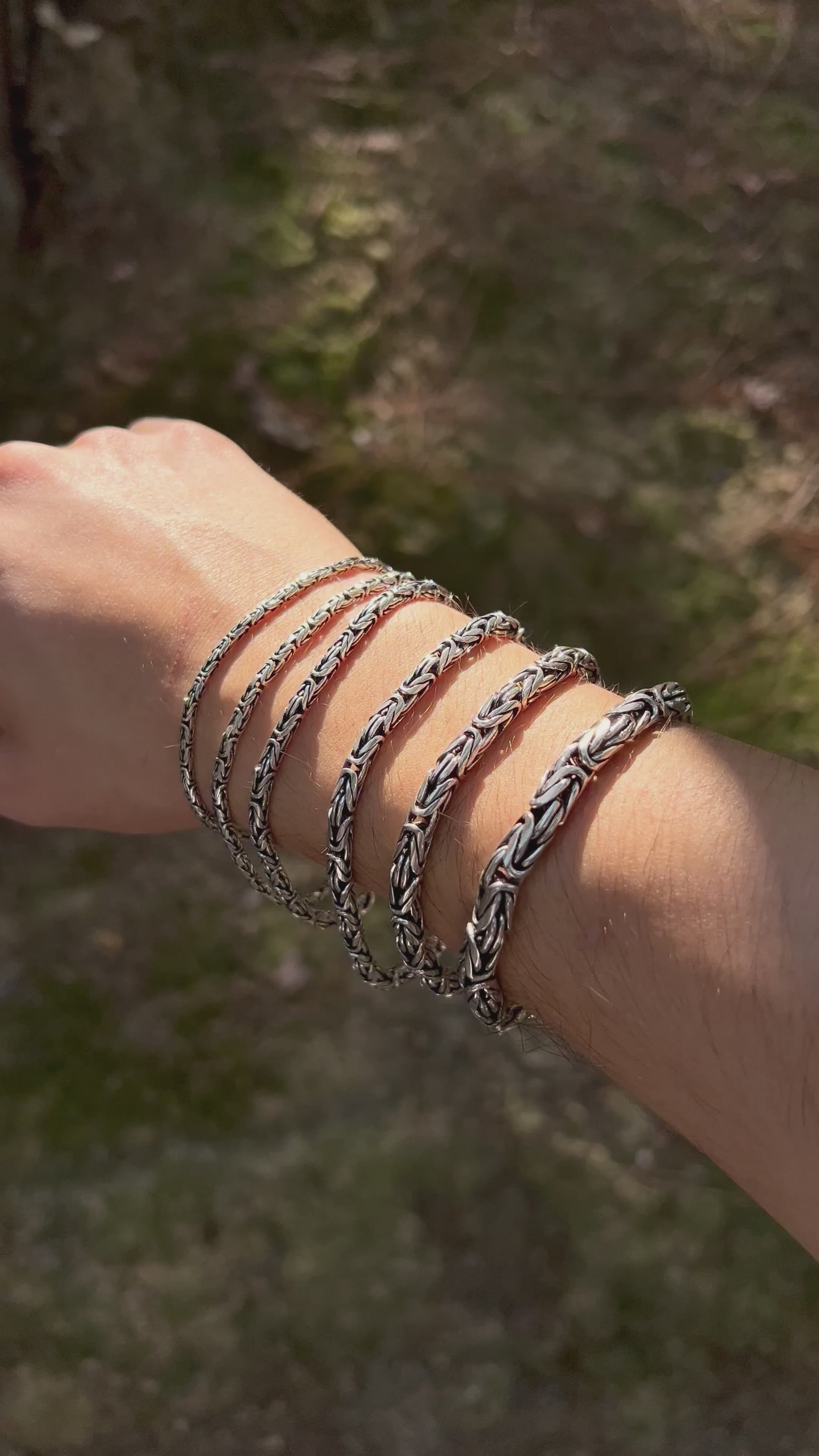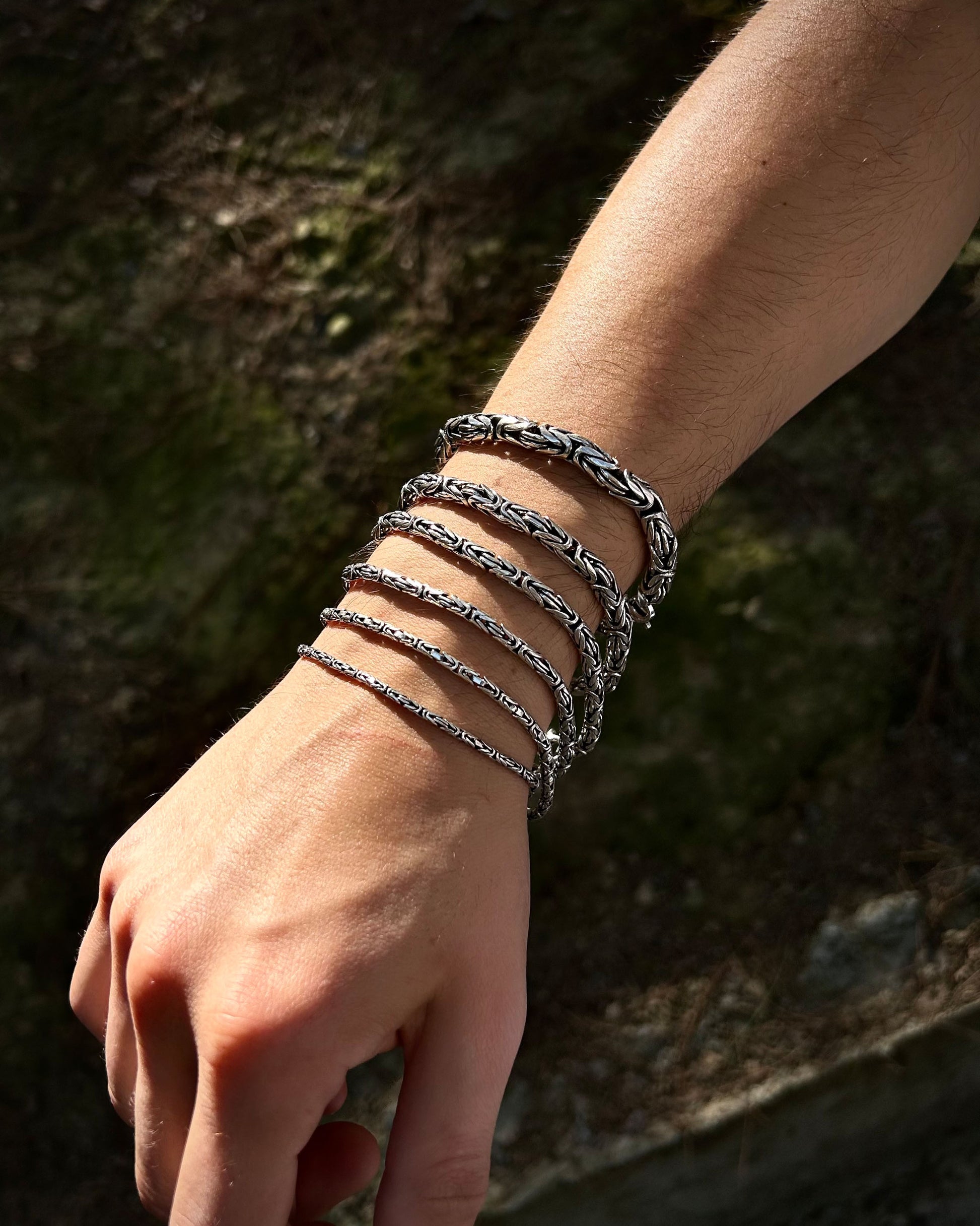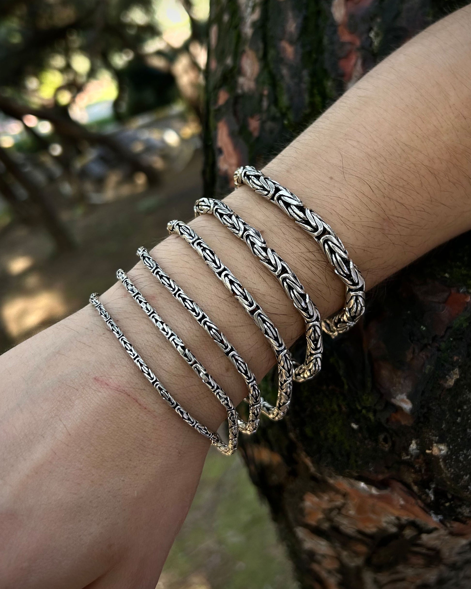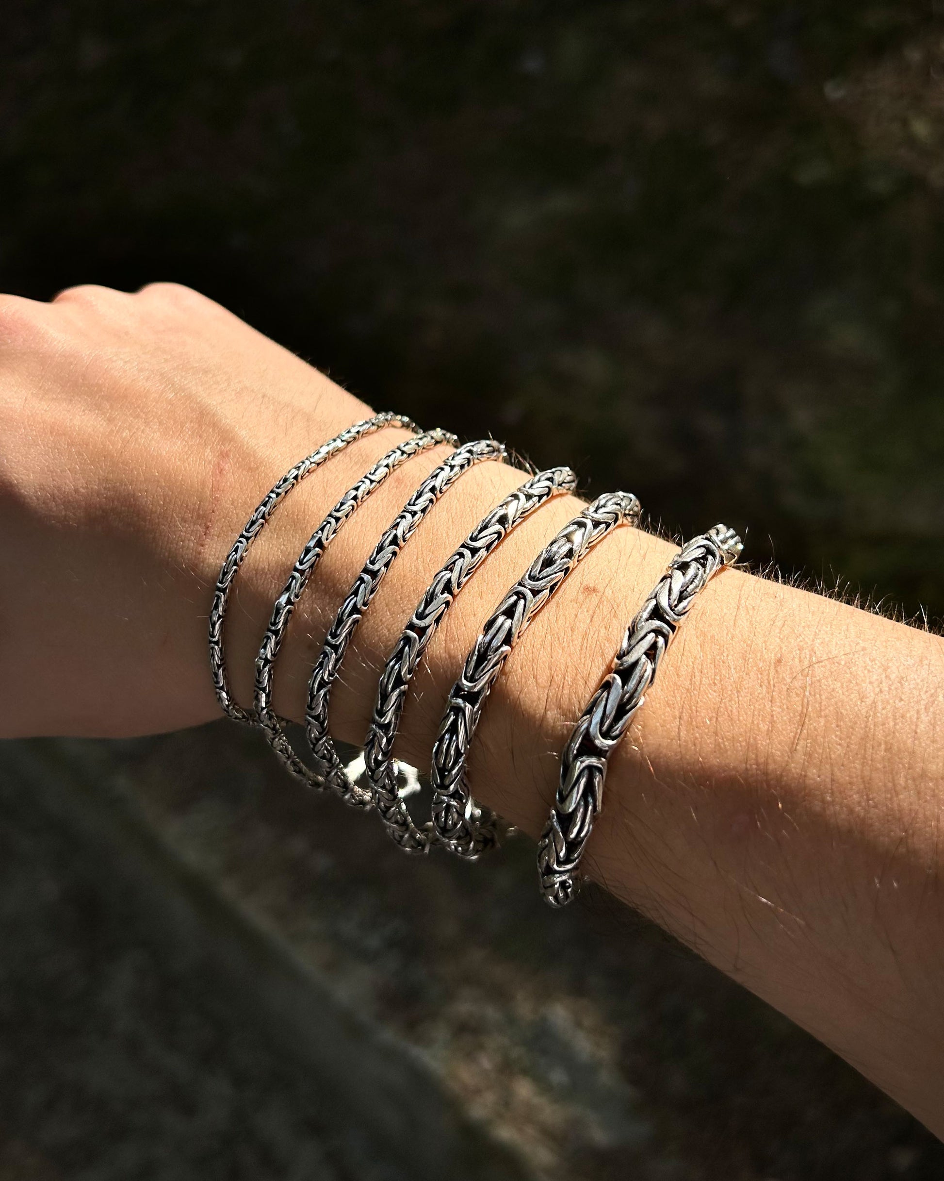 925 ayar gümüşten üretilmiş bu bileklik, yuvarlak halkalardan oluşan Bizans kral zincir tasarımına sahiptir. Ağır ve kalın sevenler için güçlü bir seçenek sunarken, daha minimal tercih edenler için de farklı ölçü alternatifleri mevcuttur.
