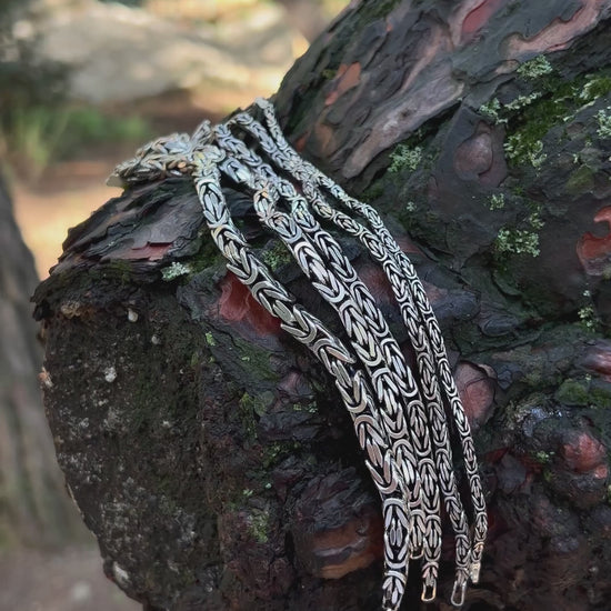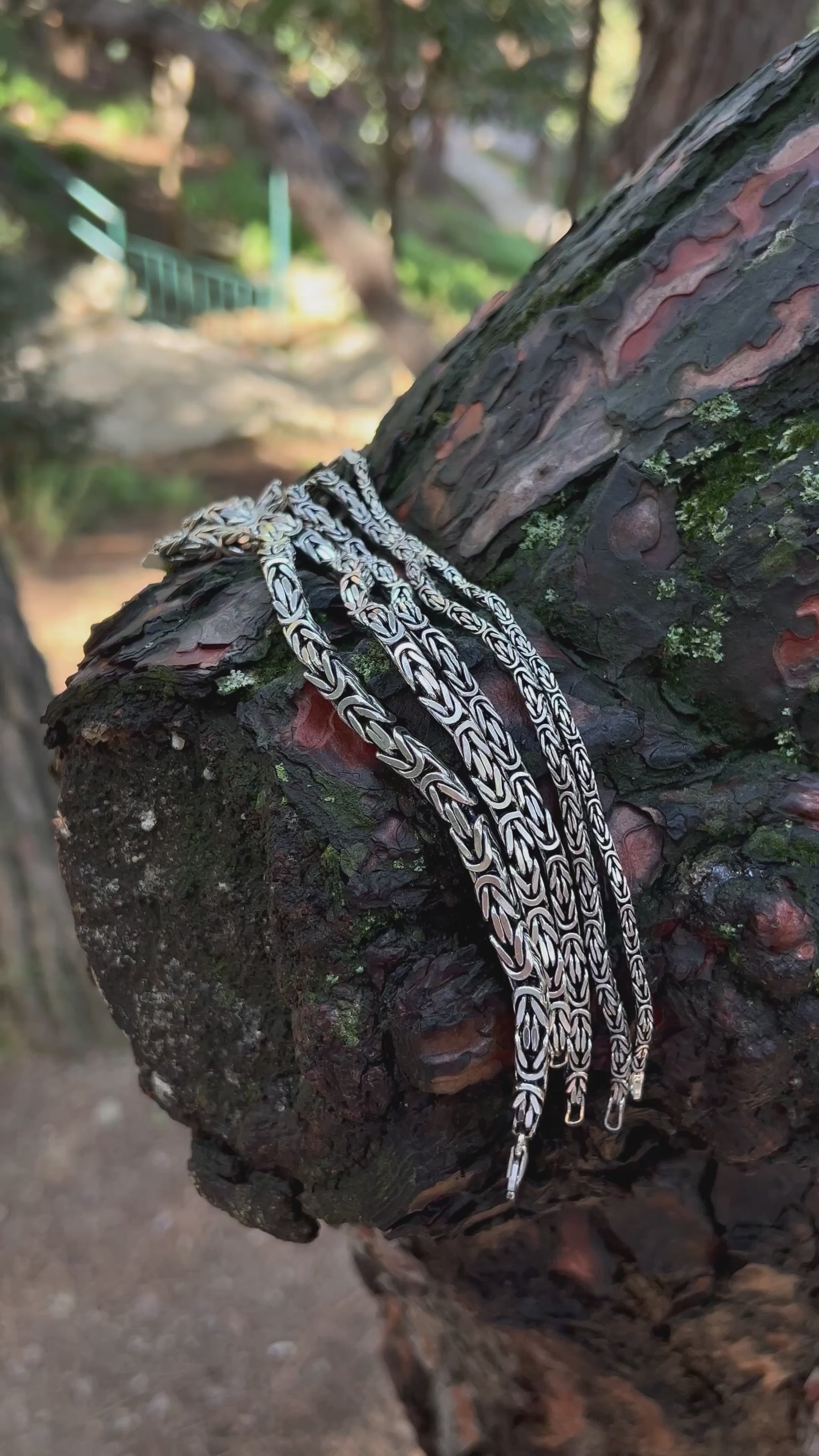 925 ayar gümüşten üretilmiş bu bileklik, kare kesim halkalardan oluşan Bizans kral zincir tasarımına sahiptir. Ağır ve kalın sevenler için güçlü bir seçenek sunarken, daha minimal tercih edenler için de farklı ölçü alternatifleri mevcuttur.
