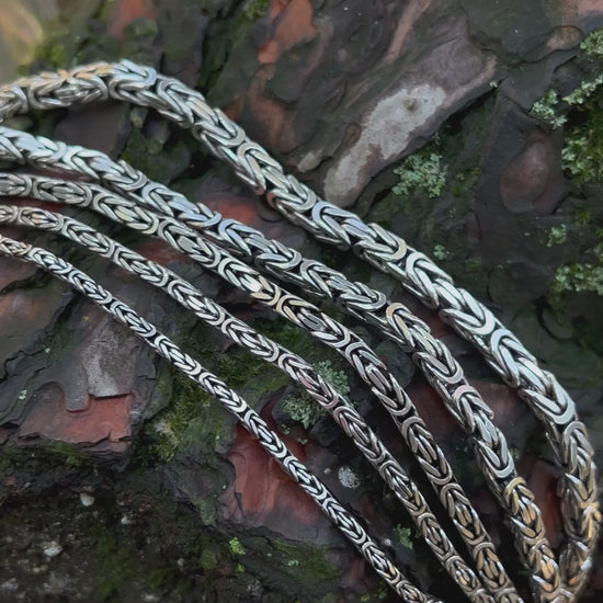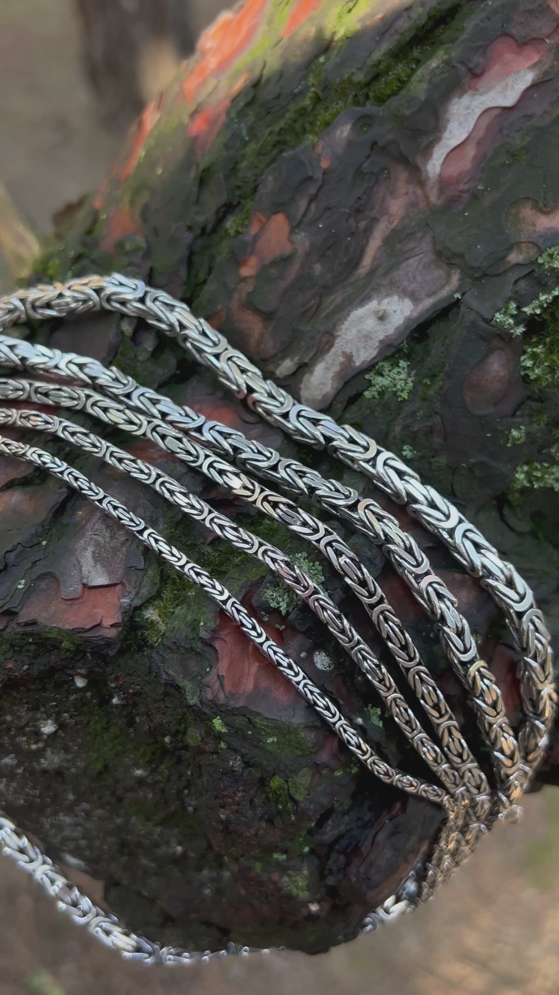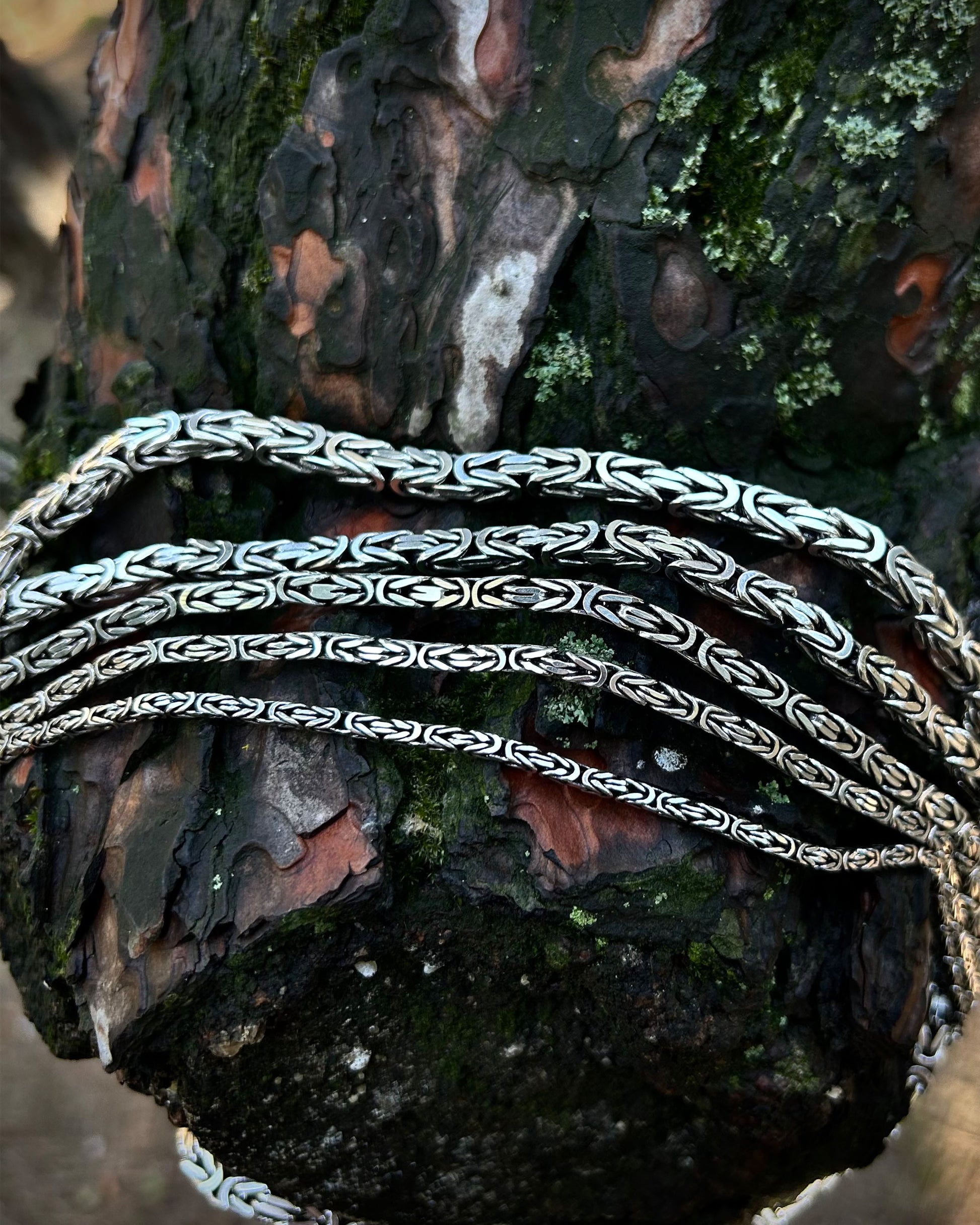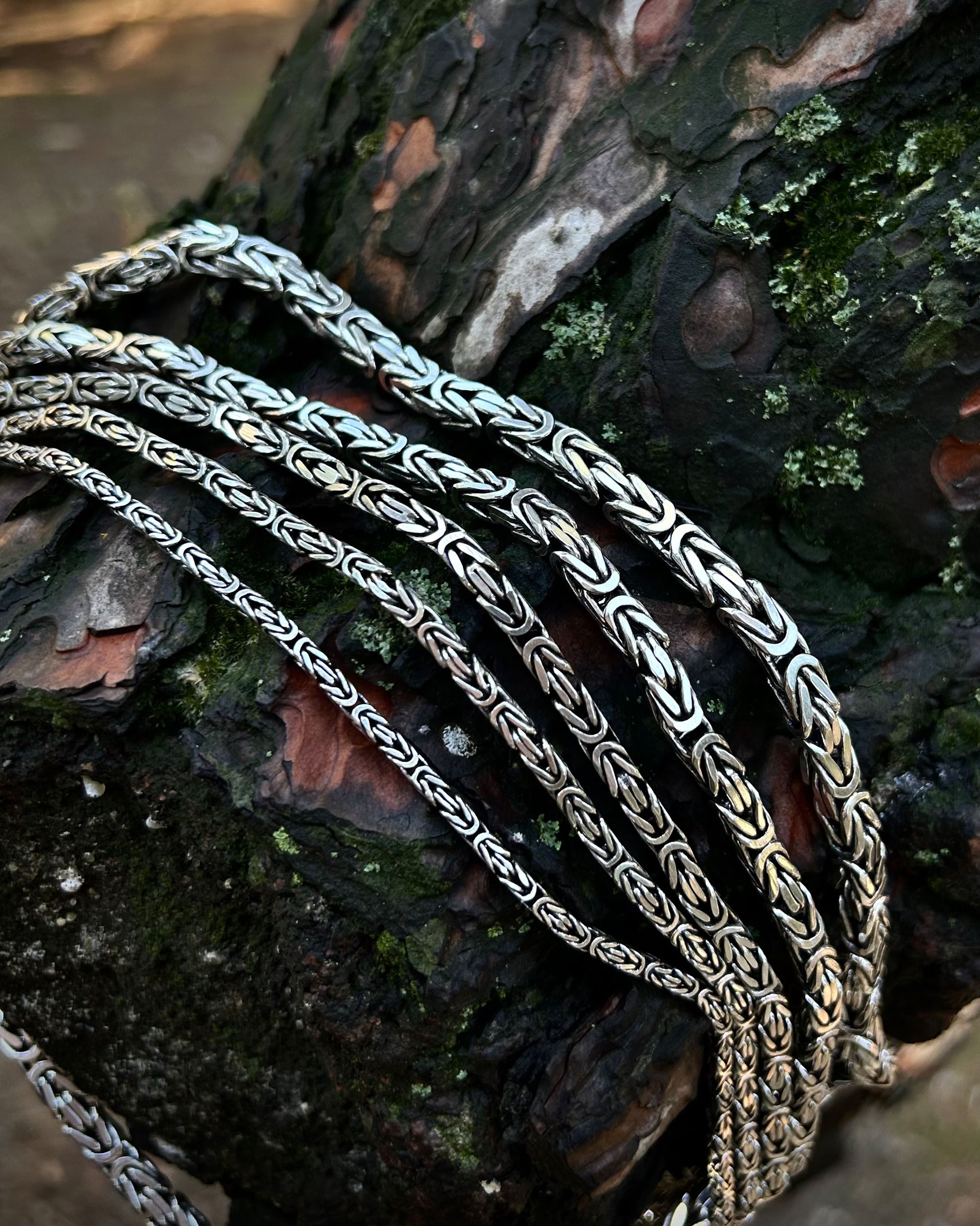 Bu Bali esintili, el işçiliğiyle üretilmiş kare kesim Bizans kral zinciri, 925 ayar masif gümüşten üretilmiştir. Güçlü yapısı ve detaylı dokusuyla hem klasik hem de modern bir duruş sunar. Farklı uzunluk ve kalınlık seçenekleriyle sunulan bu tasarım, hem günlük kullanım hem de özel günler için idealdir.