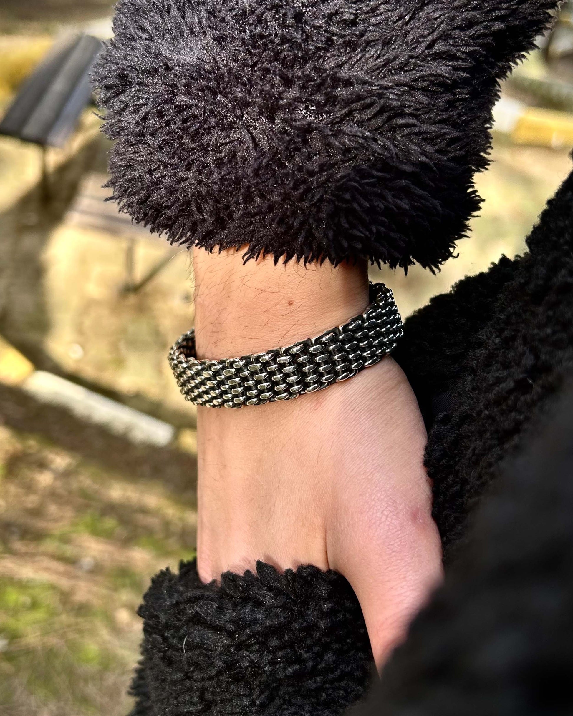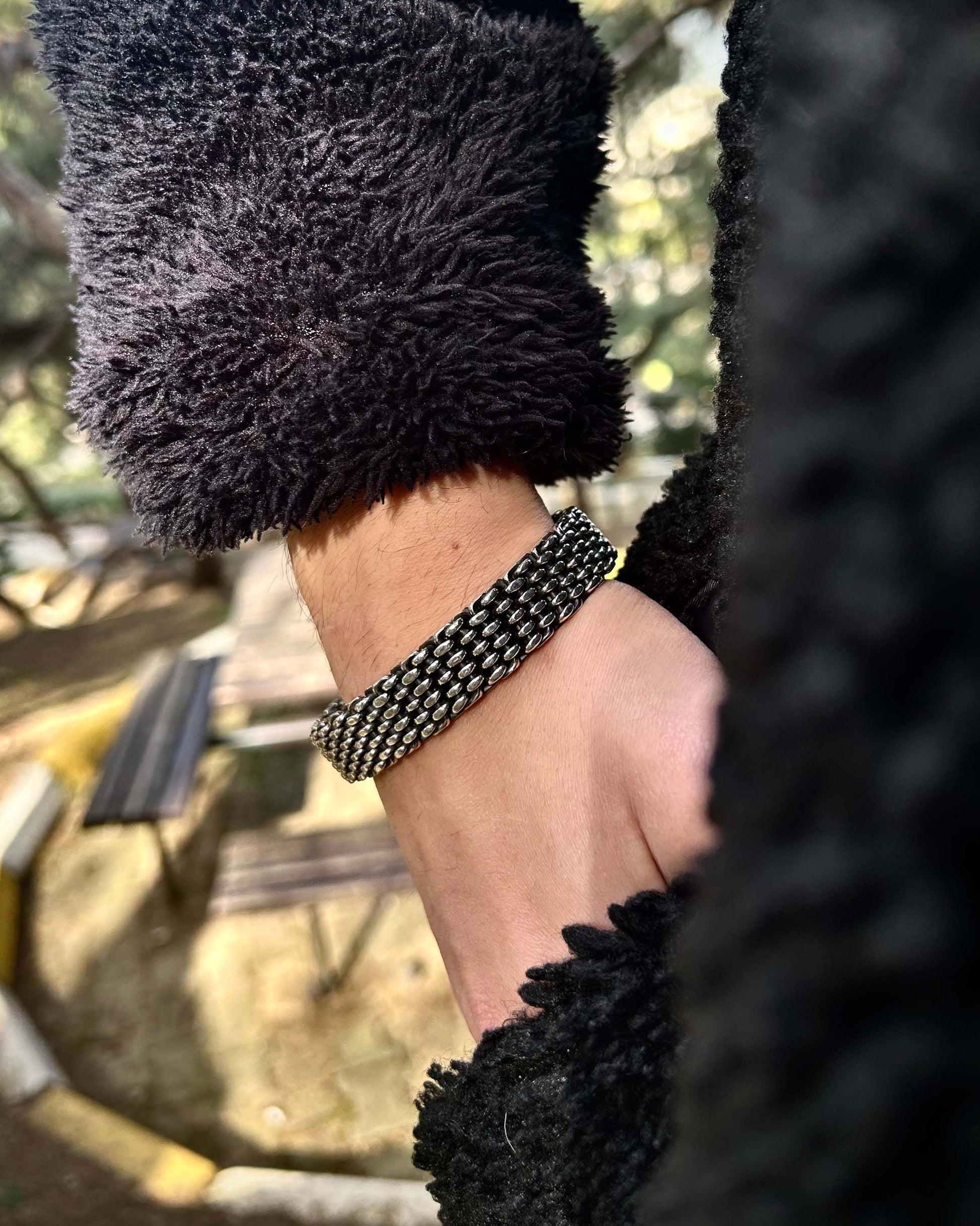 ▶ 925 ayar gümüşten üretilen bu 68 gramlık bileklik, hem lüks hem de dayanıklı bir duruş sunar. Ayarlanabilir yapısıyla konforlu kullanım sağlar. Ağır ve gösterişli gümüş takılar seven erkekler için idealdir. ◀