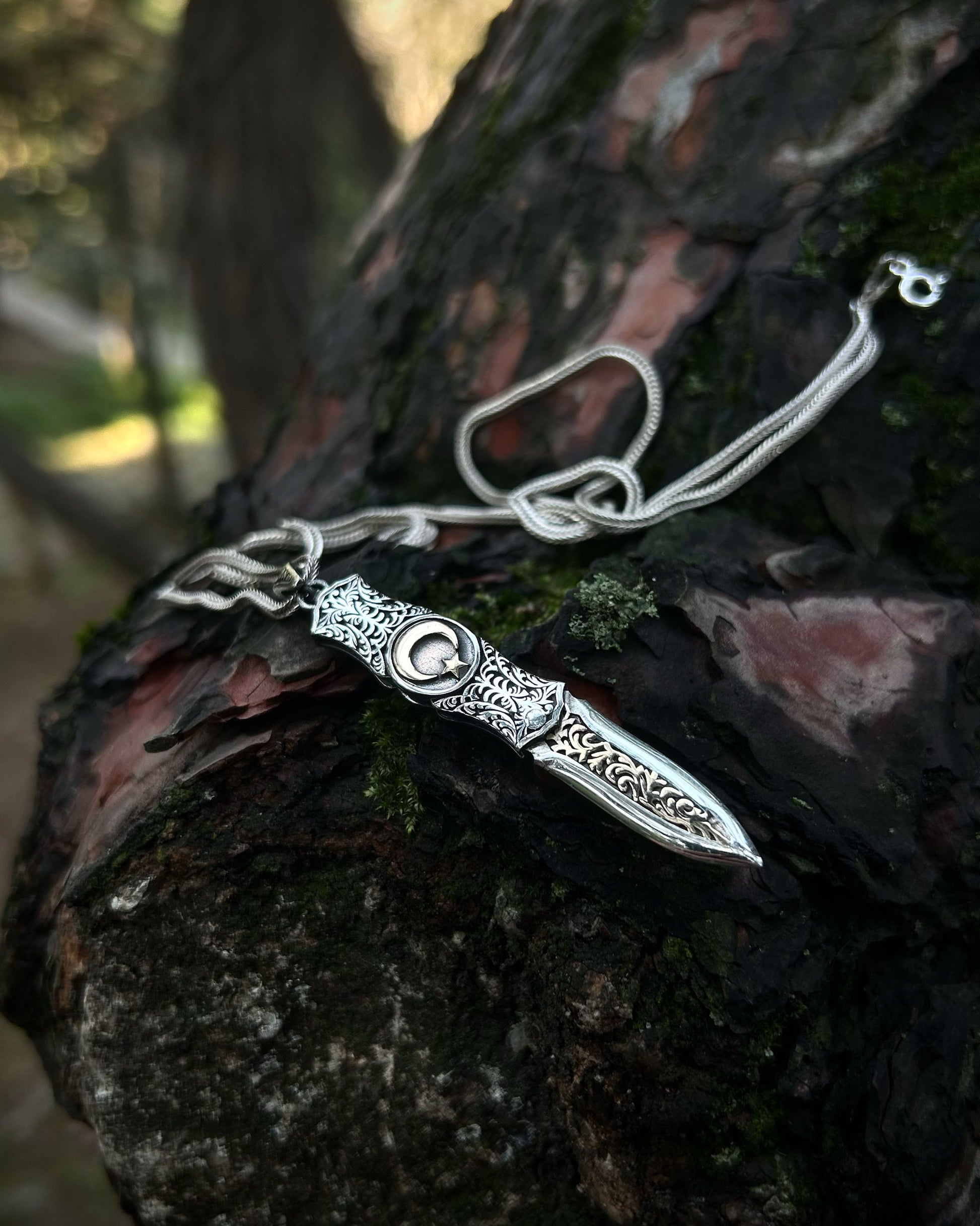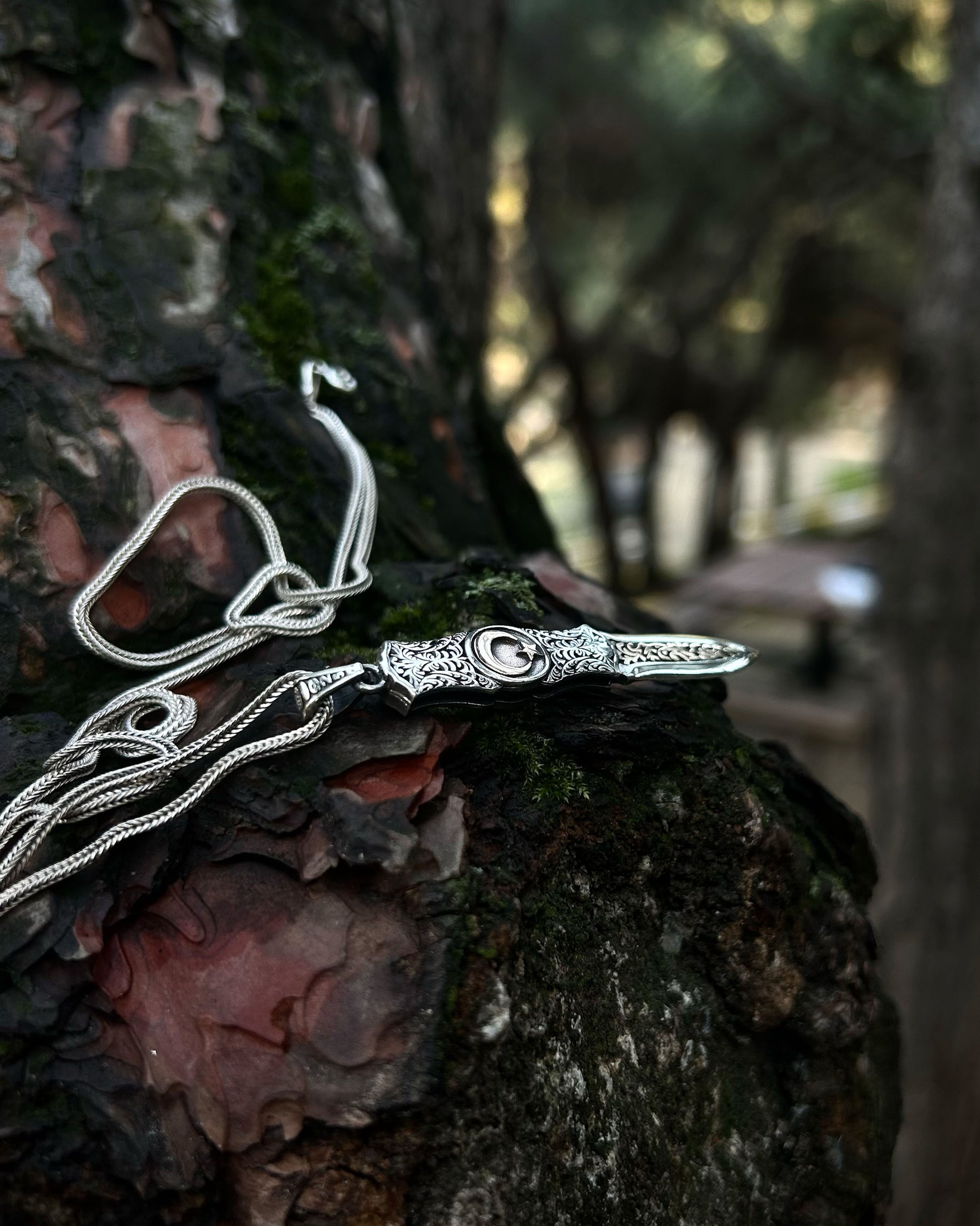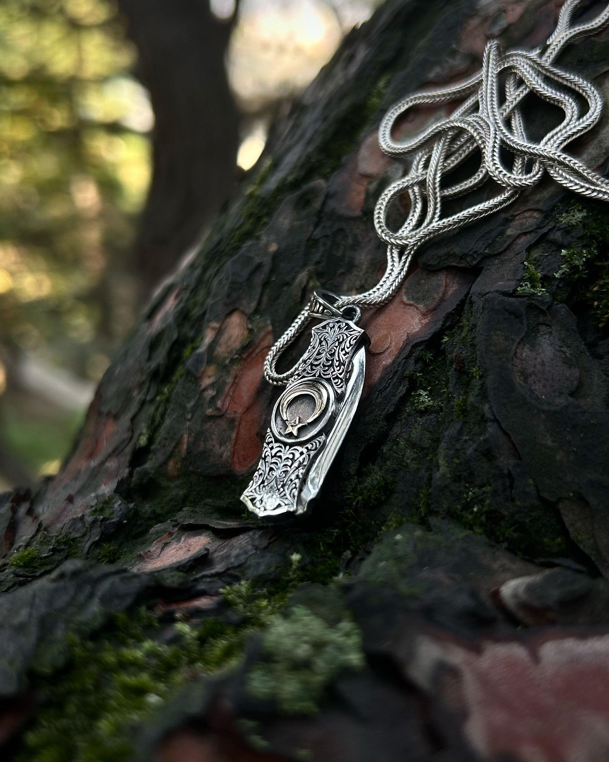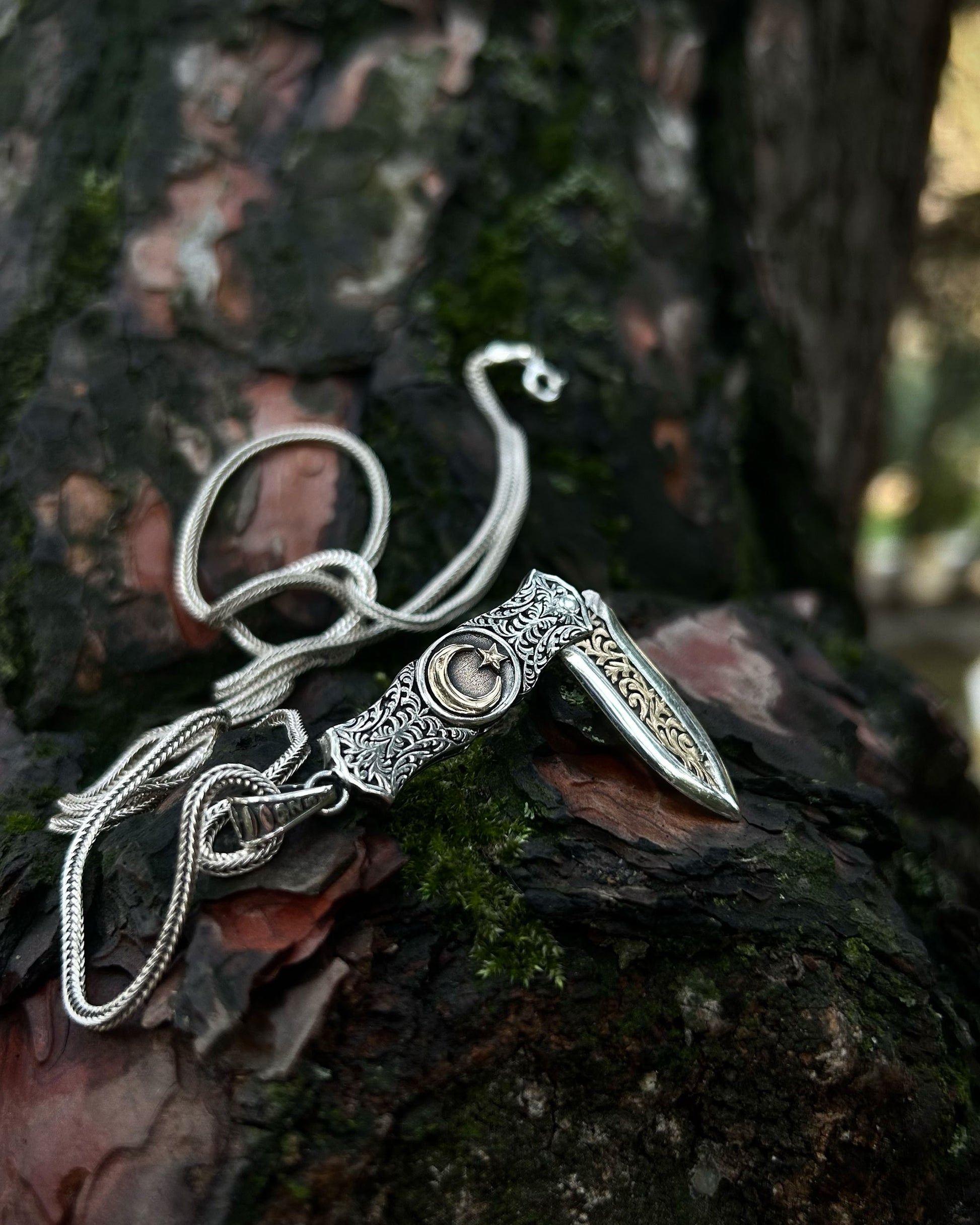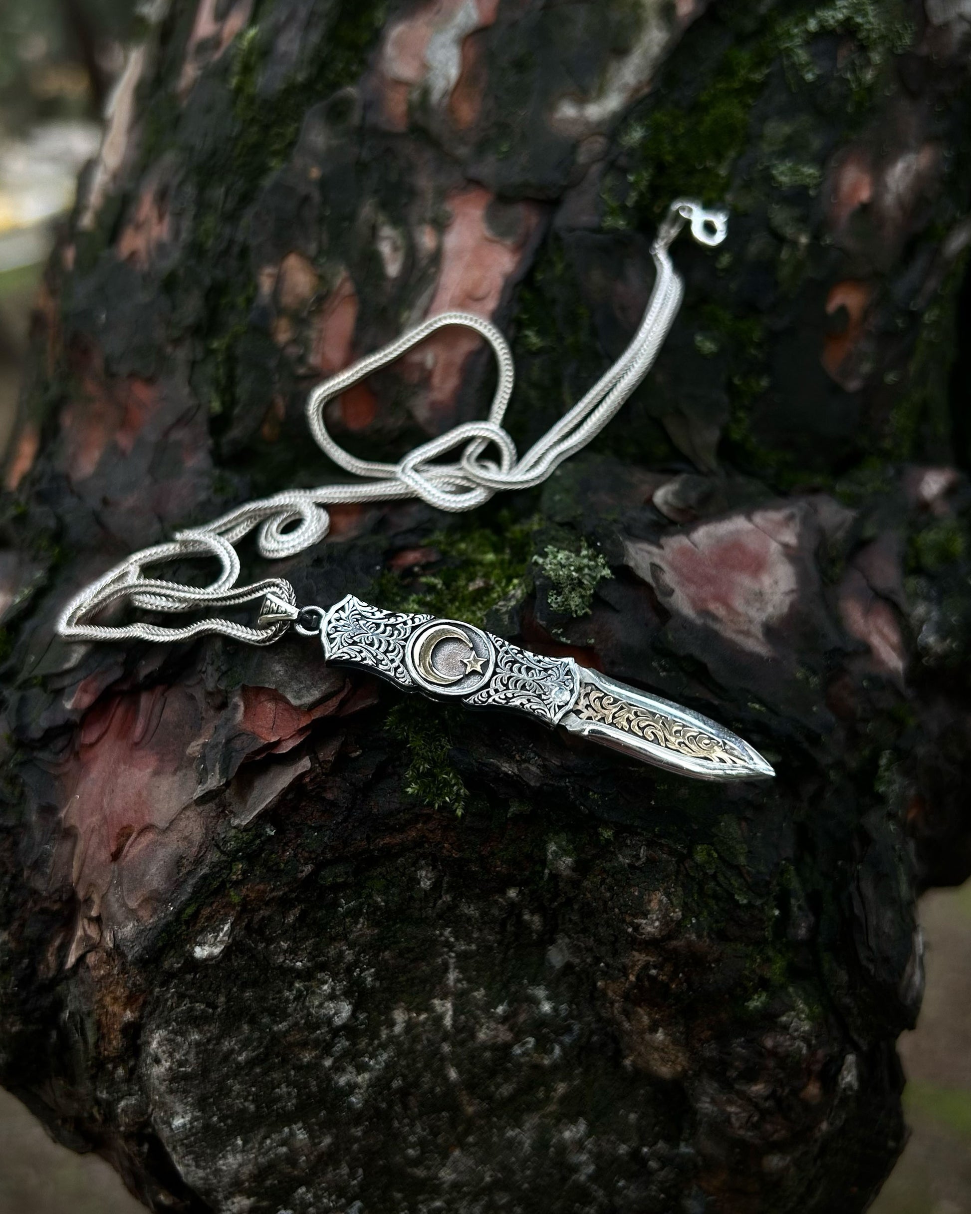 Milli gururumuz Ay Yıldız ve şaşırtıcı bir mekanizma bu tasarımda birleşiyor. 925 ayar gümüşten üretilen bu kolye, gövdesindeki otantik işlemeler ve parlayan Ay Yıldız kabartmasıyla dikkat çeker. Gerçek bir Türk çakısı gibi açılıp kapanabilen bu hareketli tasarım, vatan sevgisini cesur, keskin ve sıra dışı bir stille taşımak isteyenler için mükemmel bir seçimdir.