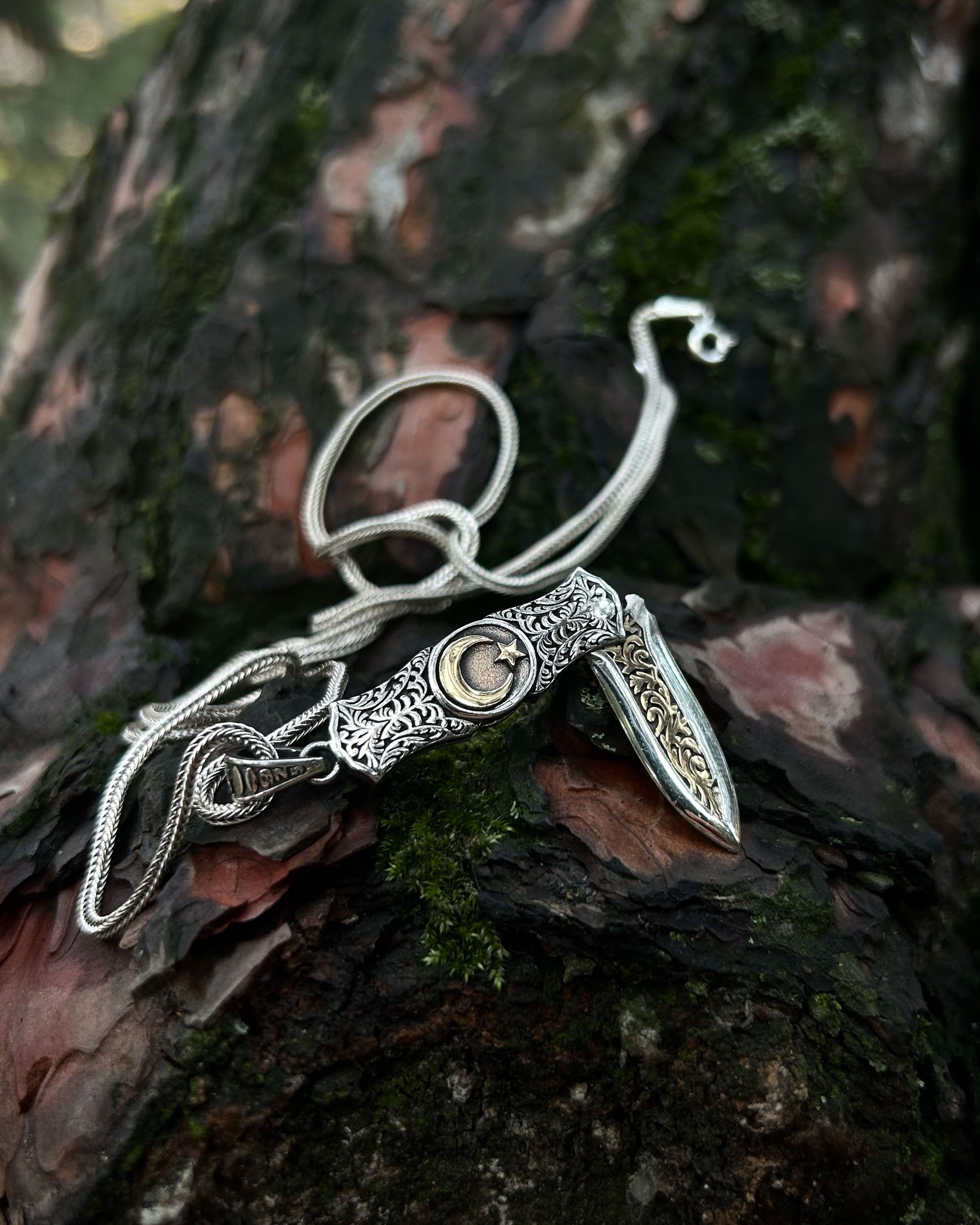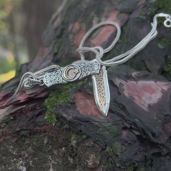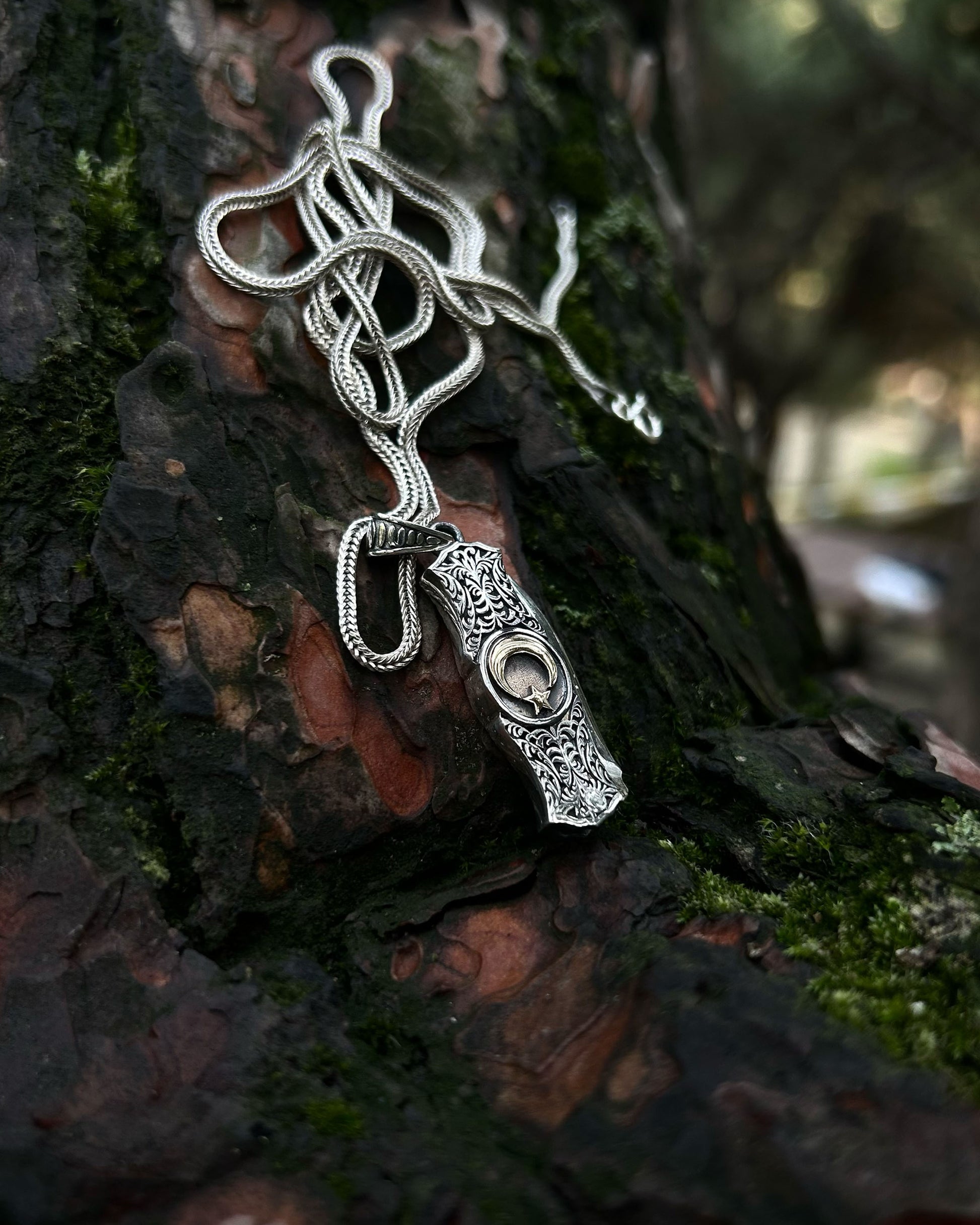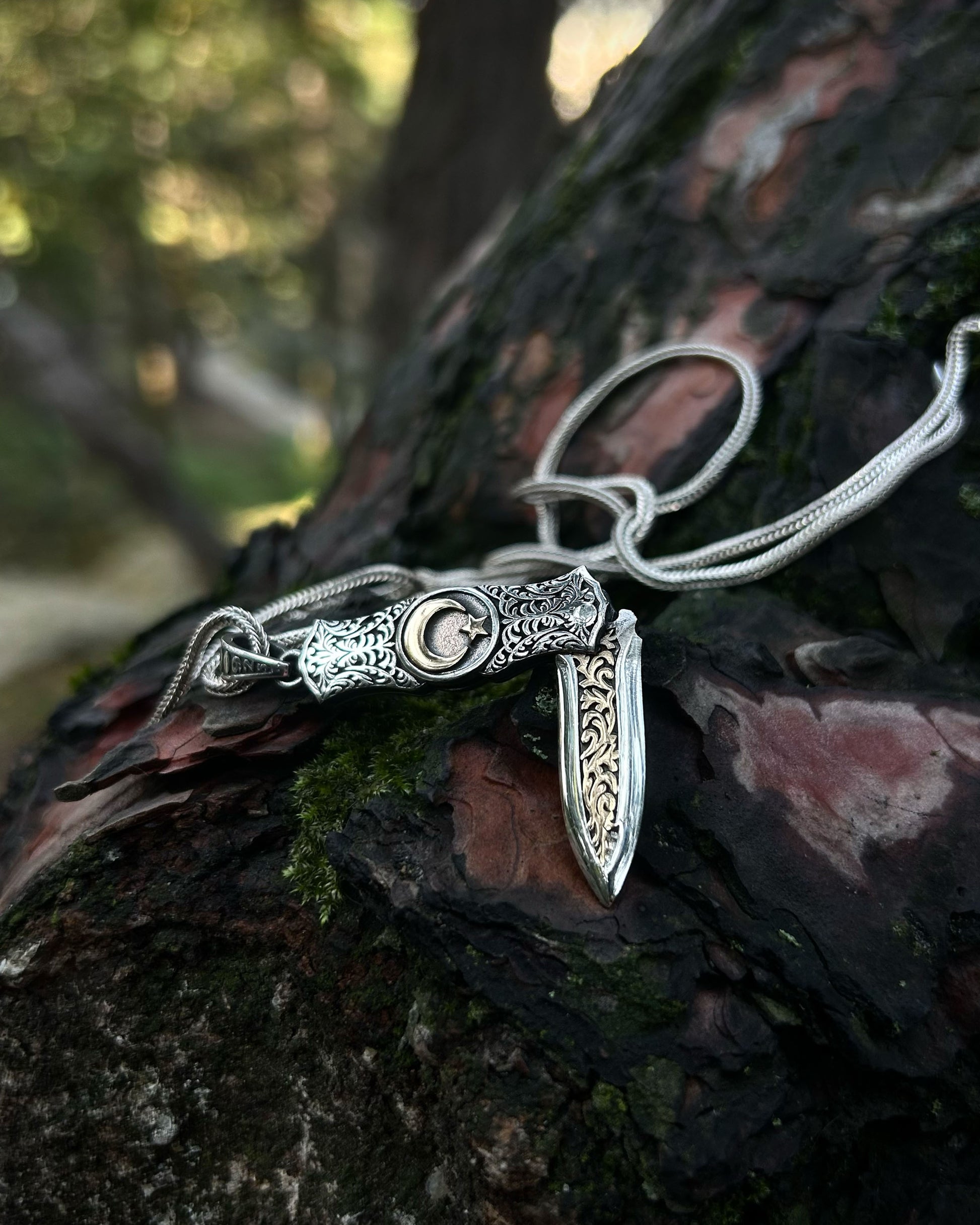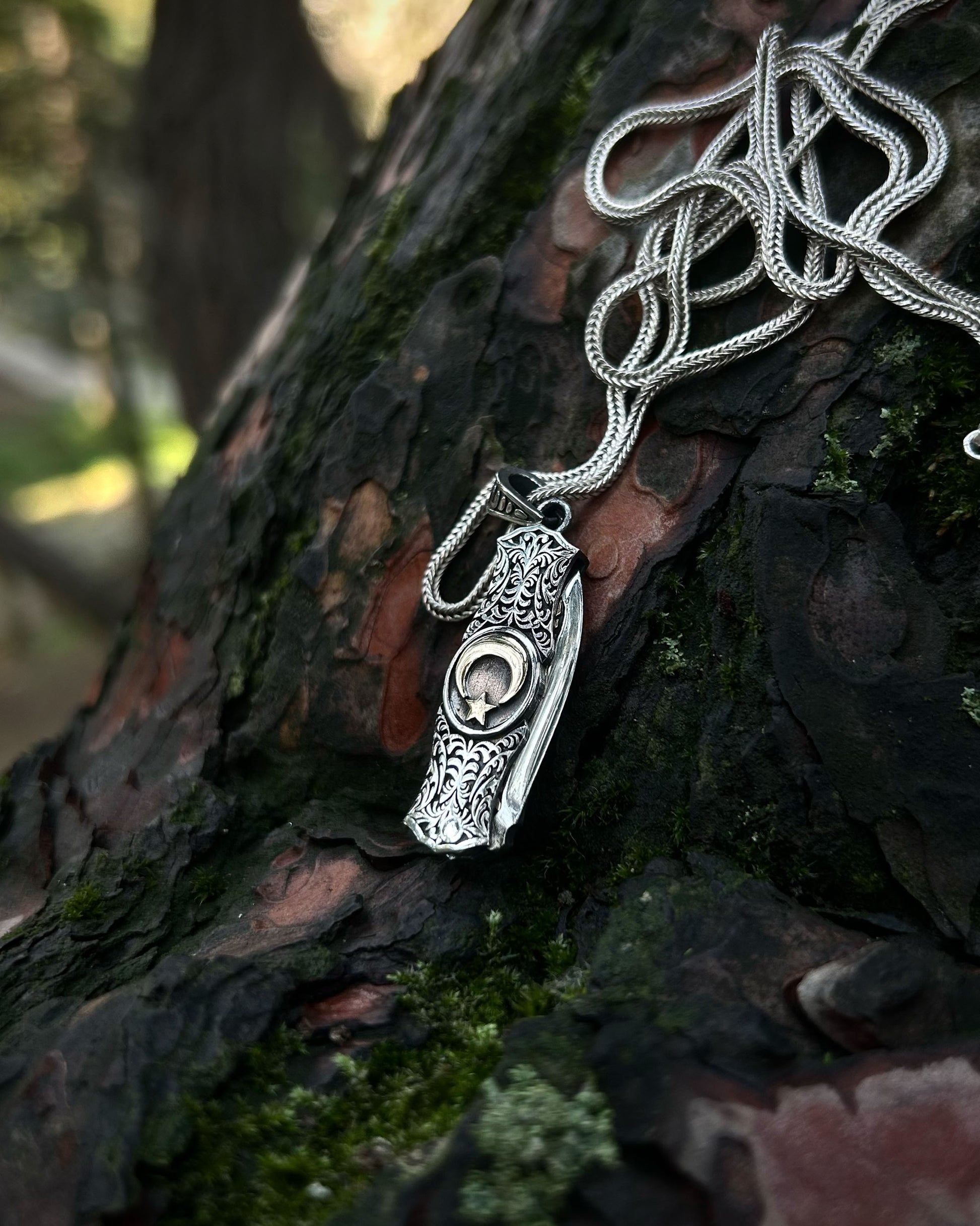Milli gururumuz Ay Yıldız ve şaşırtıcı bir mekanizma bu tasarımda birleşiyor. 925 ayar gümüşten üretilen bu kolye, gövdesindeki otantik işlemeler ve parlayan Ay Yıldız kabartmasıyla dikkat çeker. Gerçek bir Türk çakısı gibi açılıp kapanabilen bu hareketli tasarım, vatan sevgisini cesur, keskin ve sıra dışı bir stille taşımak isteyenler için mükemmel bir seçimdir.