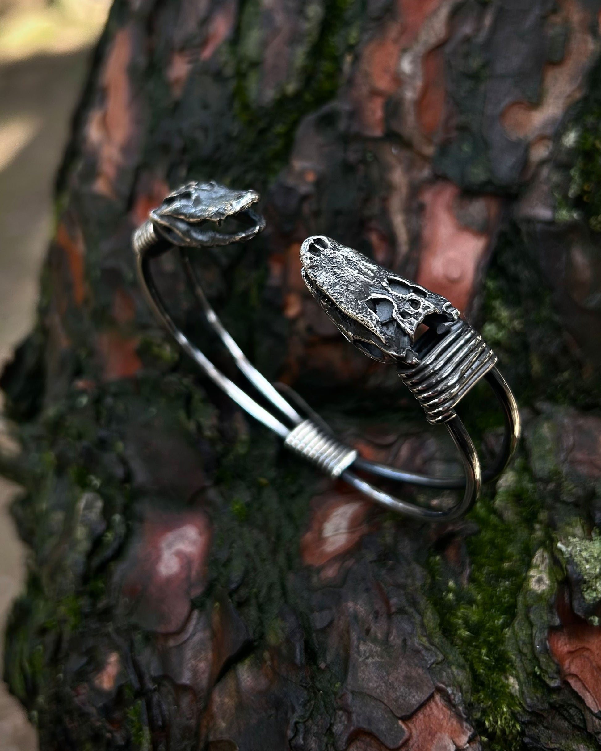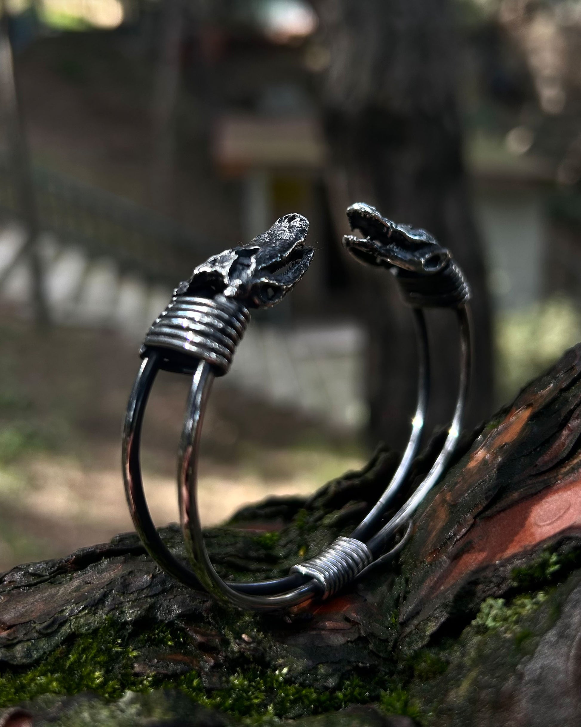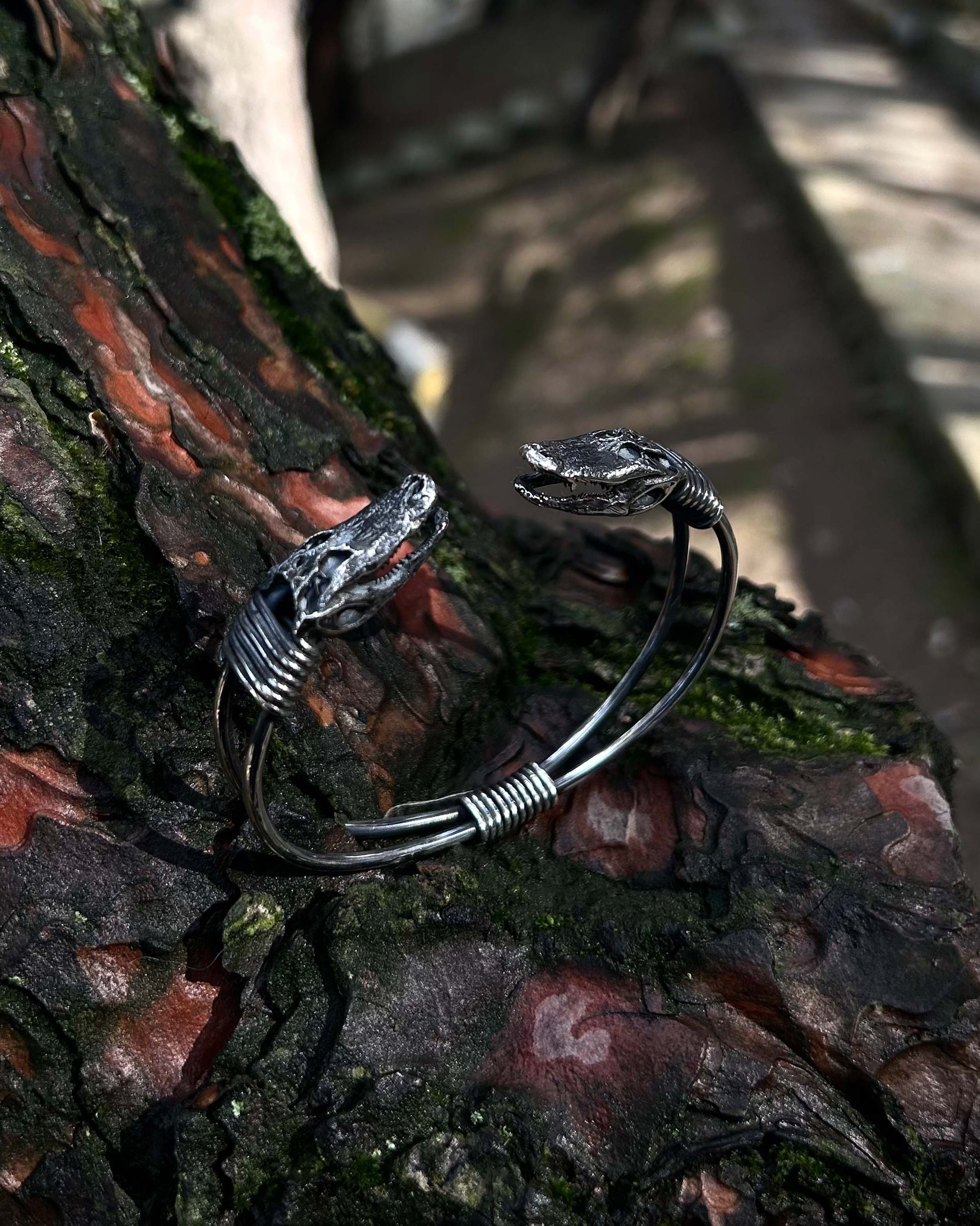 Pek çok kültürde timsahlar; koruma, sabır ve hayatta kalma içgüdüsünü temsil eder. Mitoloji ve kabile sanatında köklü bir yer tutar. Bu el yapımı kelepçe bileklik, detaylı işlenmiş çift timsah başı motifiyle güç, direnç ve ilkel kuvveti simgeler. Ayarlanabilir yapısıyla konforlu bir kullanımı sağlar. ◀