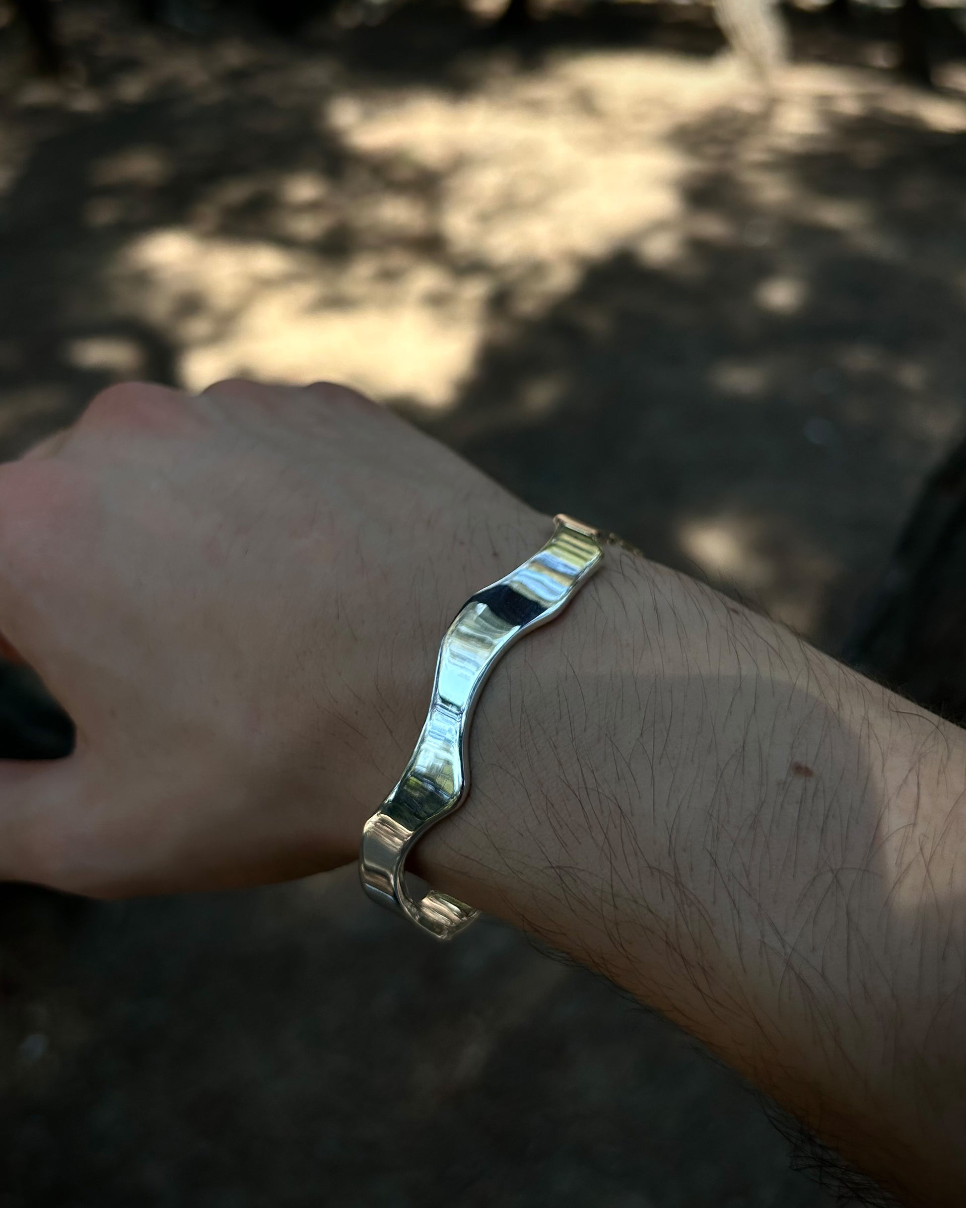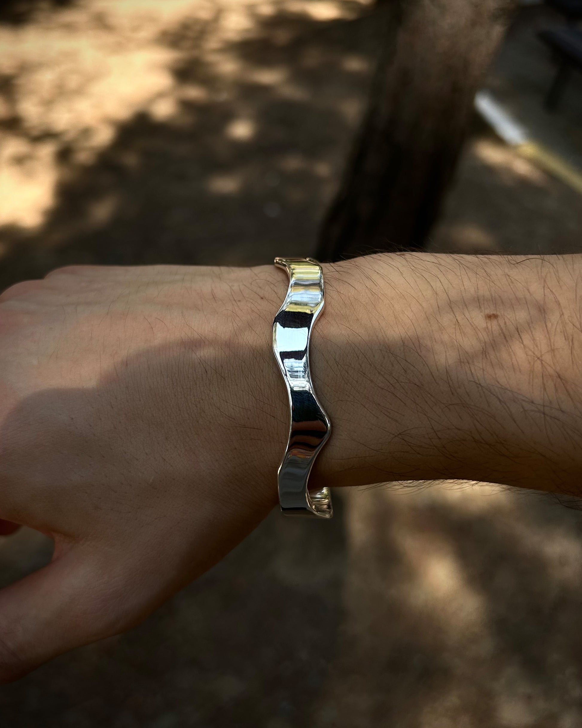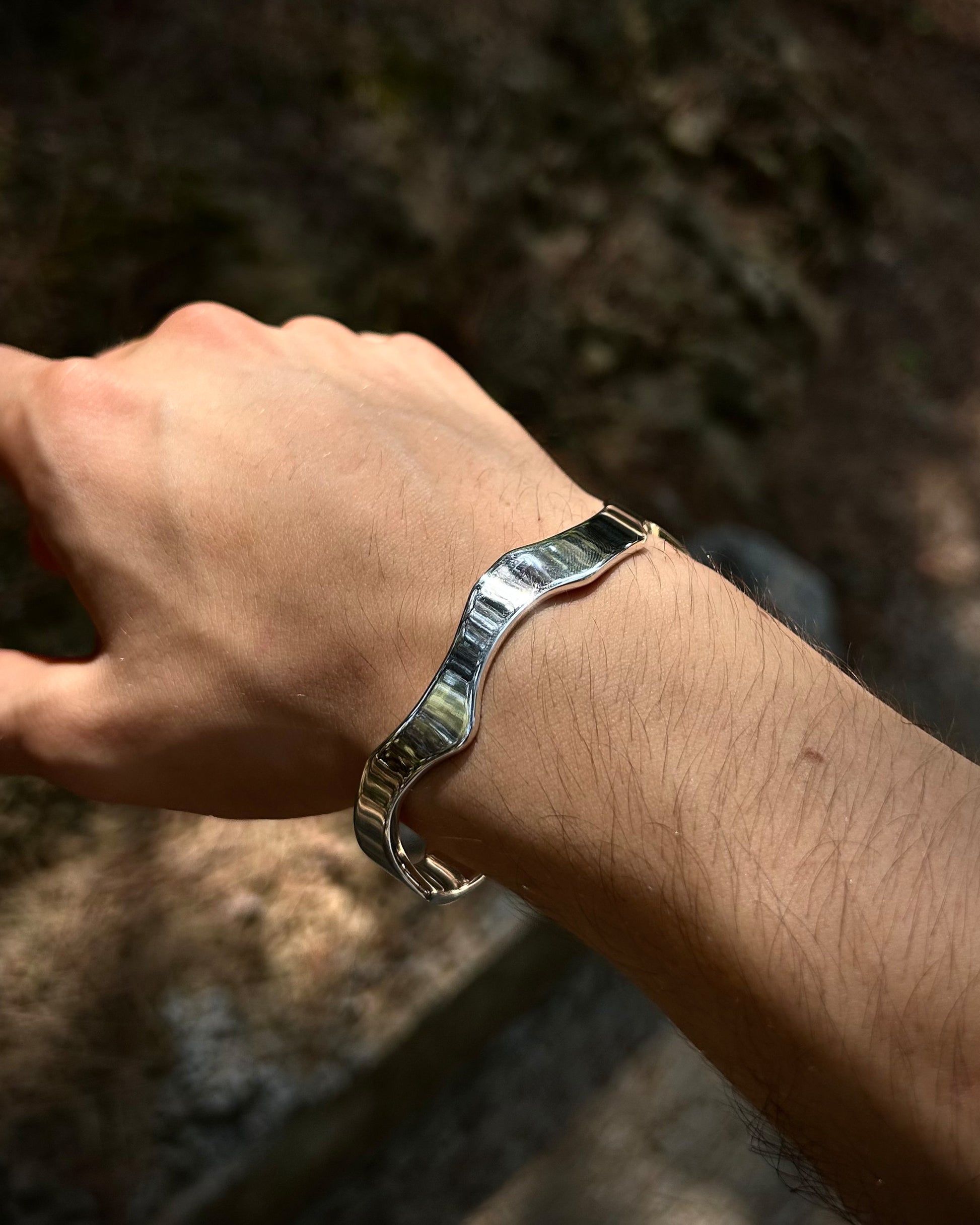 925 ayar gümüşten üretilmiş bu bilezik, zarif dalgalı tasarımıyla öne çıkar. Ayarlanabilir yapısı sayesinde farklı bilek ölçülerine uyum sağlar.