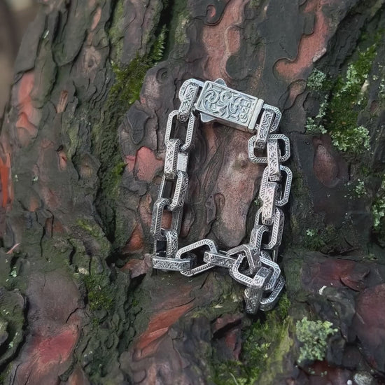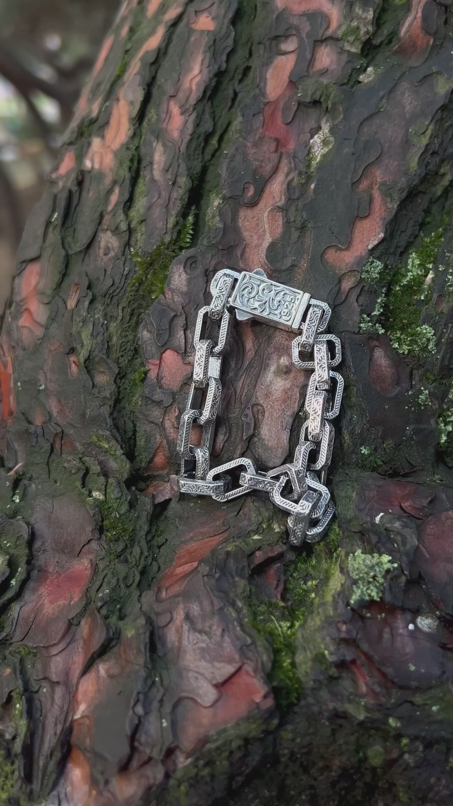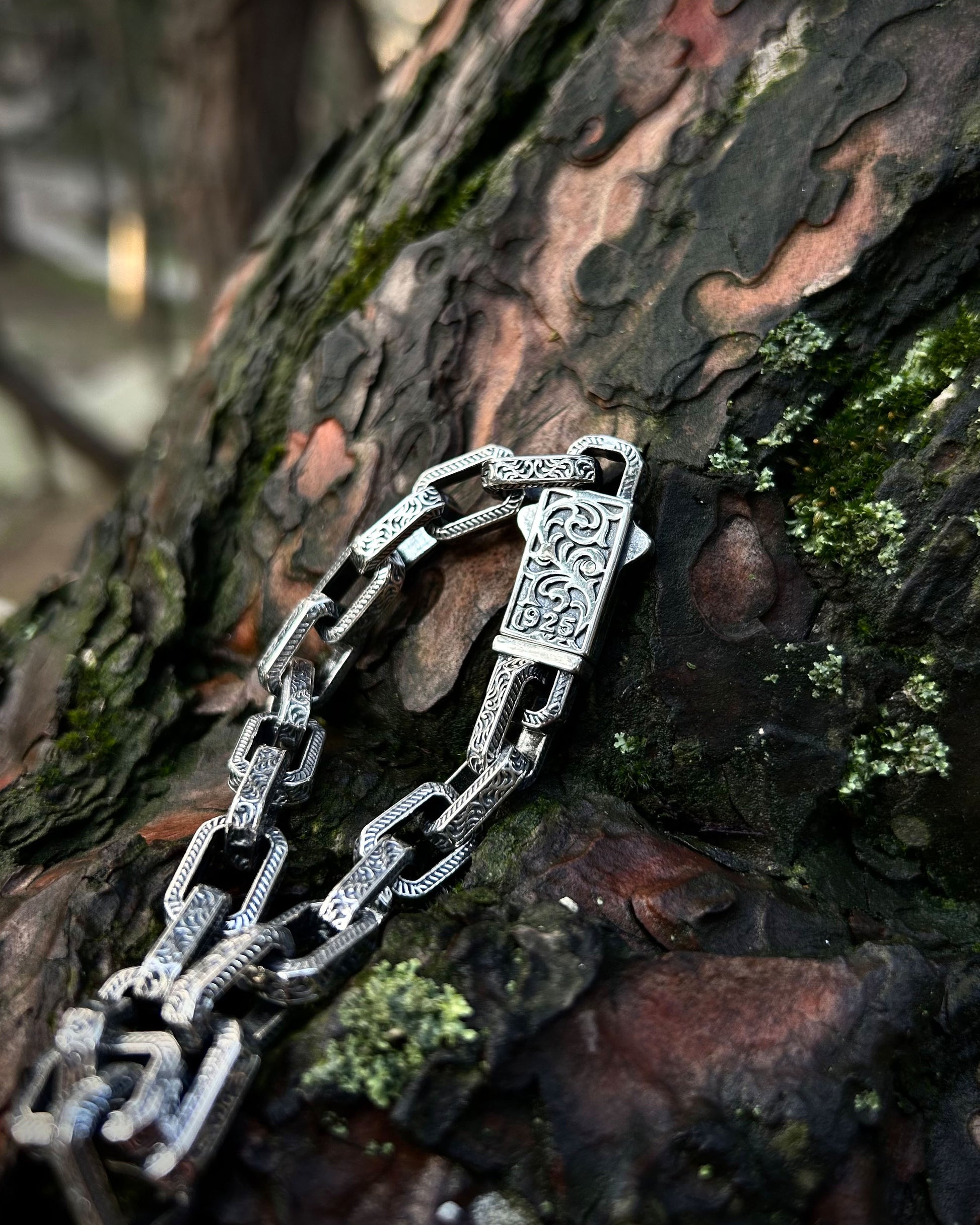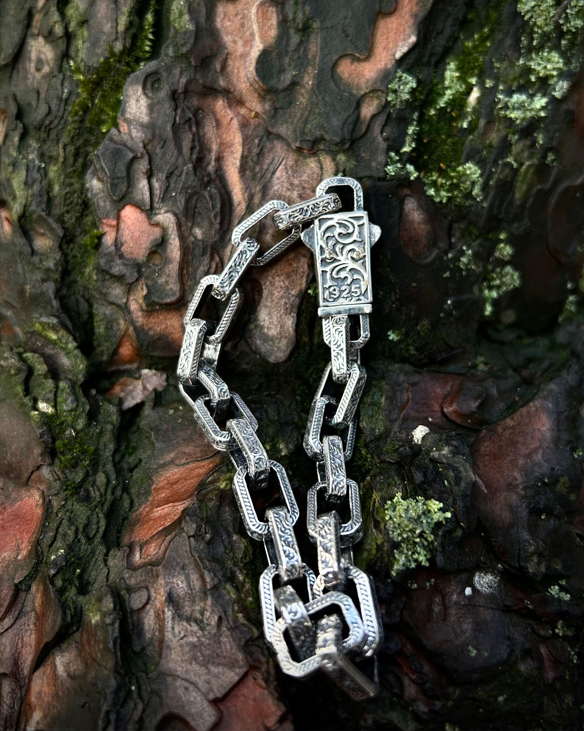 925 ayar gümüşten üretilmiş bu bileklik, özel işlemeli detaylarıyla klasik link zincir tasarımına farklı bir karakter kazandırır