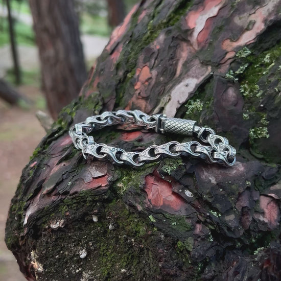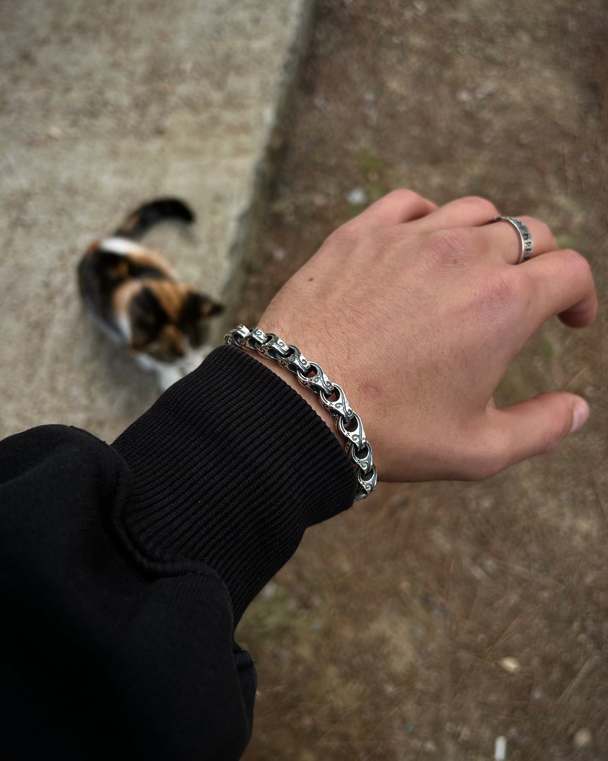 Erkekler için 925 ayar gümüşten üretilmiş bu bileklik, işlemeli oval halkalardan oluşan özel bir zincir tasarımına sahiptir.