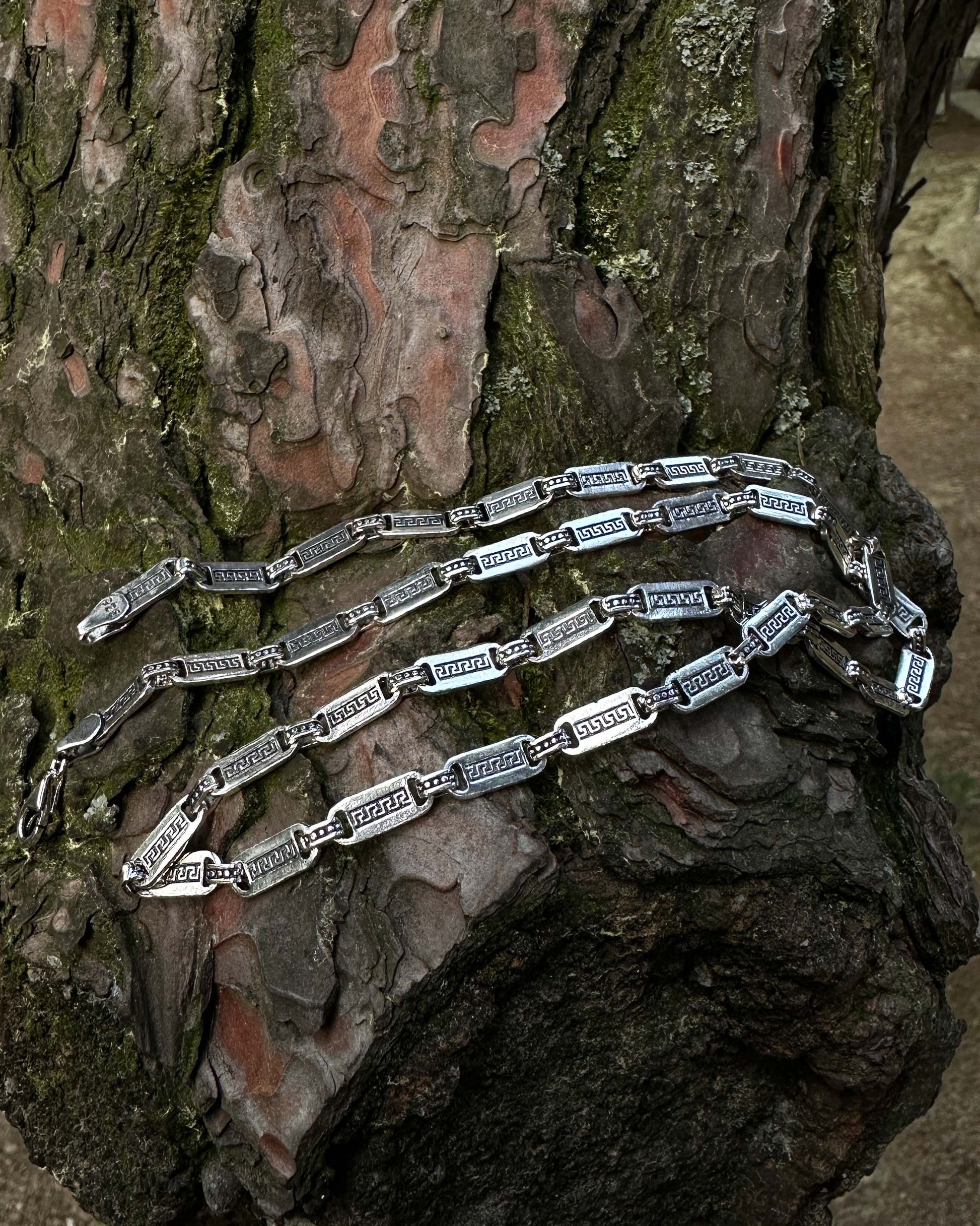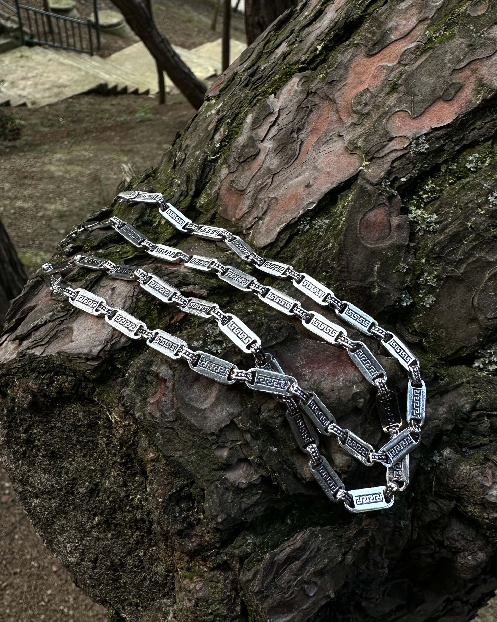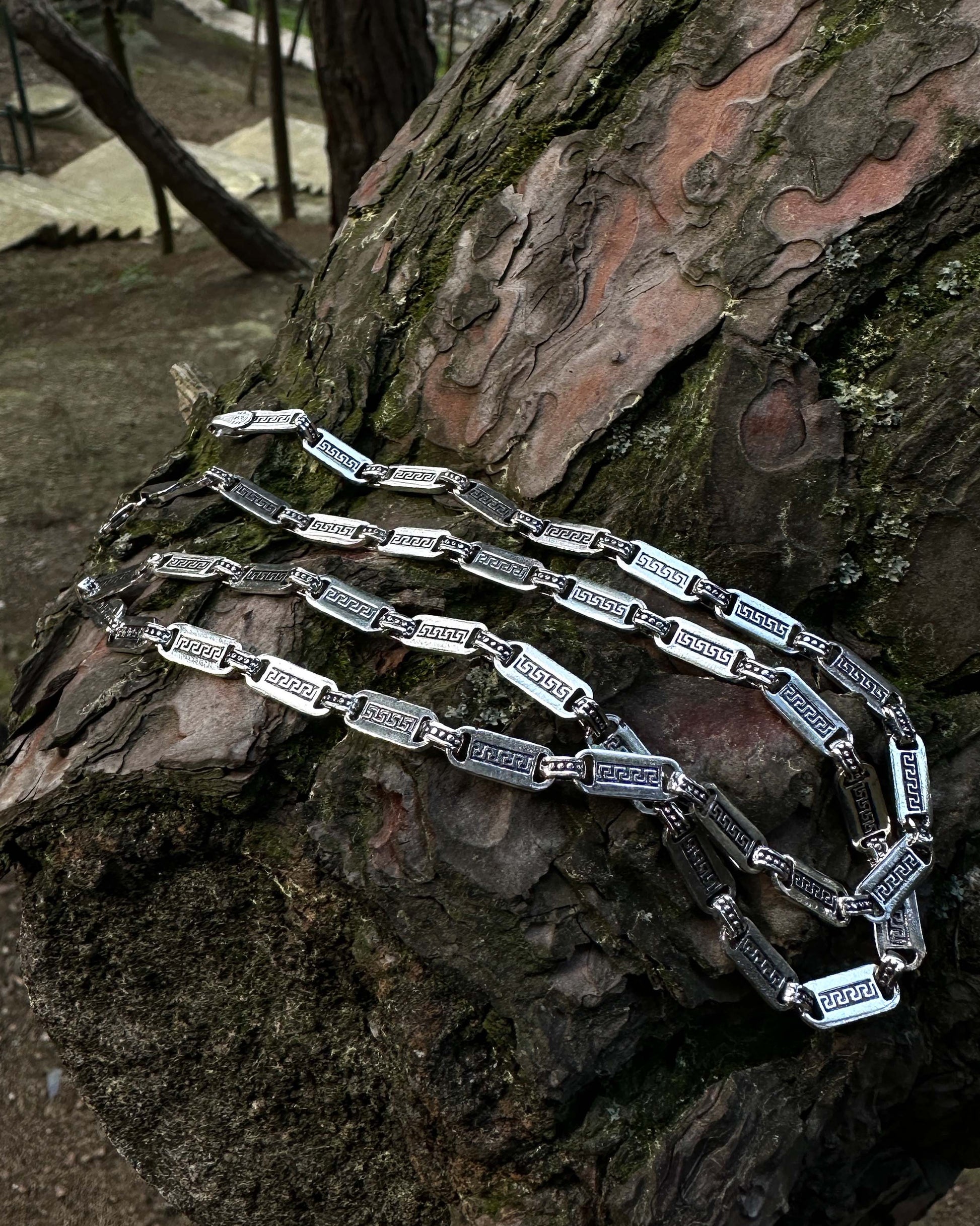 925 ayar gümüşten üretilmiş bu zincir, Antik Yunan’ın sembolü haline gelen Meandros (Greek Key) motifine sahiptir. Sonsuzluk, düzen ve güç anlamlarını taşır.