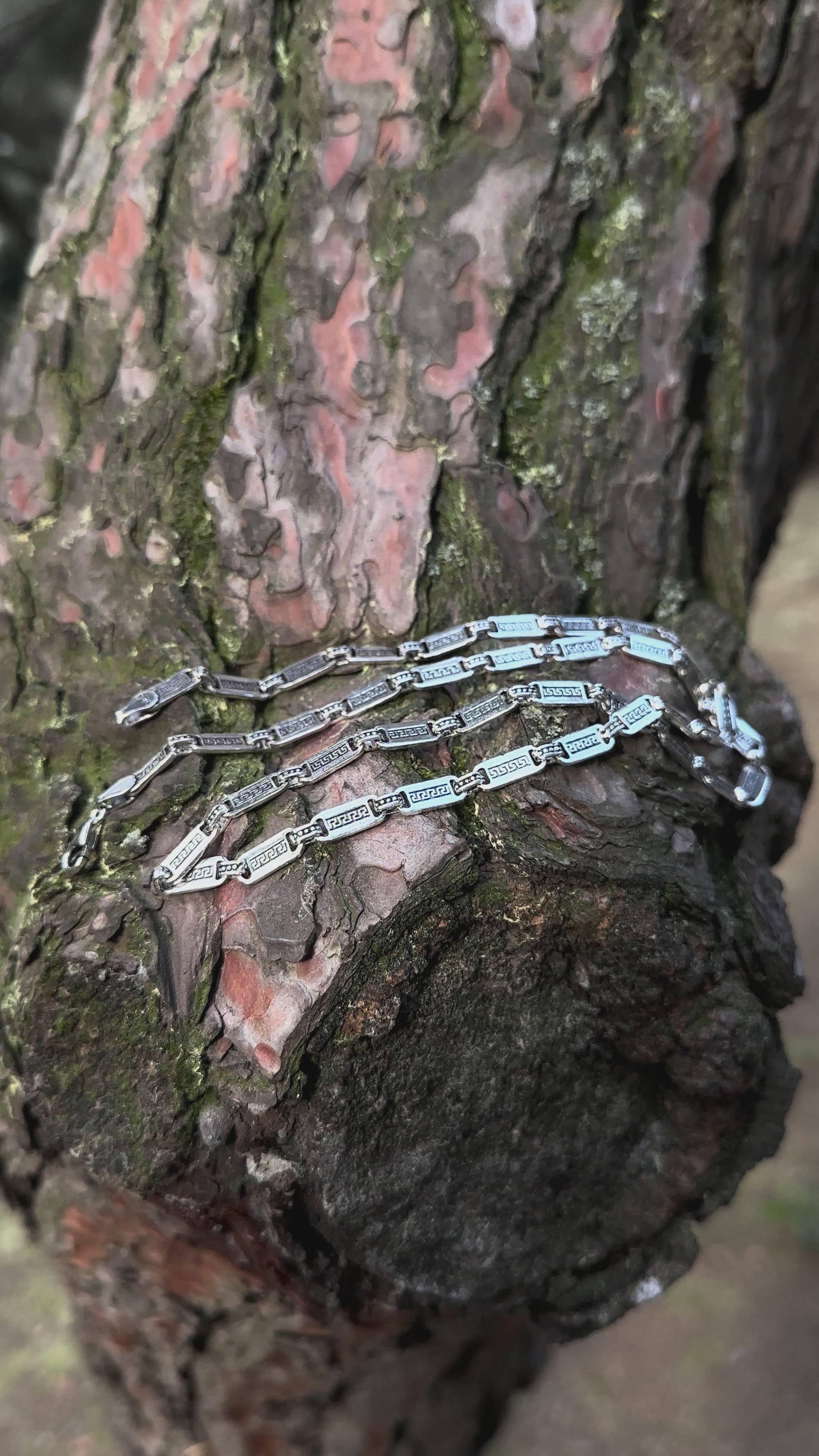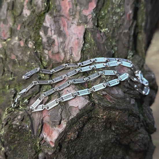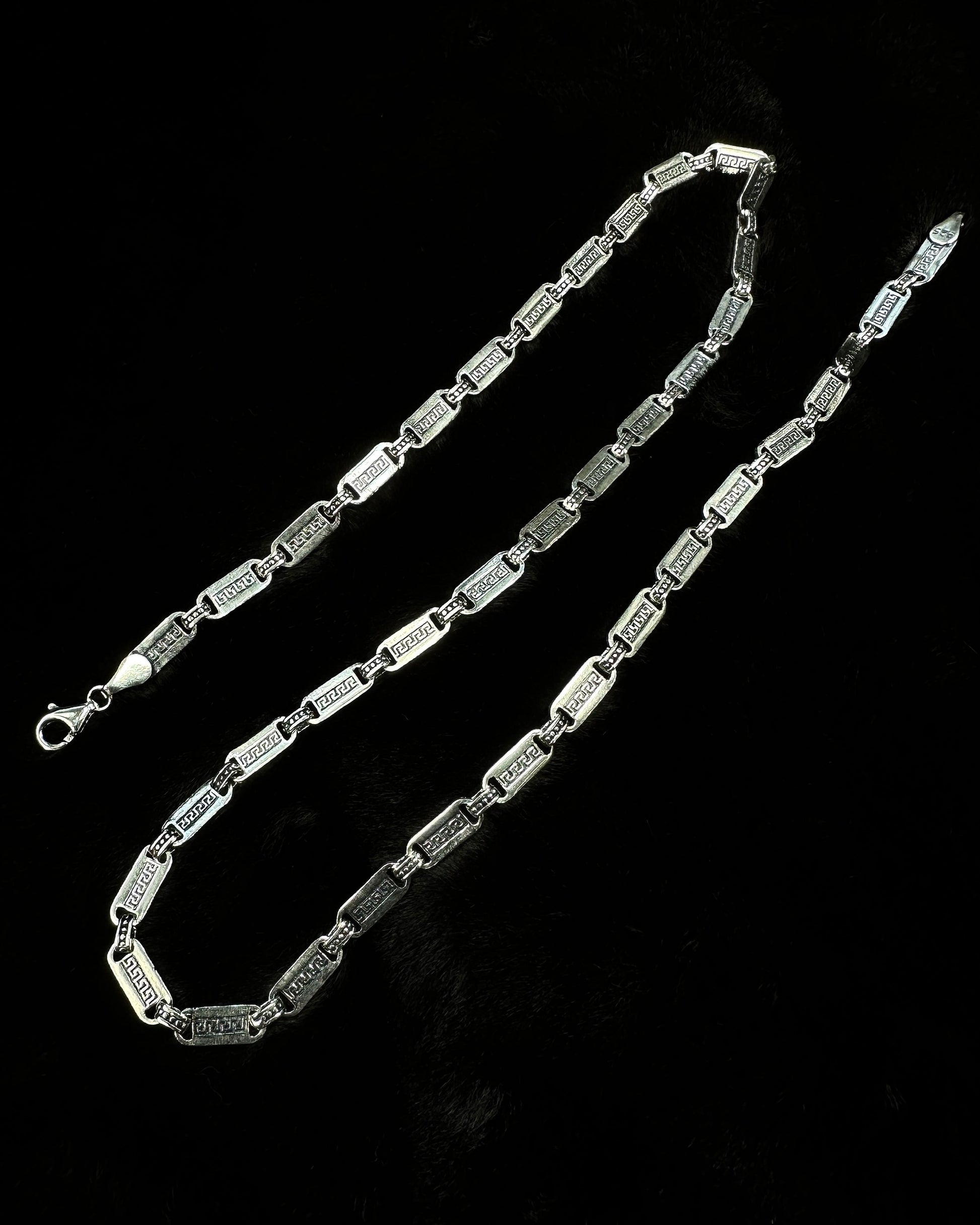 925 ayar gümüşten üretilmiş bu zincir, Antik Yunan’ın sembolü haline gelen Meandros (Greek Key) motifine sahiptir. Sonsuzluk, düzen ve güç anlamlarını taşır.