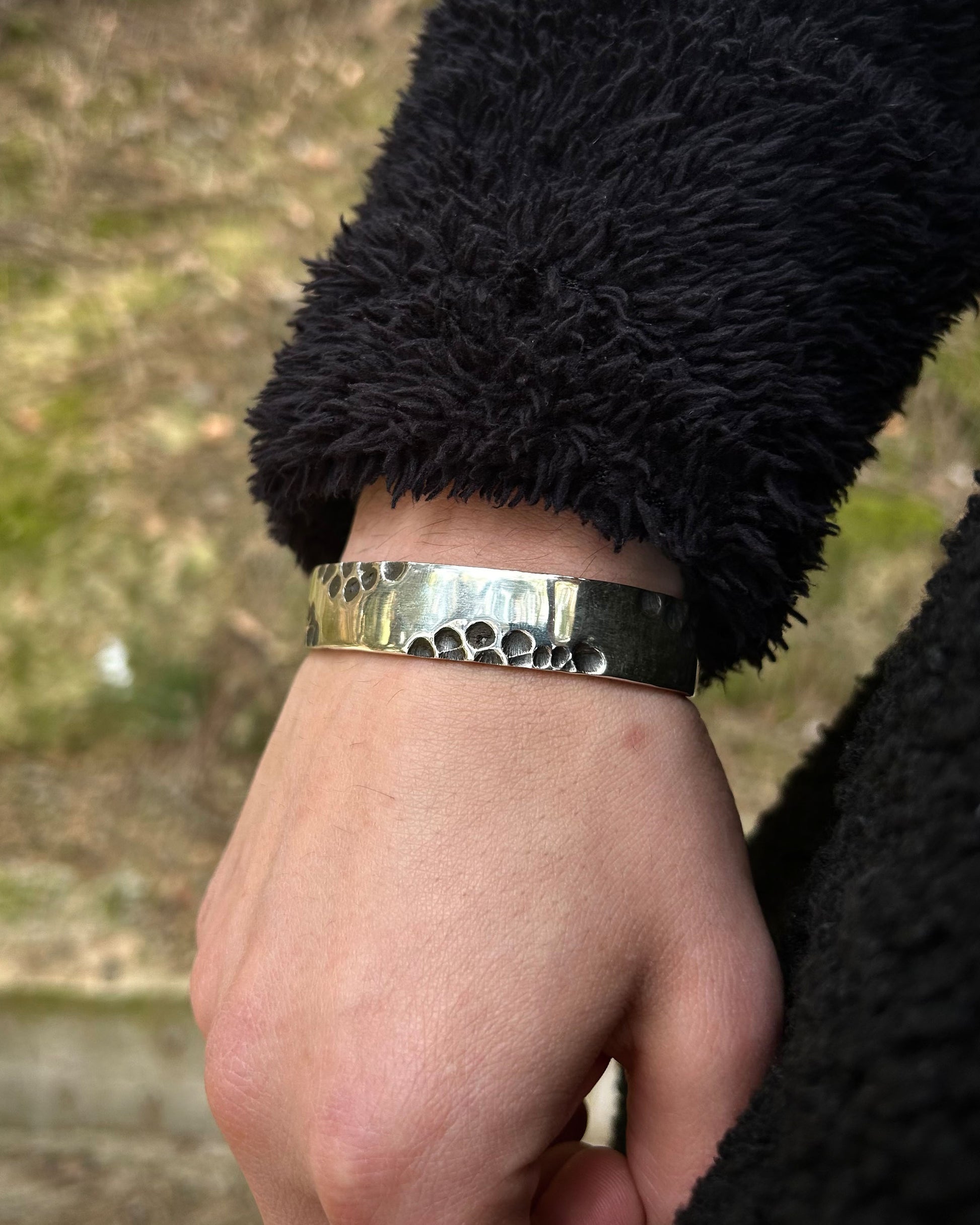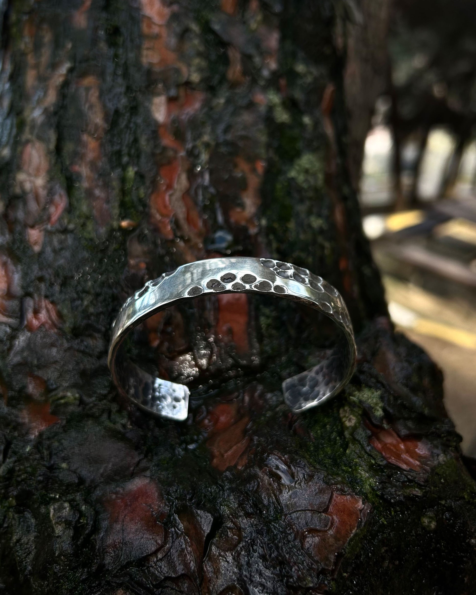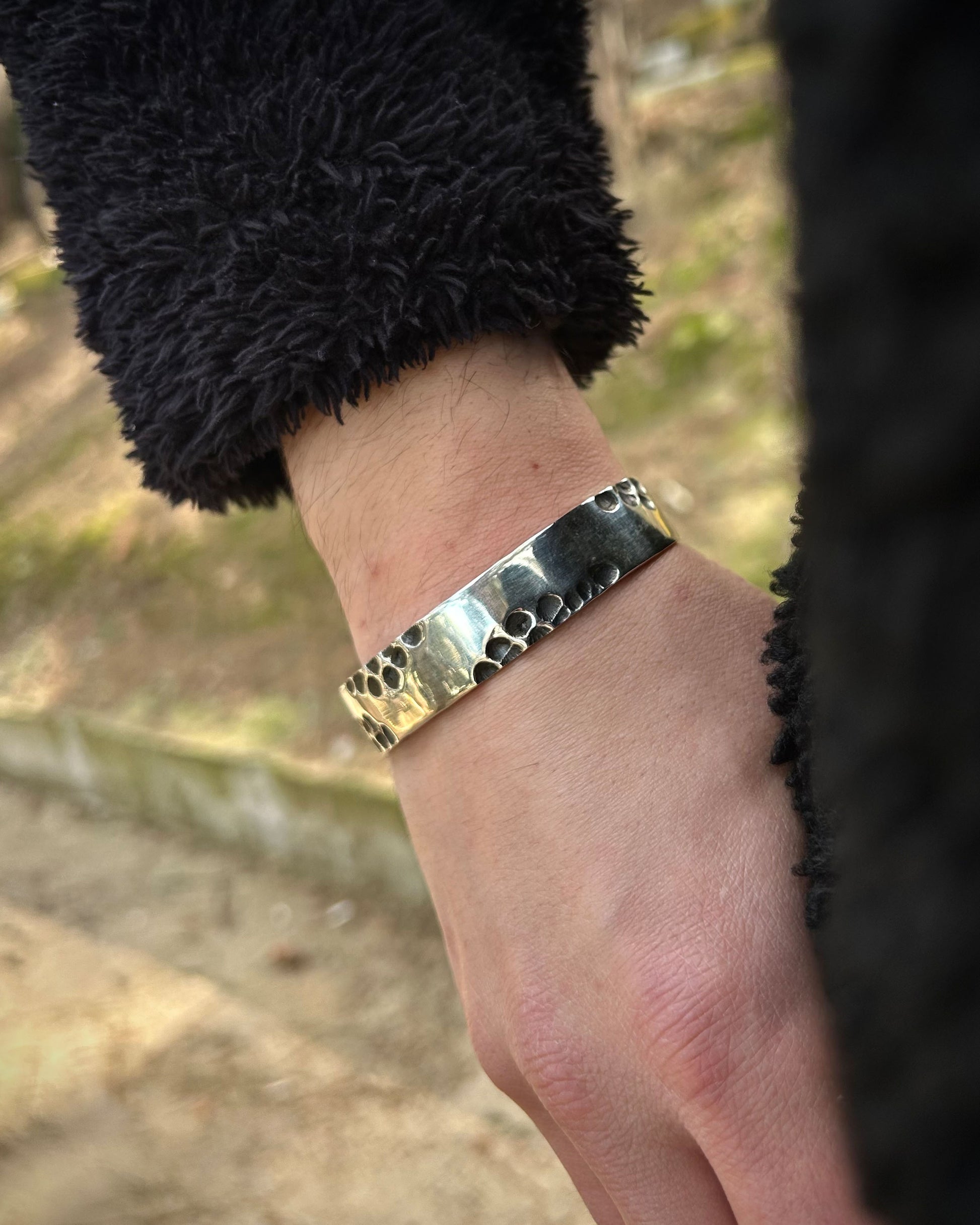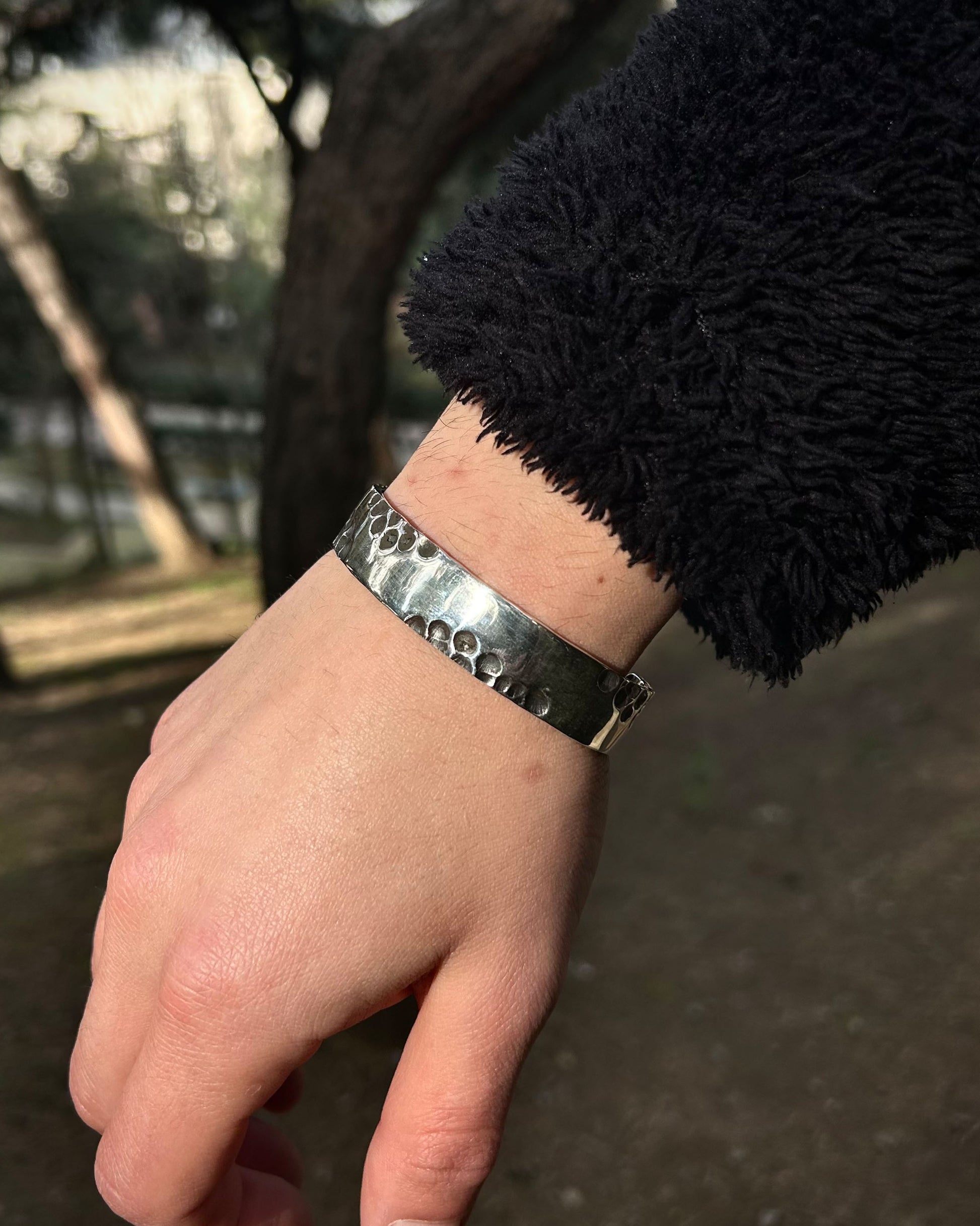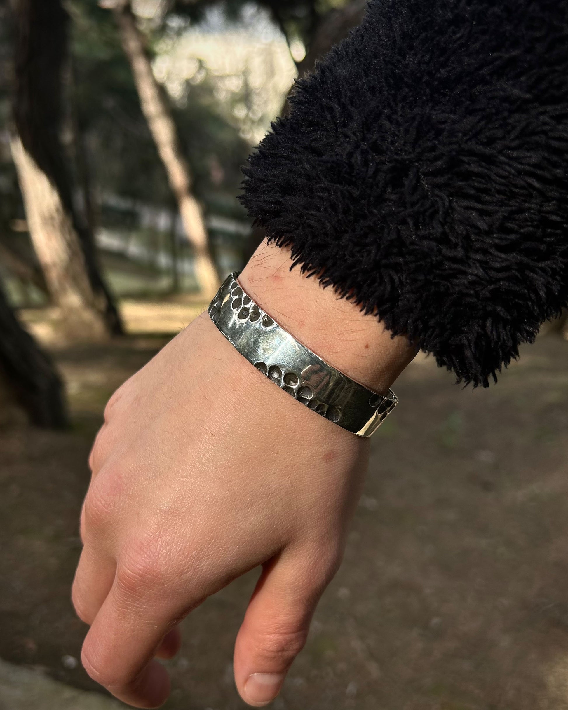 Bu 45 gramlık ağır bileklik, çekiçle oluşturulmuş dövme yüzeyiyle hem rustik hem de klasik bir hava sunar. El işçiliğiyle üretilmiş bu parça, güçlü ve zamansız bir stil isteyenler için tasarlandı. Ayarlanabilir yapısıyla bileğe rahatça oturur.