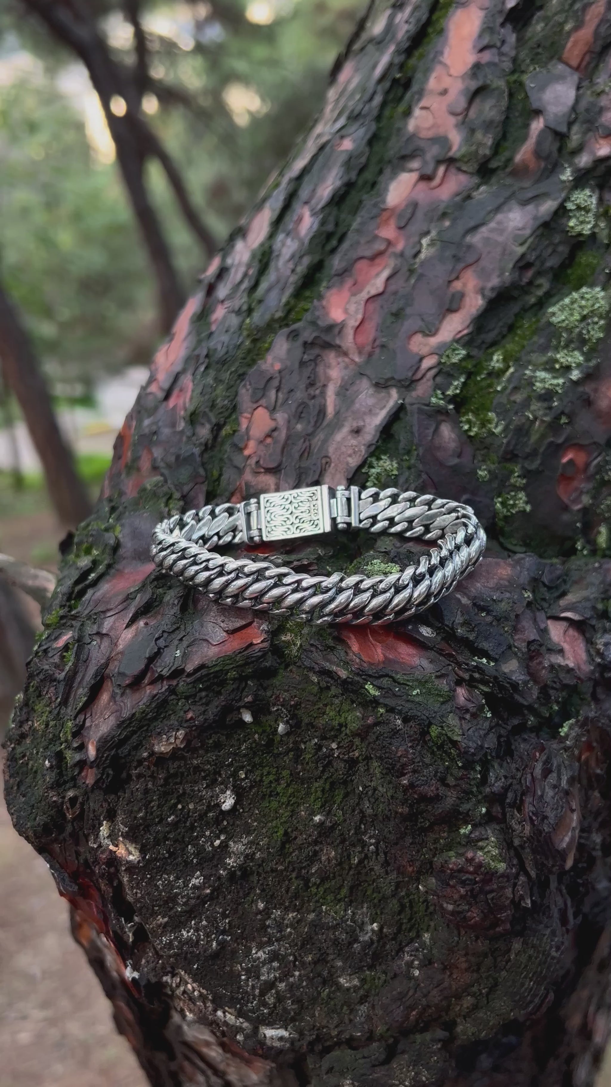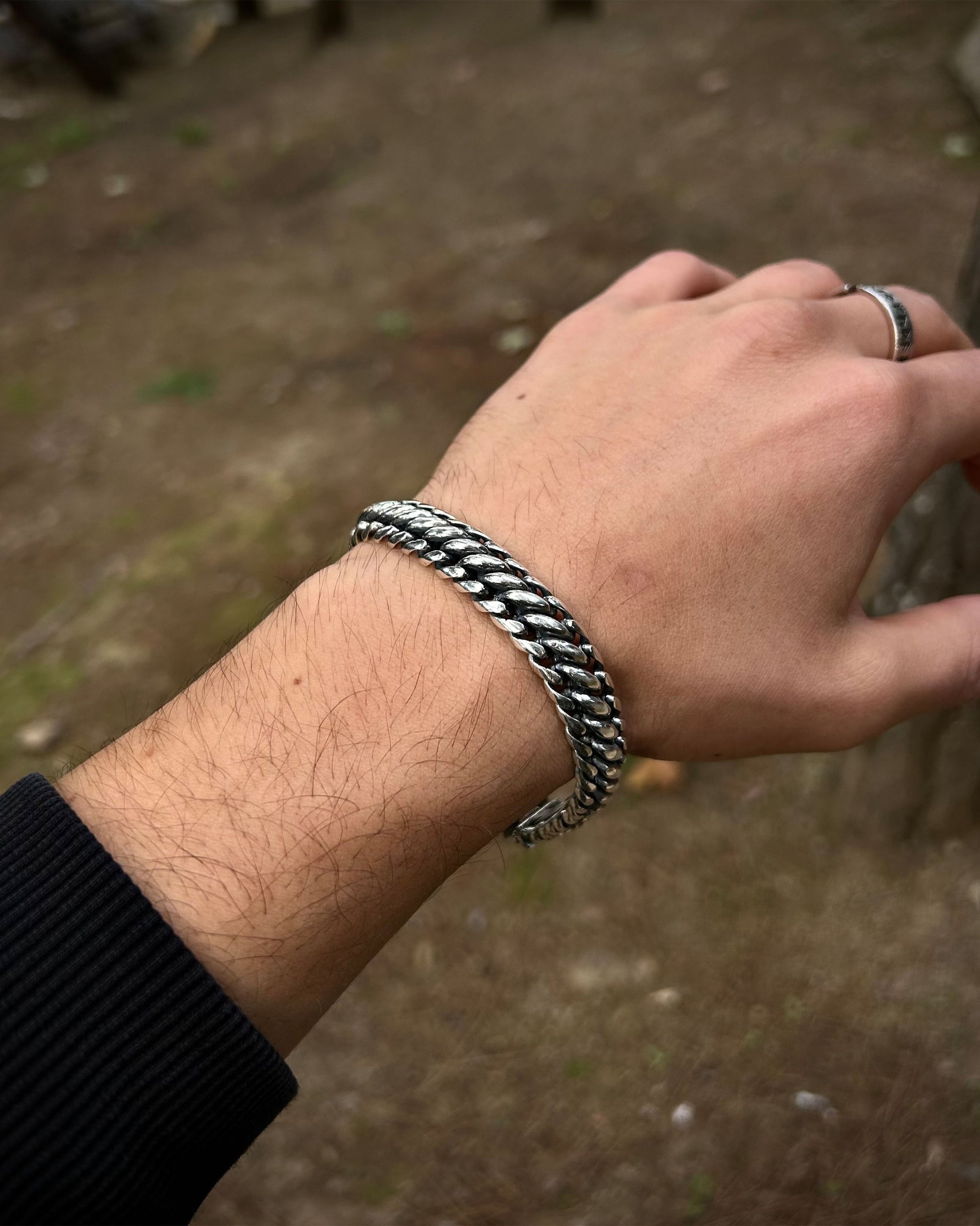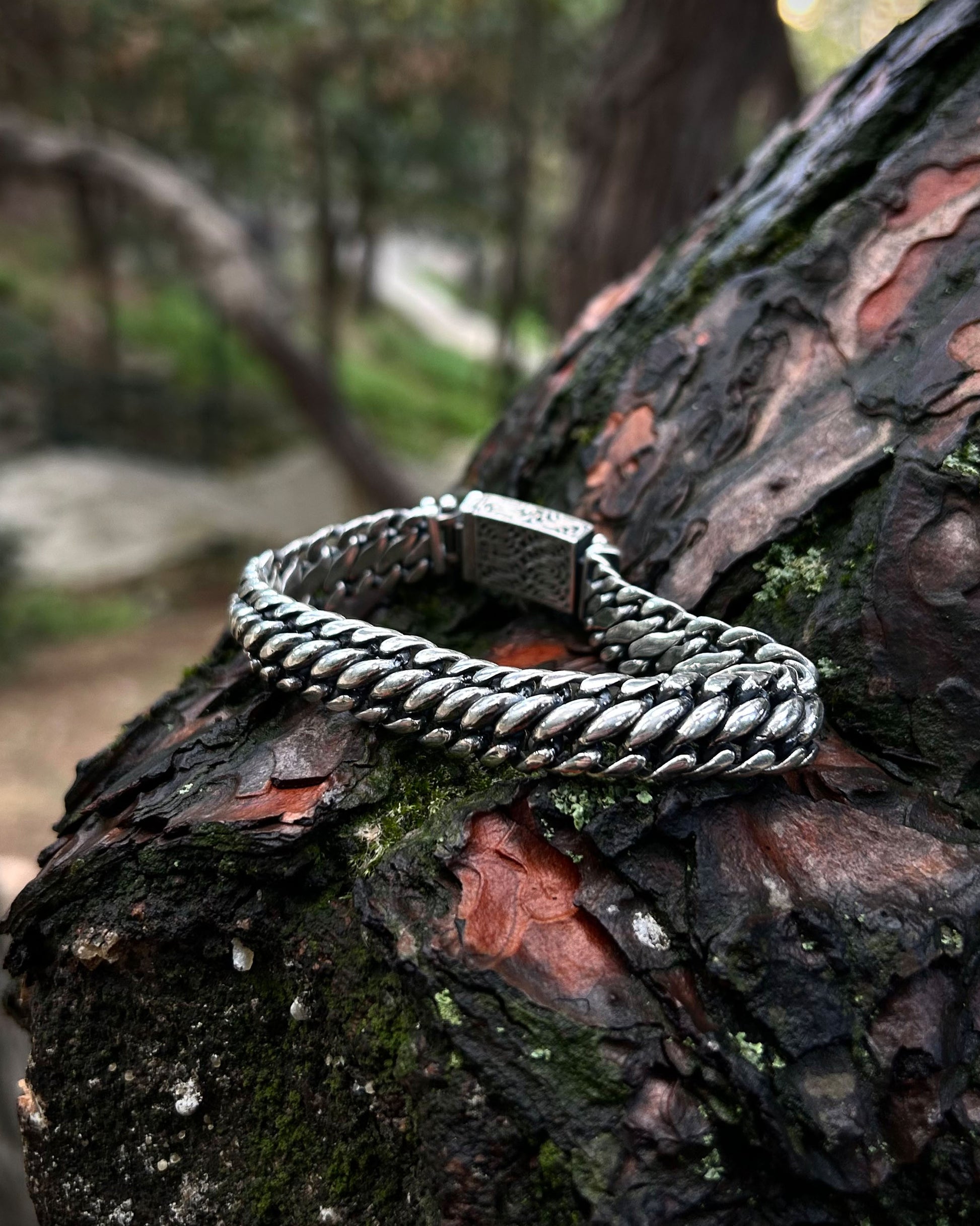 Bu dikkat çekici zincir bileklik, 925 ayar gümüşten el işçiliğiyle üretilmiş ve her detayıyla fark yaratan özgün bir tasarıma sahiptir. Kalın yapısı ve karakterli formu, günlük kullanımda güçlü bir stil oluşturur.