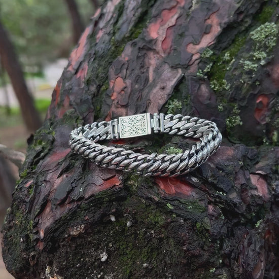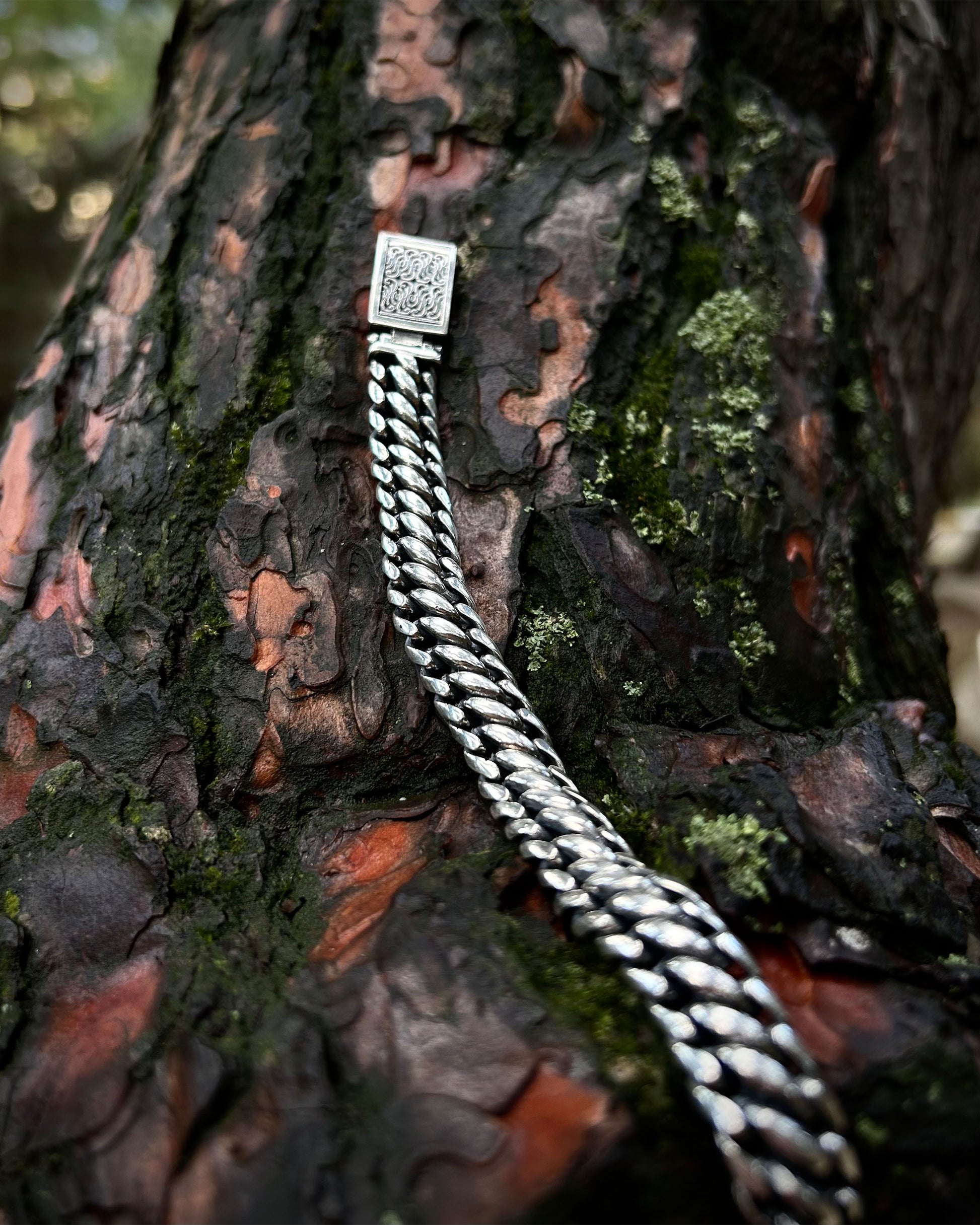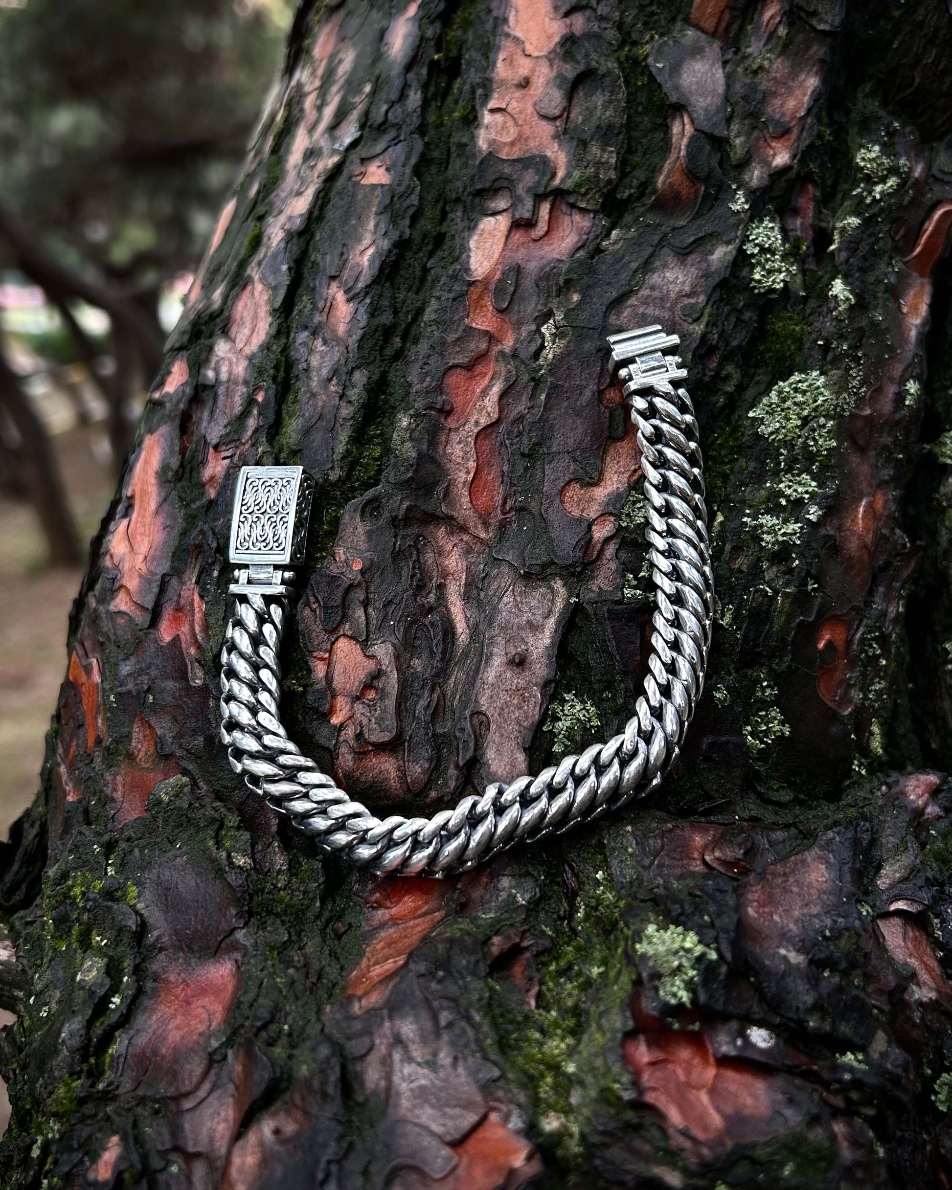Bu dikkat çekici zincir bileklik, 925 ayar gümüşten el işçiliğiyle üretilmiş ve her detayıyla fark yaratan özgün bir tasarıma sahiptir. Kalın yapısı ve karakterli formu, günlük kullanımda güçlü bir stil oluşturur.
