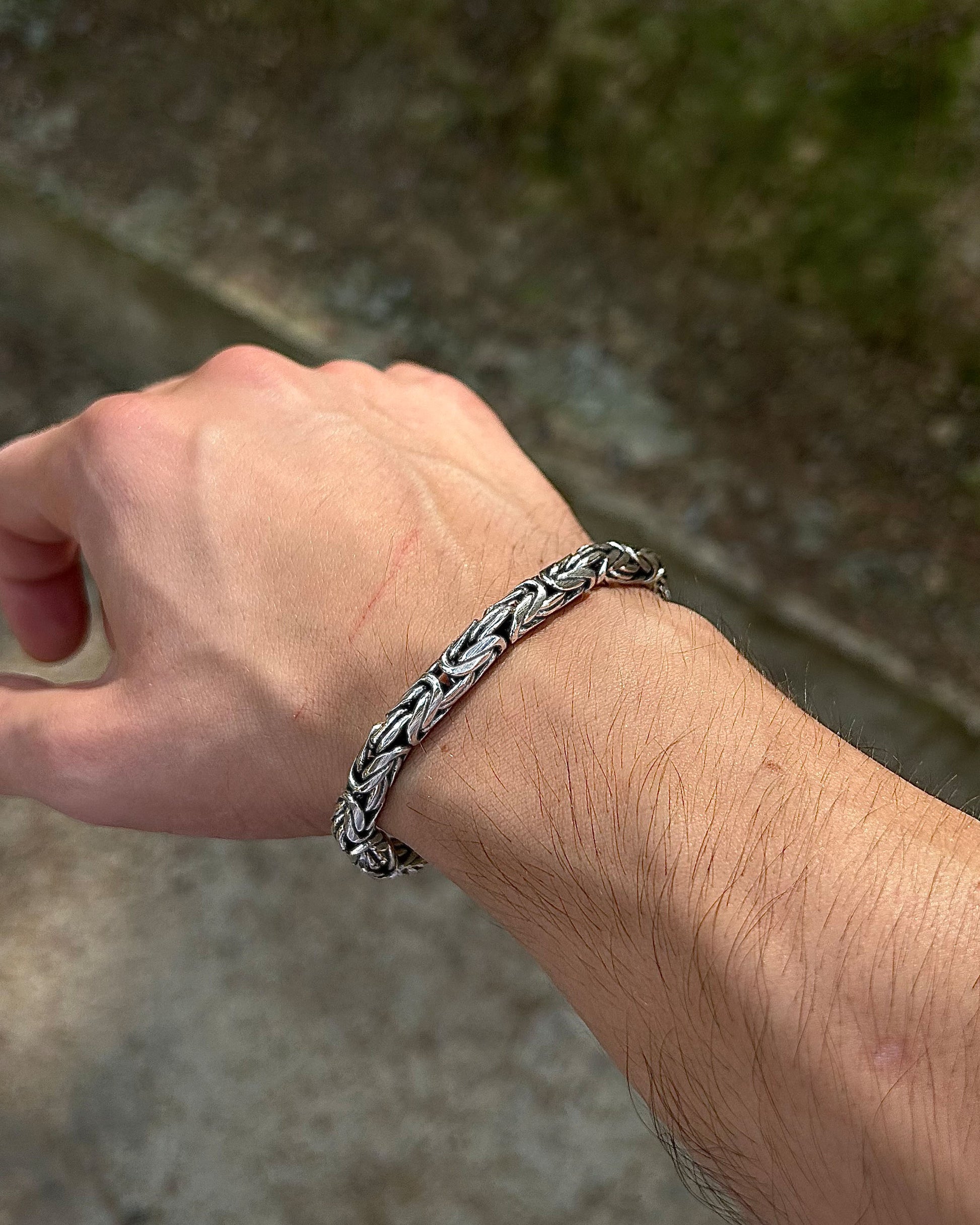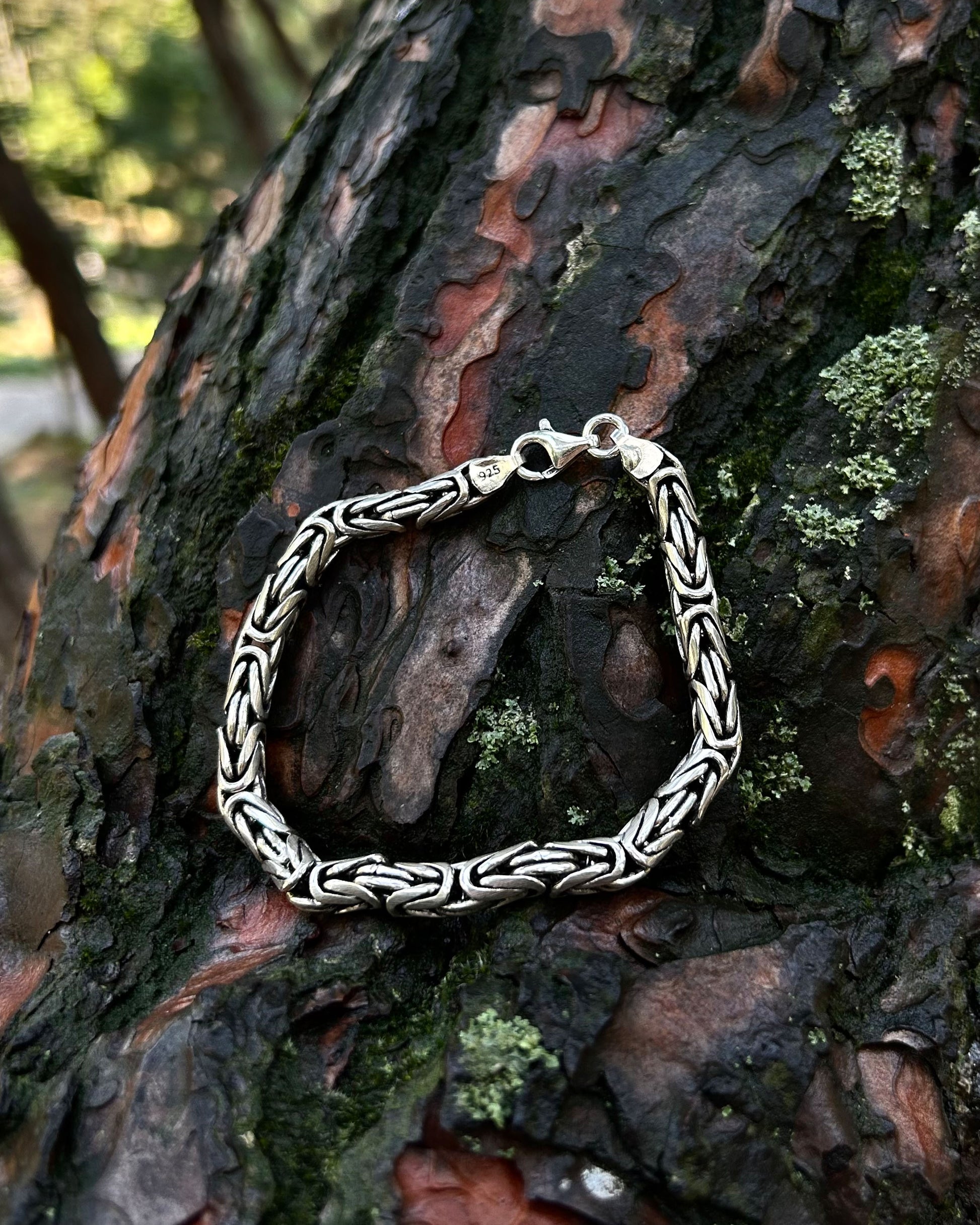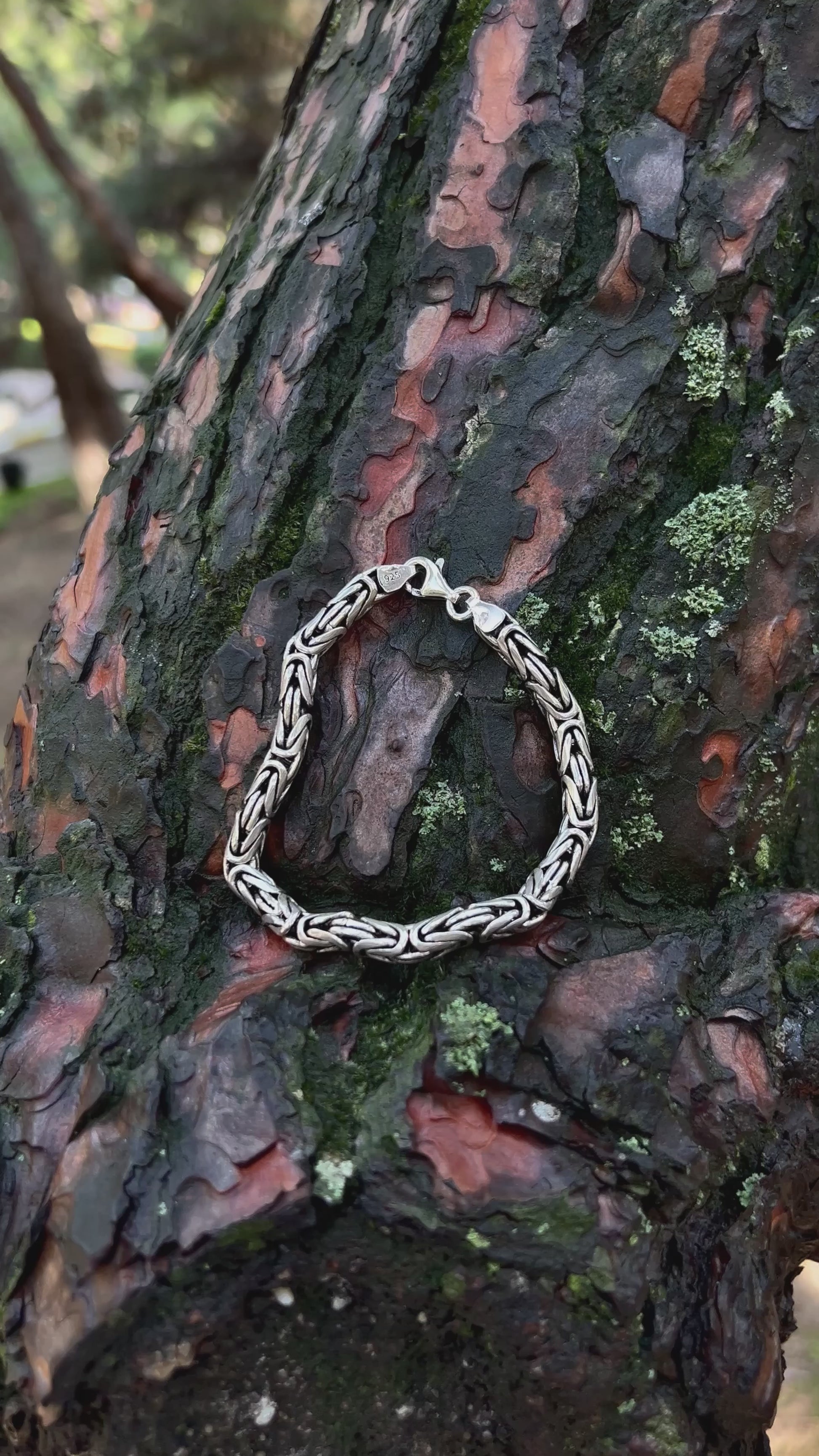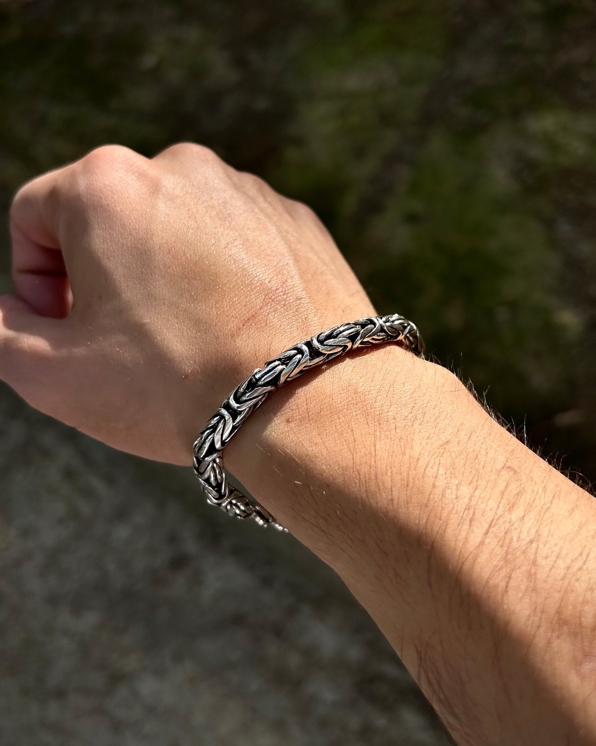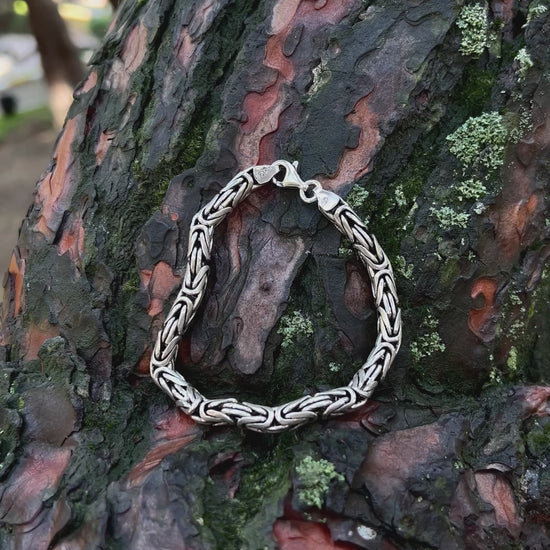 925 ayar gümüşten üretilmiş bu ağır bileklik, 6 mm kalınlığındaki yuvarlak halkalardan oluşan Bizans kral zincir tasarımına sahiptir.