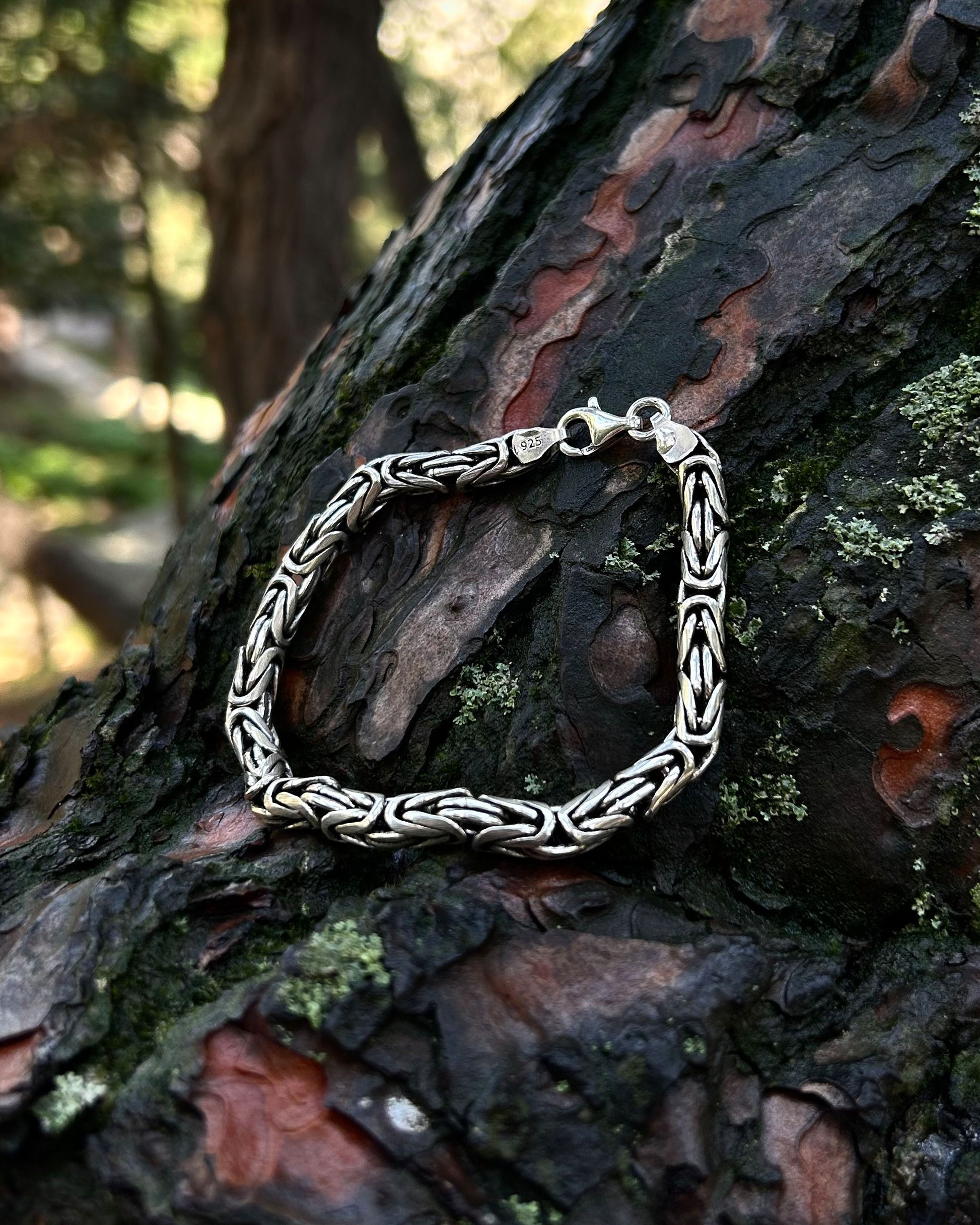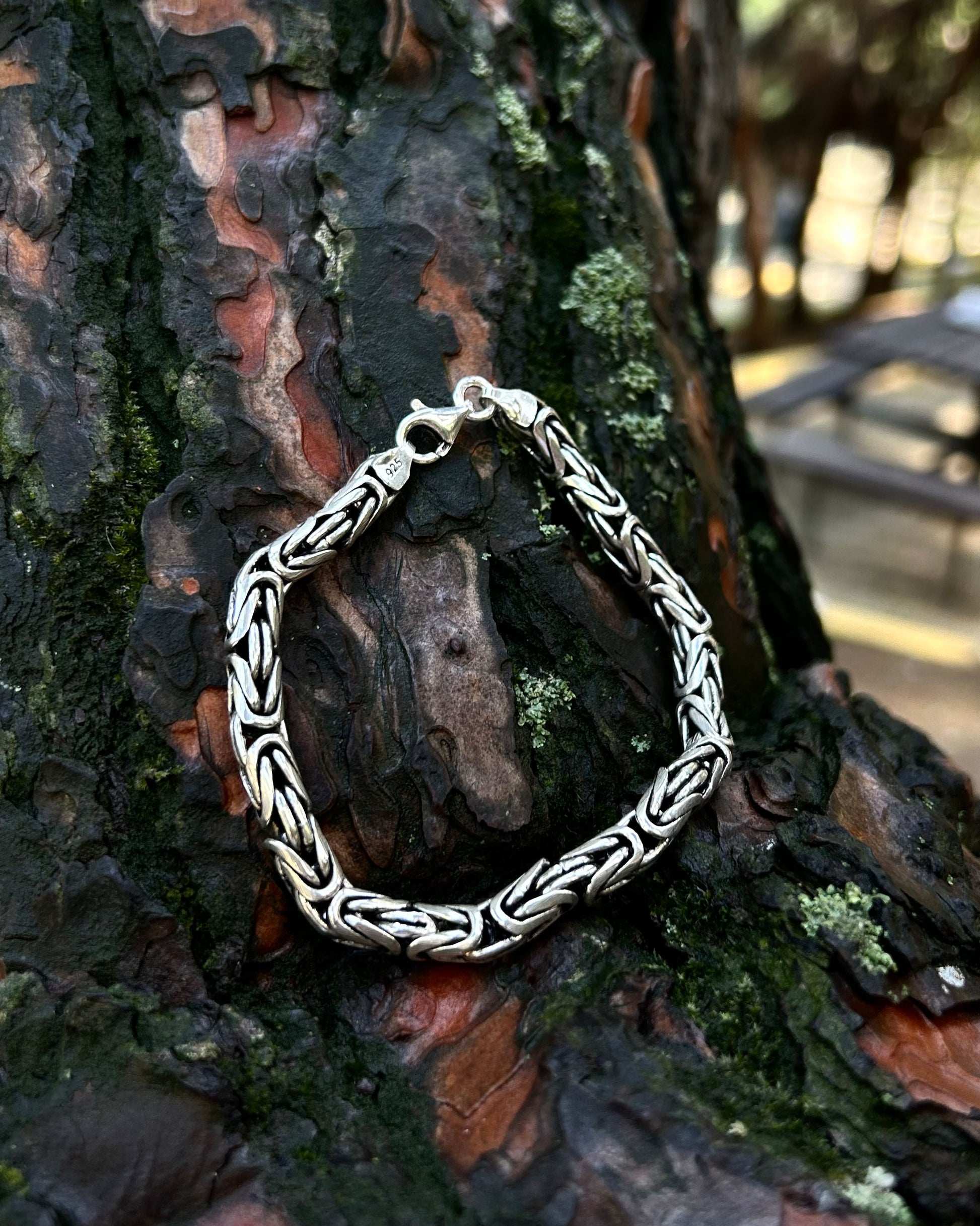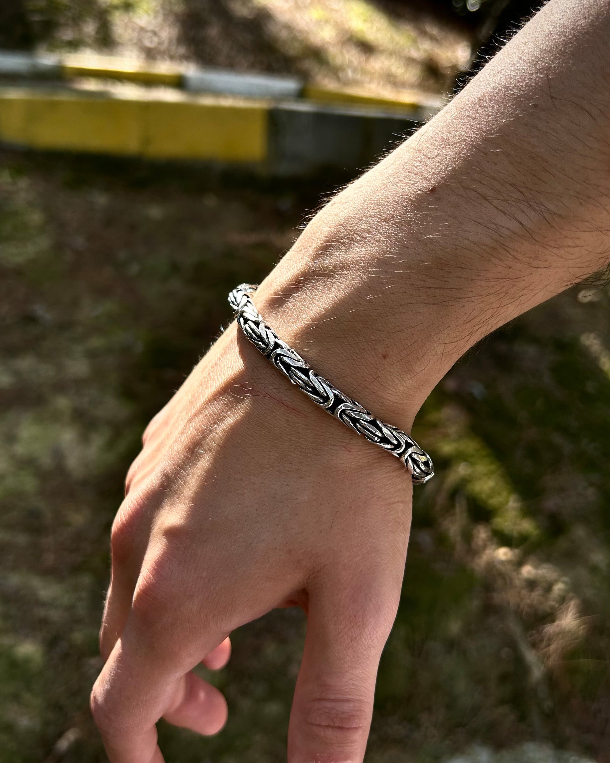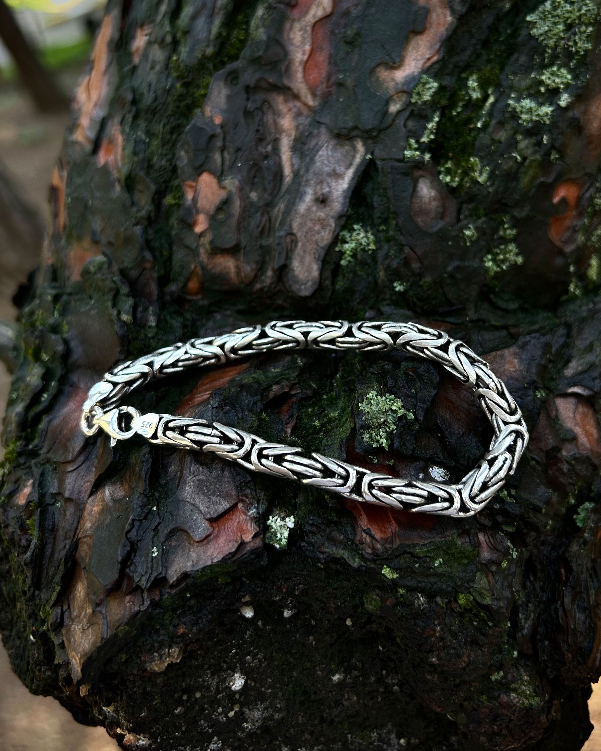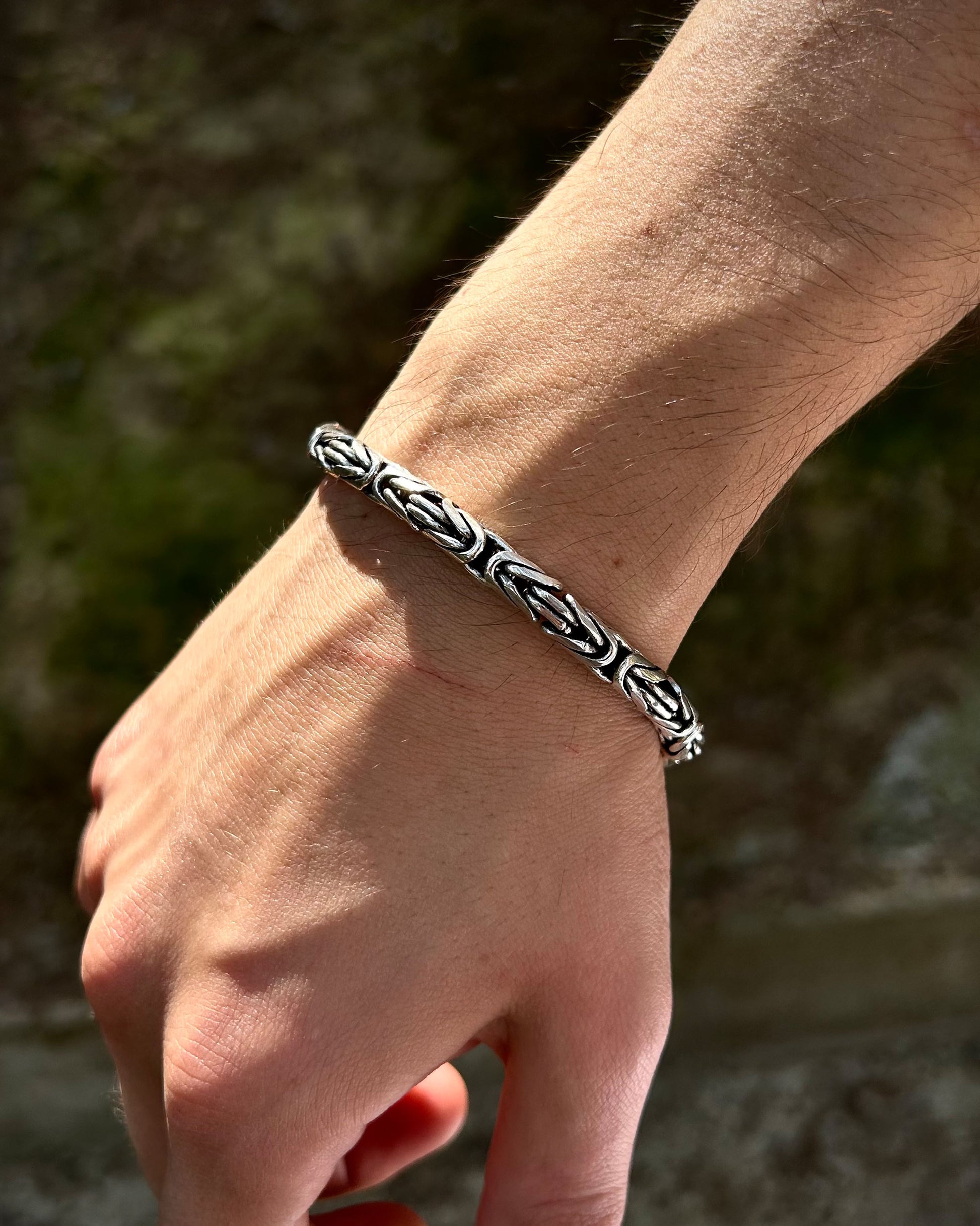 925 ayar gümüşten üretilmiş bu ağır bileklik, 6 mm kalınlığındaki yuvarlak halkalardan oluşan Bizans kral zincir tasarımına sahiptir.