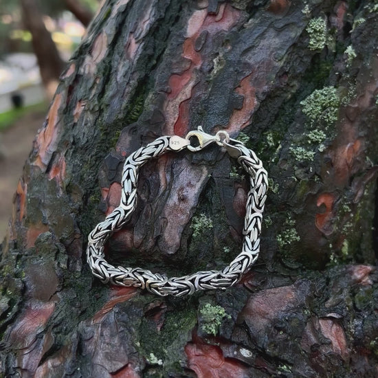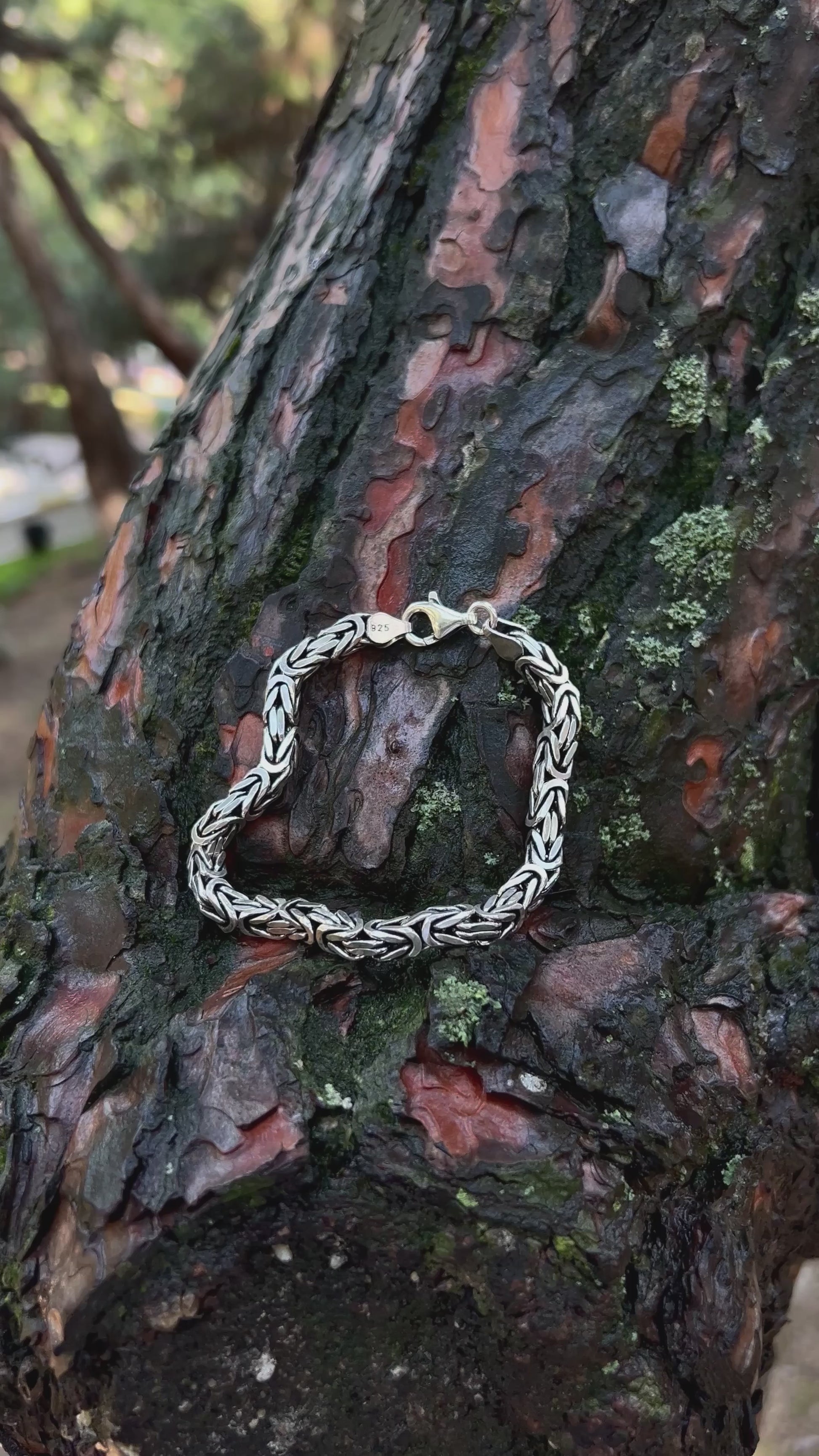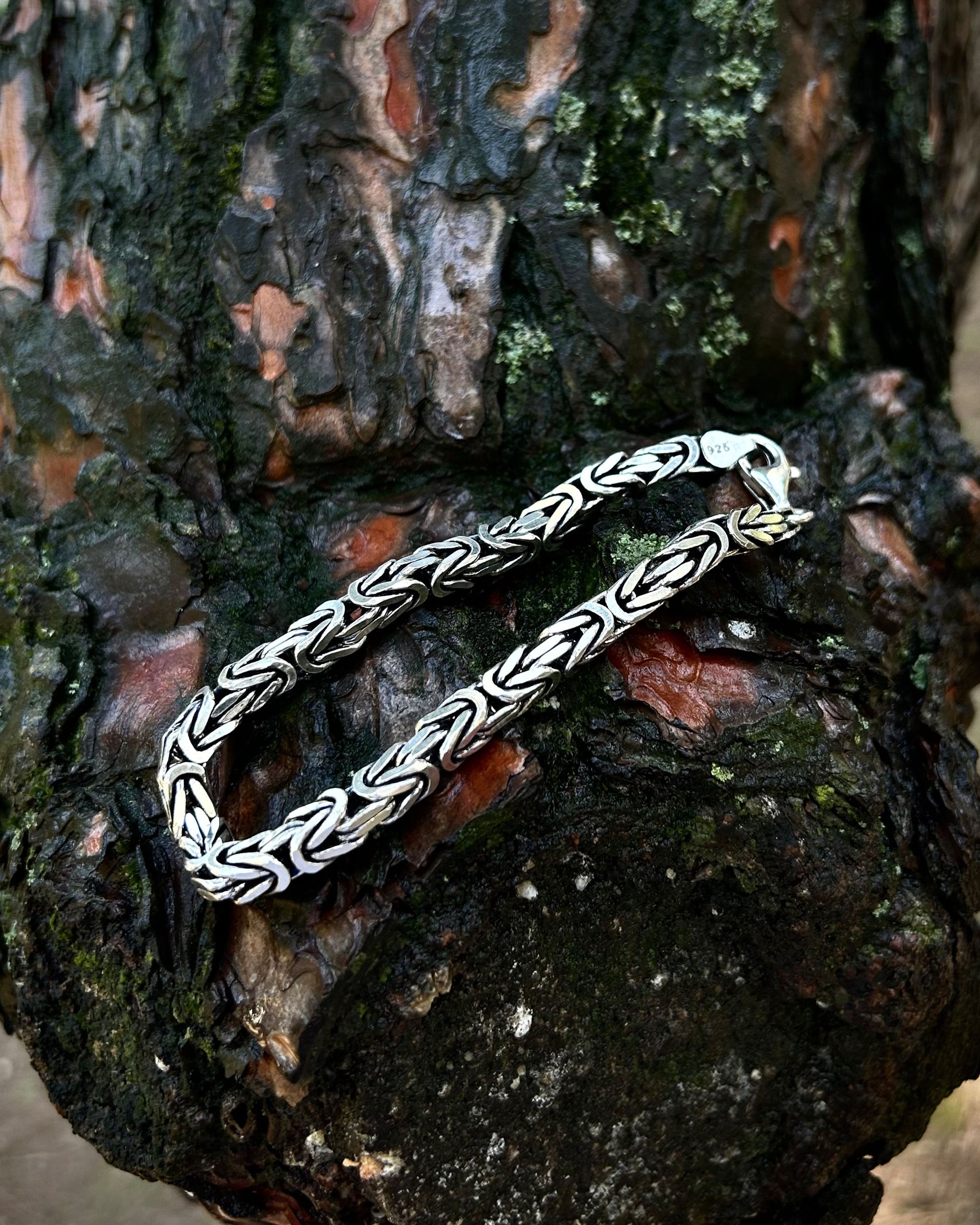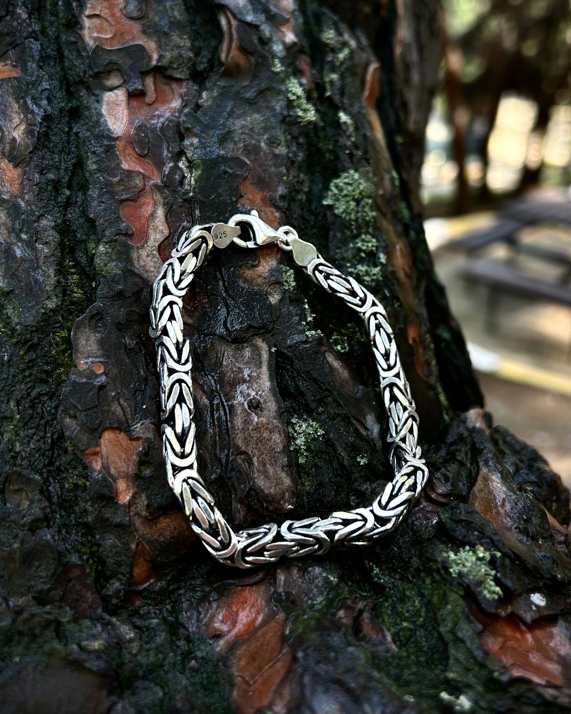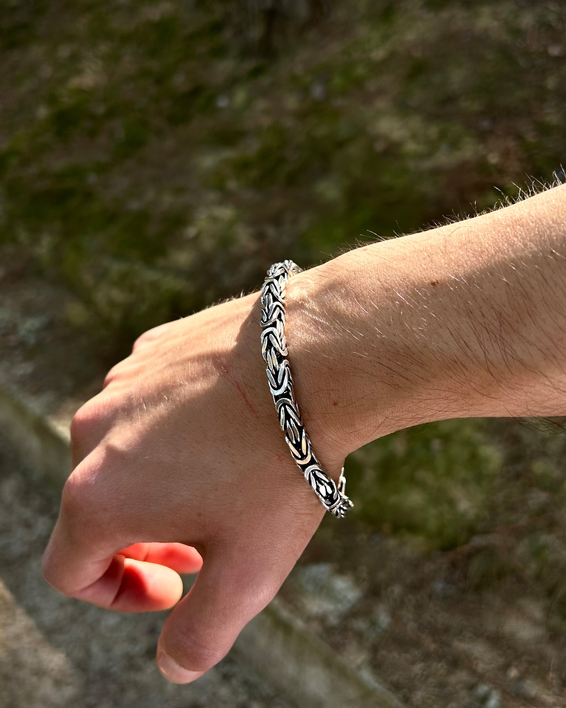 925 ayar gümüşten üretilmiş bu ağır bileklik, 6 mm kalınlığındaki kare halkalardan oluşan Bizans kral zincir tasarımına sahiptir.
