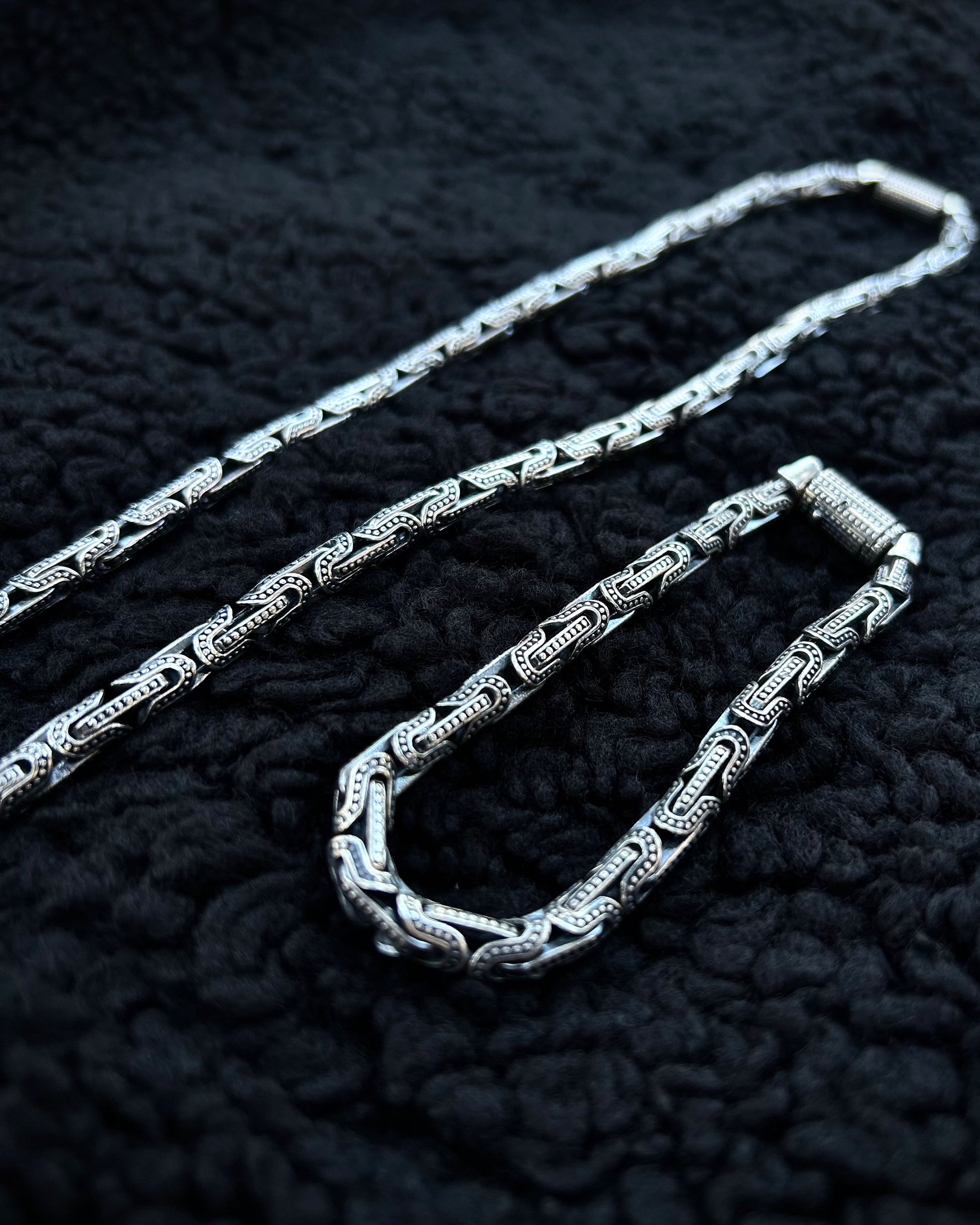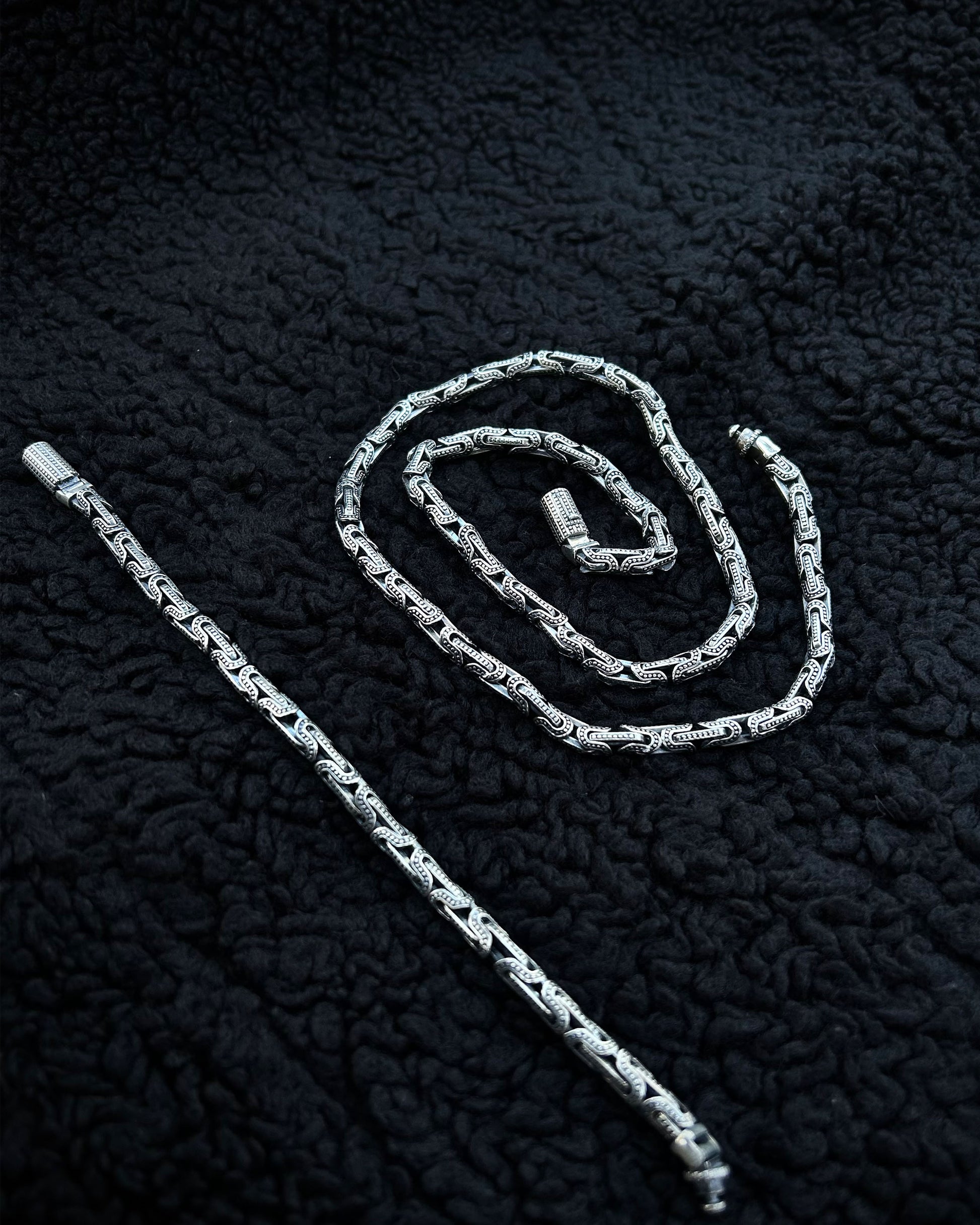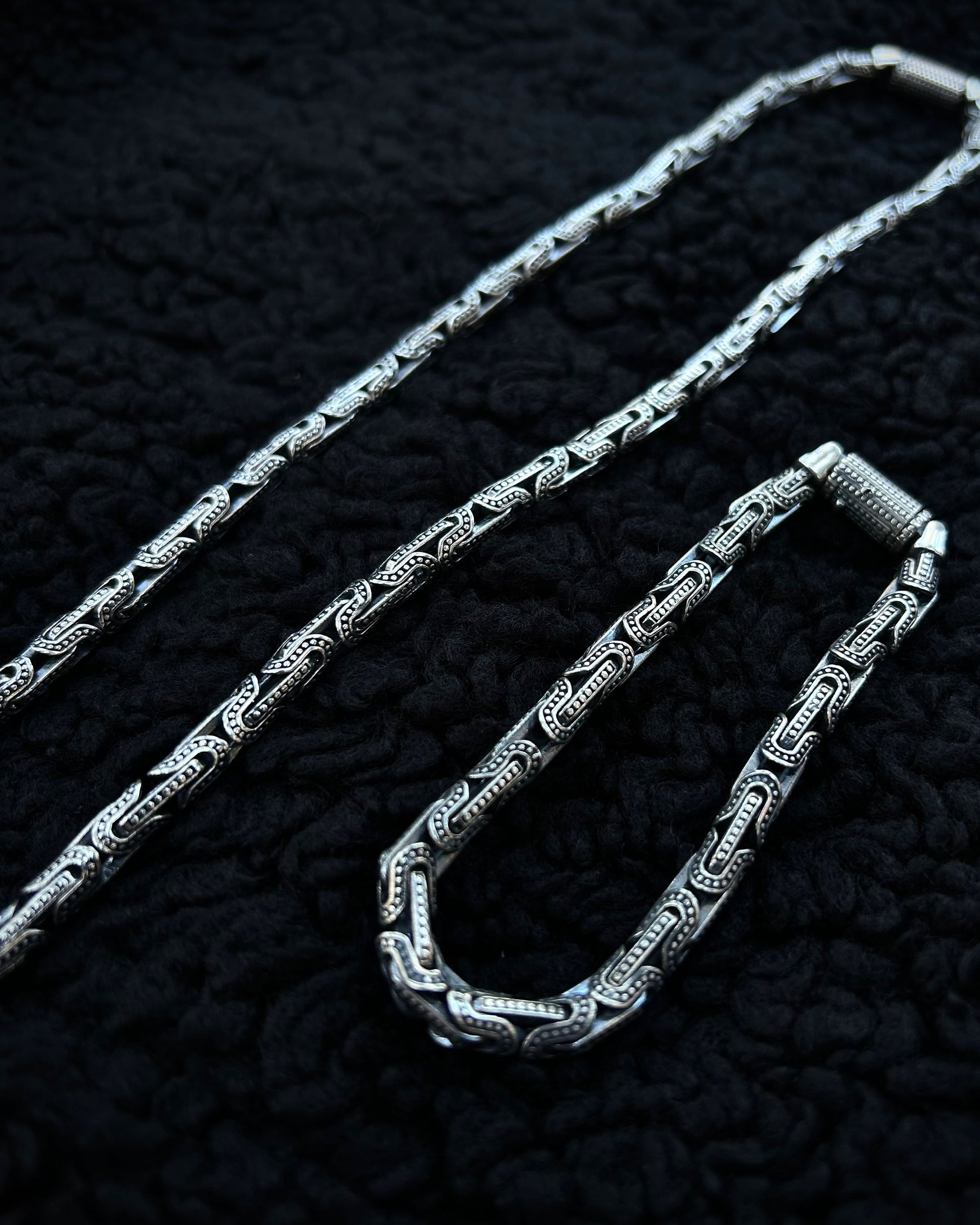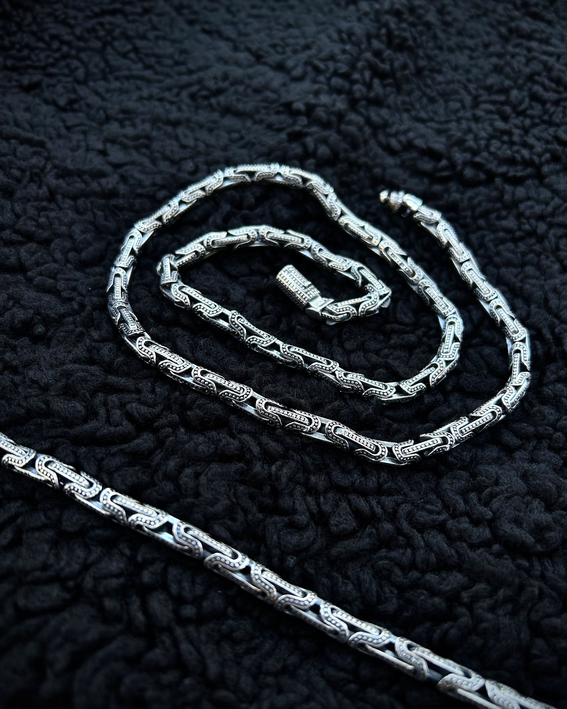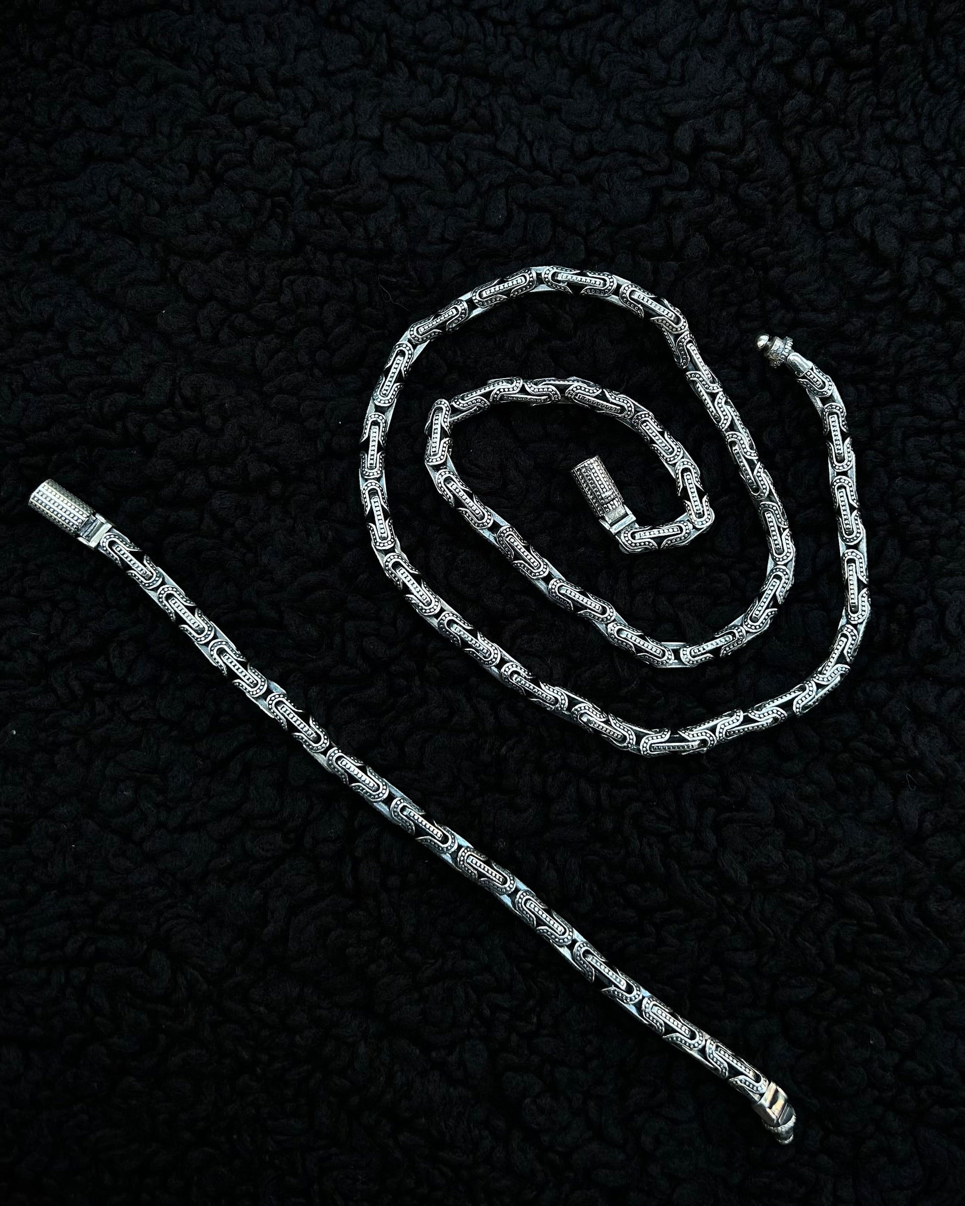 925 ayar gümüşten el işçiliğiyle üretilmiş bu set, ağır zincir tasarımlı kolye ve bileklikten oluşur. İsteğe bağlı olarak yalnızca bileklik veya kolye seçenekleri de mevcuttur.