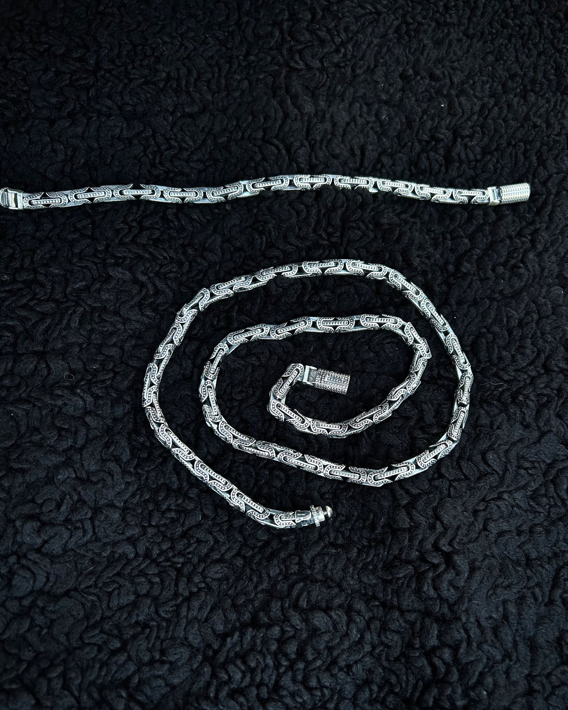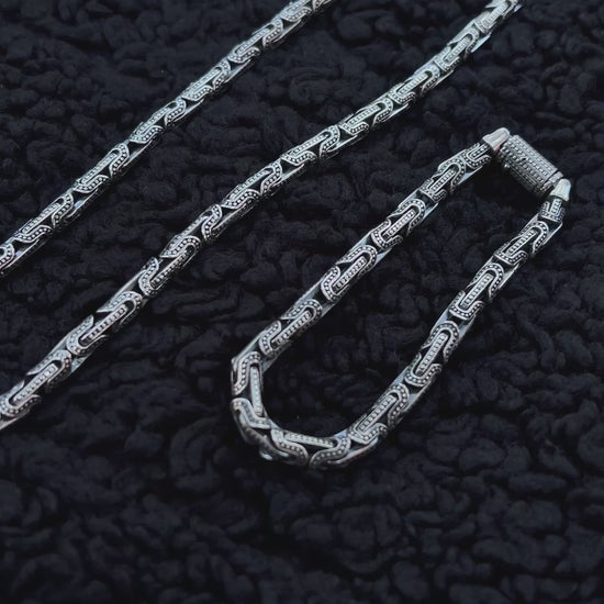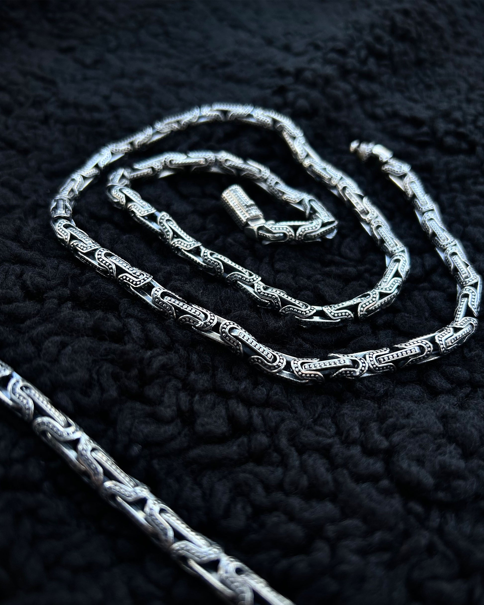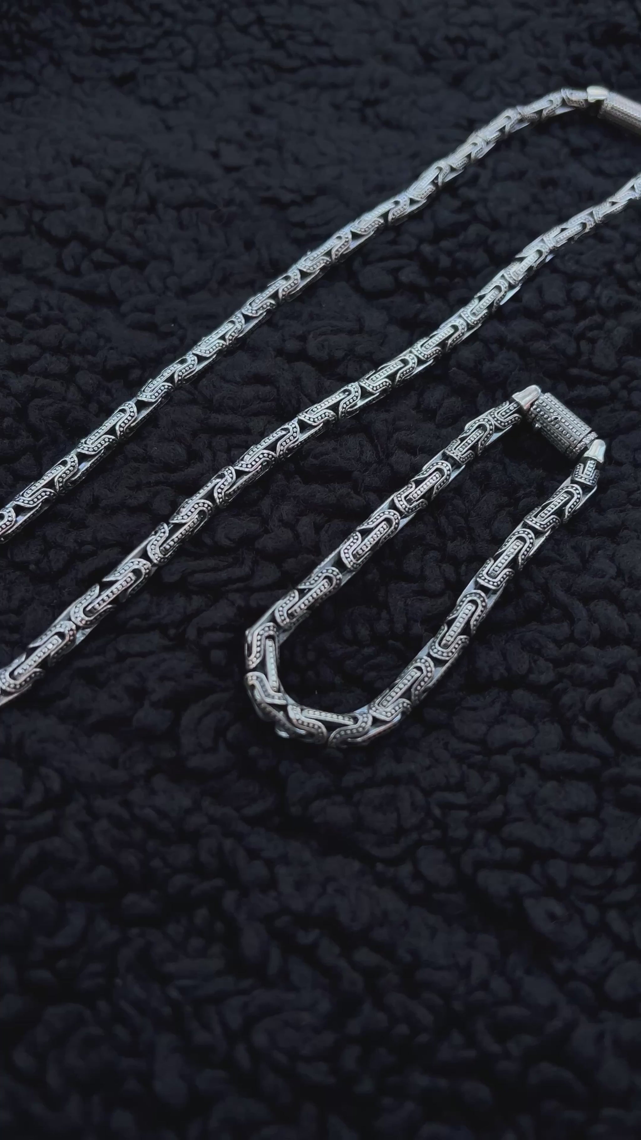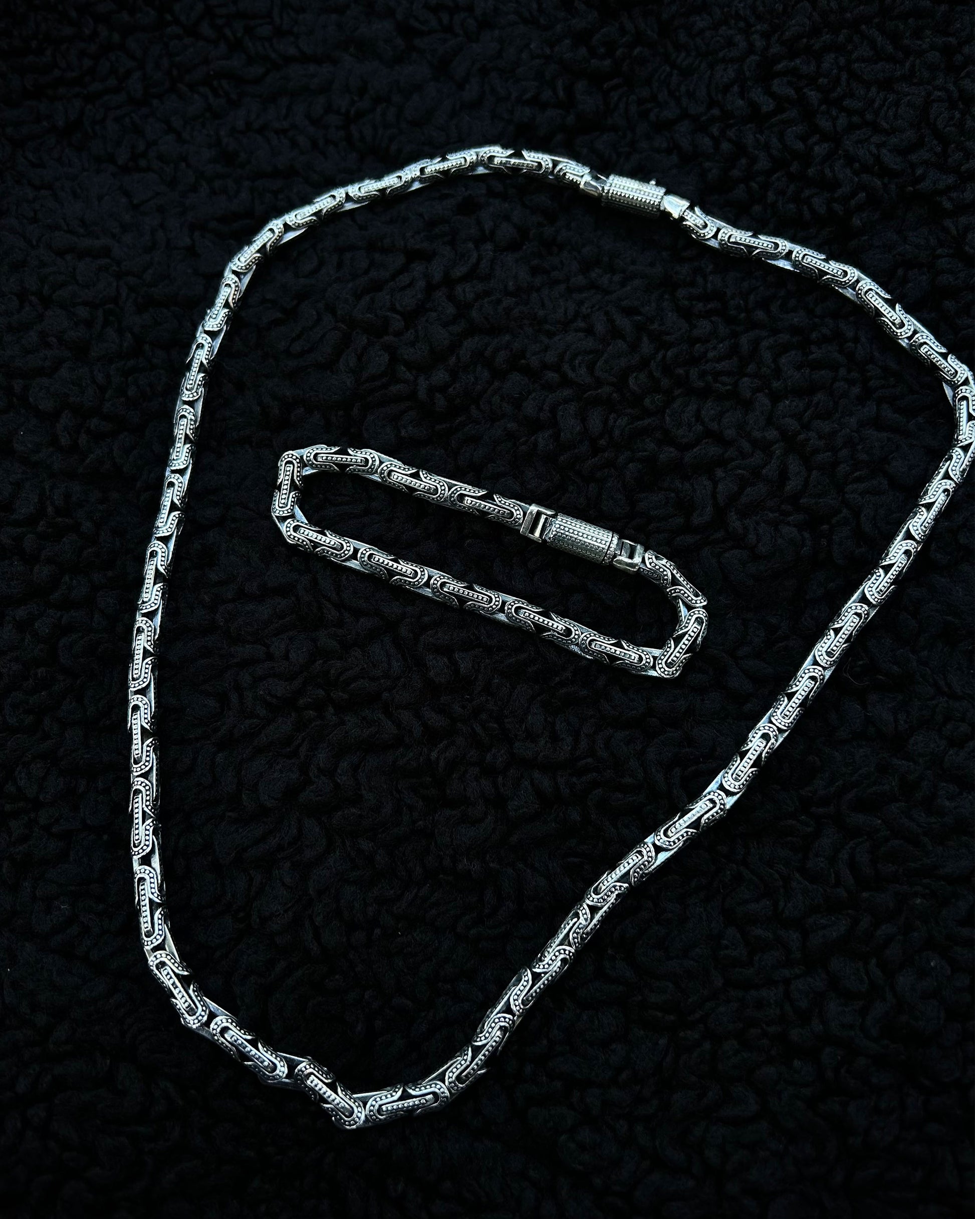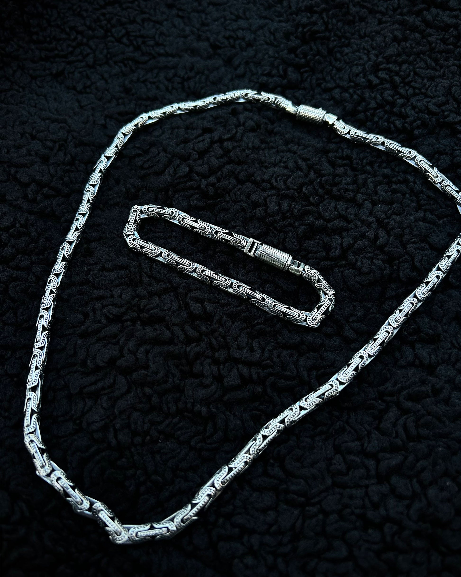 925 ayar gümüşten el işçiliğiyle üretilmiş bu set, ağır zincir tasarımlı kolye ve bileklikten oluşur. İsteğe bağlı olarak yalnızca bileklik veya kolye seçenekleri de mevcuttur.