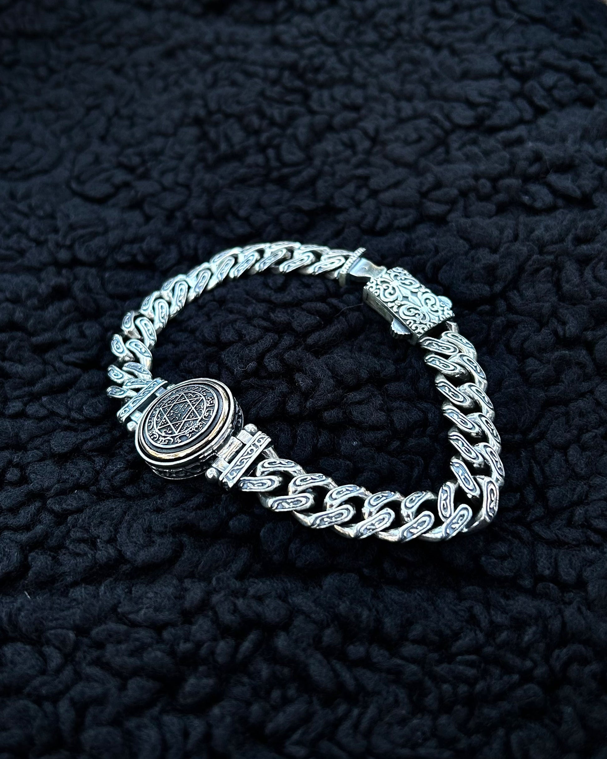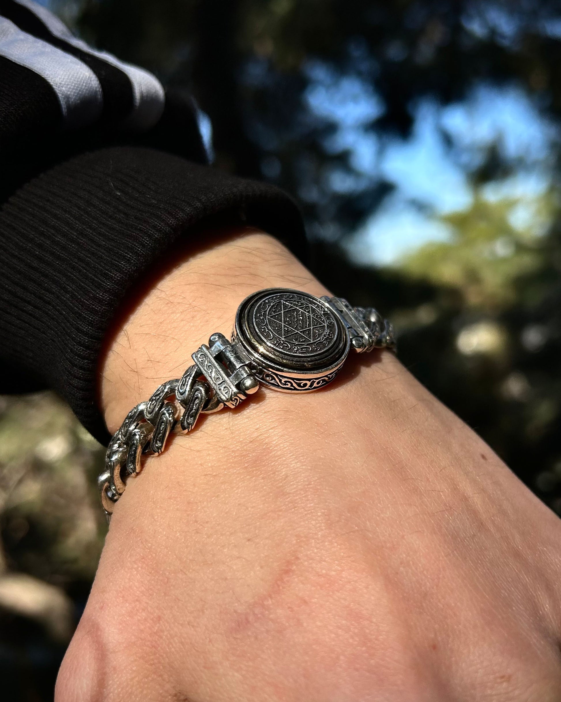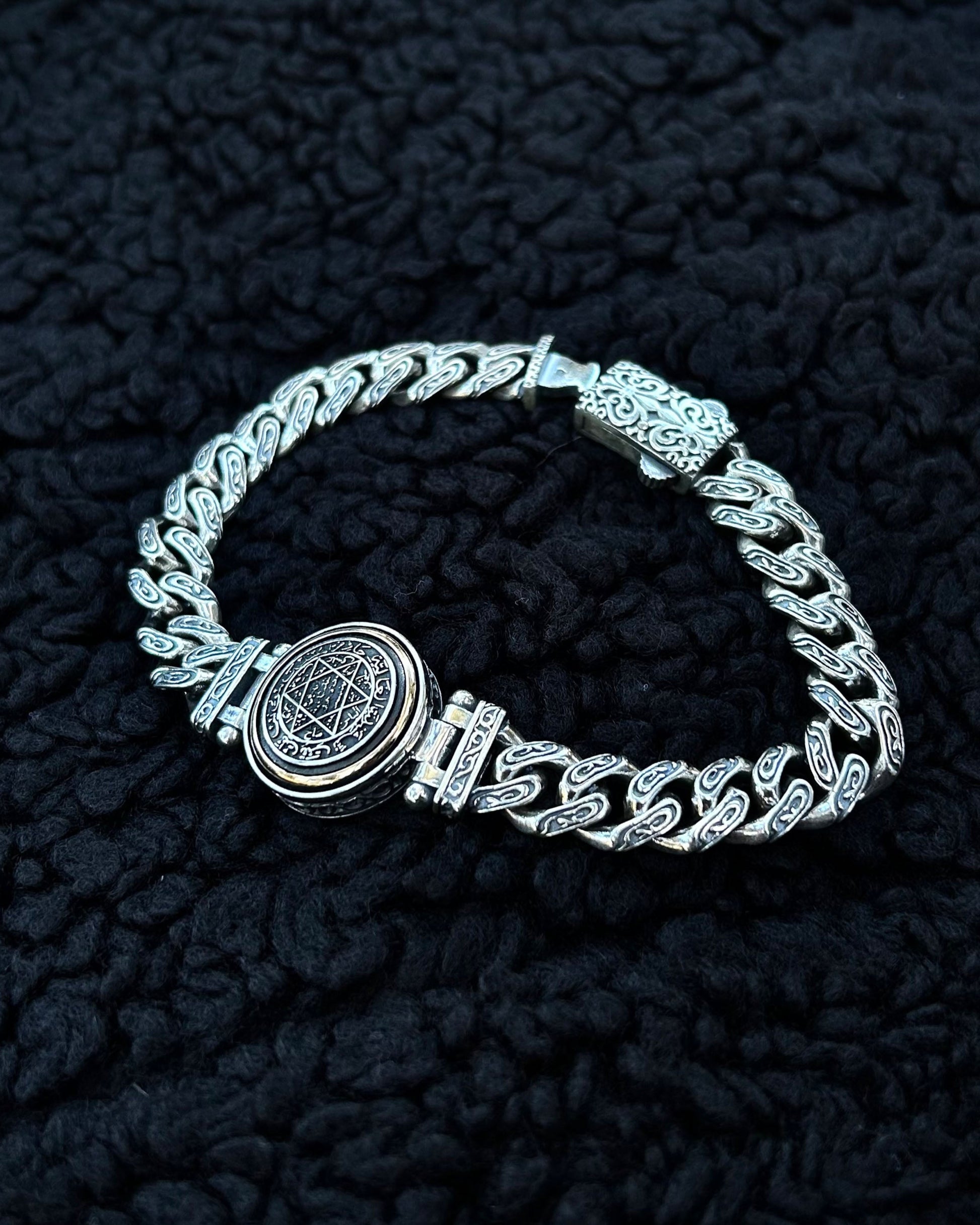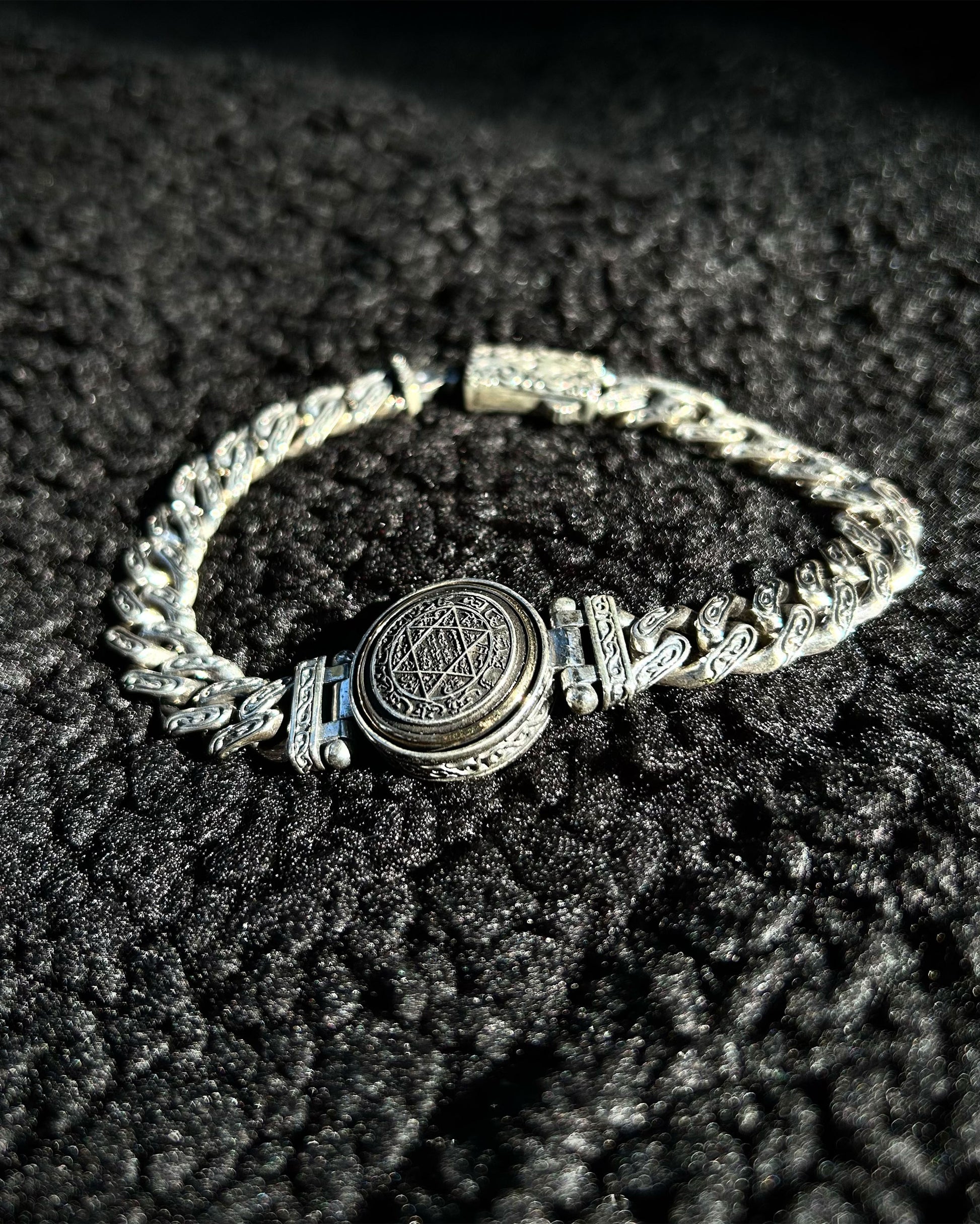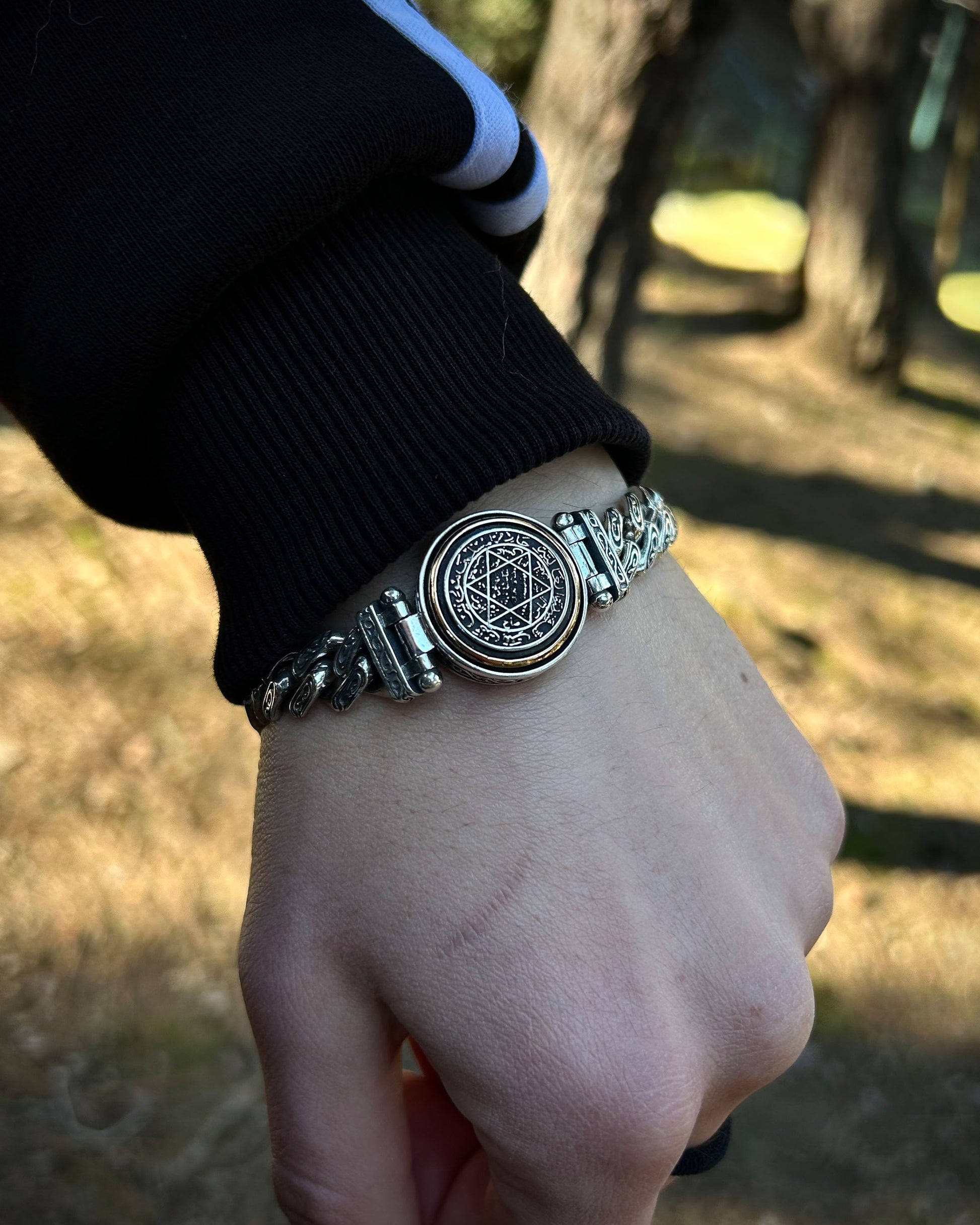 Bu 925 ayar gümüş zincir bileklik, Süleyman Mührü ile işlenmiş güçlü bir koruma tılsımıdır. Kabbala, İslam ve ezoterik geleneklerden ilham alan bu tasarım; bilgelik, enerji dengesi ve ilahi korumayı simgeler.