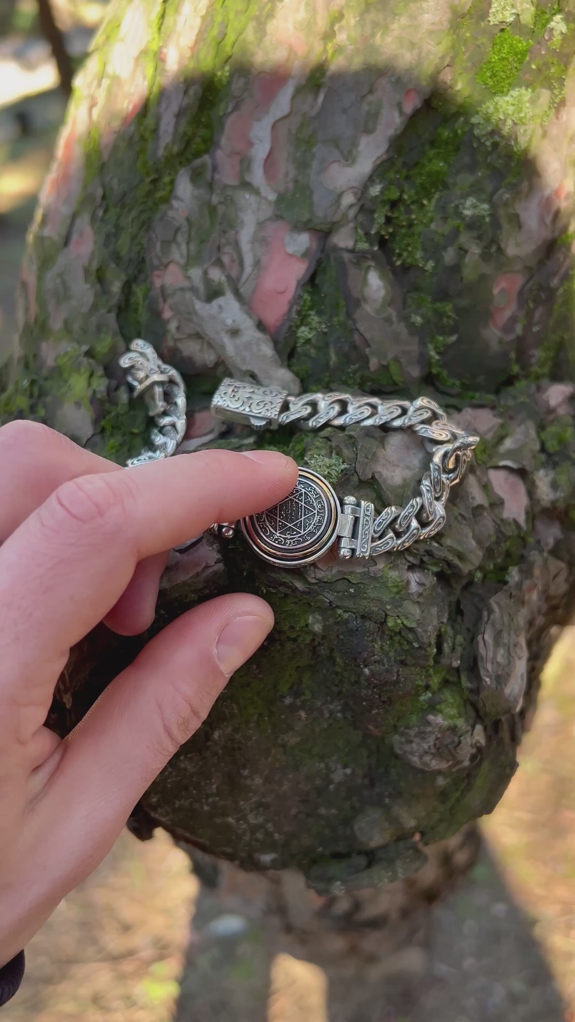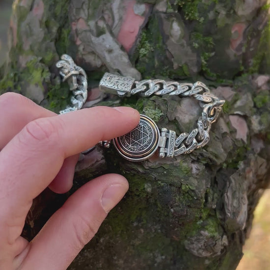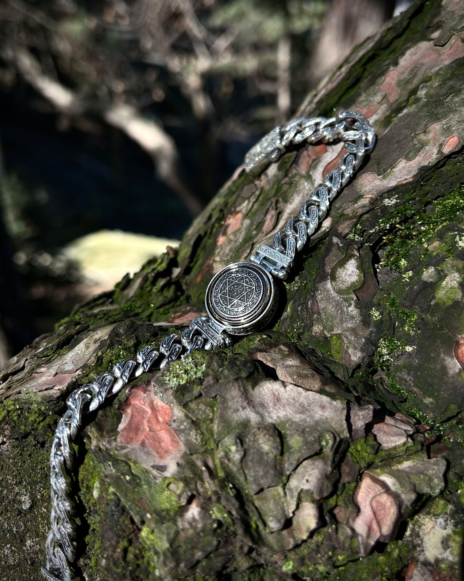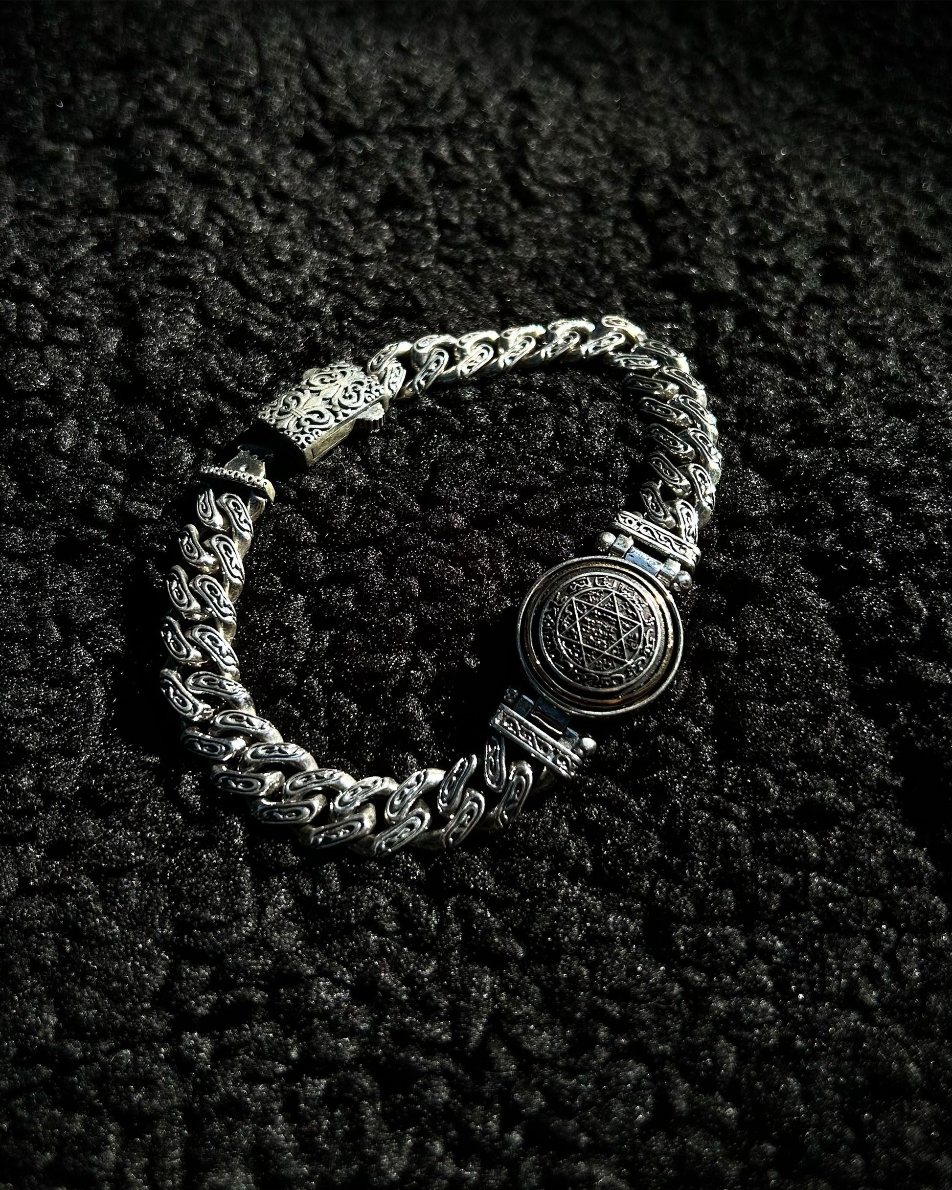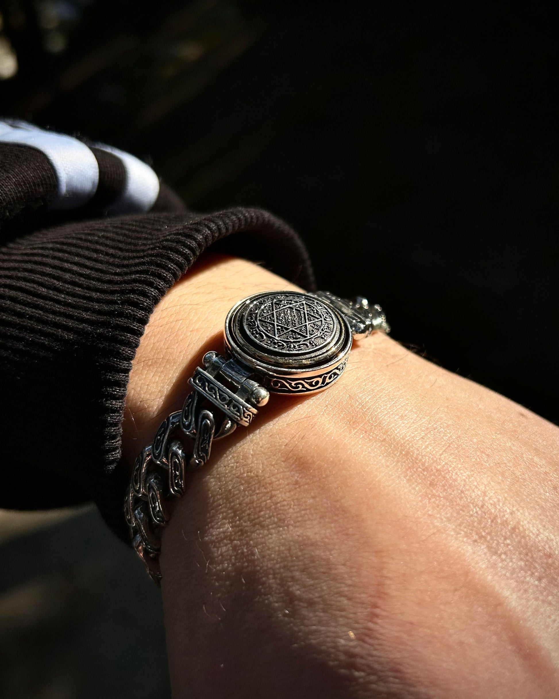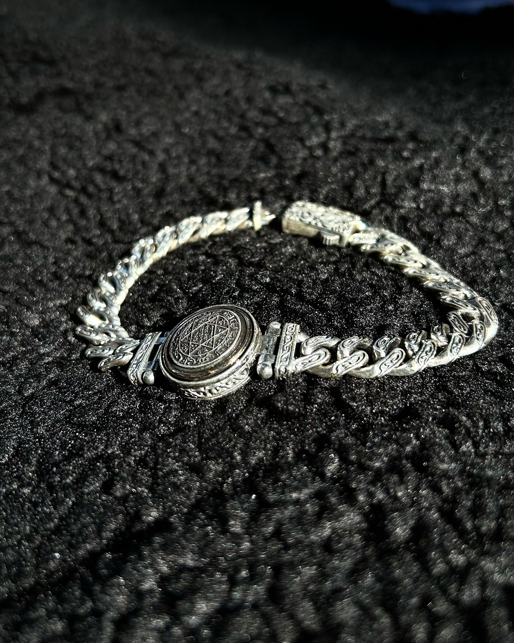Bu 925 ayar gümüş zincir bileklik, Süleyman Mührü ile işlenmiş güçlü bir koruma tılsımıdır. Kabbala, İslam ve ezoterik geleneklerden ilham alan bu tasarım; bilgelik, enerji dengesi ve ilahi korumayı simgeler.