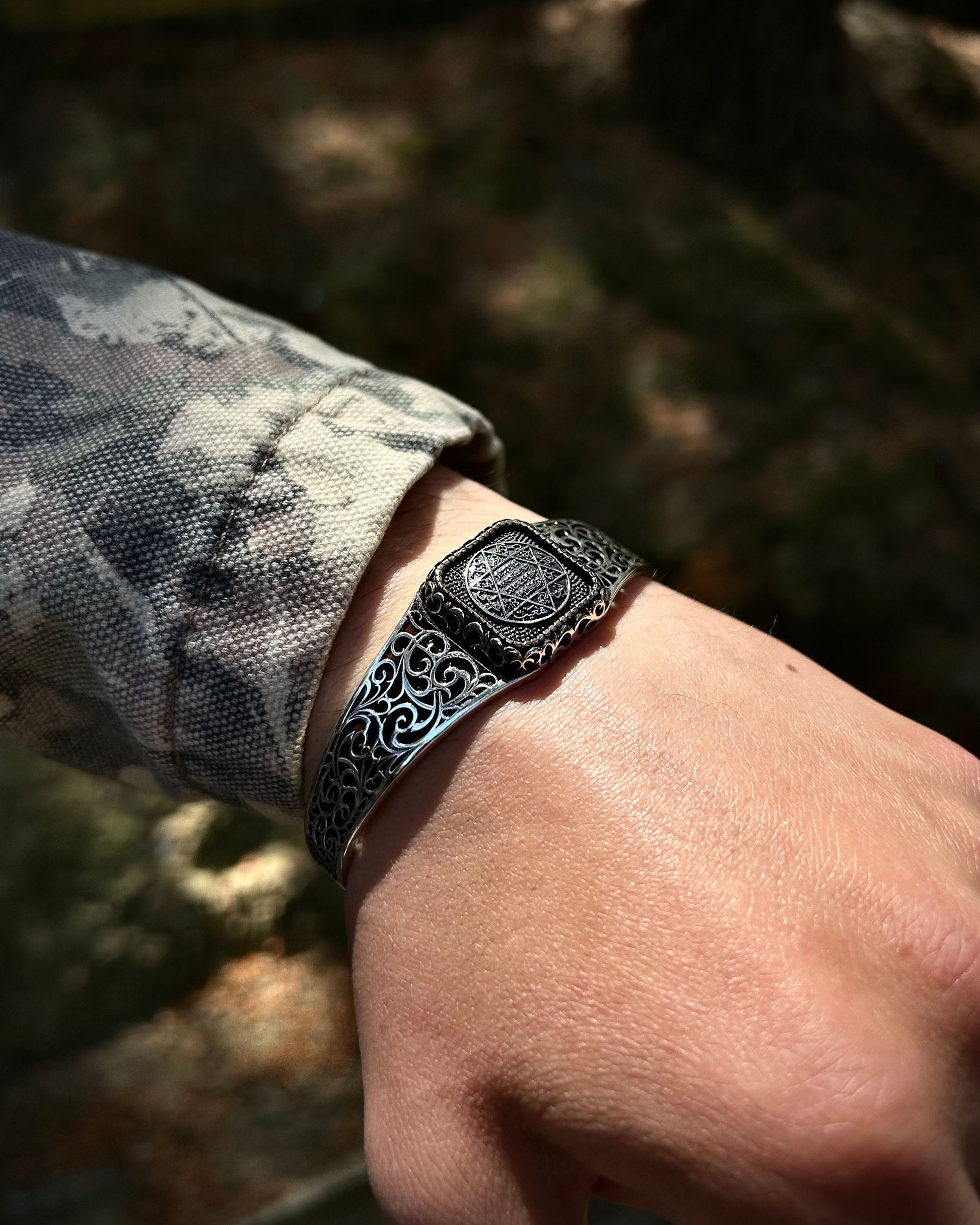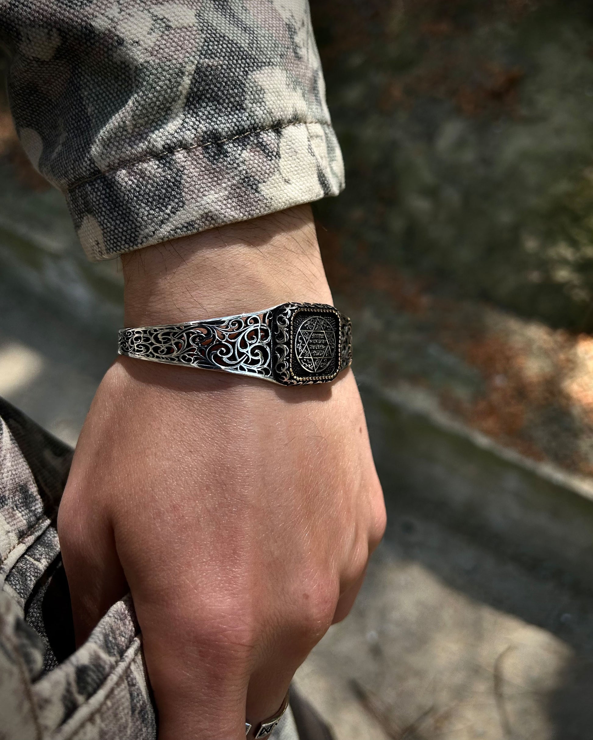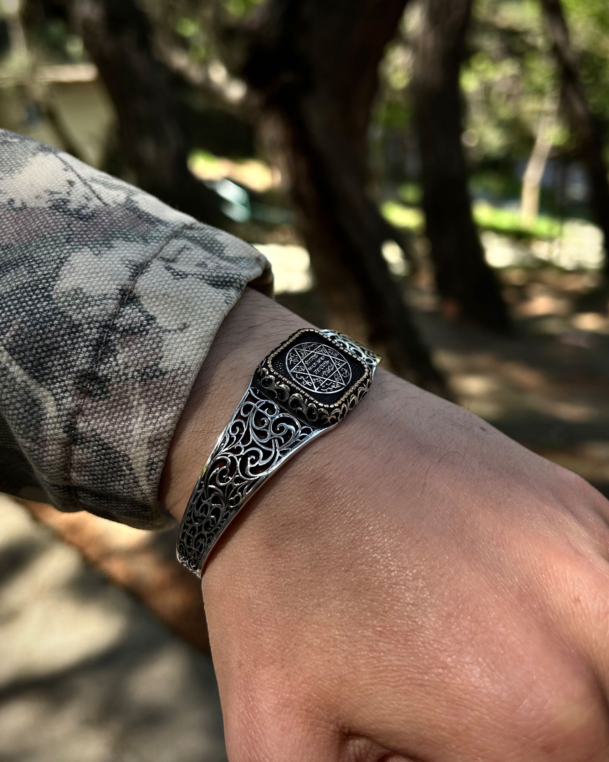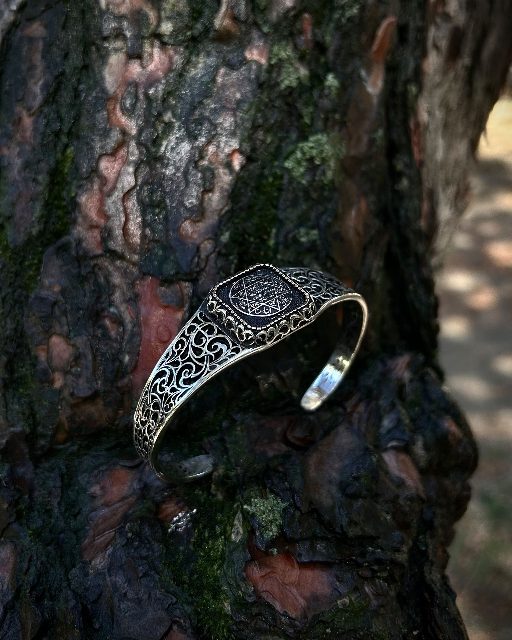 Bu el yapımı kelepçe bileklik, Antik Hz. Süleyman Mührü ile işlenmiş güçlü bir kabbalistik tılsımdır. Ayarlanabilir yapısıyla hem manevi anlamı hem de estetik duruşuyla dikkat çeker.