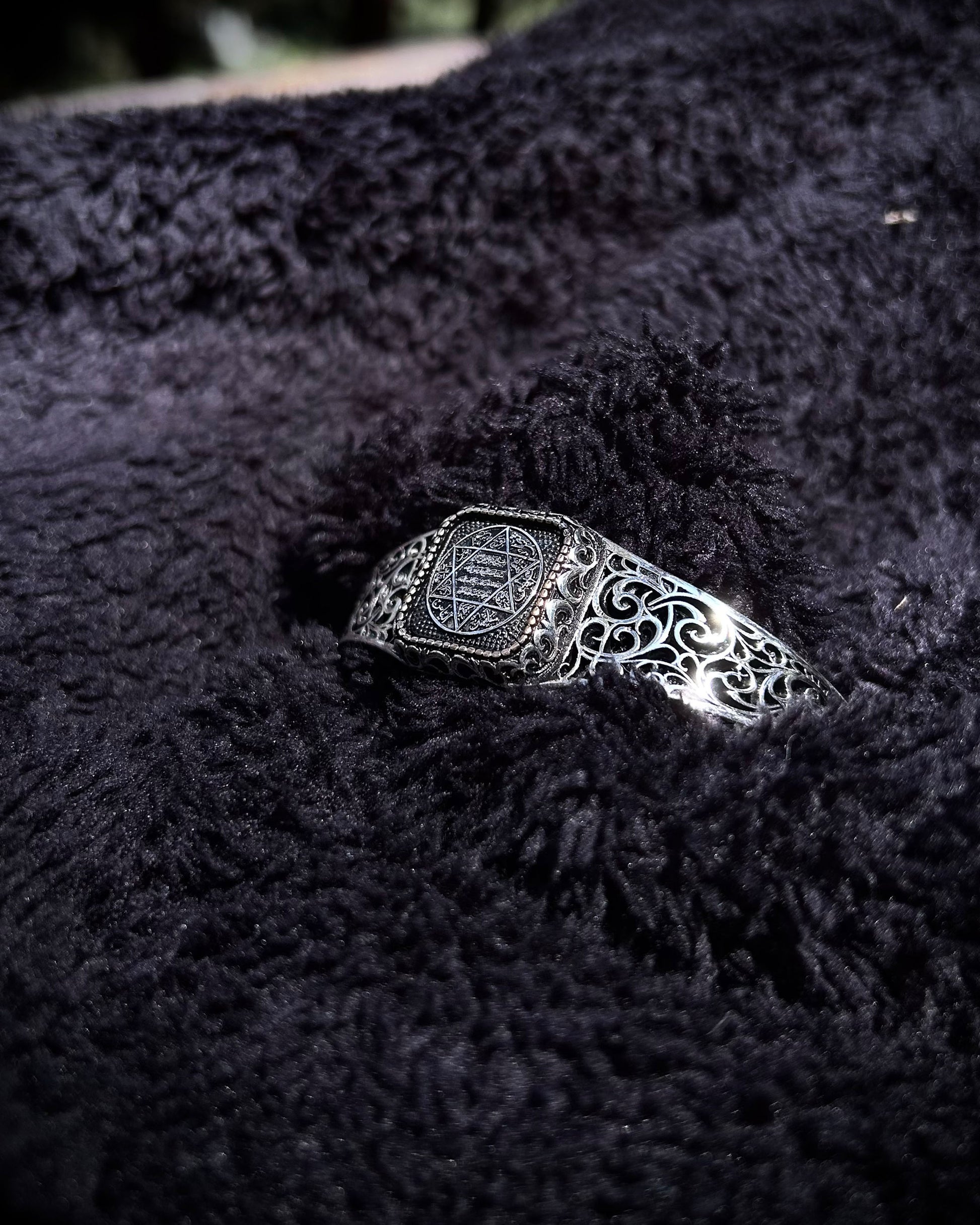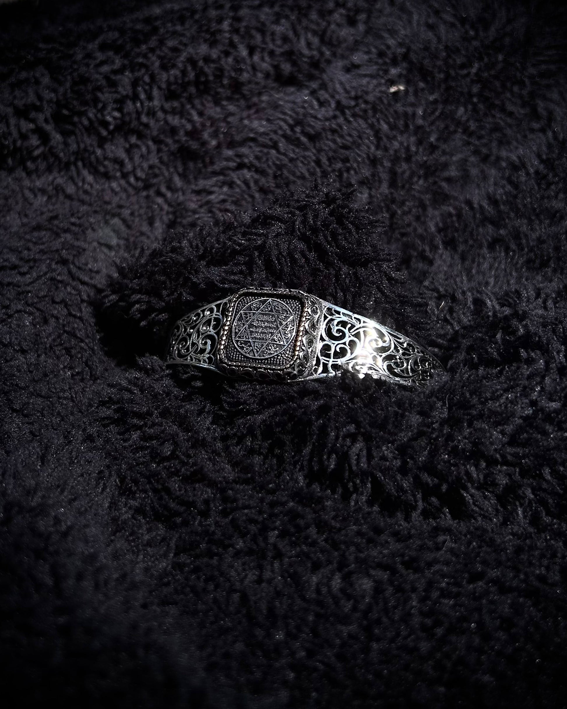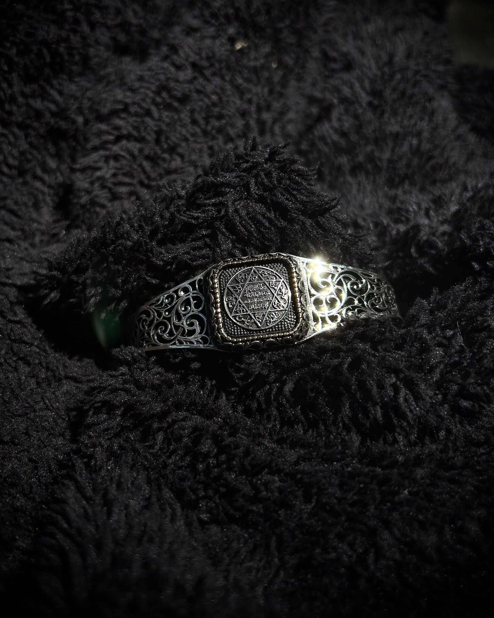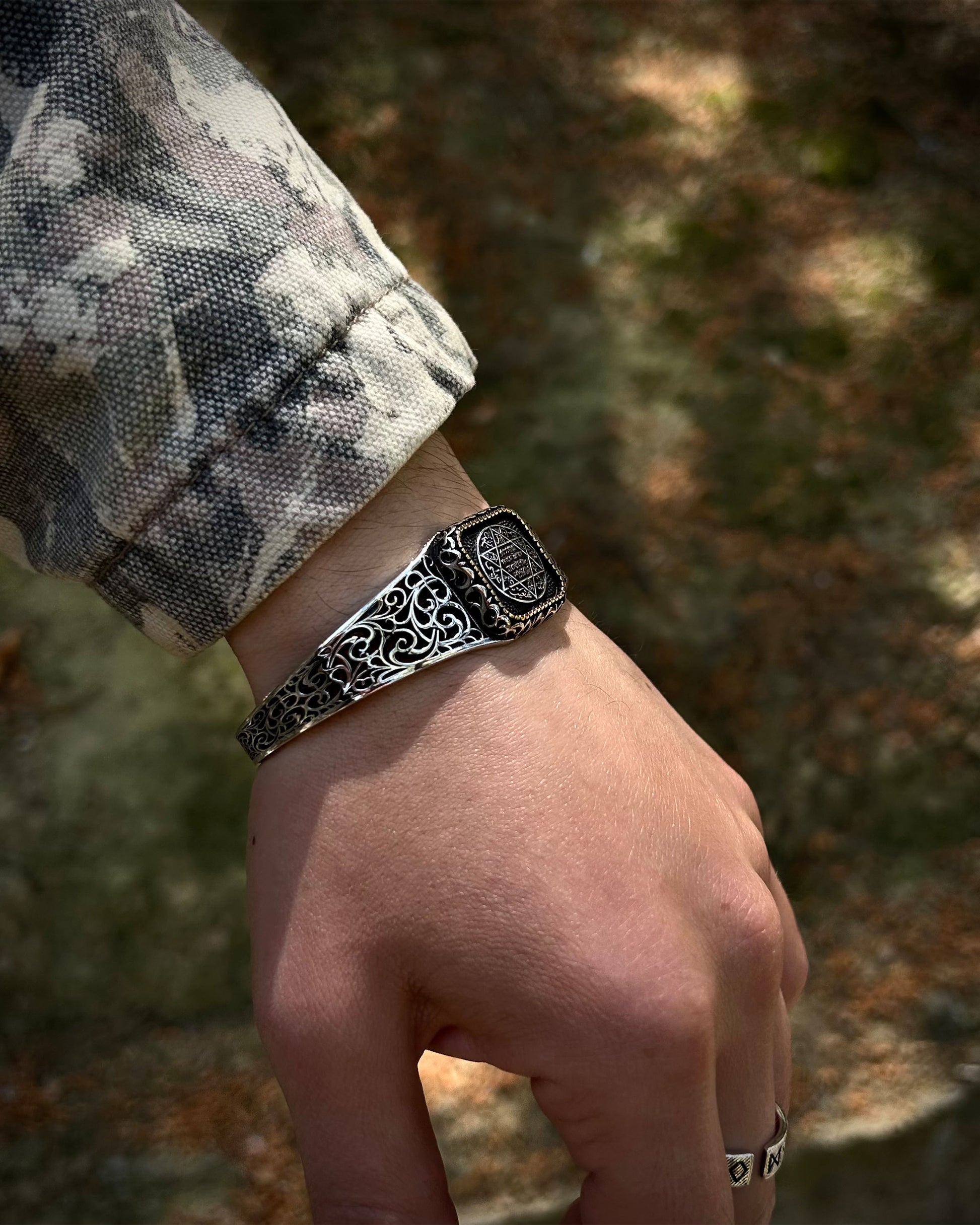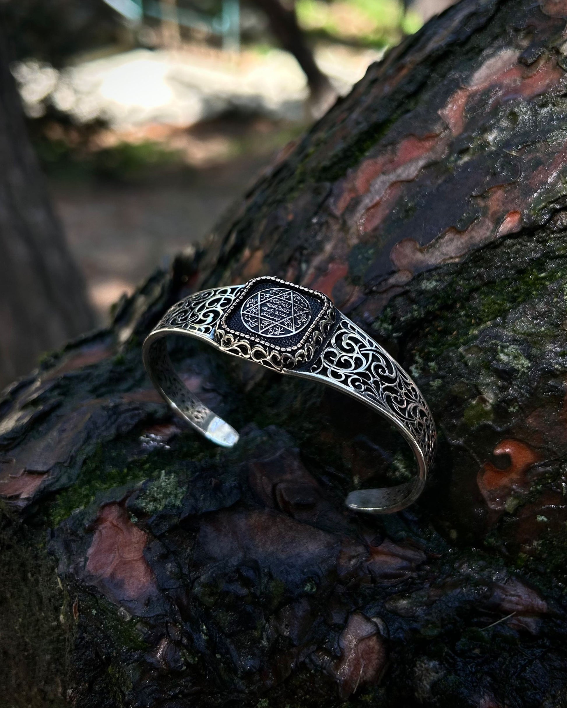 Bu el yapımı kelepçe bileklik, Antik Hz. Süleyman Mührü ile işlenmiş güçlü bir kabbalistik tılsımdır. Ayarlanabilir yapısıyla hem manevi anlamı hem de estetik duruşuyla dikkat çeker.