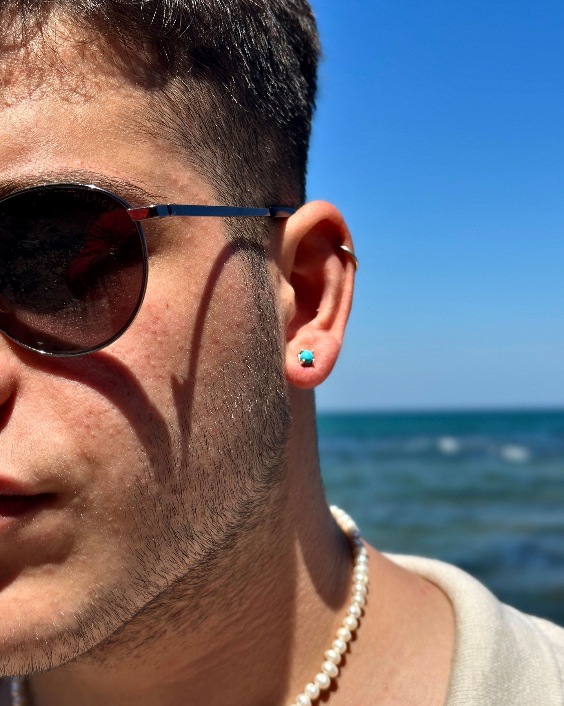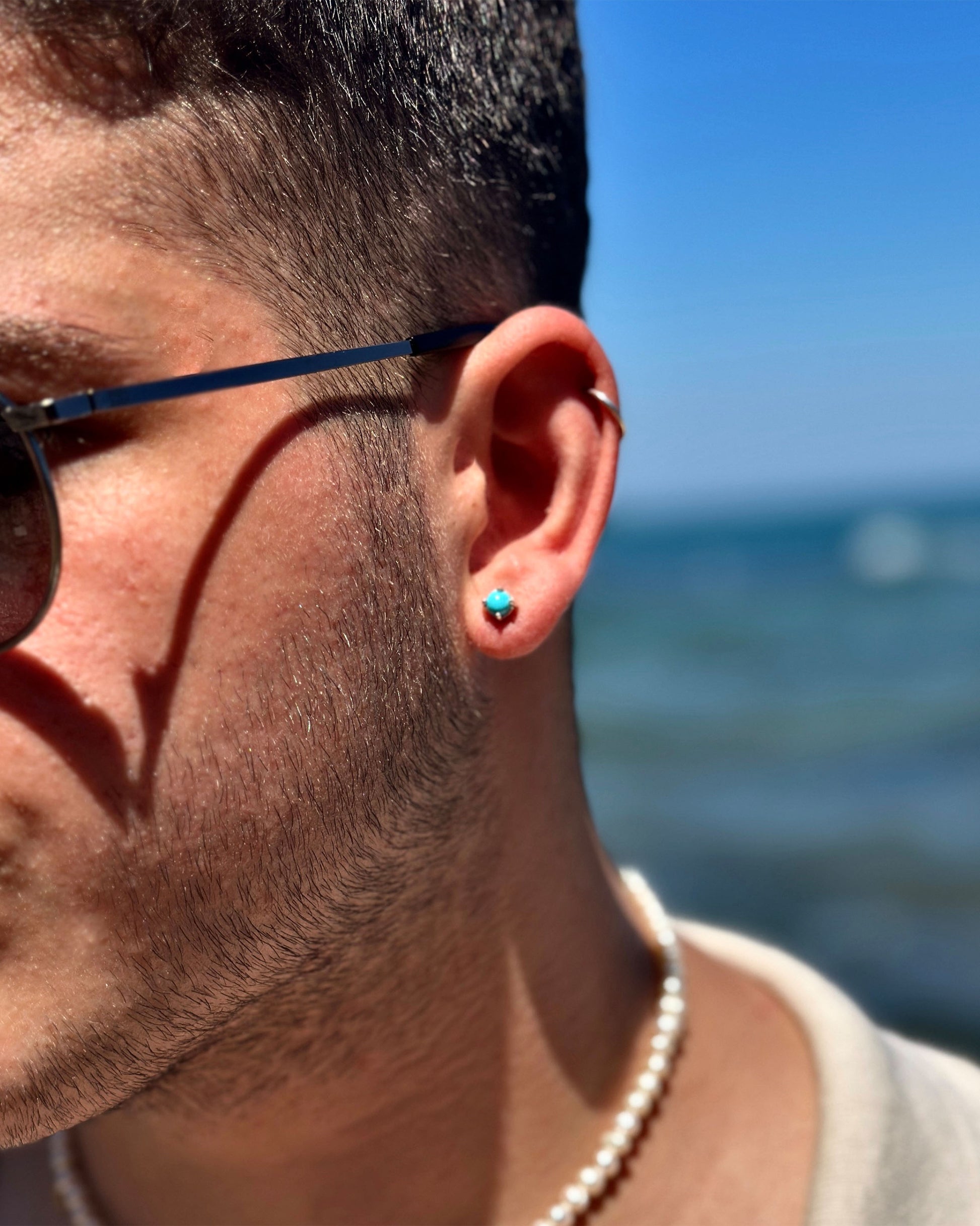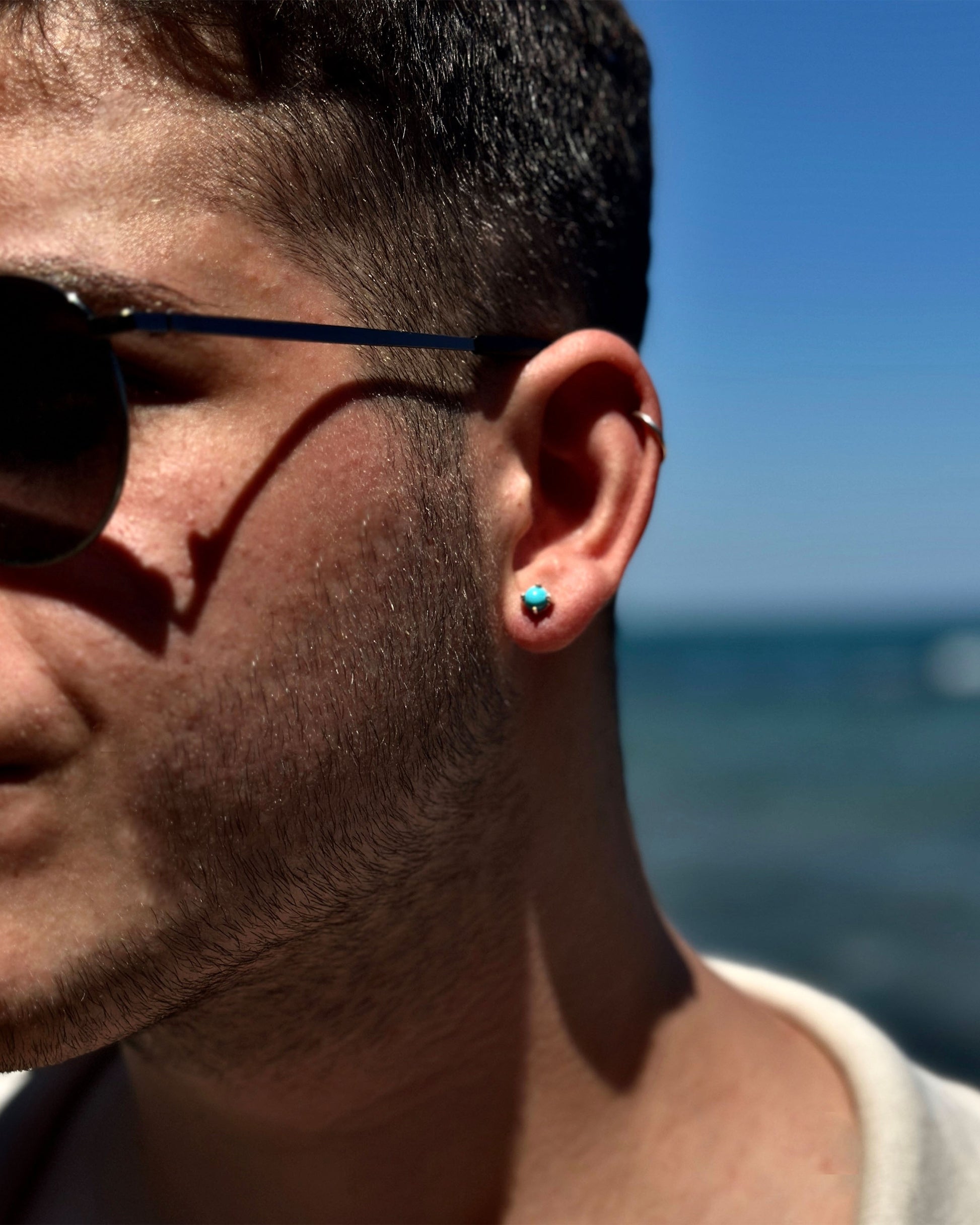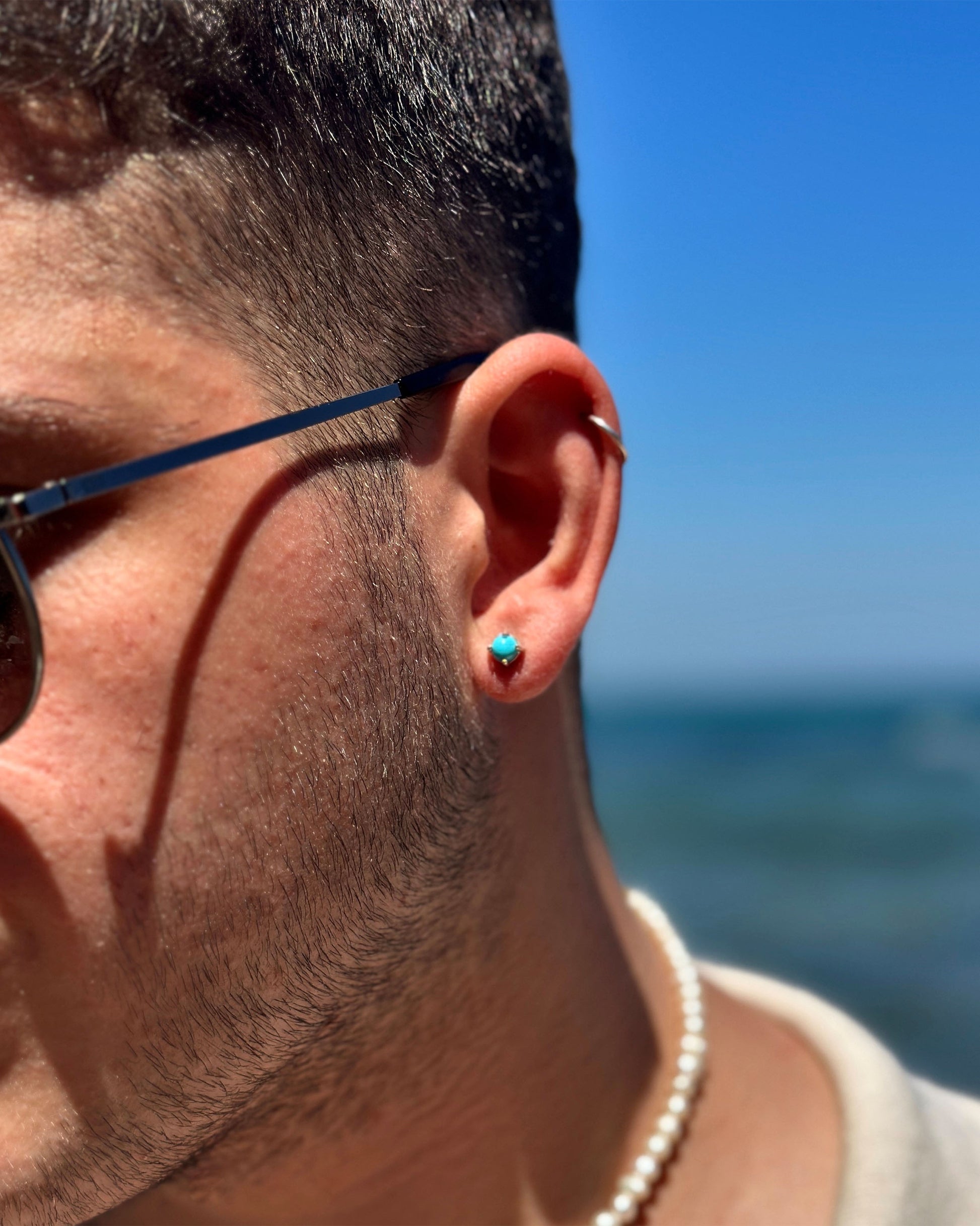 Bu minimalist erkek küpesi, 925 ayar gümüşten üretilmiş ve canlı turkuaz mavi taşla detaylandırılmıştır.