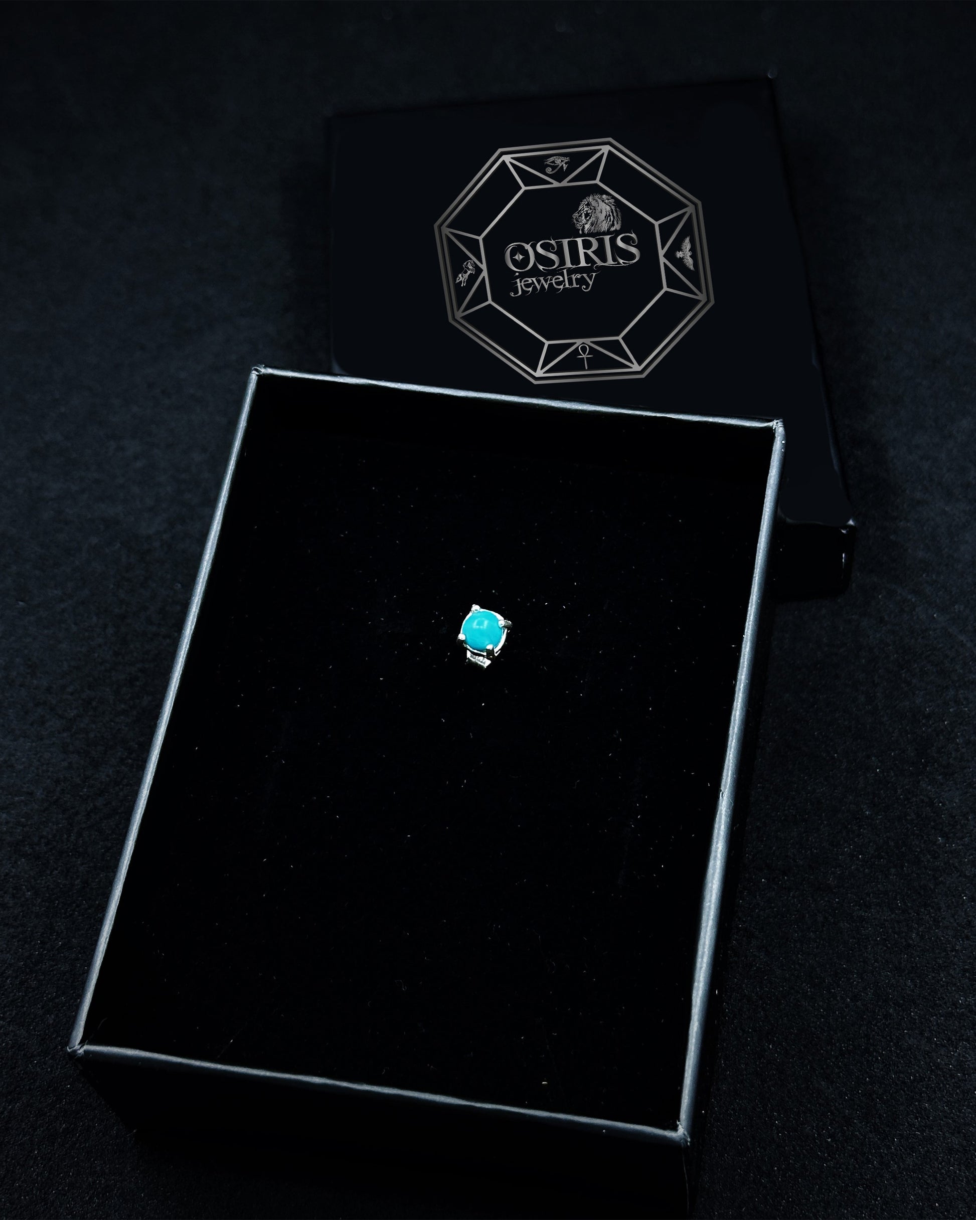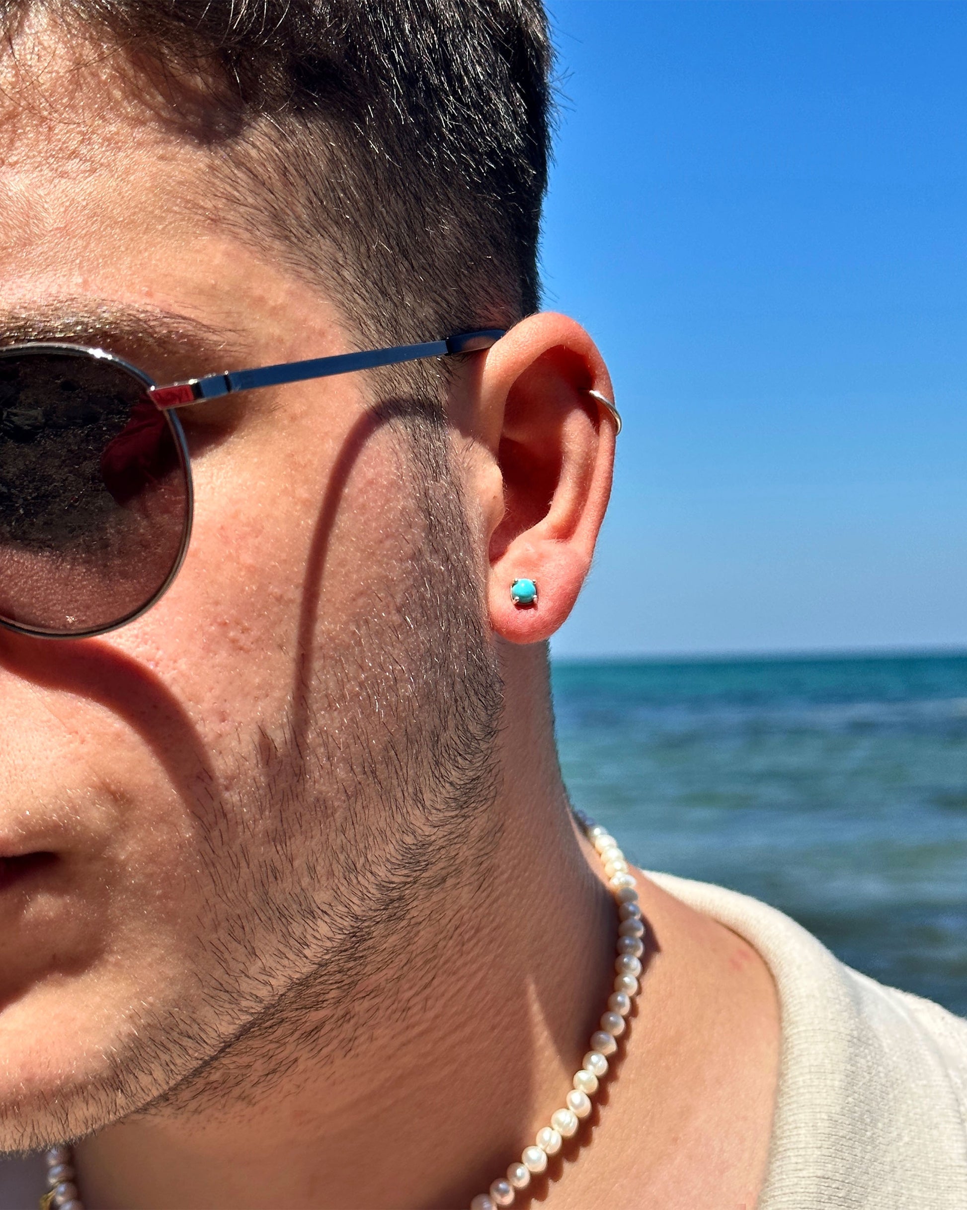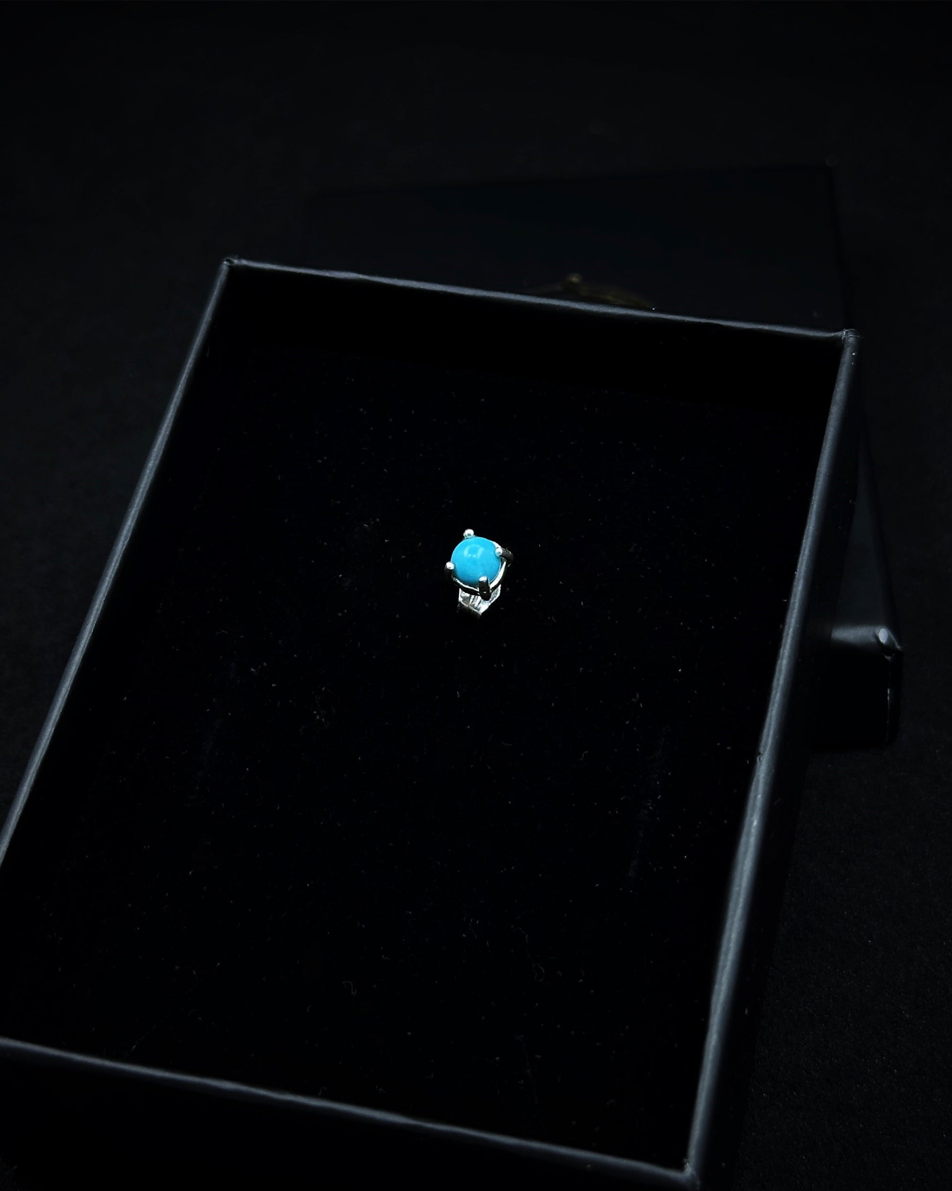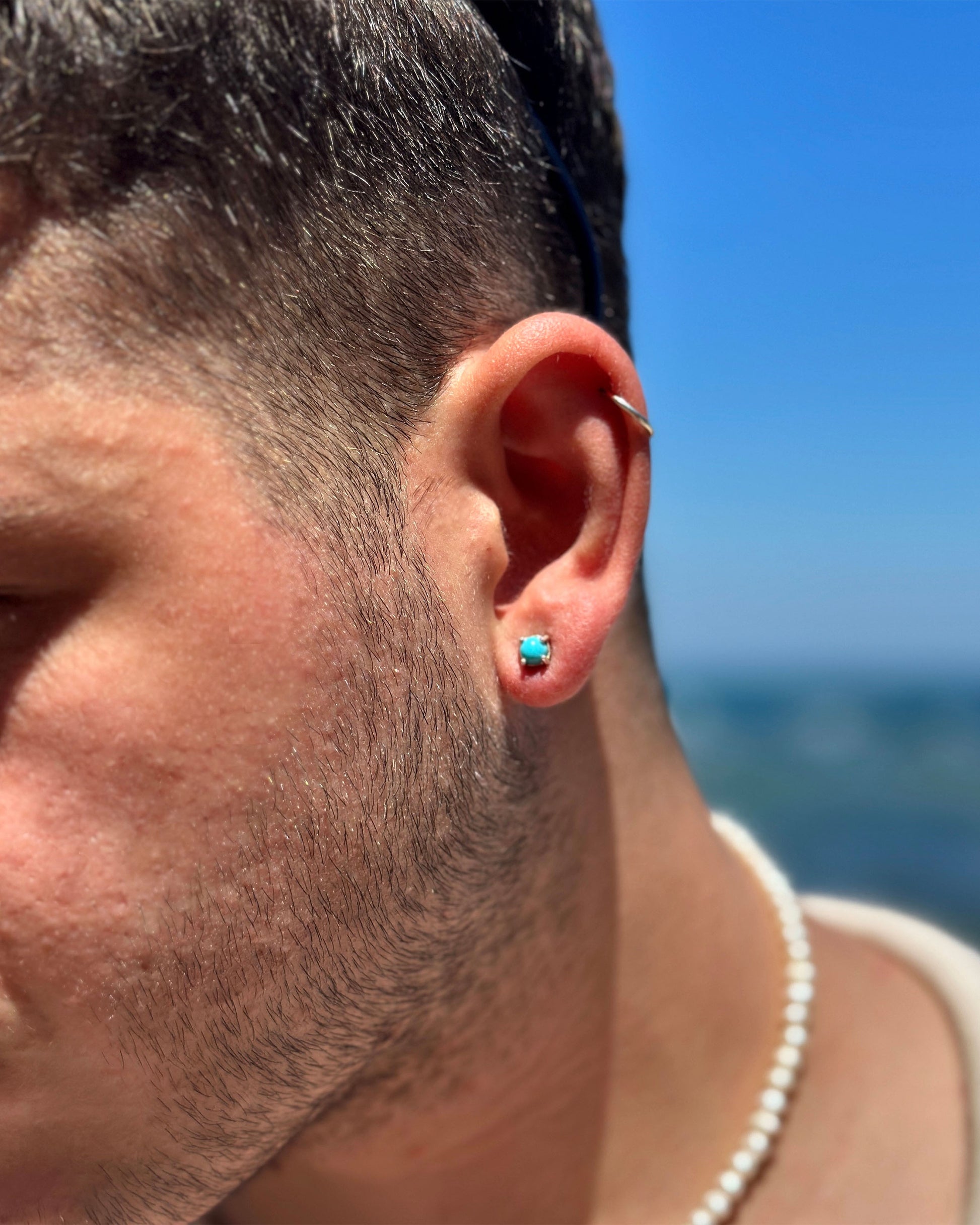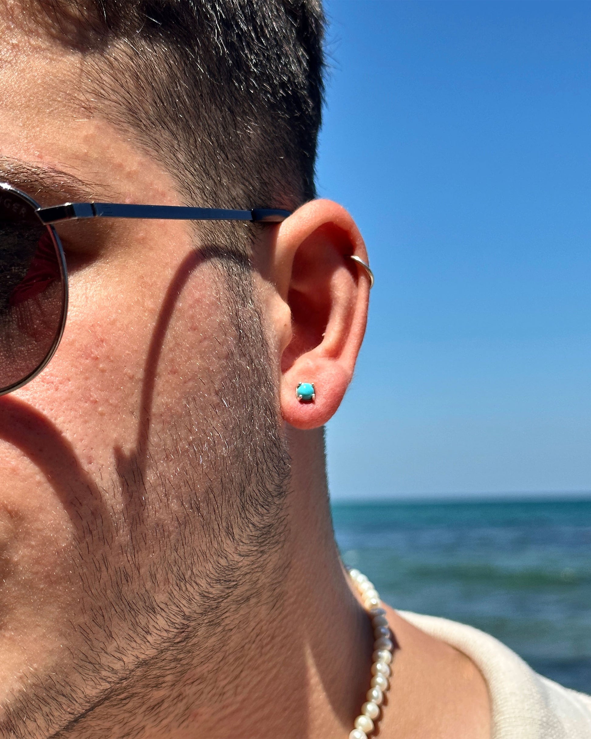 Bu minimalist erkek küpesi, 925 ayar gümüşten üretilmiş ve canlı turkuaz mavi taşla detaylandırılmıştır.