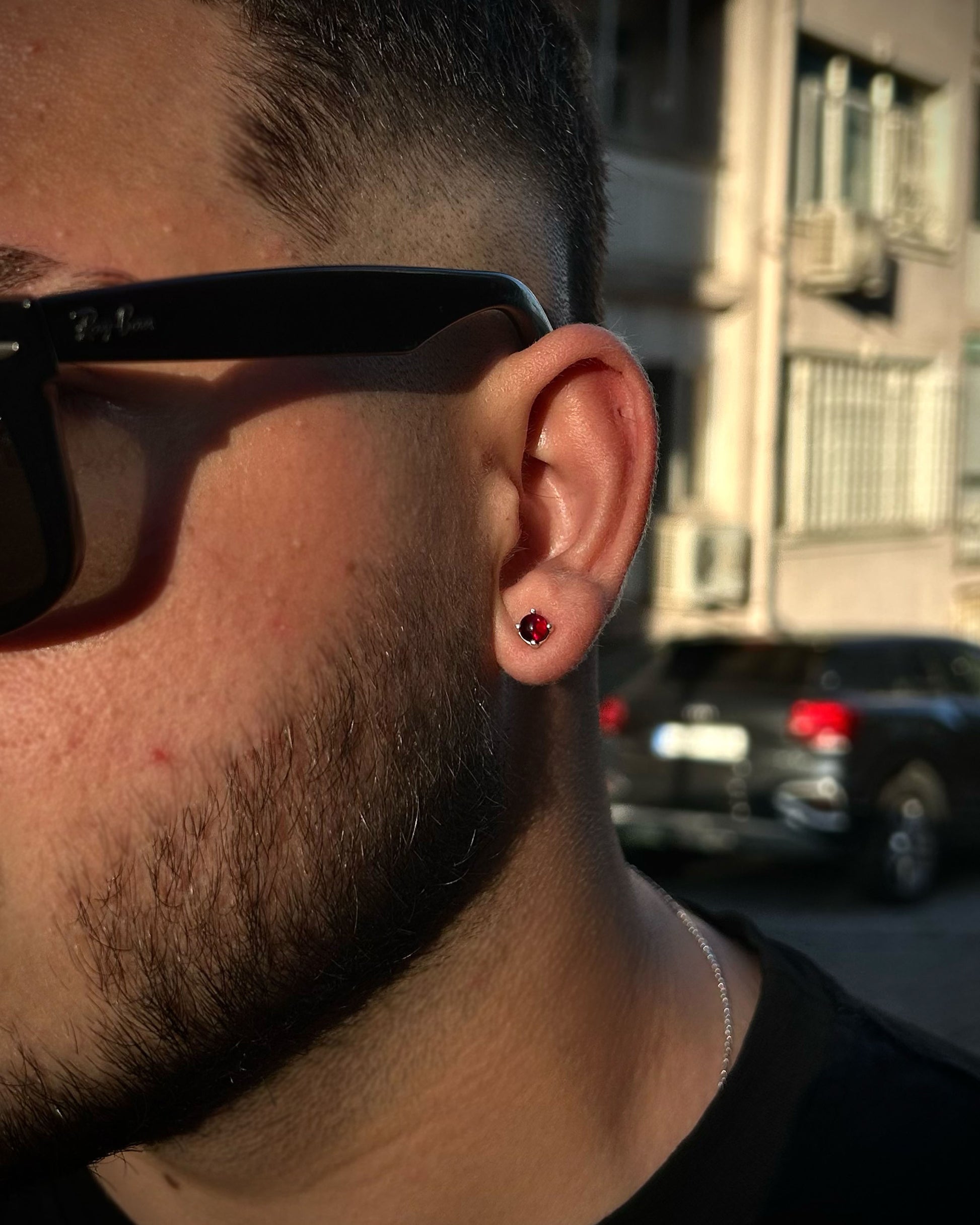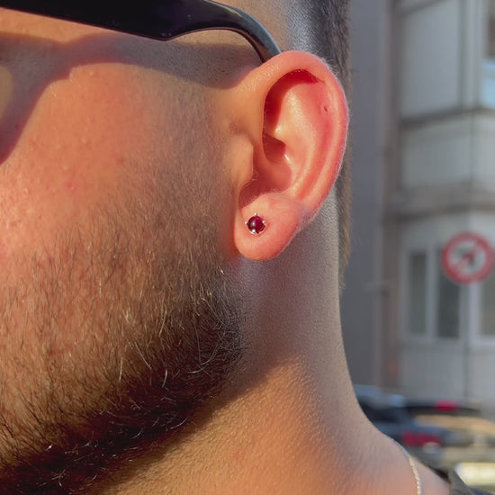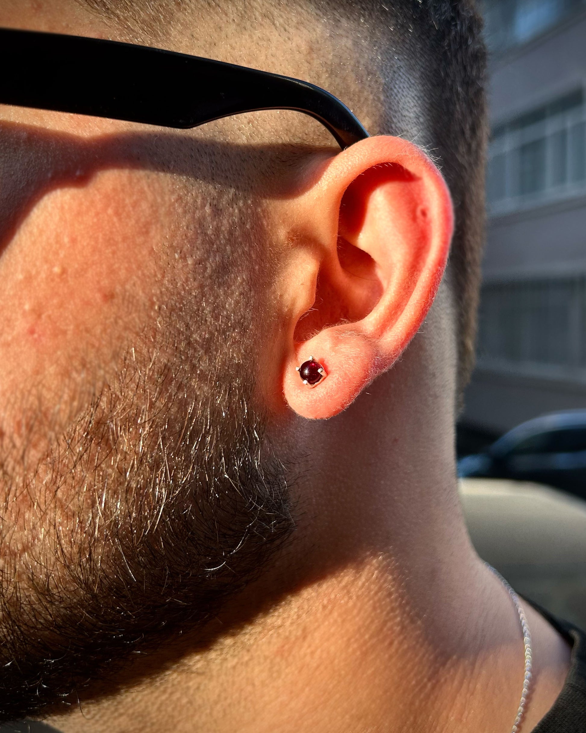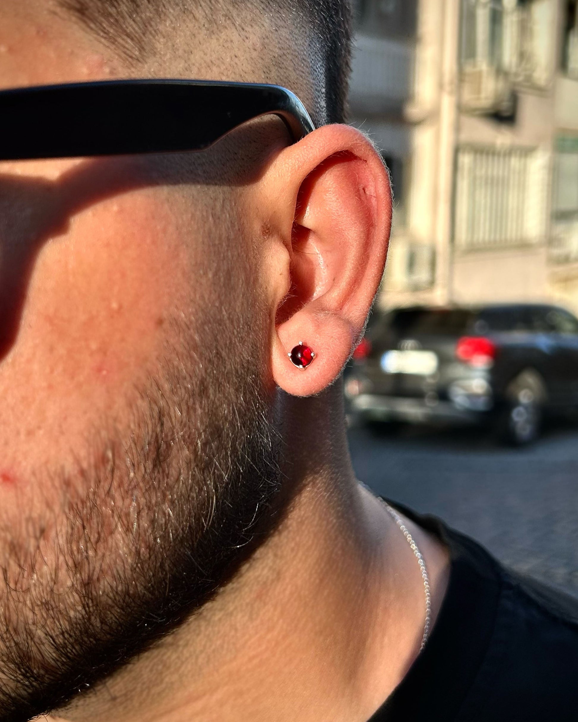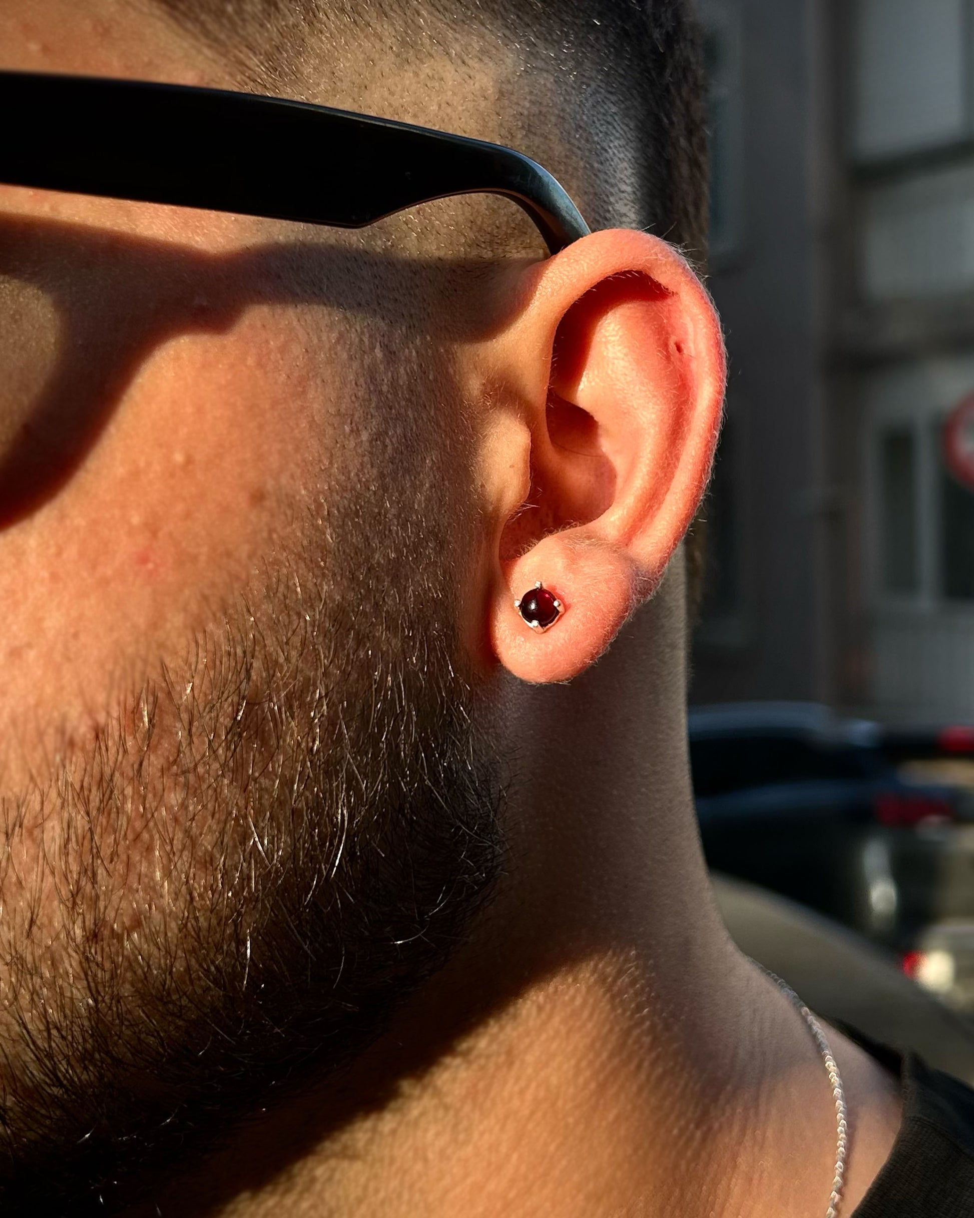 Bordo Taşlı Erkek Küpe - 925 Ayar Gümüş