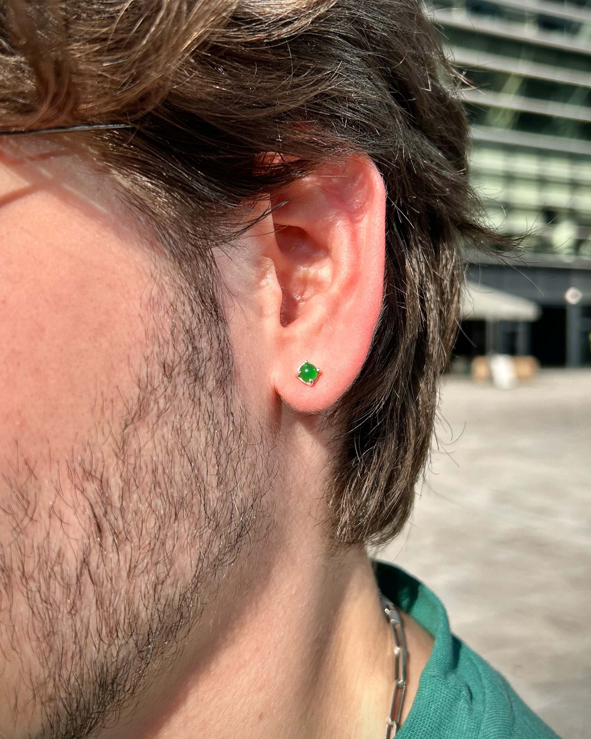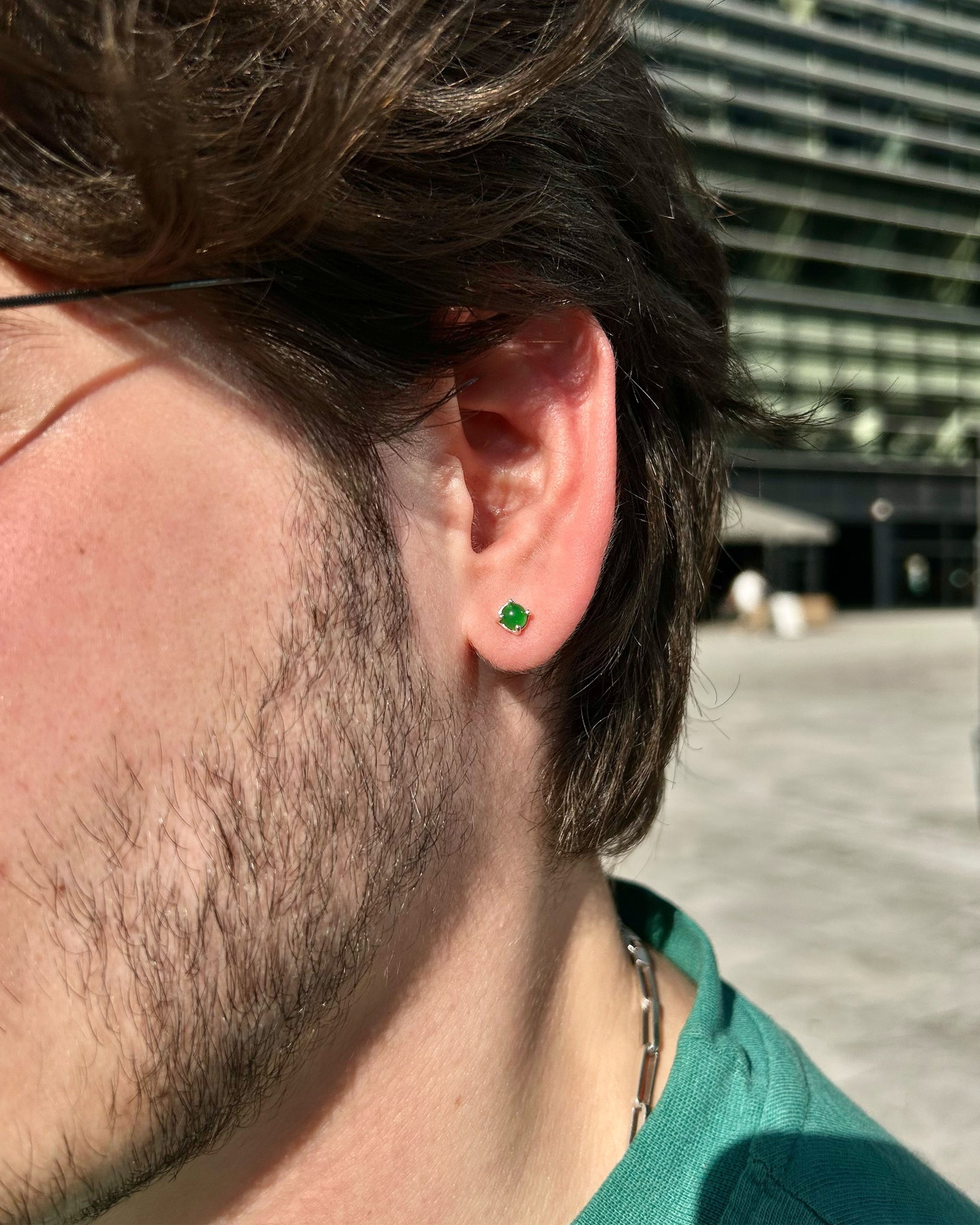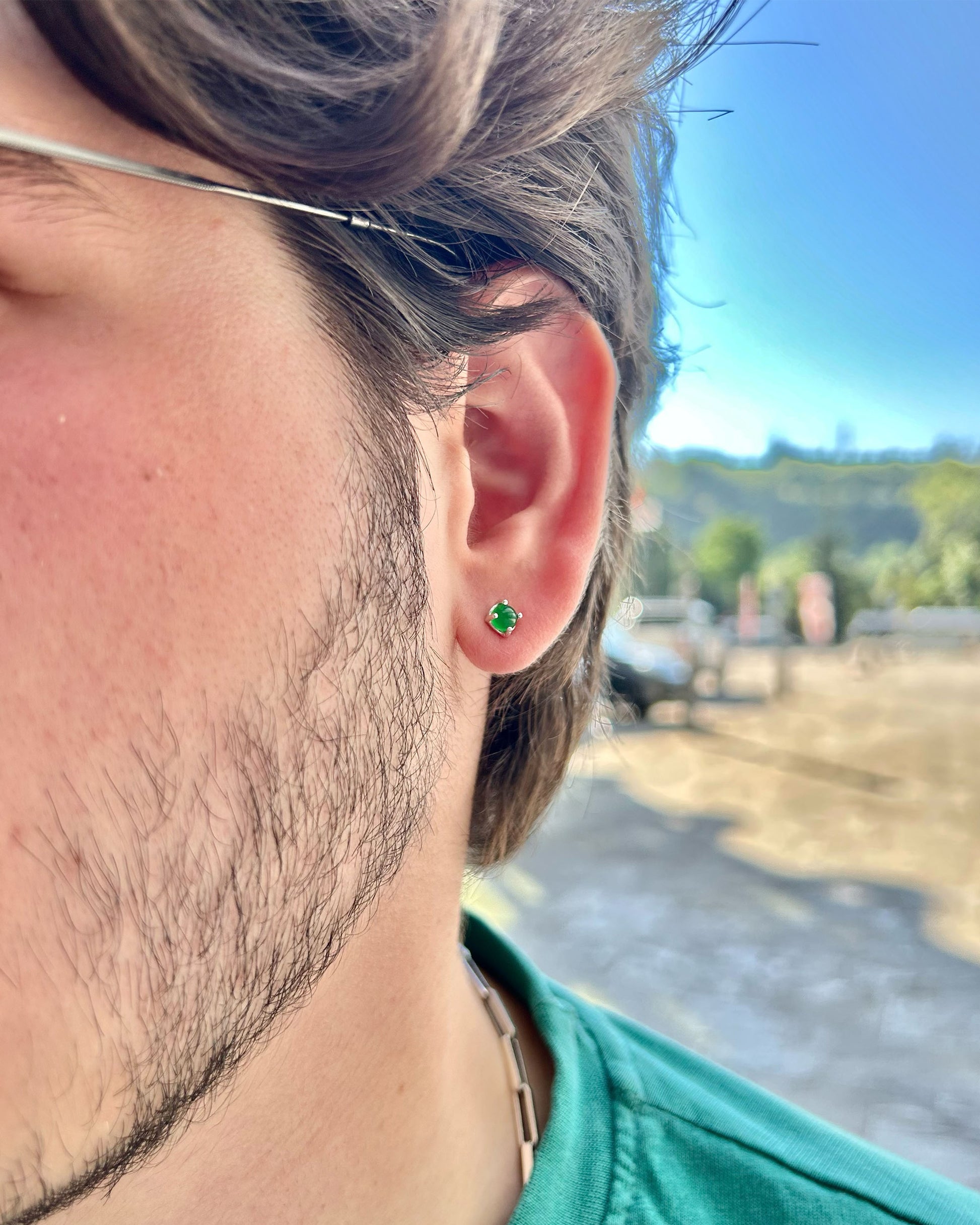 Bu minimalist erkek küpesi, 925 ayar gümüşten üretilmiş ve derin yeşil taşla detaylandırılmıştır.