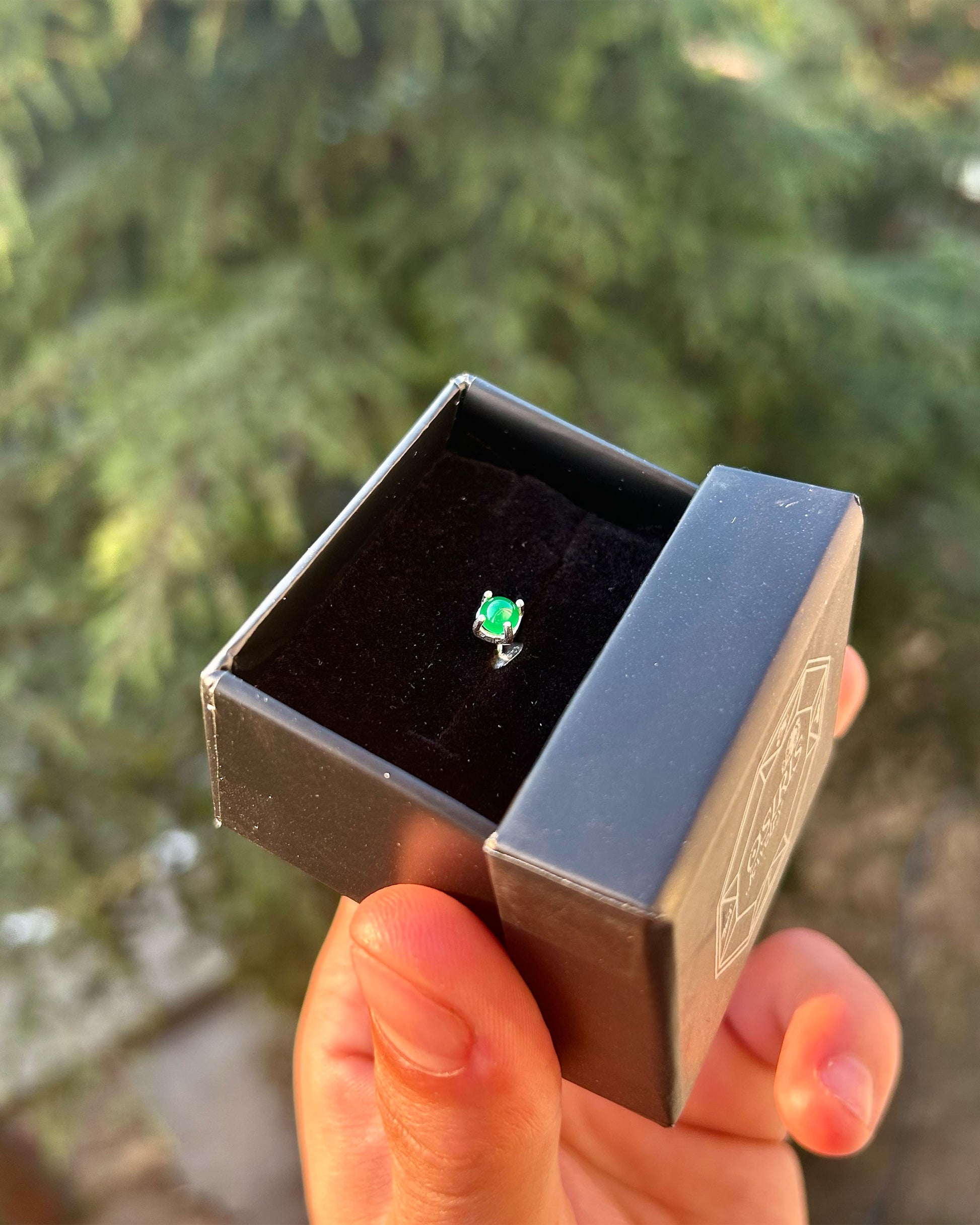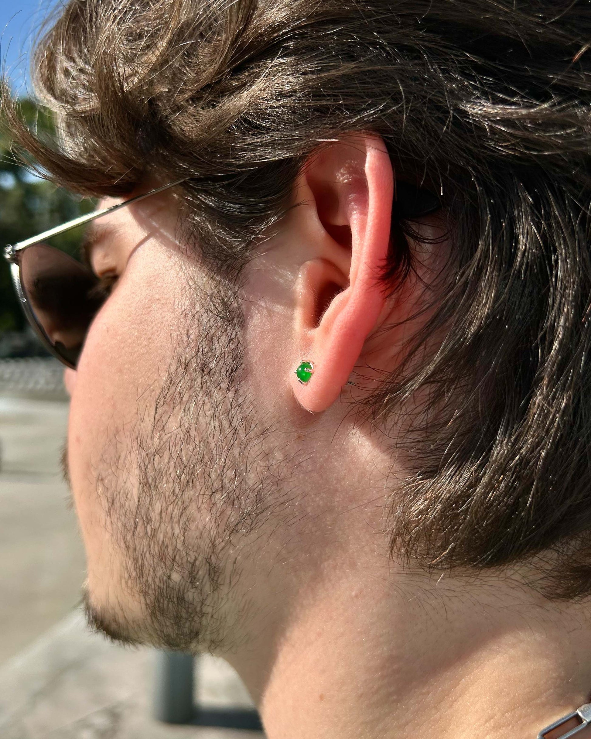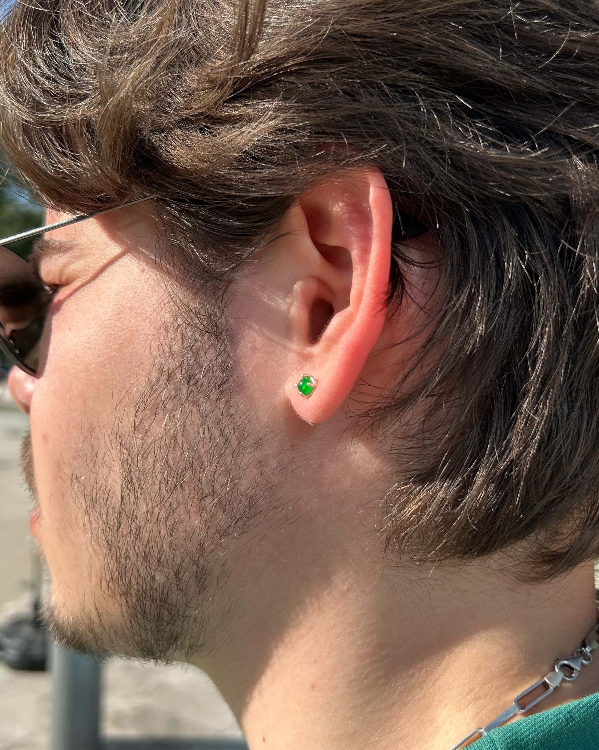Bu minimalist erkek küpesi, 925 ayar gümüşten üretilmiş ve derin yeşil taşla detaylandırılmıştır.