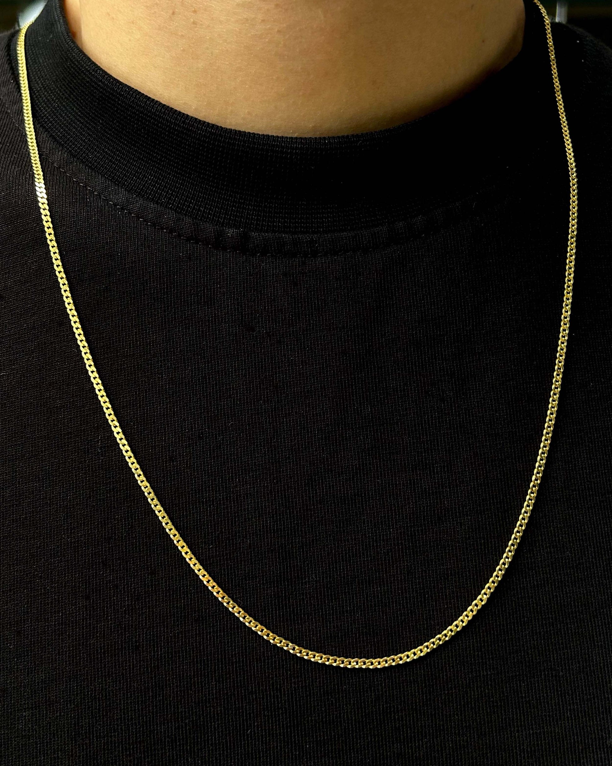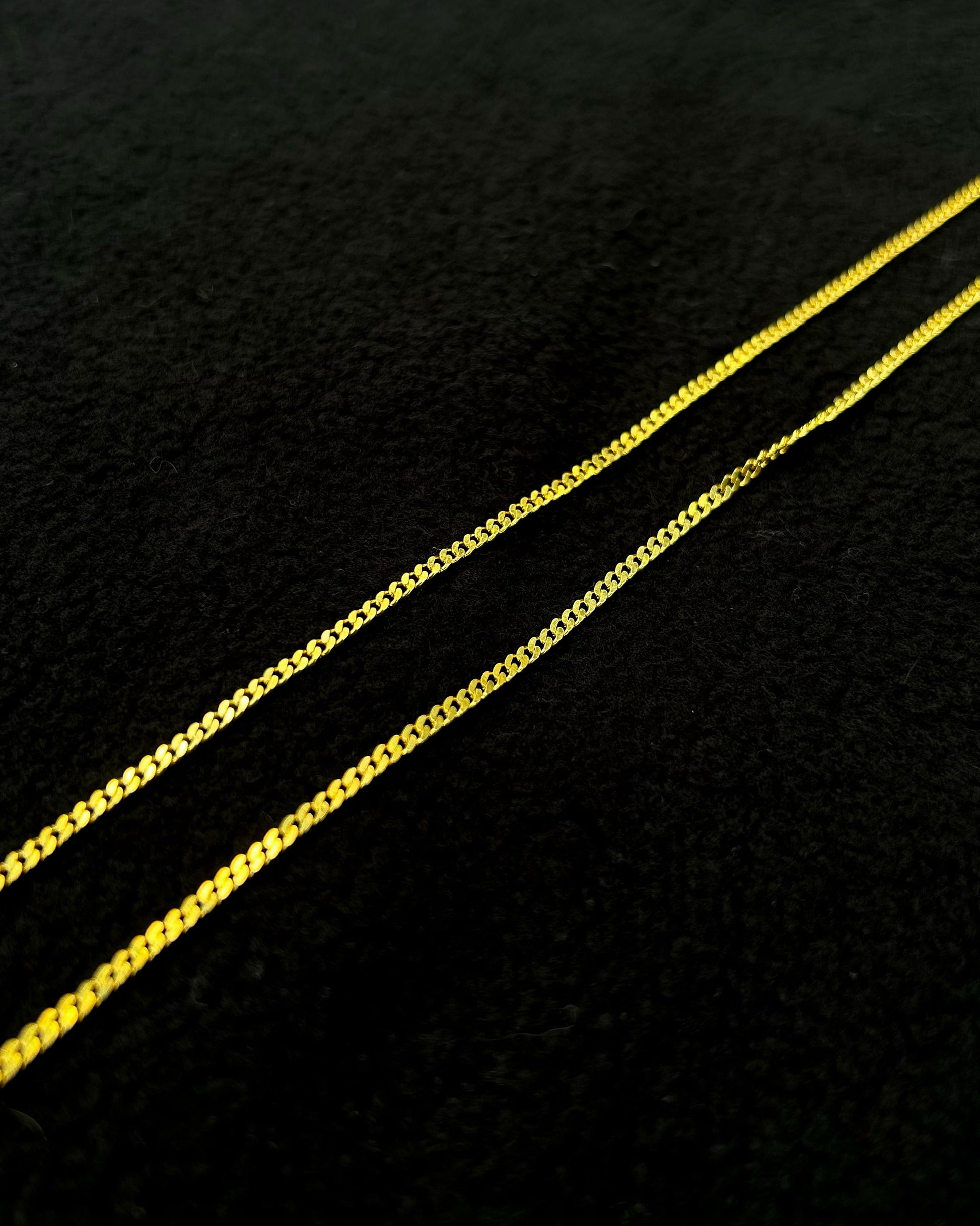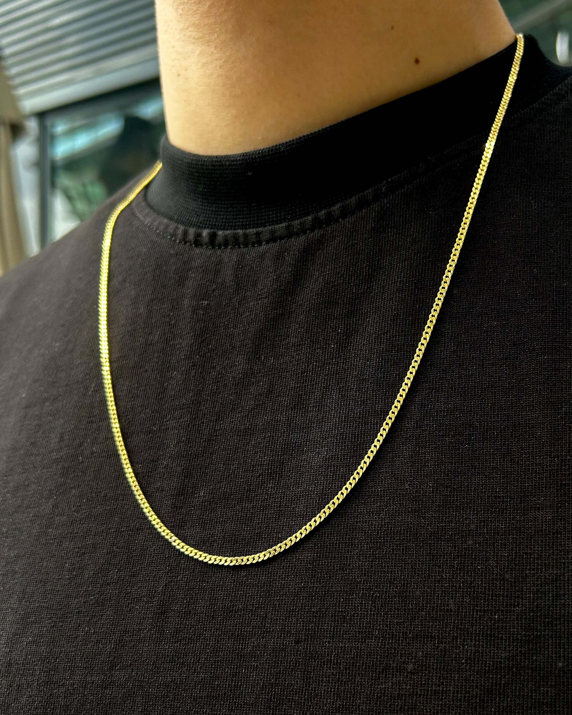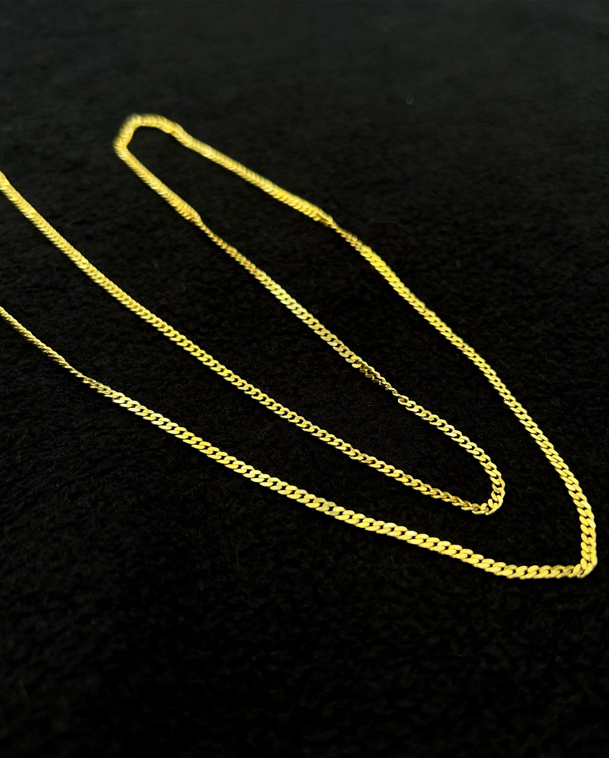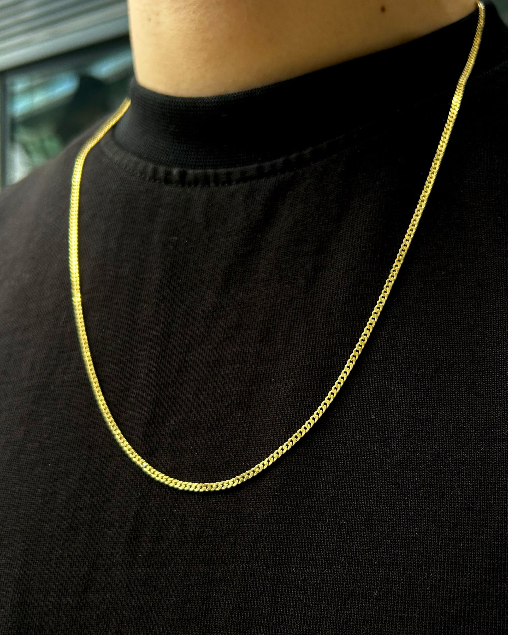 925 ayar gümüşten üretilmiş bu zincir, ince ve sık halkalardan oluşan mikro Cuban (Gourmet) formuna sahiptir. Minimalist tasarımıyla hem tek başına hem de katmanlı kullanım için idealdir. 22 ayar altın kaplama yüzeyi, standart kaplamalara göre daha yüksek altın oranına sahiptir ve uzun süre kalıcı parlaklık sağlar.