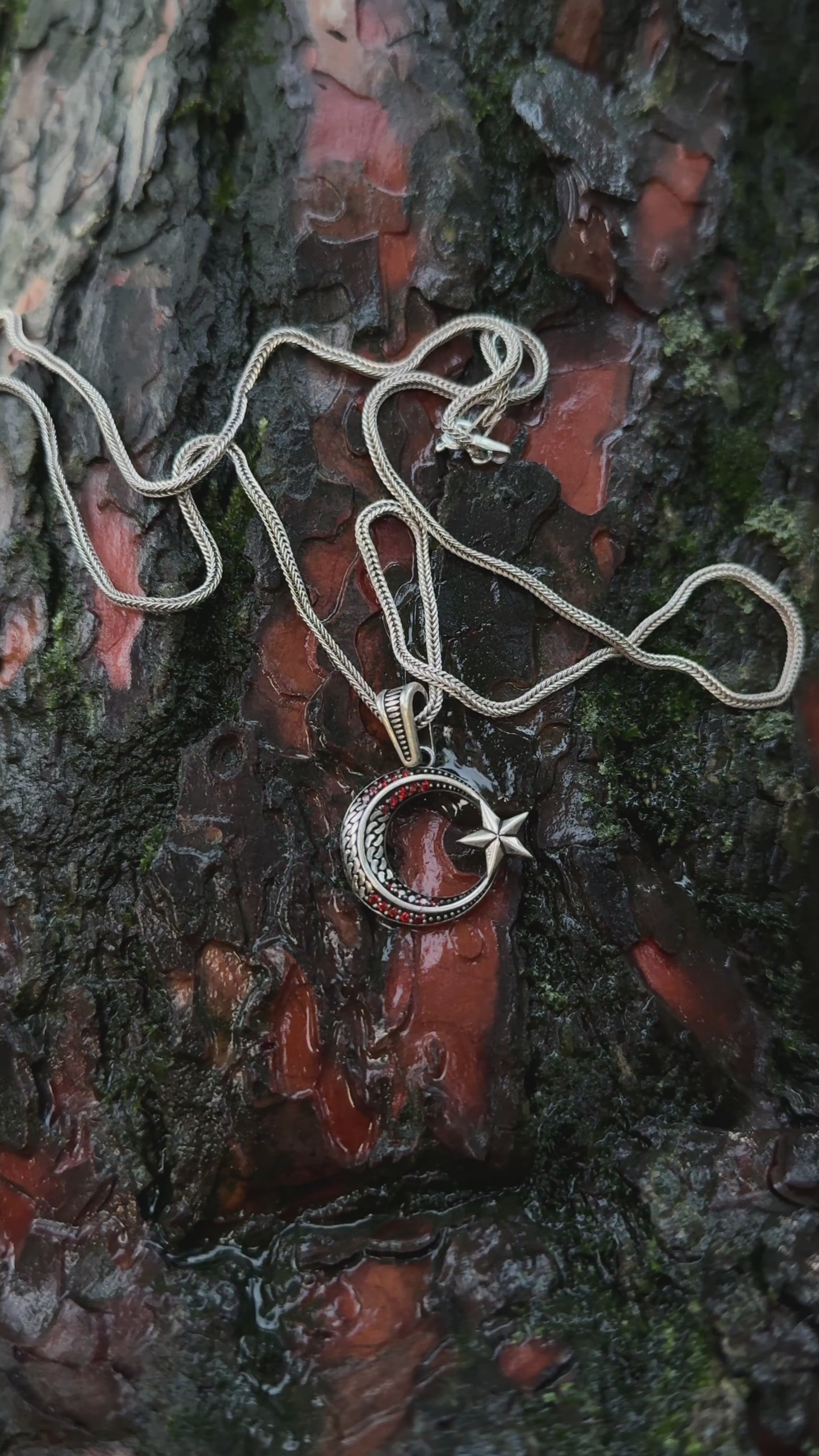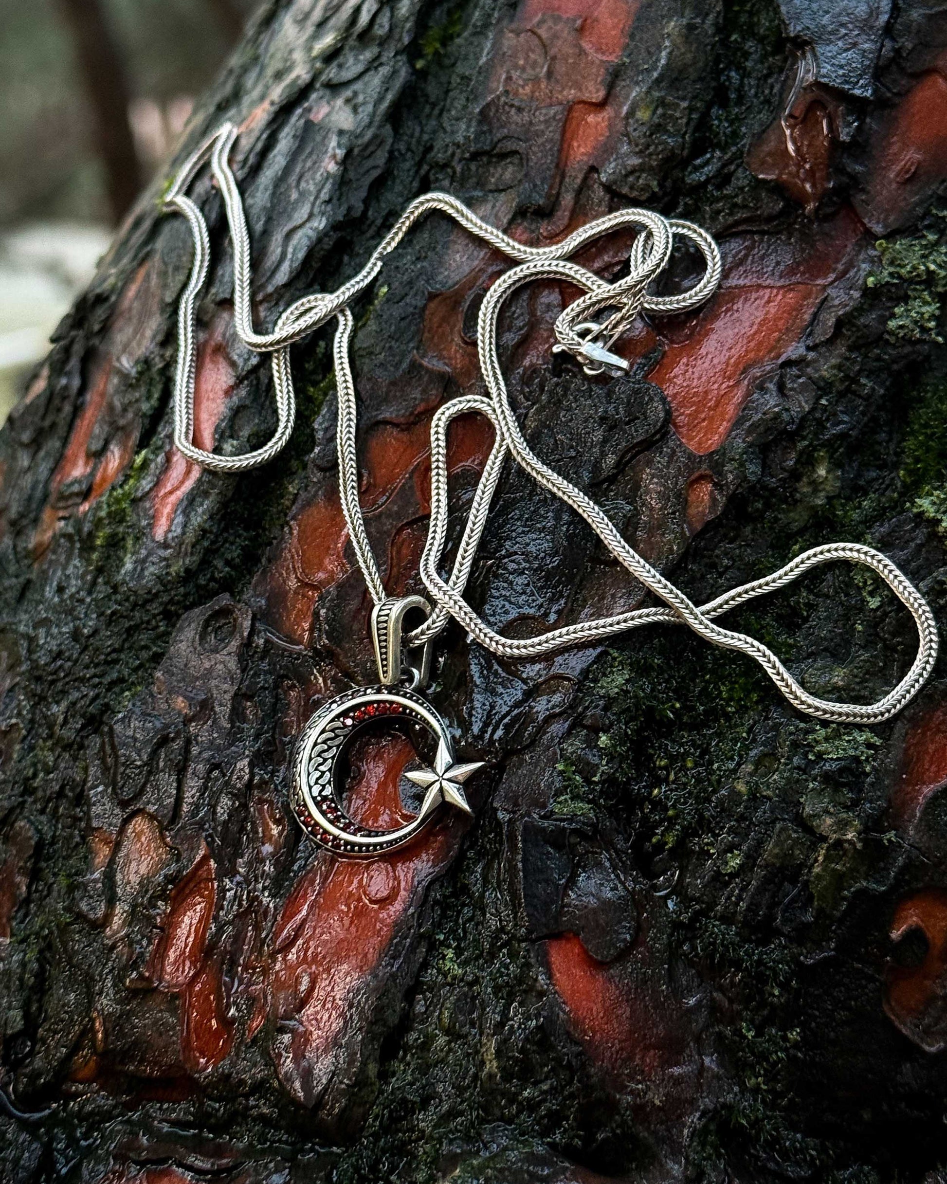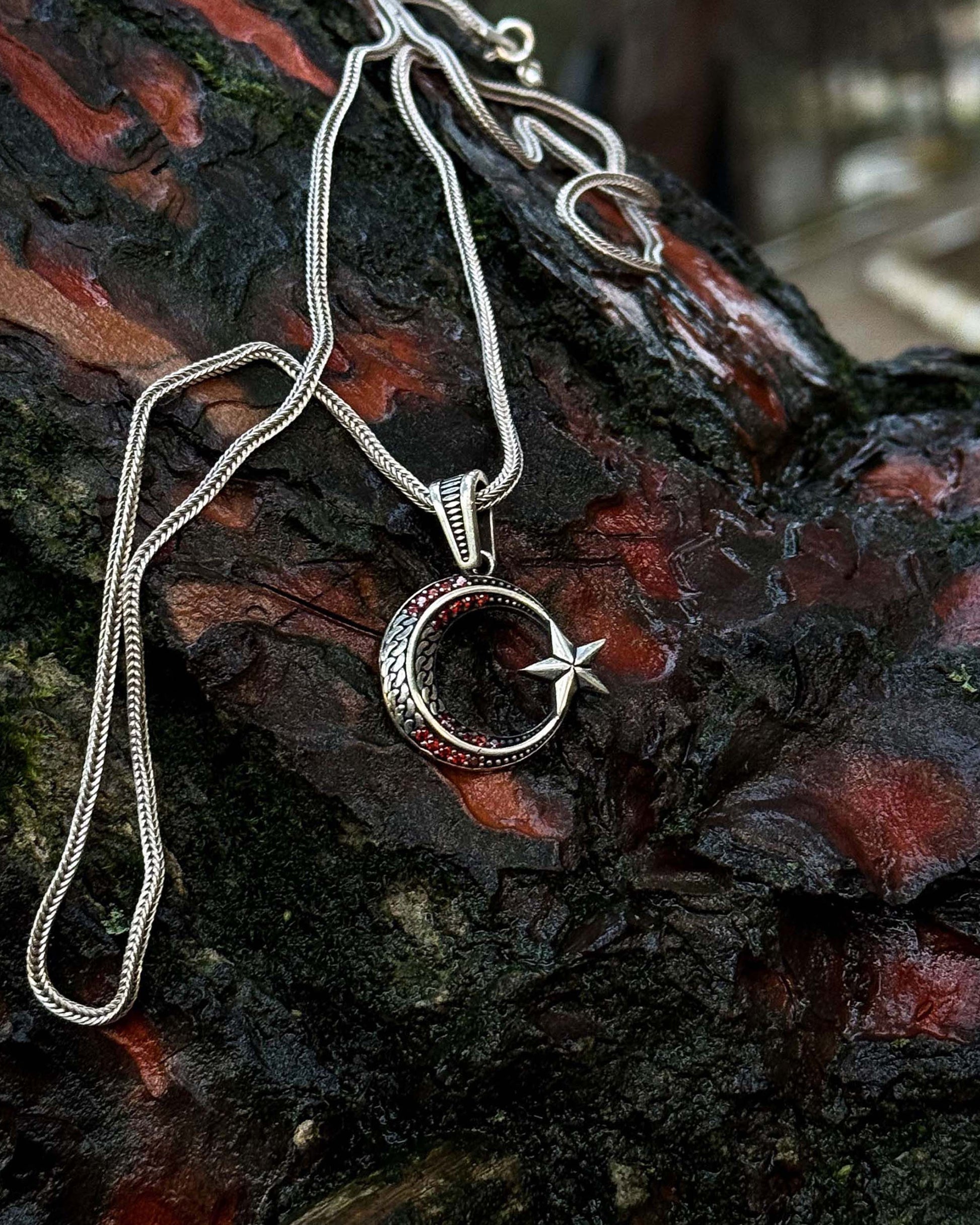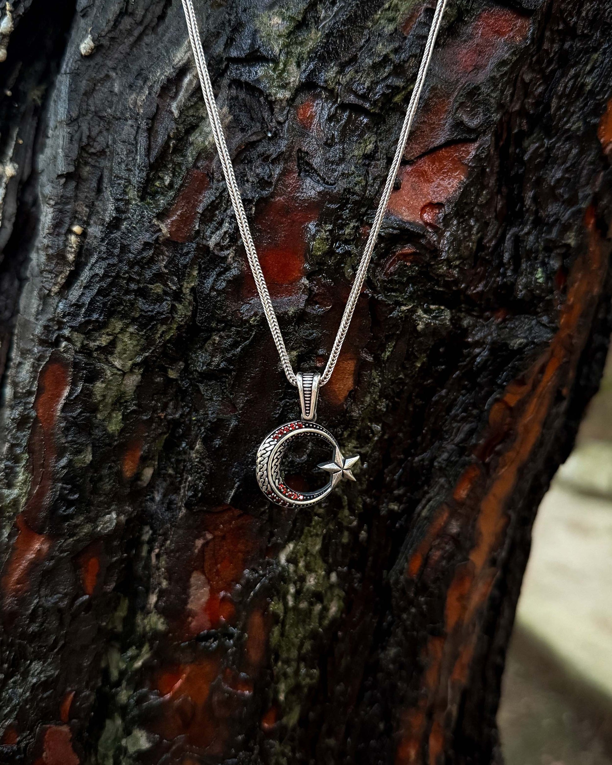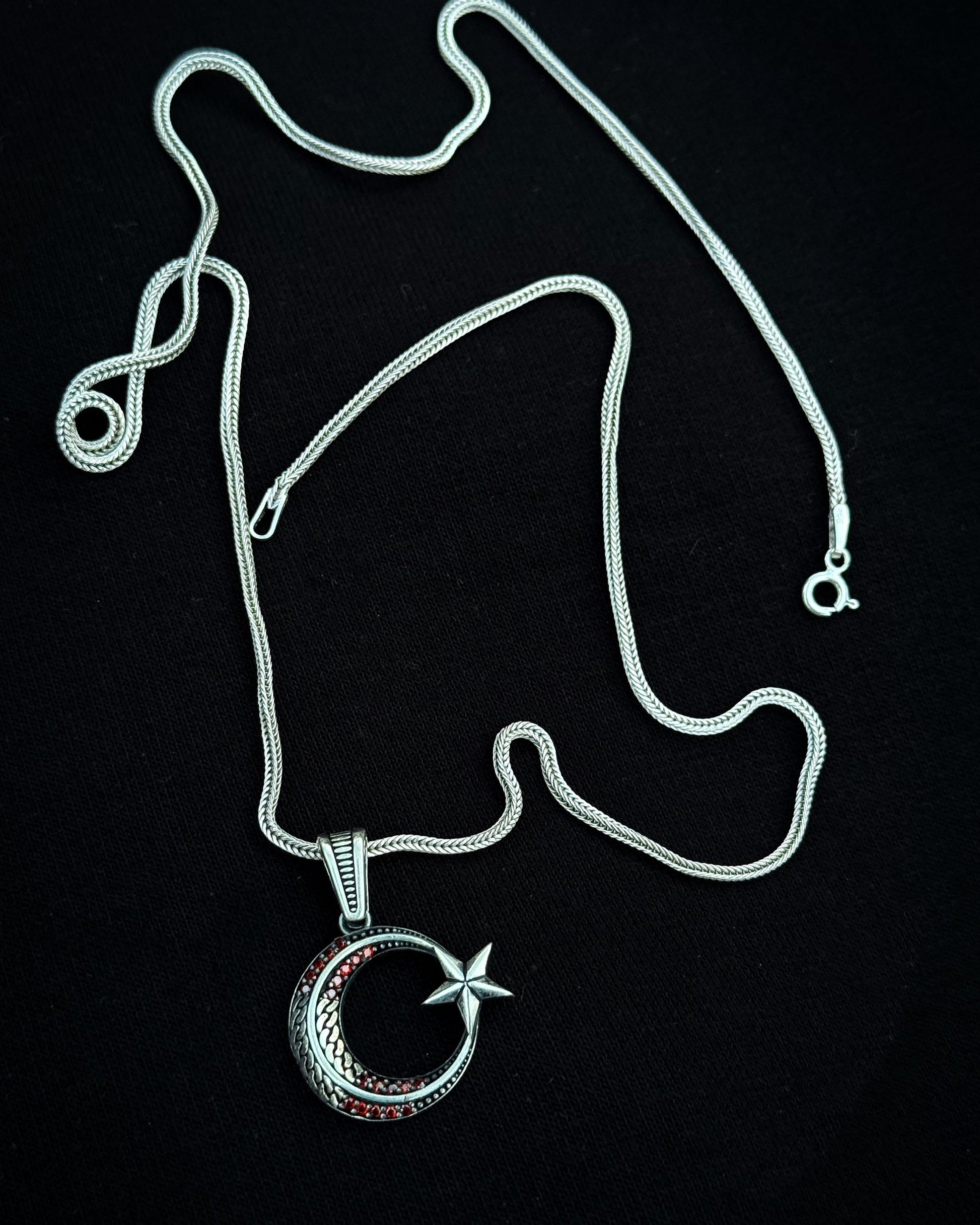 925 ayar gümüşten üretilen bu tasarım, milli sembolümüzü zarif ve minimal bir çizgide sunar. İnce hatlarla işlenen hilal ve yıldız, merkezdeki kırmızı taş detayıyla "Al Bayrak" estetiğine ince bir gönderme yapar. Büyük ve gösterişli takılardan ziyade, boynunda sade, hafif ve anlamlı bir ışıltı taşımak isteyenler için tasarlanan bu kolye, günlük kullanımın her anına uyum sağlar.