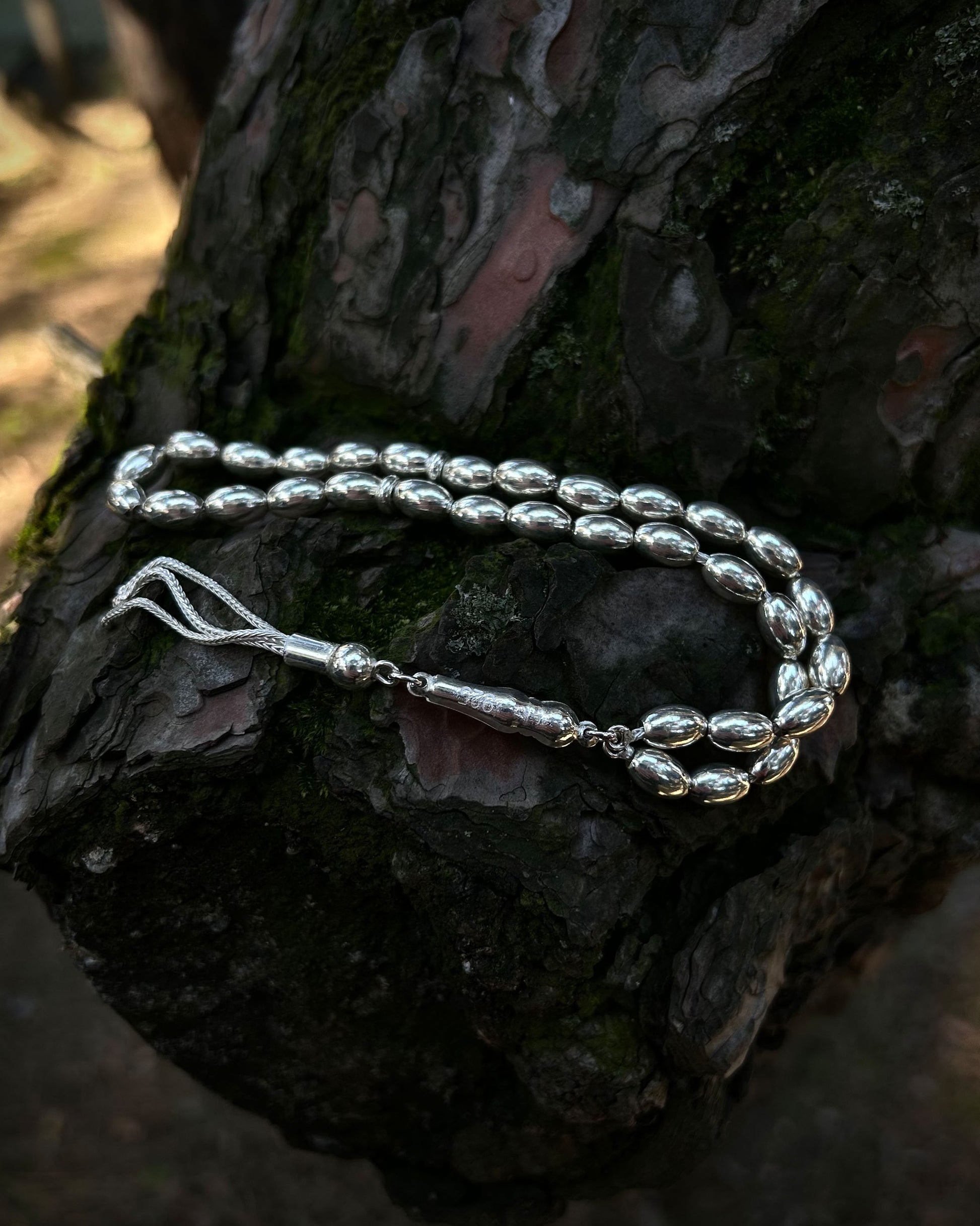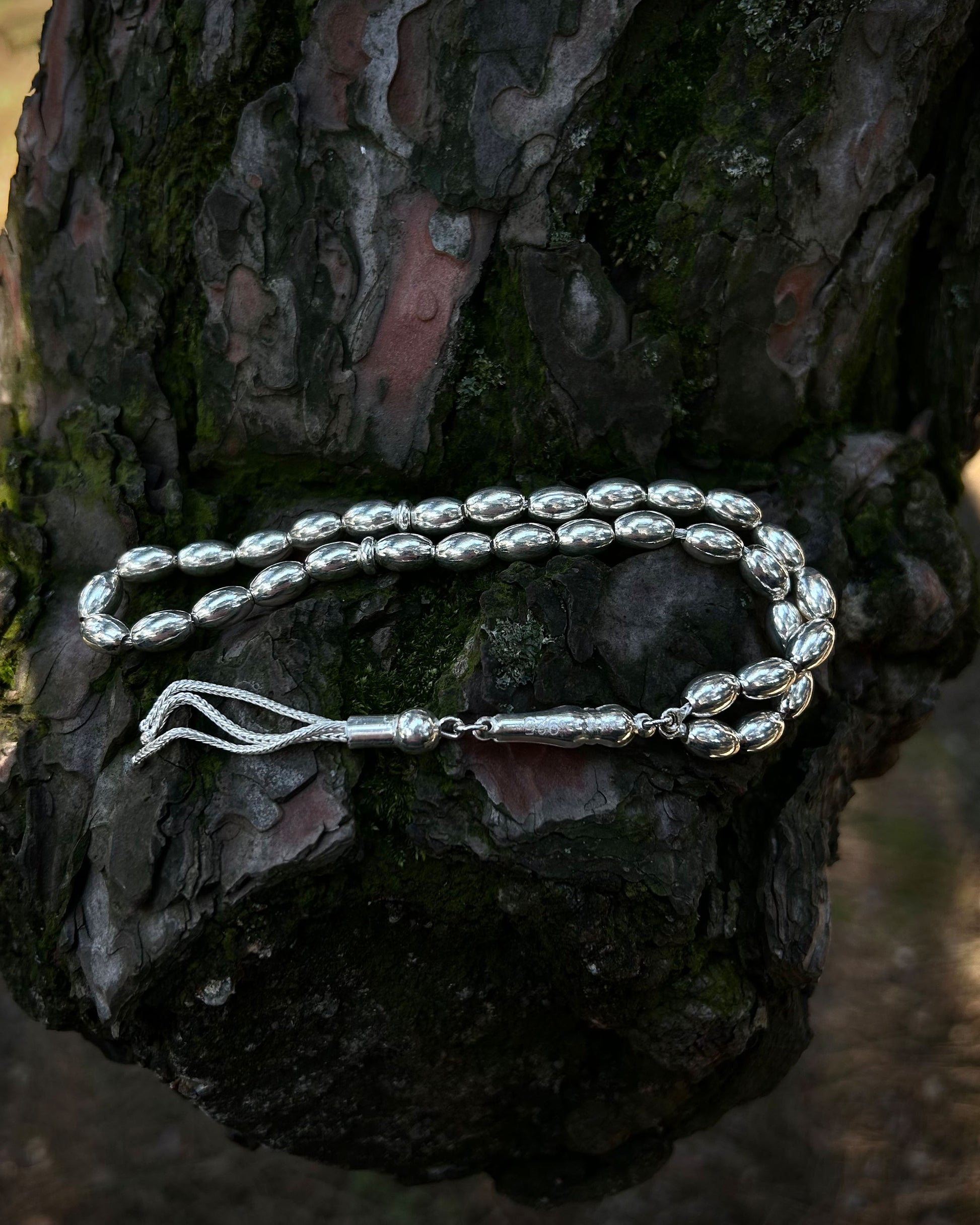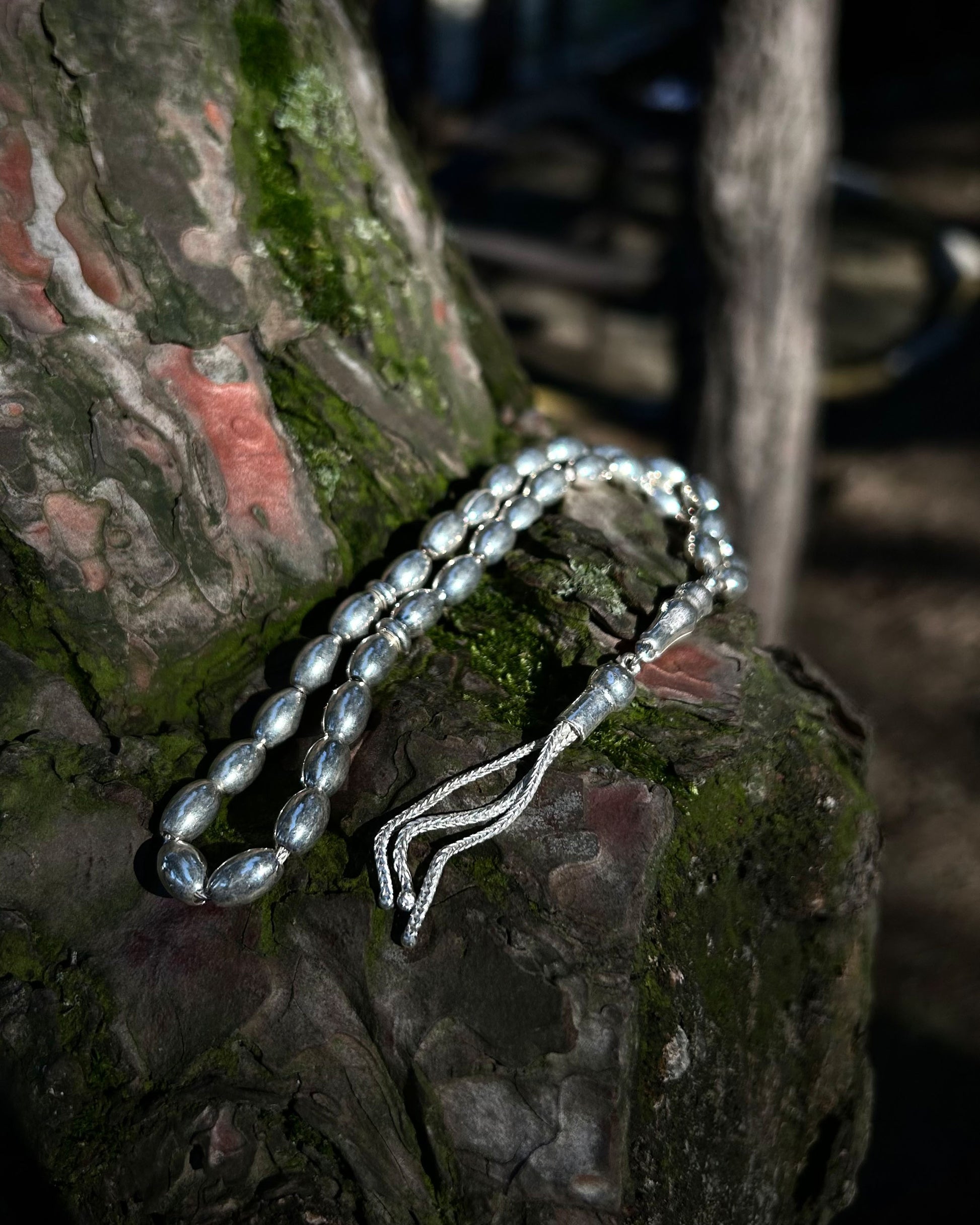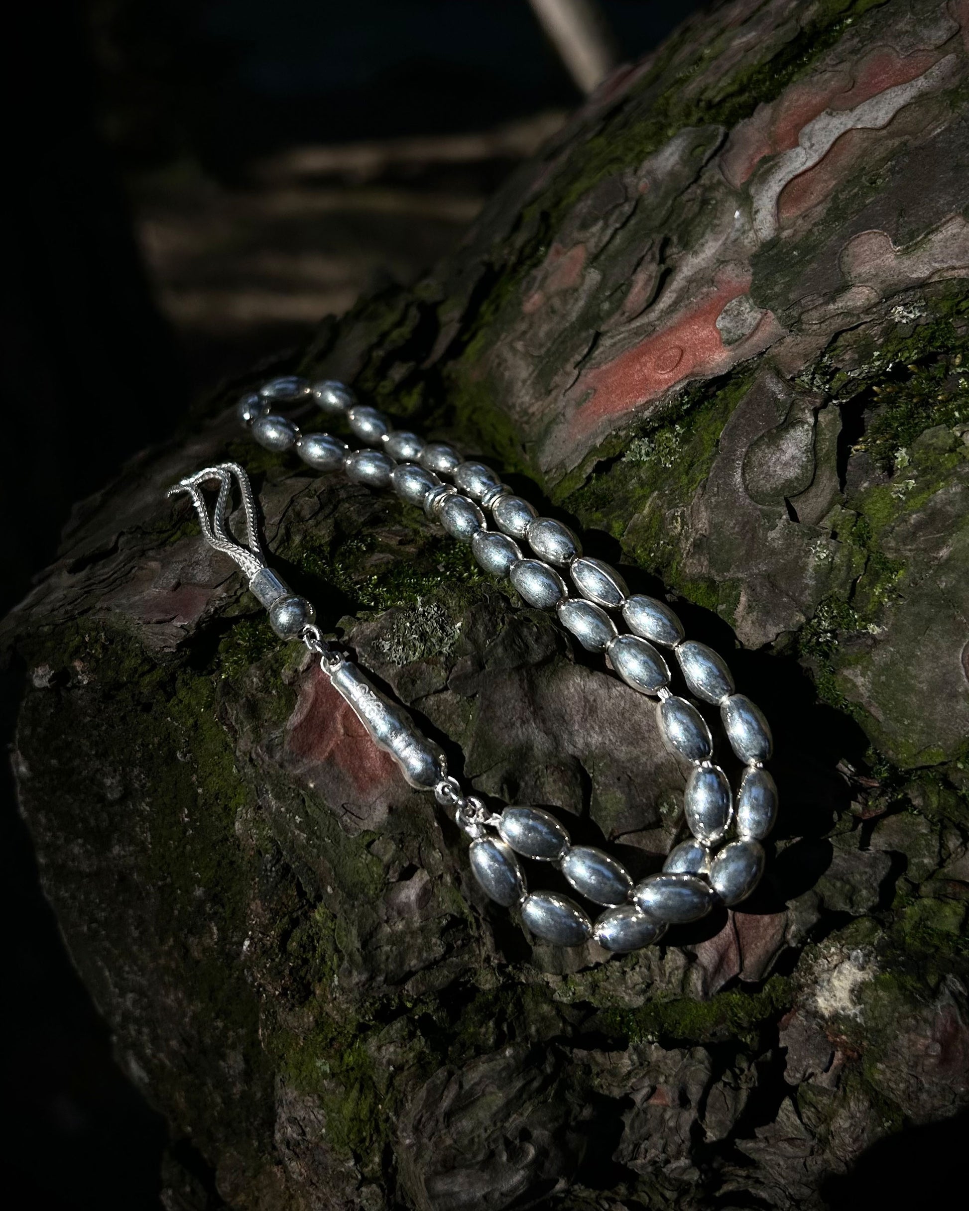 925 ayar gümüşten el işçiliğiyle üretilmiş bu tesbih, oval taneleri ve zincirli tasarımıyla öne çıkar.