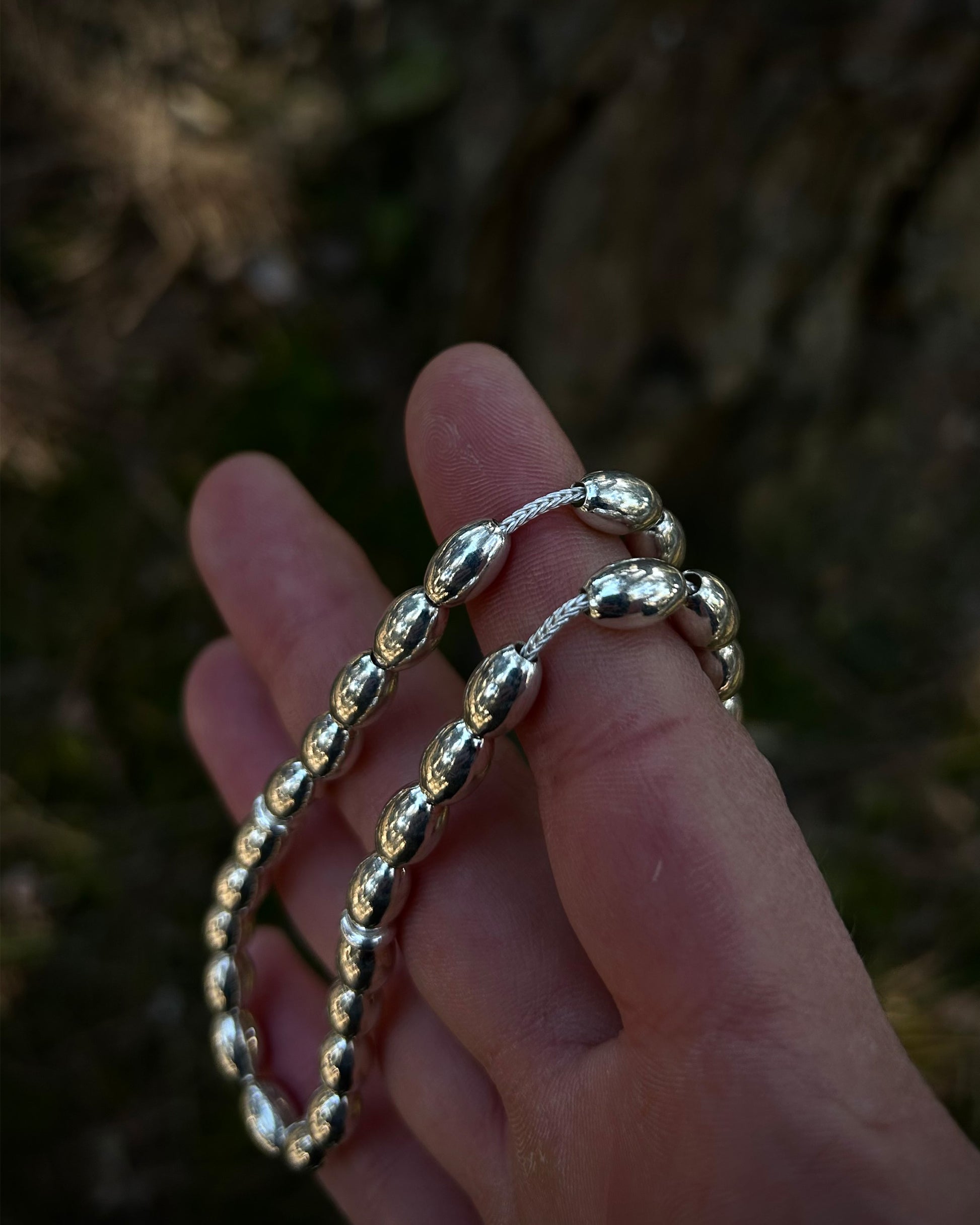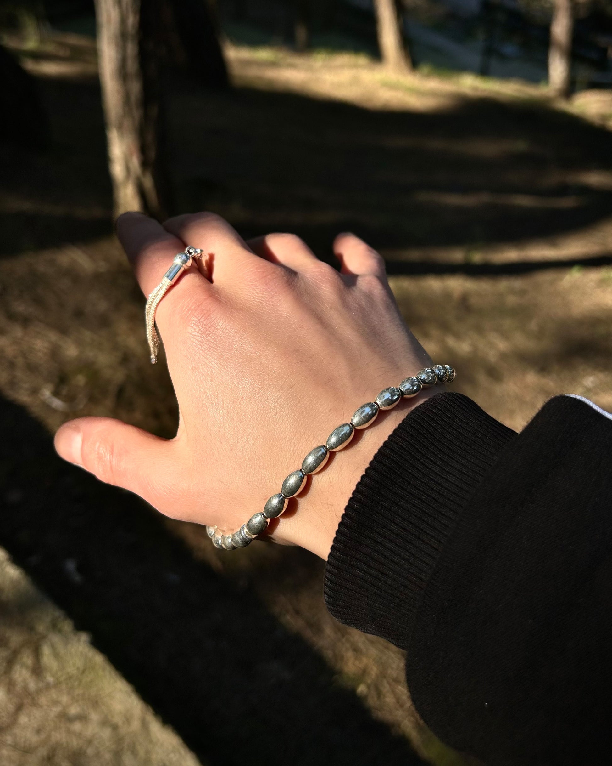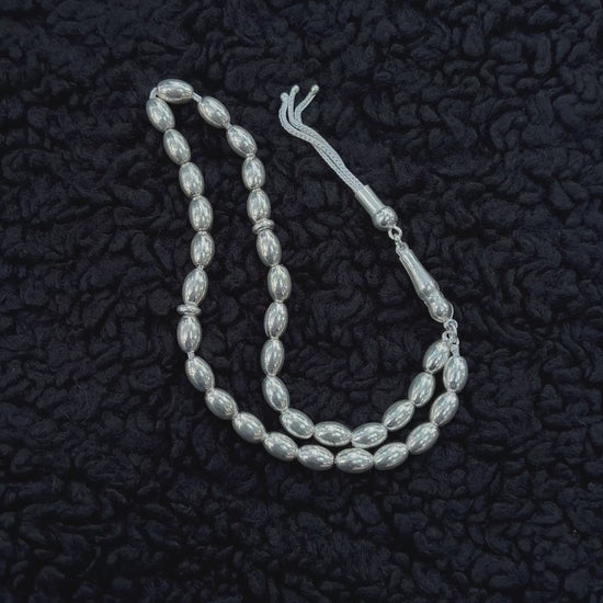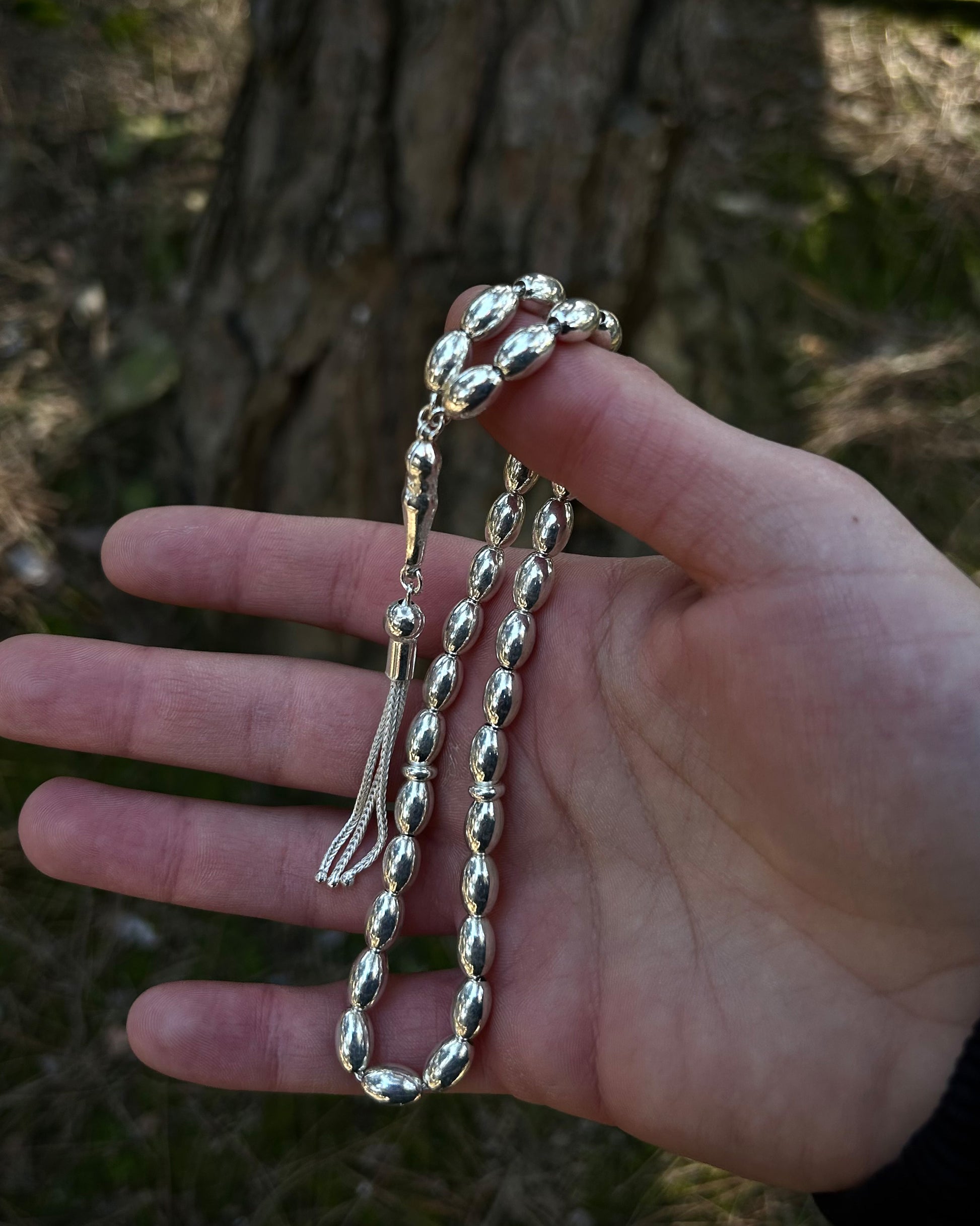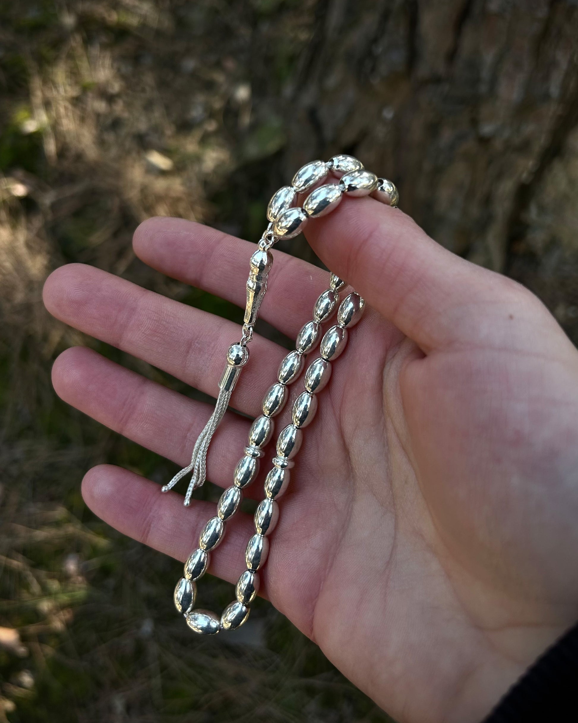 925 ayar gümüşten el işçiliğiyle üretilmiş bu tesbih, oval taneleri ve zincirli tasarımıyla öne çıkar.