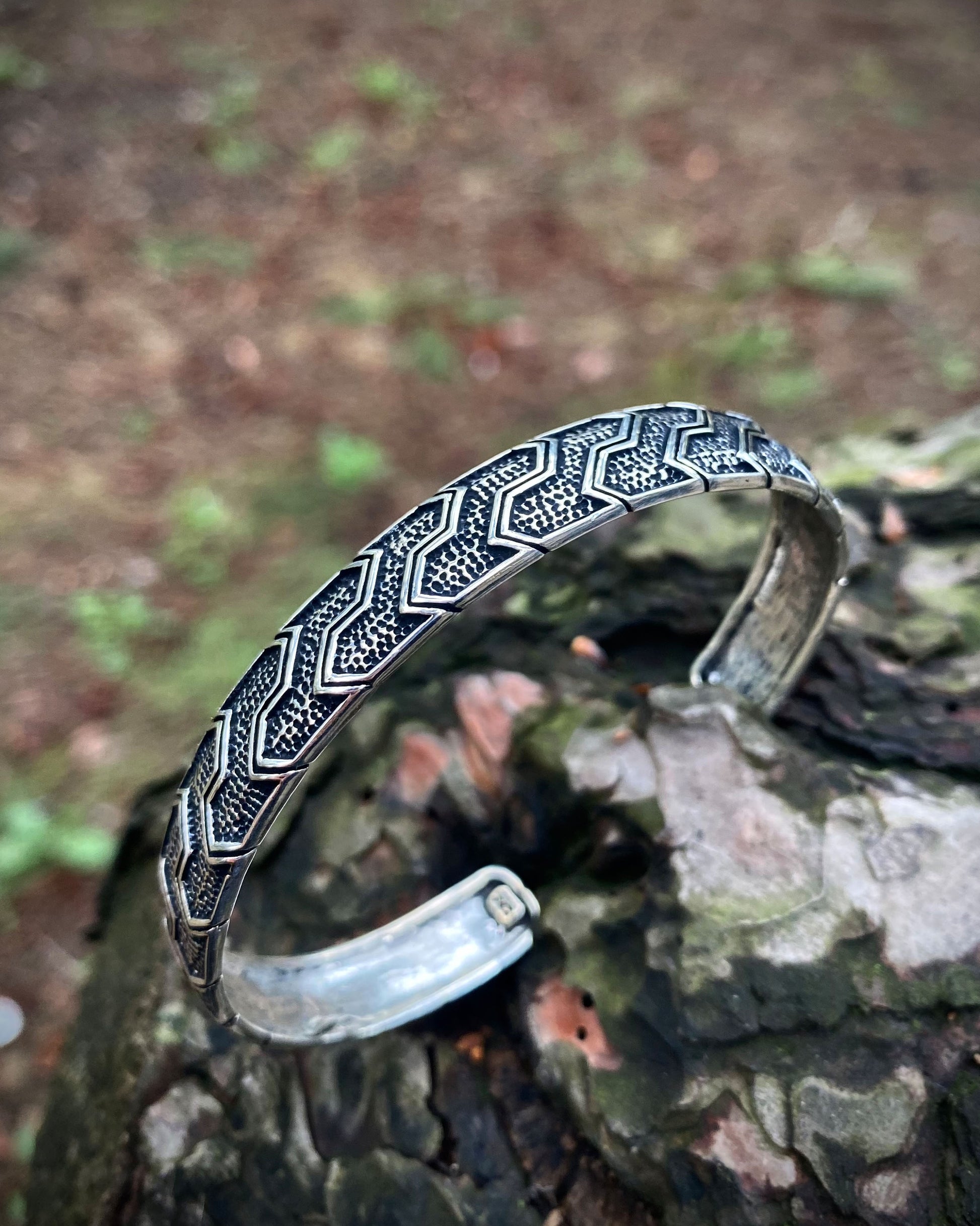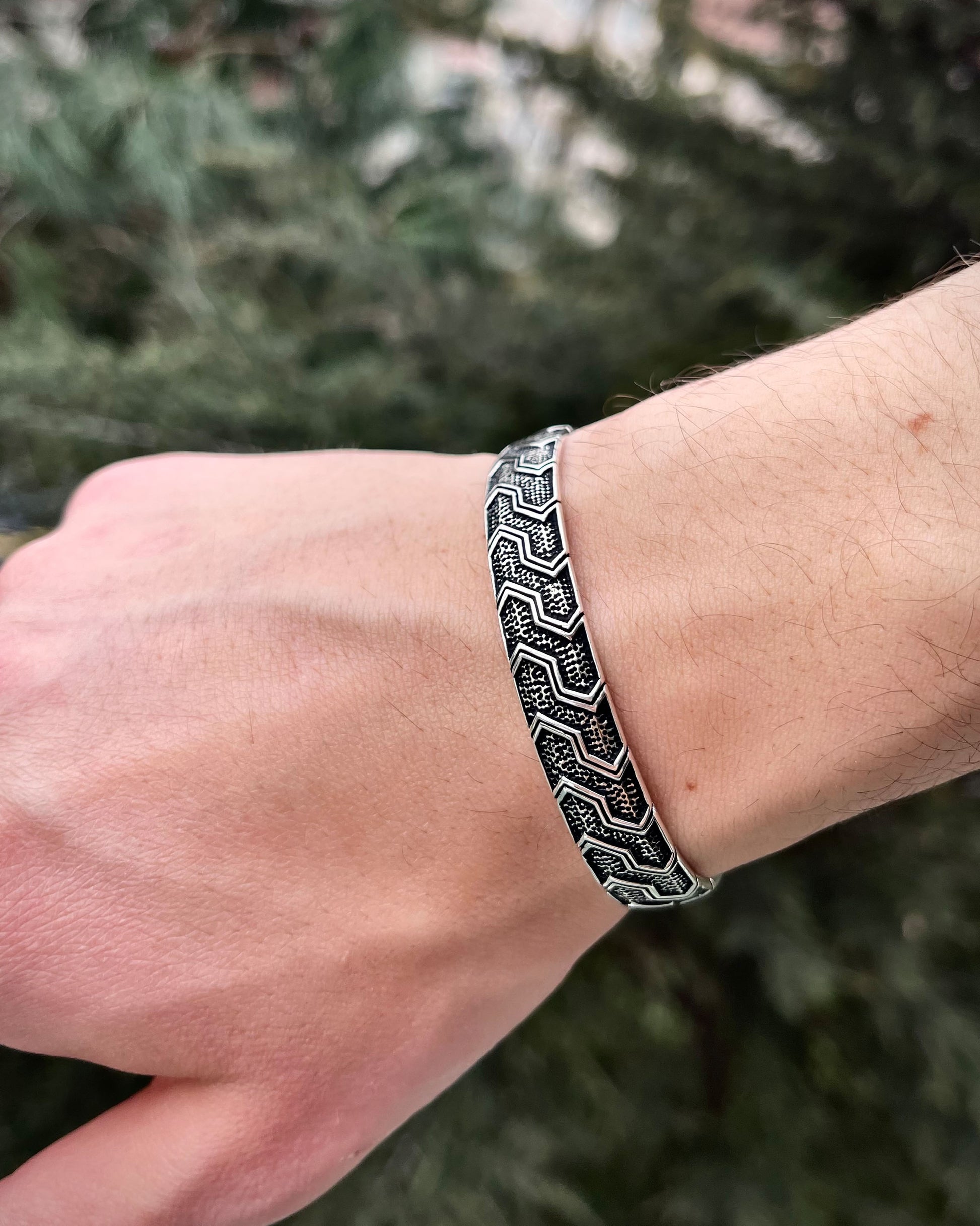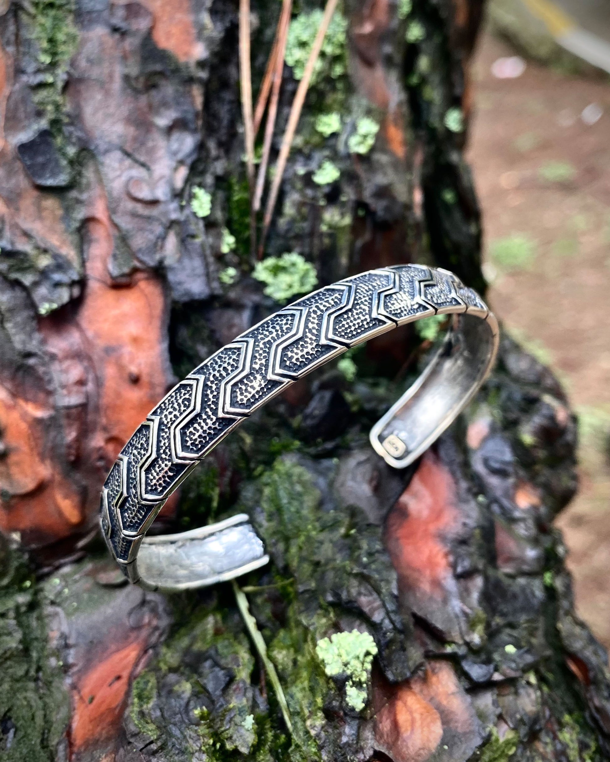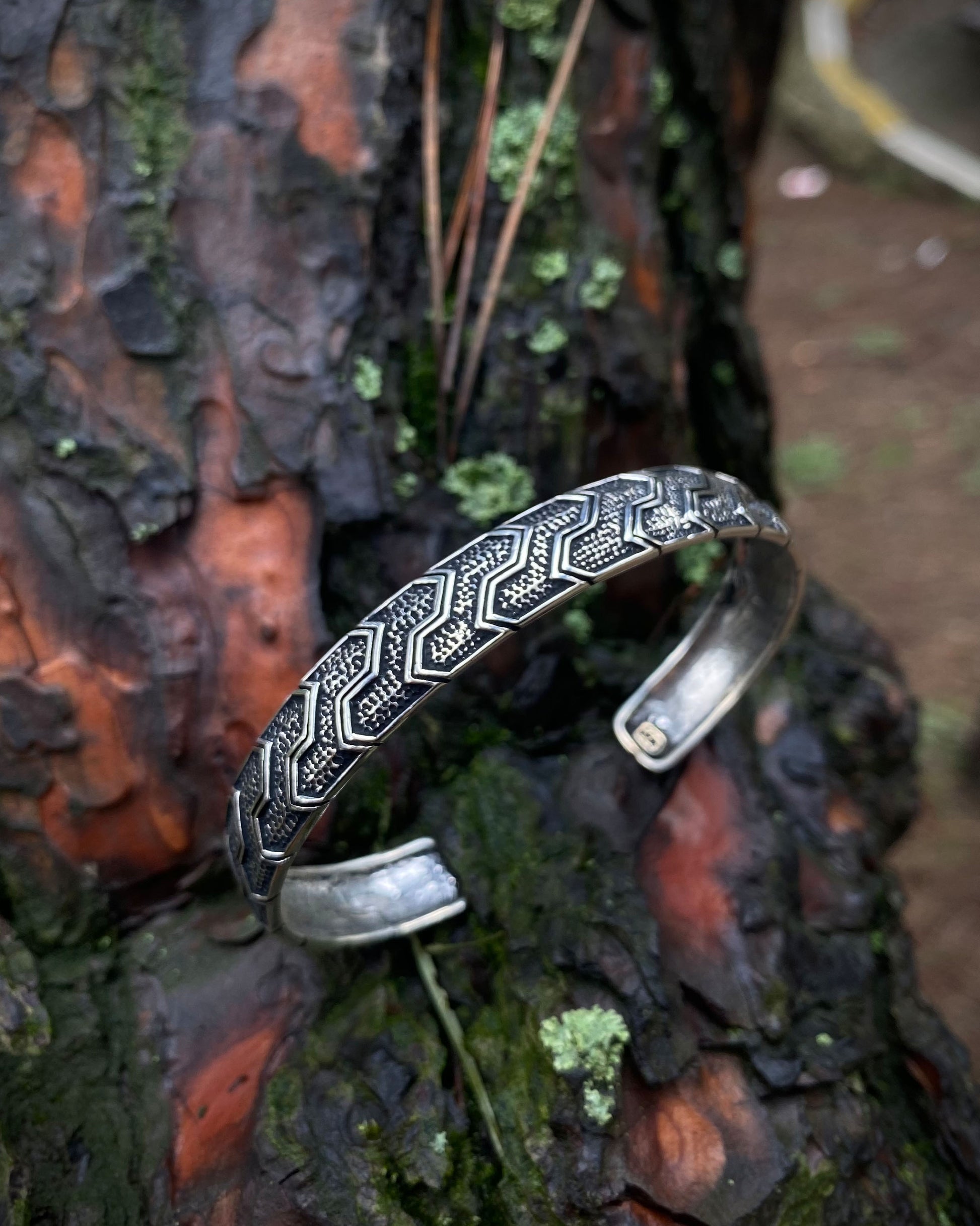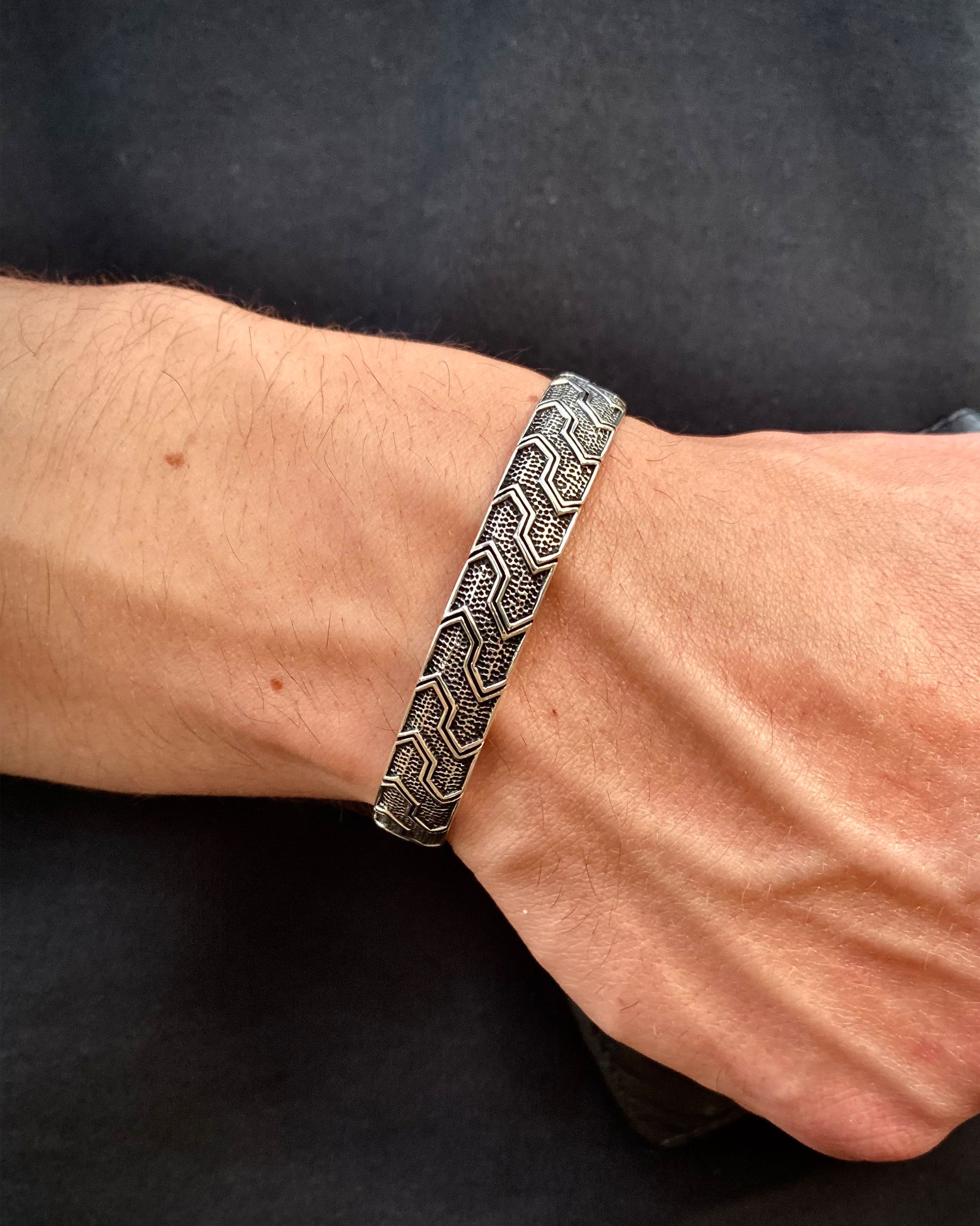 925 ayar gümüşten el işçiliğiyle üretilmiş bu cuff bilezik, oksitli yüzeyi ve geometrik desenleriyle dikkat çeker. Ayarlanabilir yapısı sayesinde farklı bilek ölçülerine kolayca uyum sağlar.