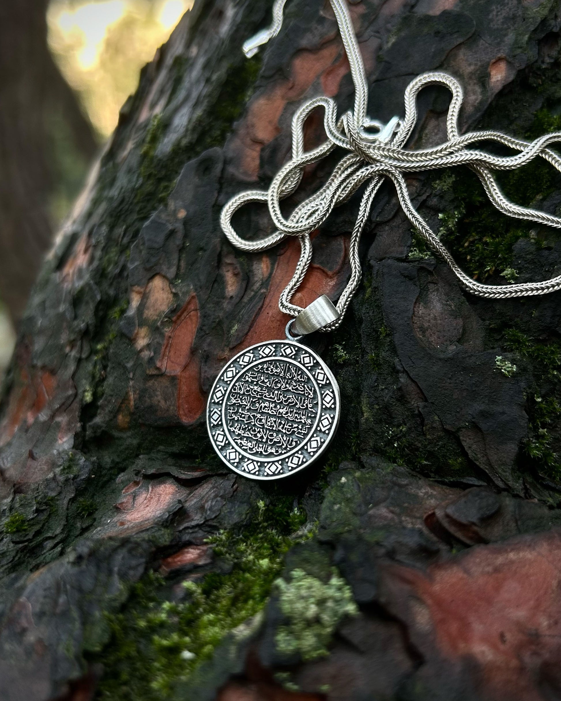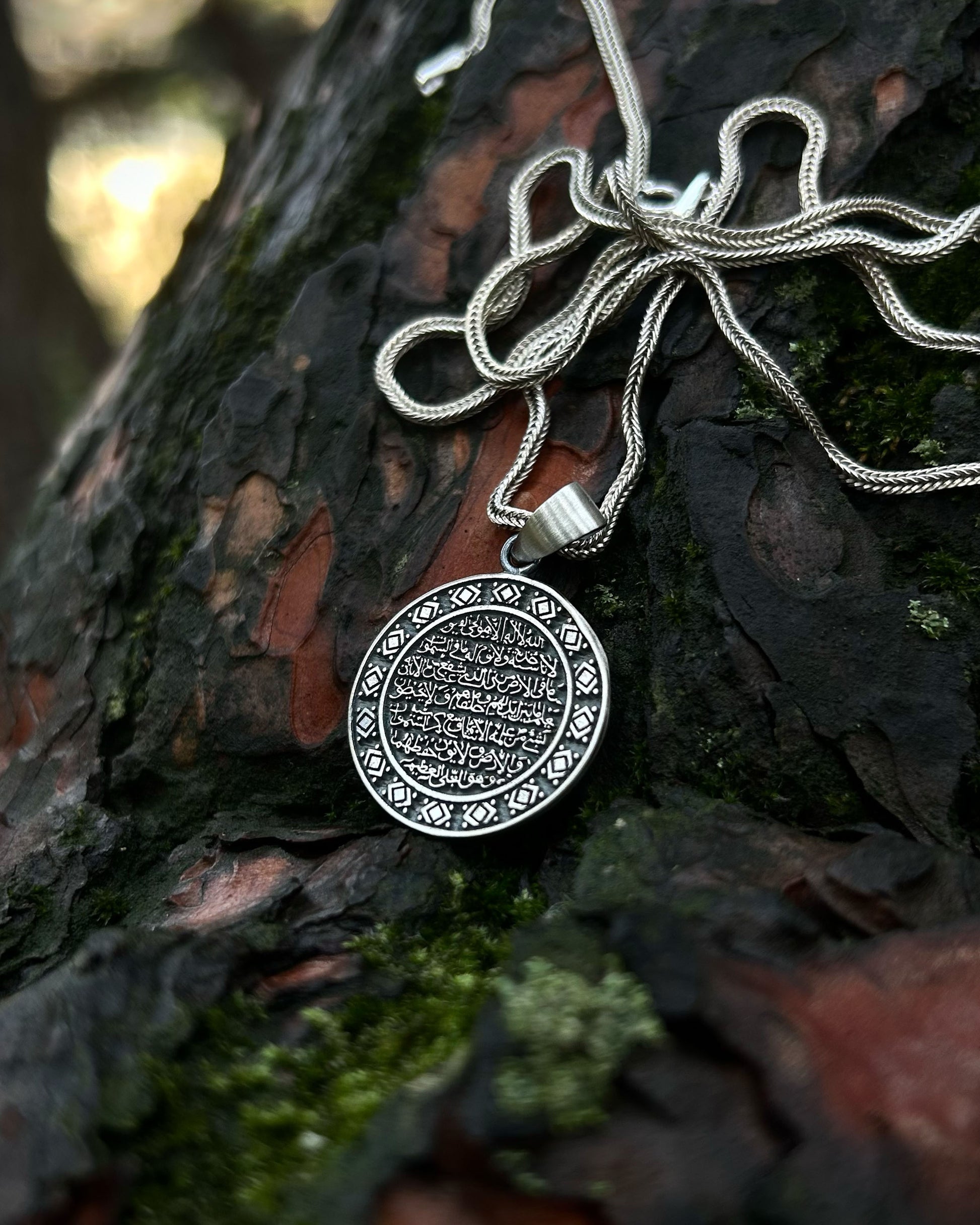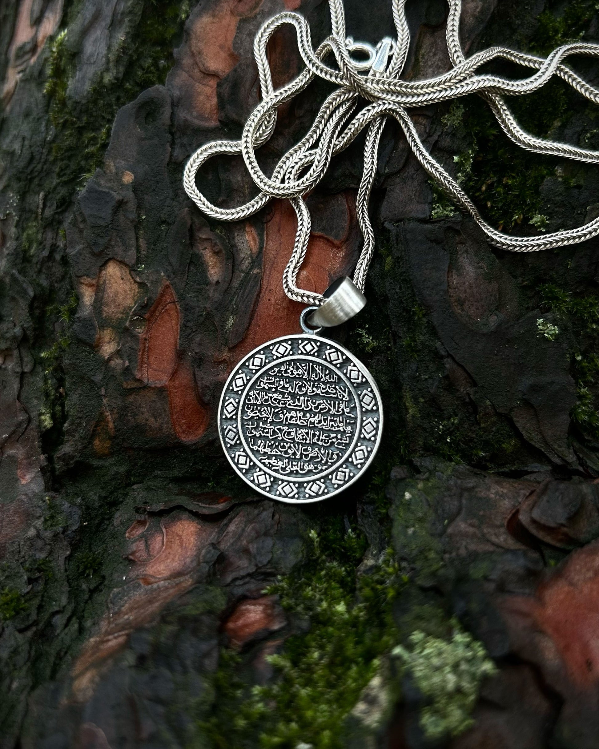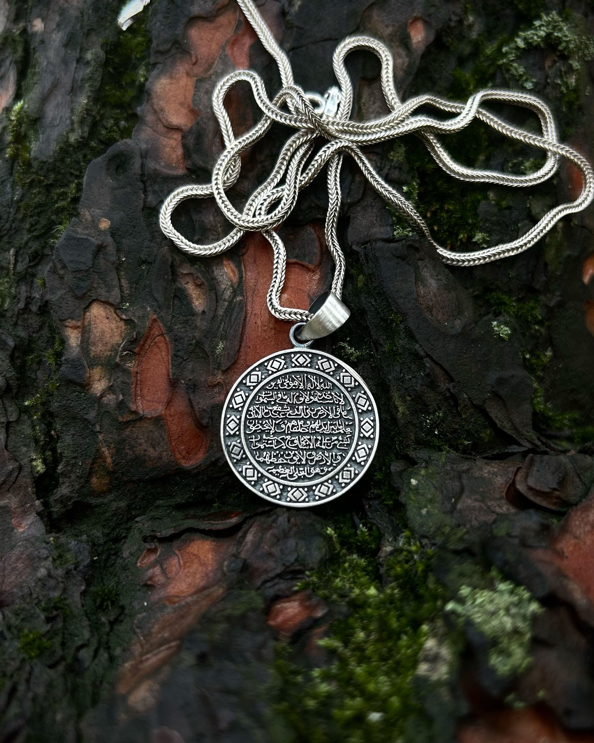 Kur'an-ı Kerim'in en güçlü ayeti olan Ayetel Kürsi, Allah'ın mutlak gücünü ve egemenliğini temsil eder. 925 ayar gümüş üzerine işlenen bu manevi tılsım, taşıyıcısını her türlü kötülüğe, nazara ve kazaya karşı koruduğuna inanılan ilahi bir kalkandır. Yuvarlak formu evrensel bütünlüğü ve sonsuz korumayı simgelerken, stilinize derin bir maneviyat ve huzur katacaktır.