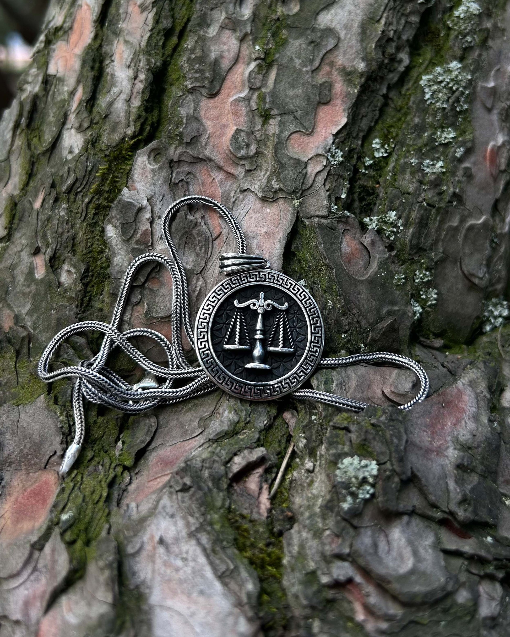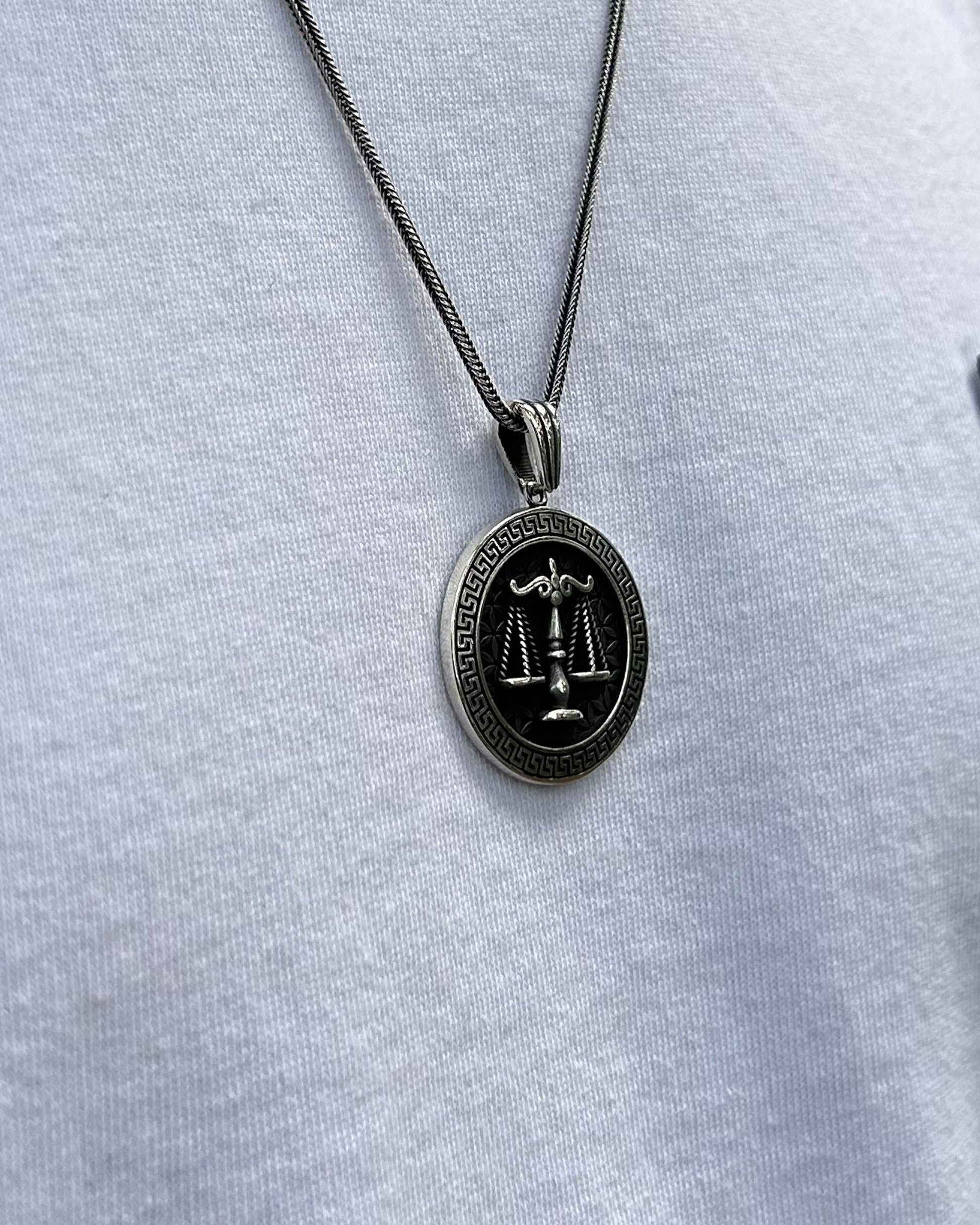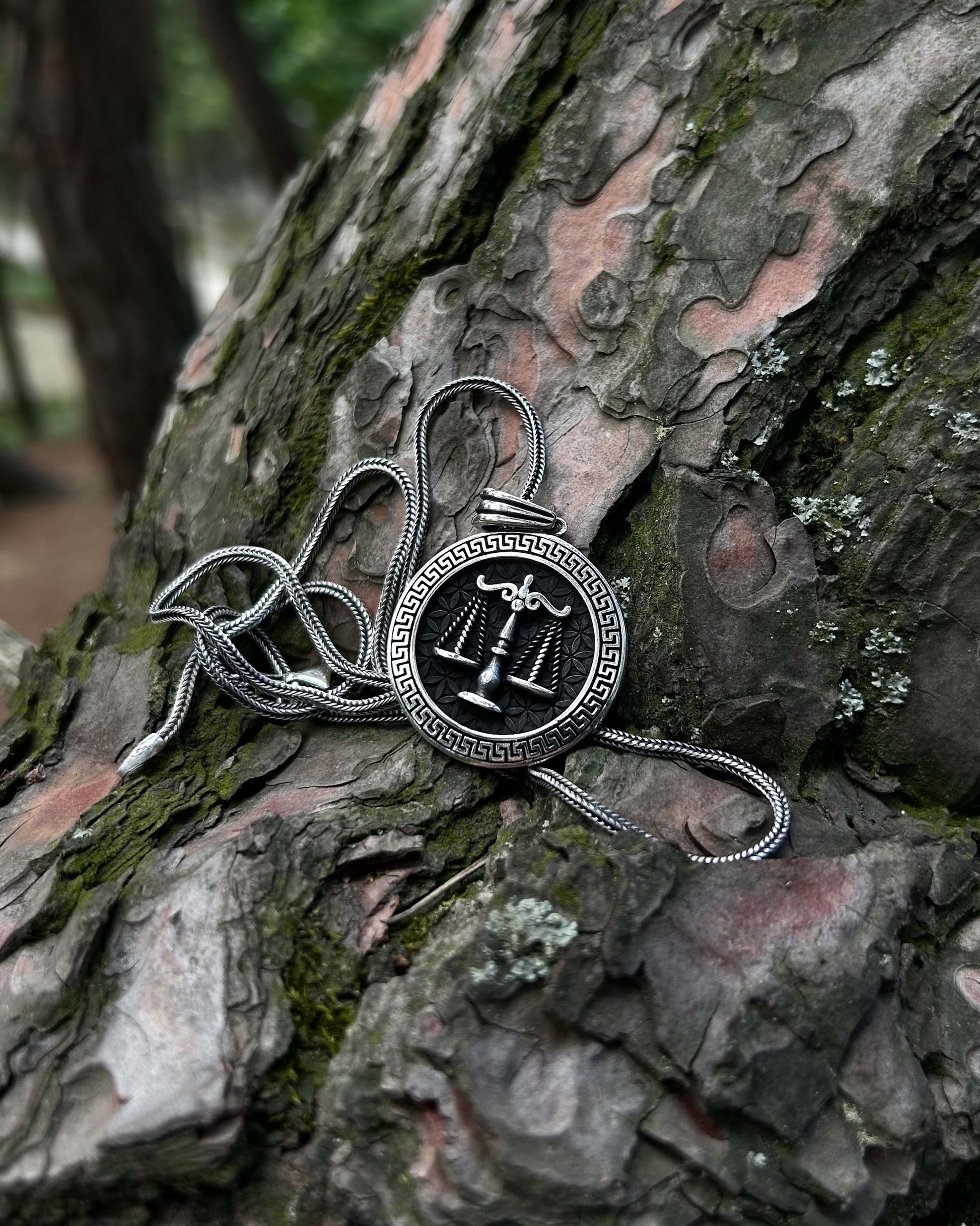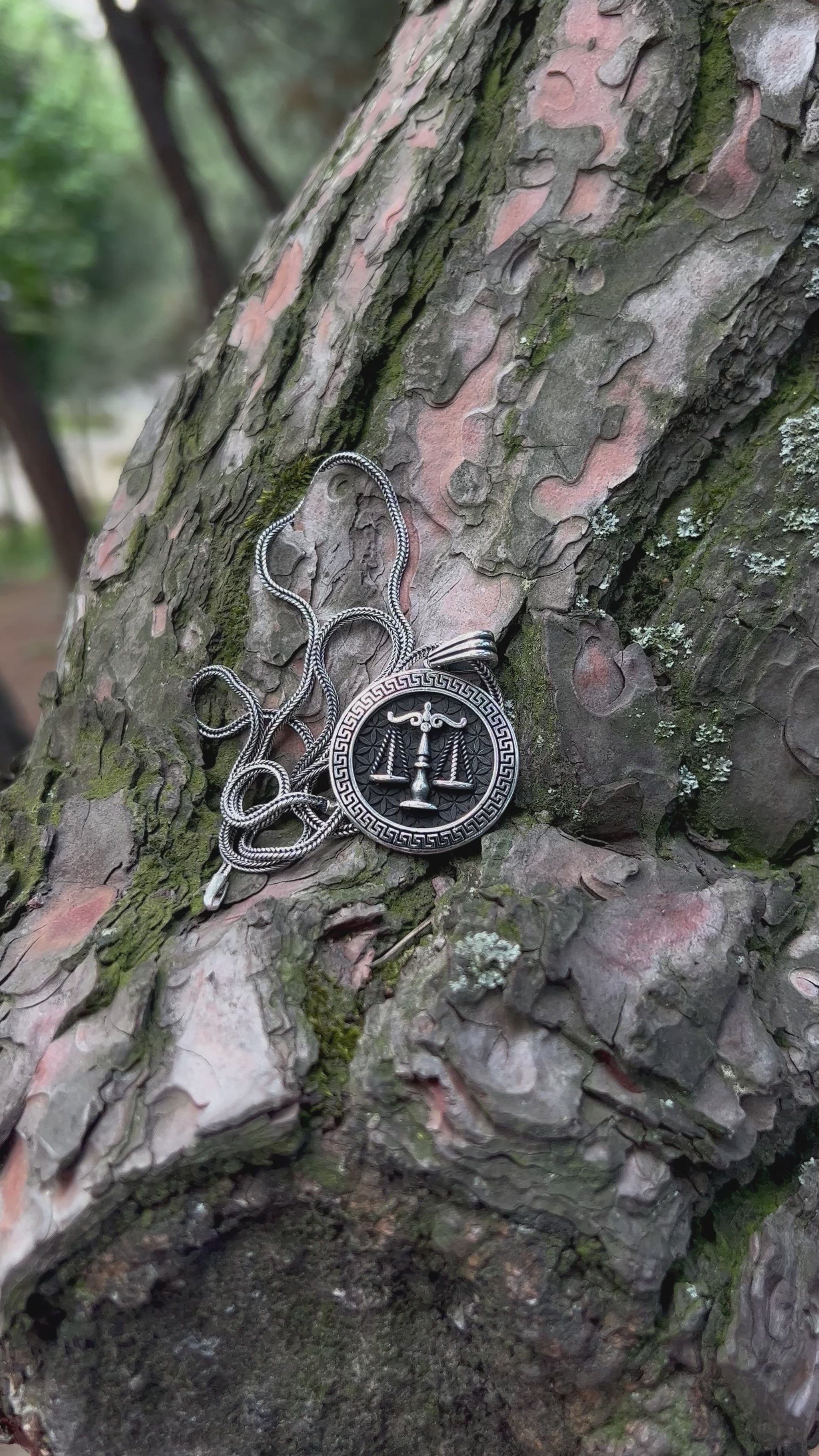 Bu 925 ayar gümüşten el yapımı madalyon kolye, adaleti, dengeyi ve tarafsızlığı simgeler. Avukatlar, hukukçular veya adalet kavramına bağlılık duyan herkes için anlamlı bir sembol taşır.