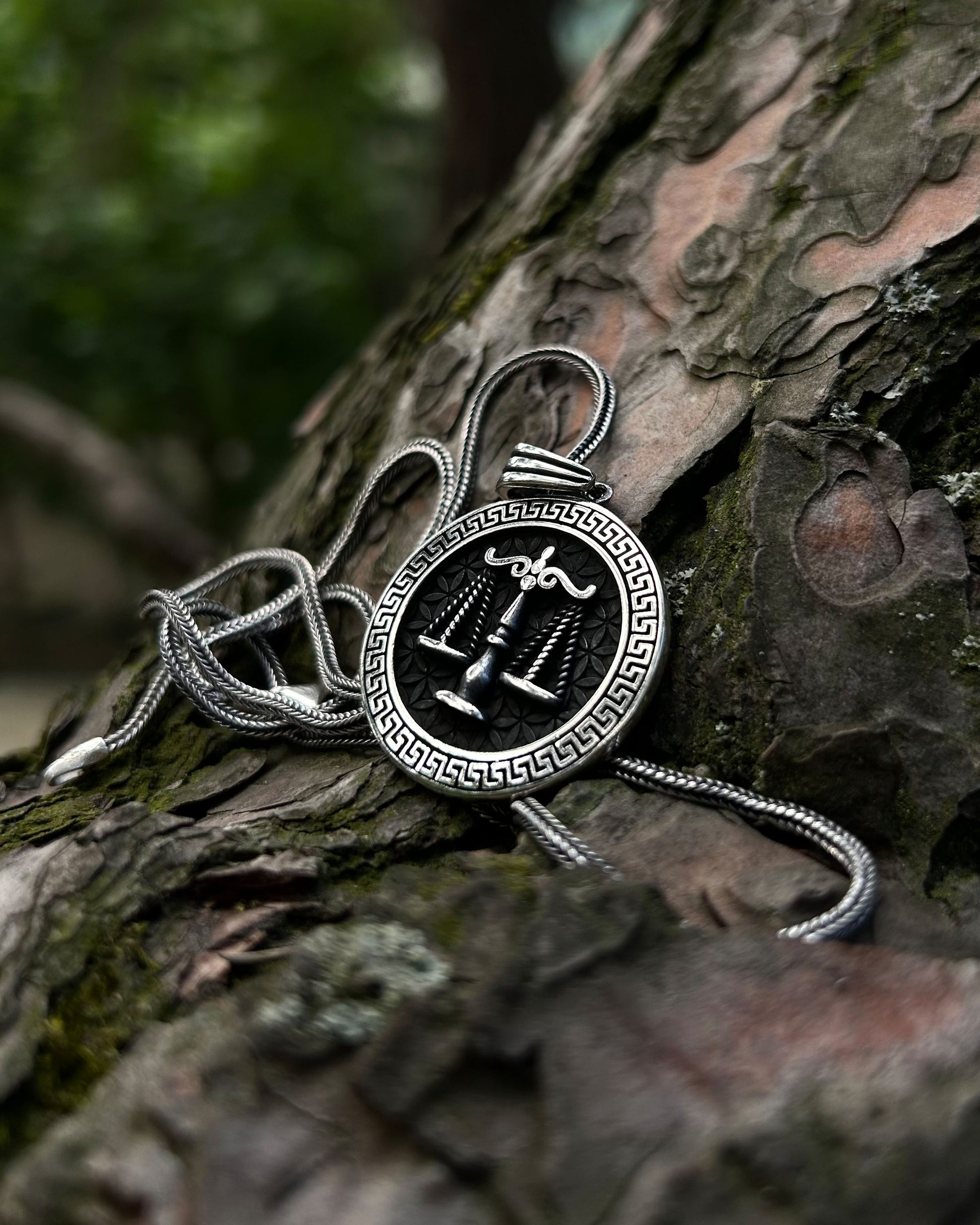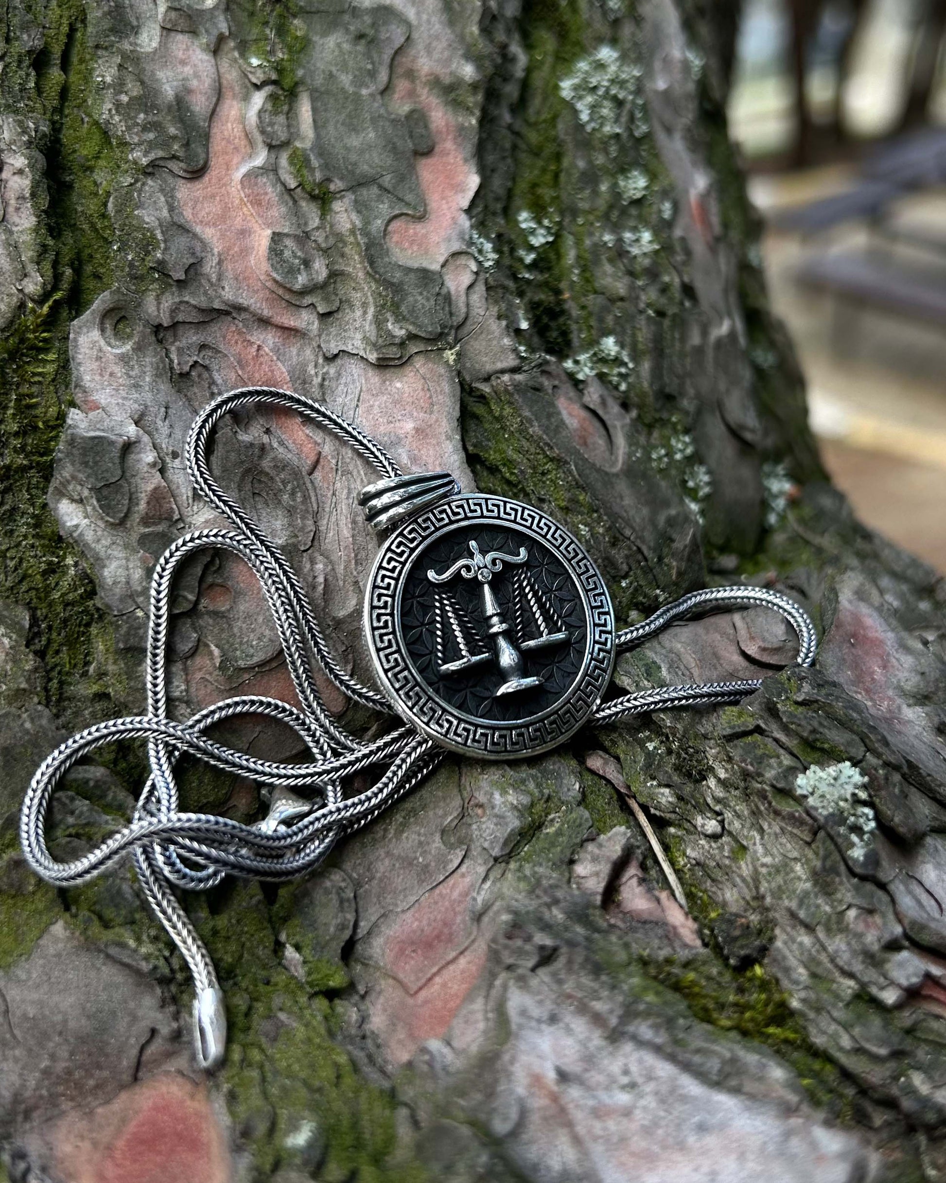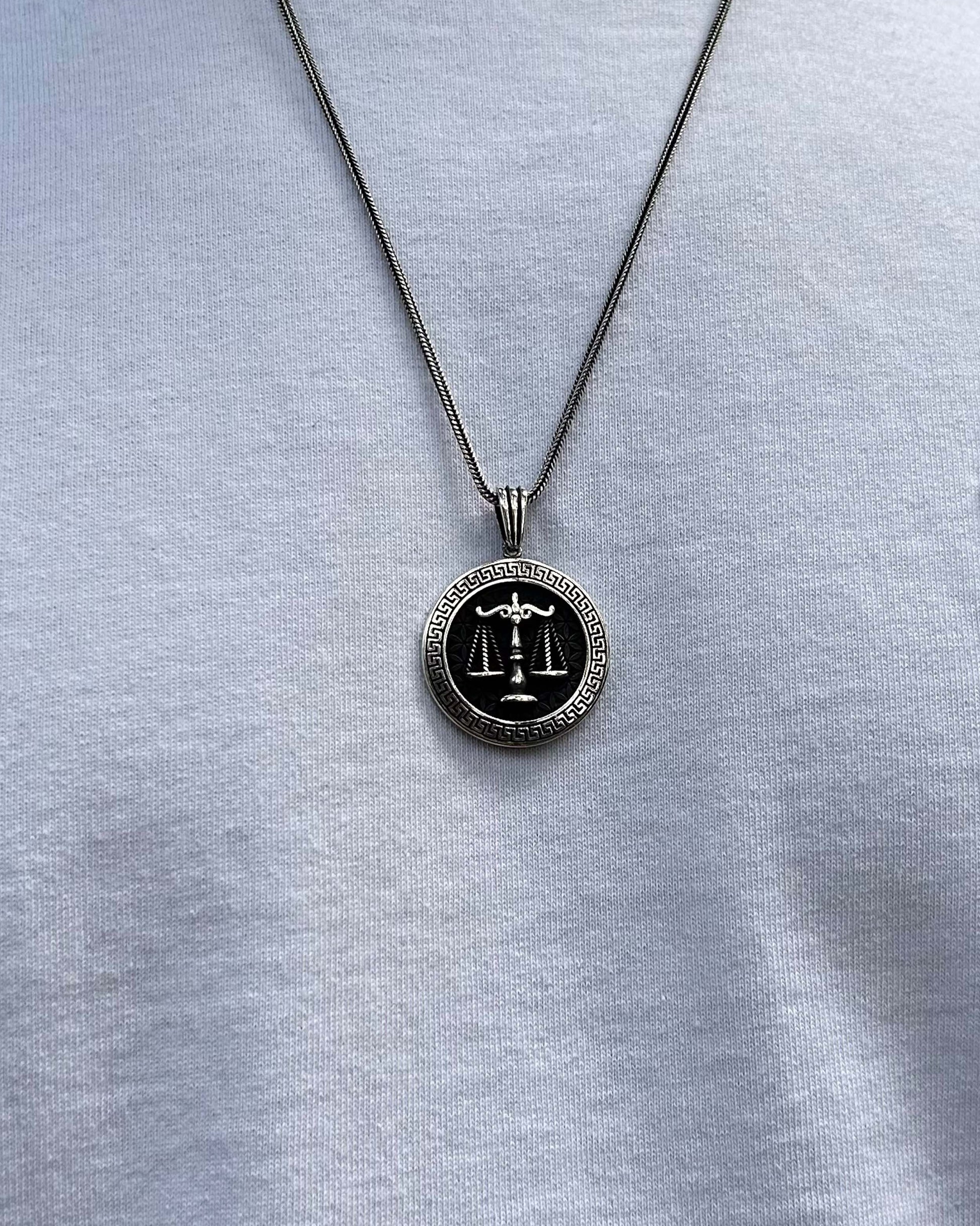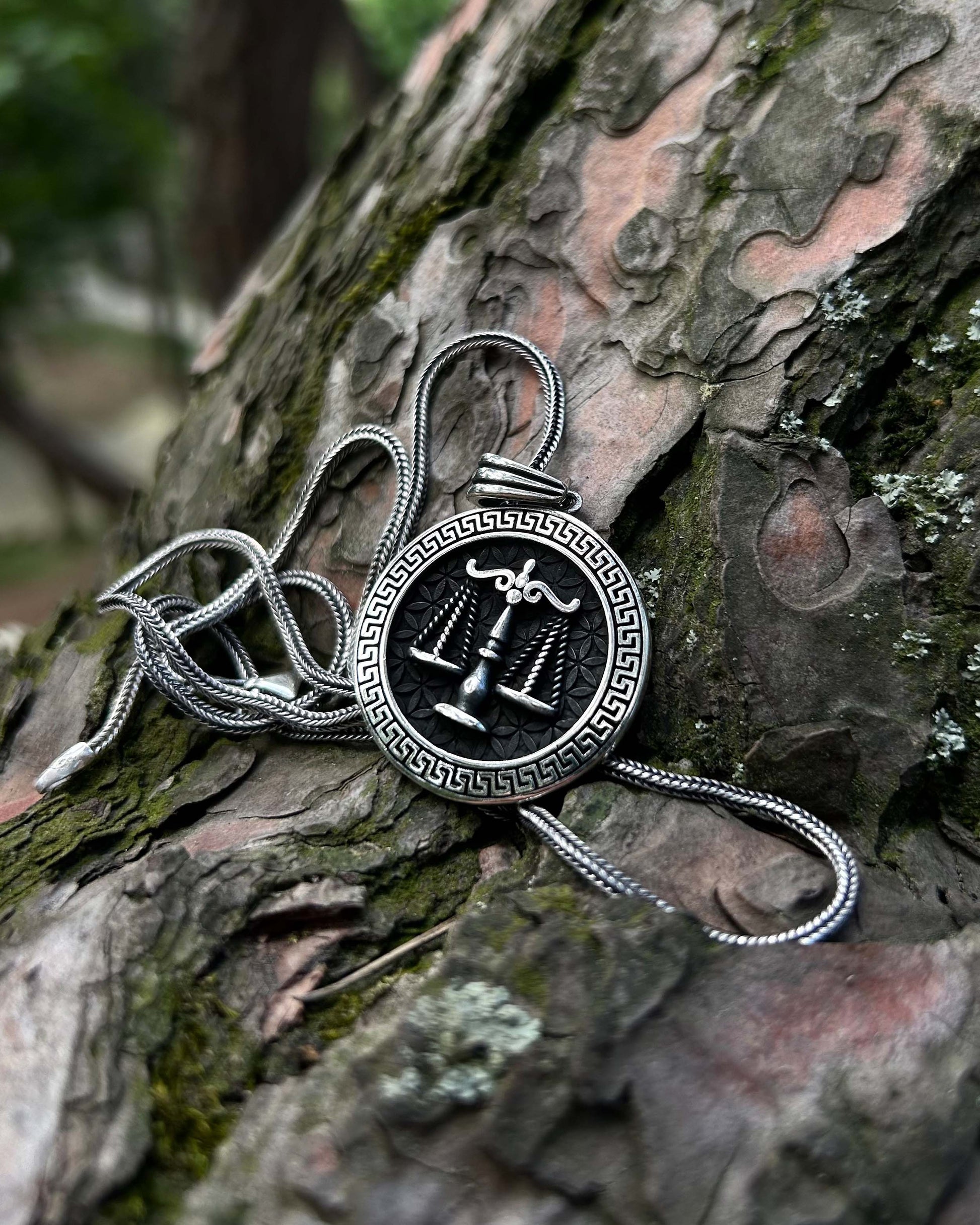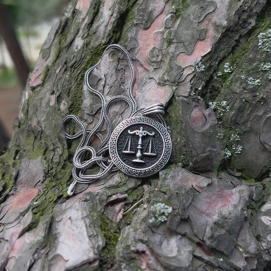 Bu 925 ayar gümüşten el yapımı madalyon kolye, adaleti, dengeyi ve tarafsızlığı simgeler. Avukatlar, hukukçular veya adalet kavramına bağlılık duyan herkes için anlamlı bir sembol taşır.