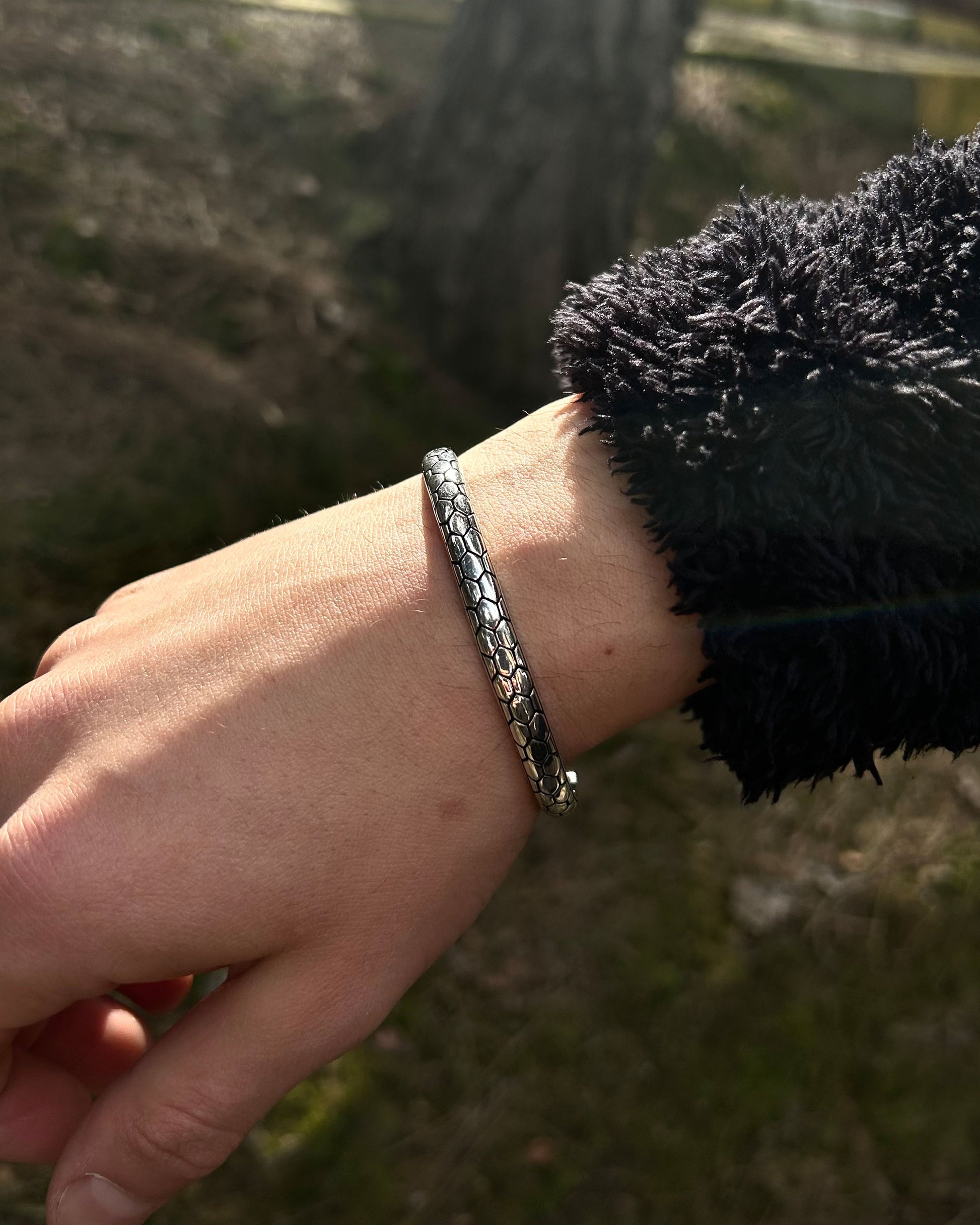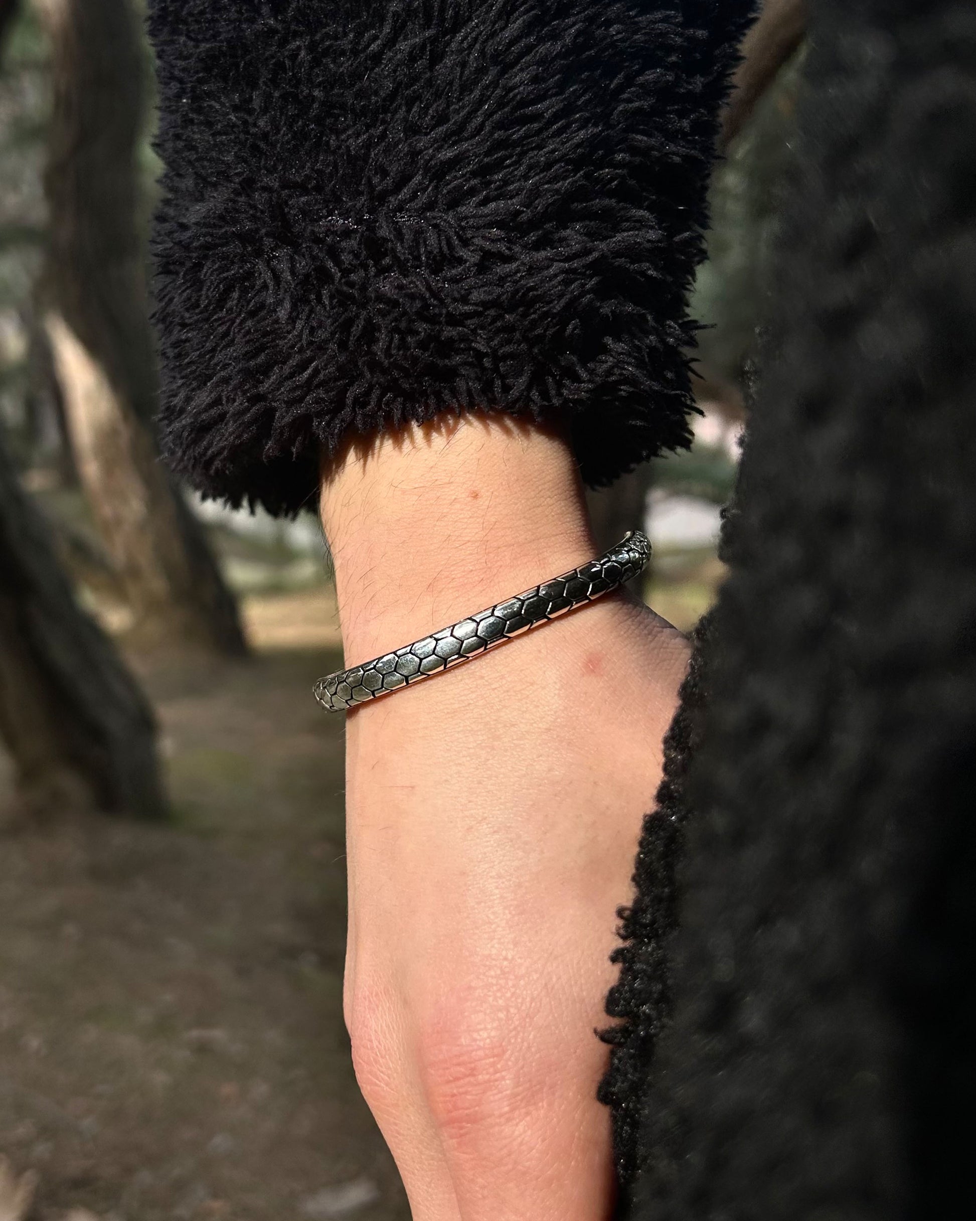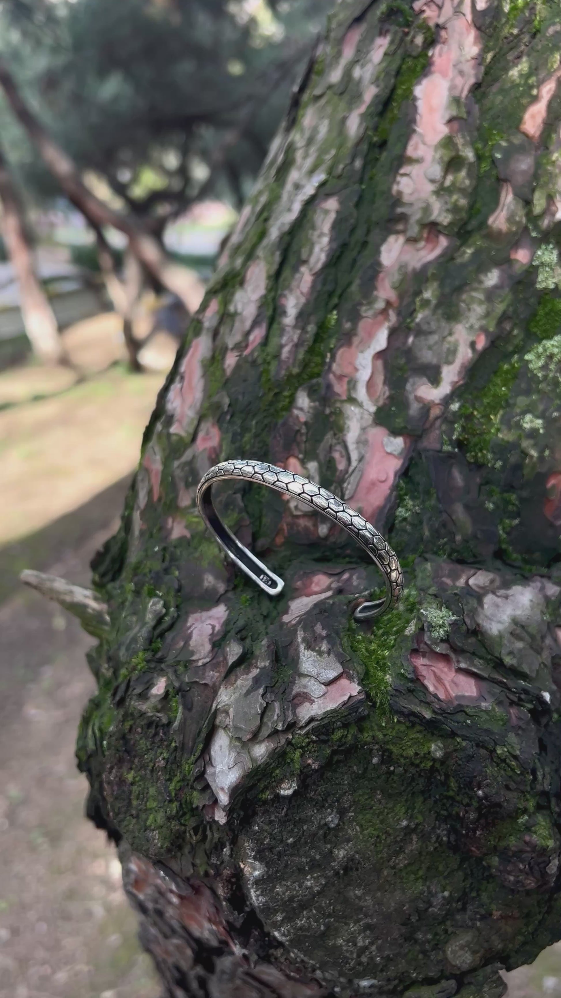 Bu el yapımı kelepçe bileklik, yılan pullarını andıran detaylı dokusuyla doğanın ham güzelliğini yansıtır. 925 ayar gümüşten üretilmiş, ayarlanabilir yapısıyla konforlu bir deneyim sunar.