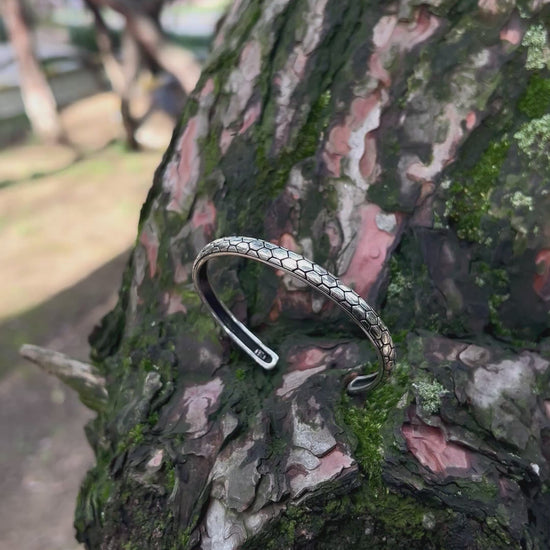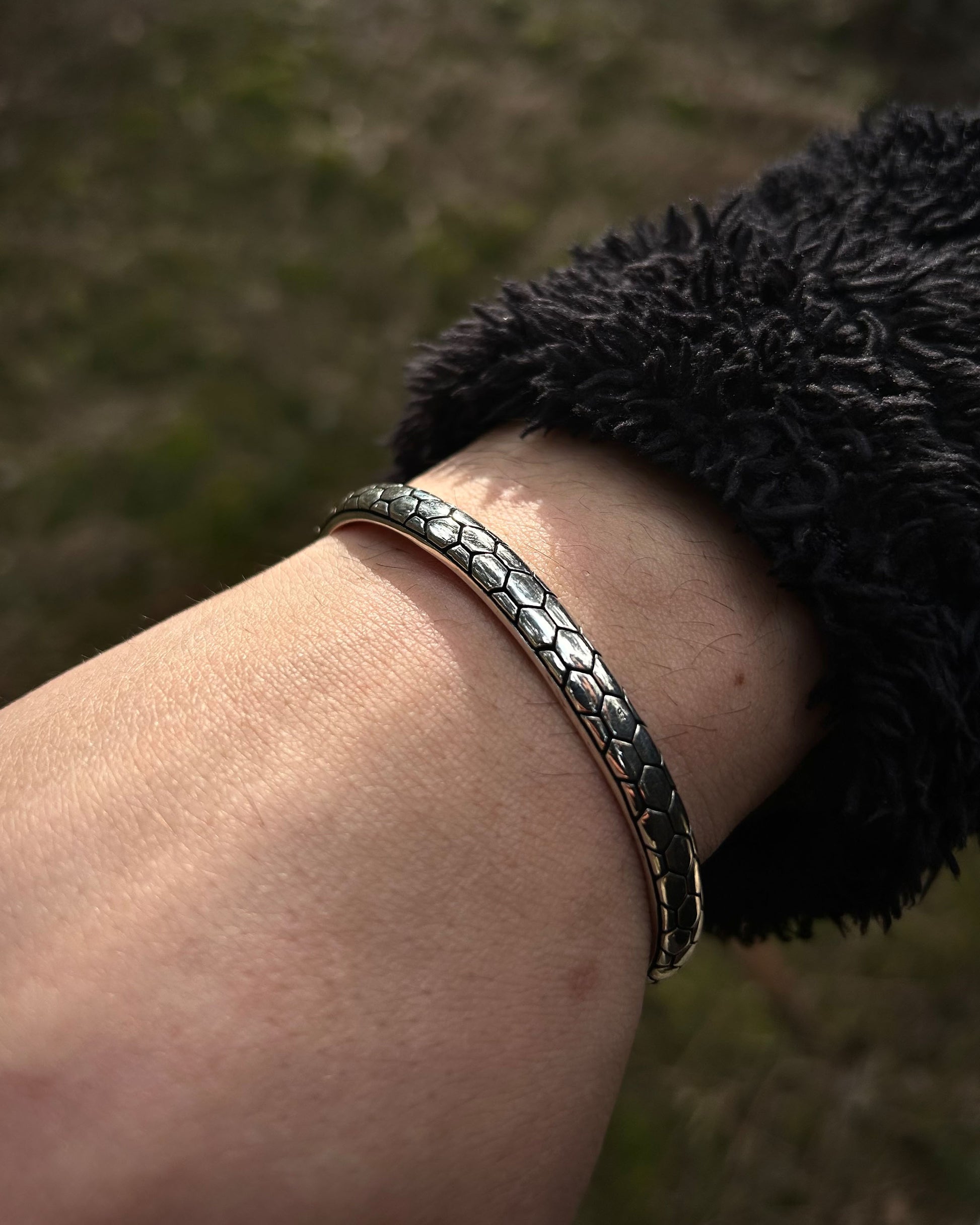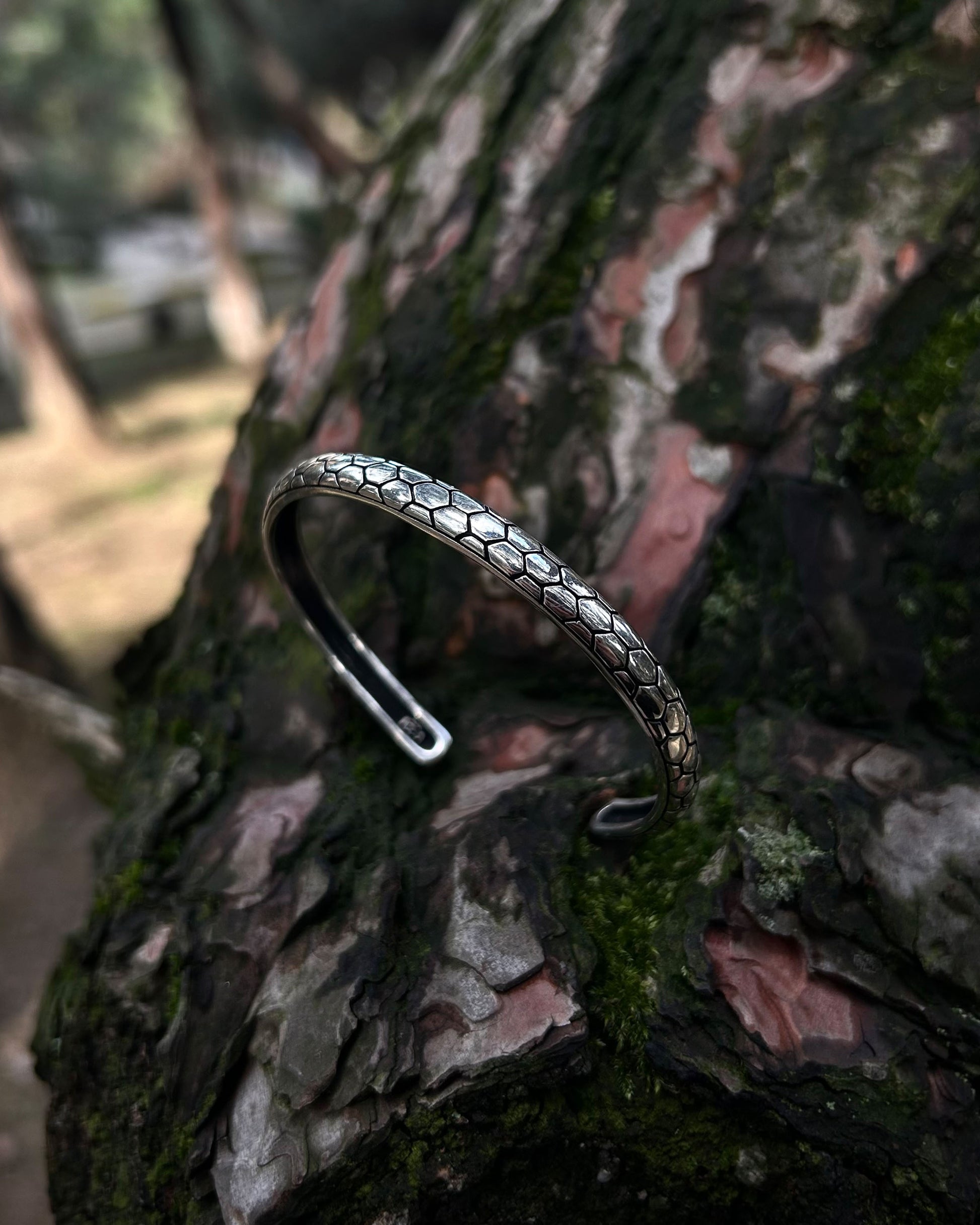 Bu el yapımı kelepçe bileklik, yılan pullarını andıran detaylı dokusuyla doğanın ham güzelliğini yansıtır. 925 ayar gümüşten üretilmiş, ayarlanabilir yapısıyla konforlu bir deneyim sunar.