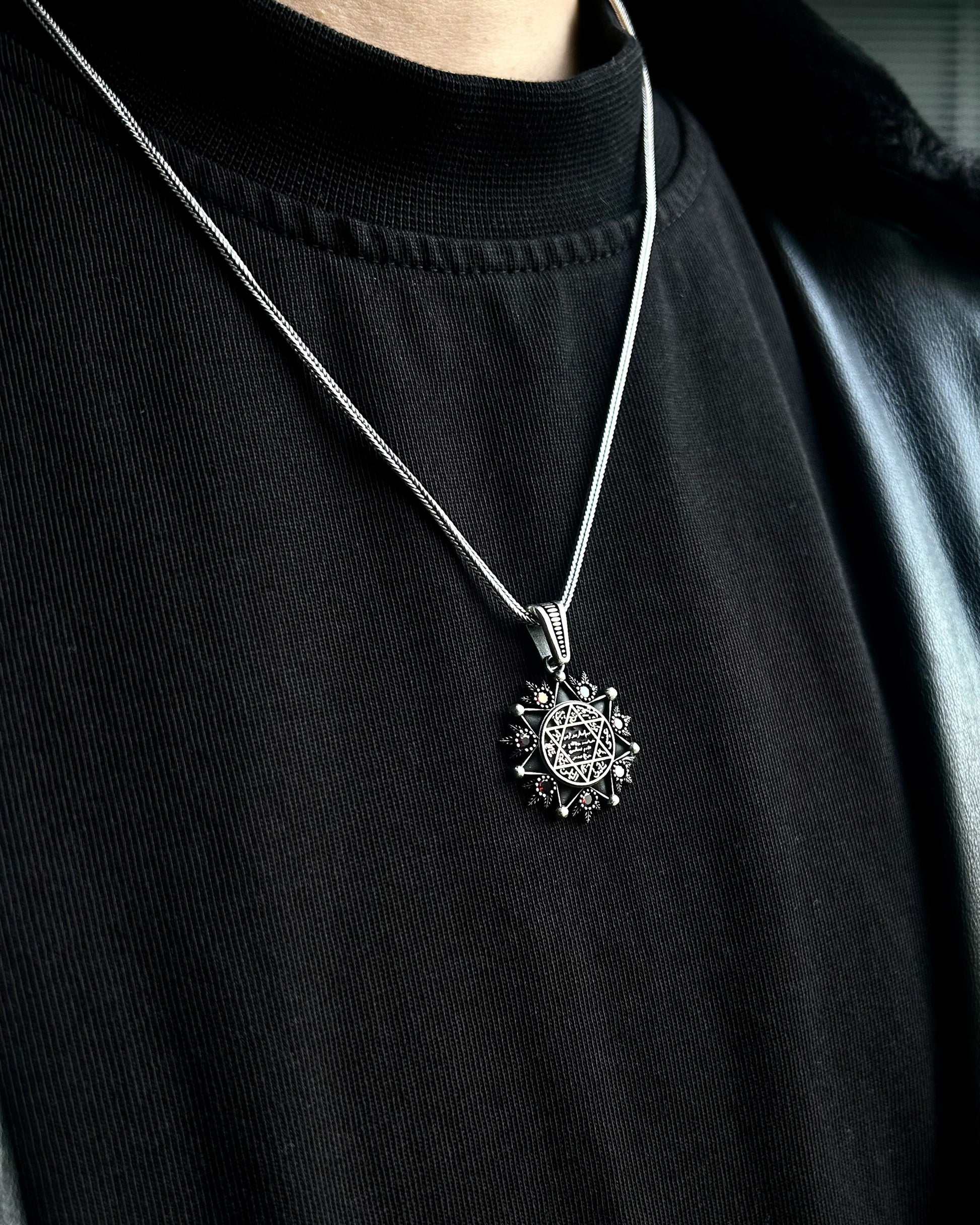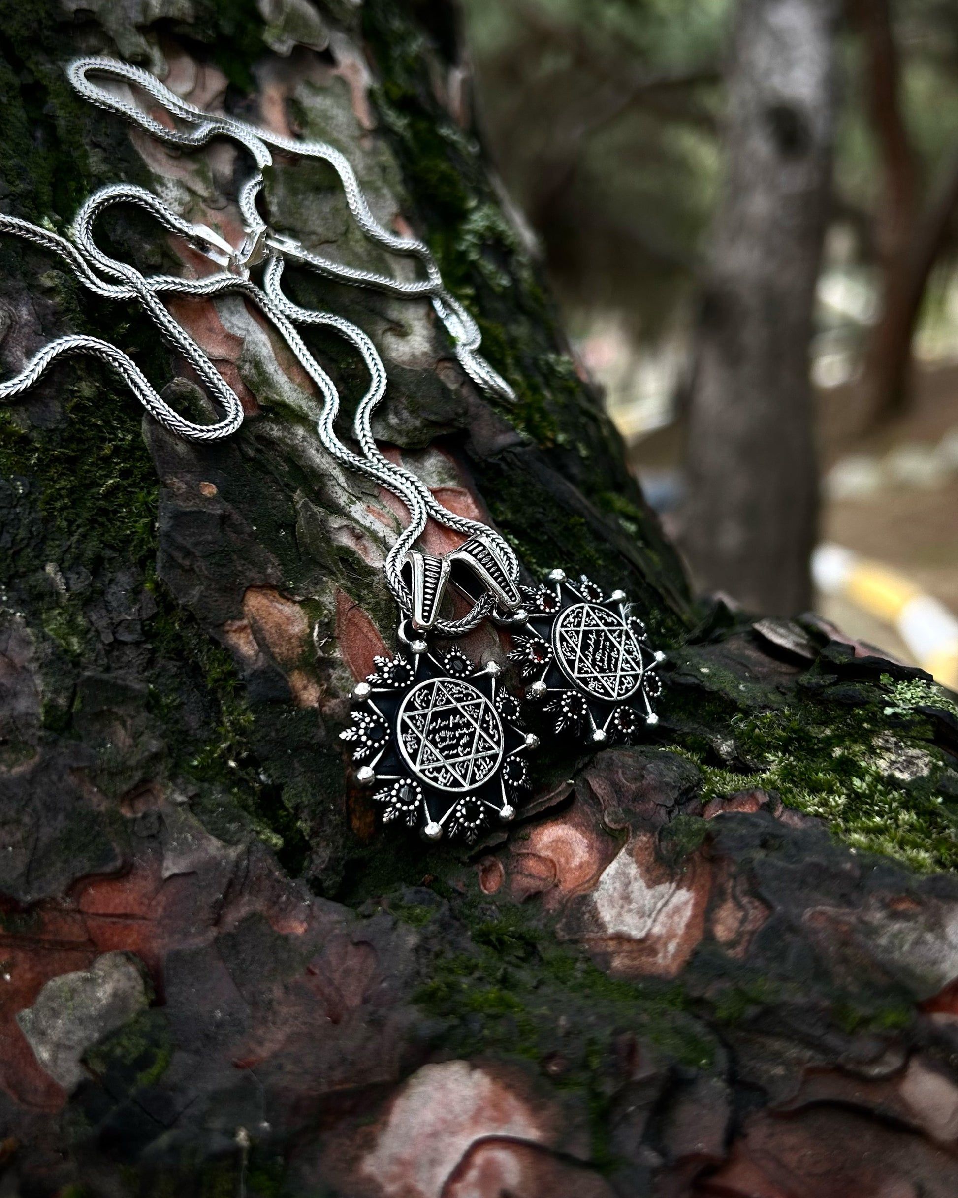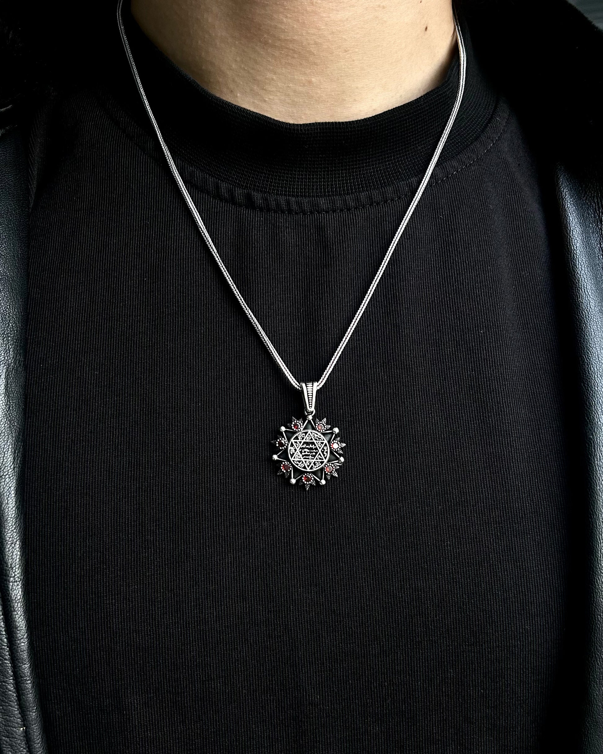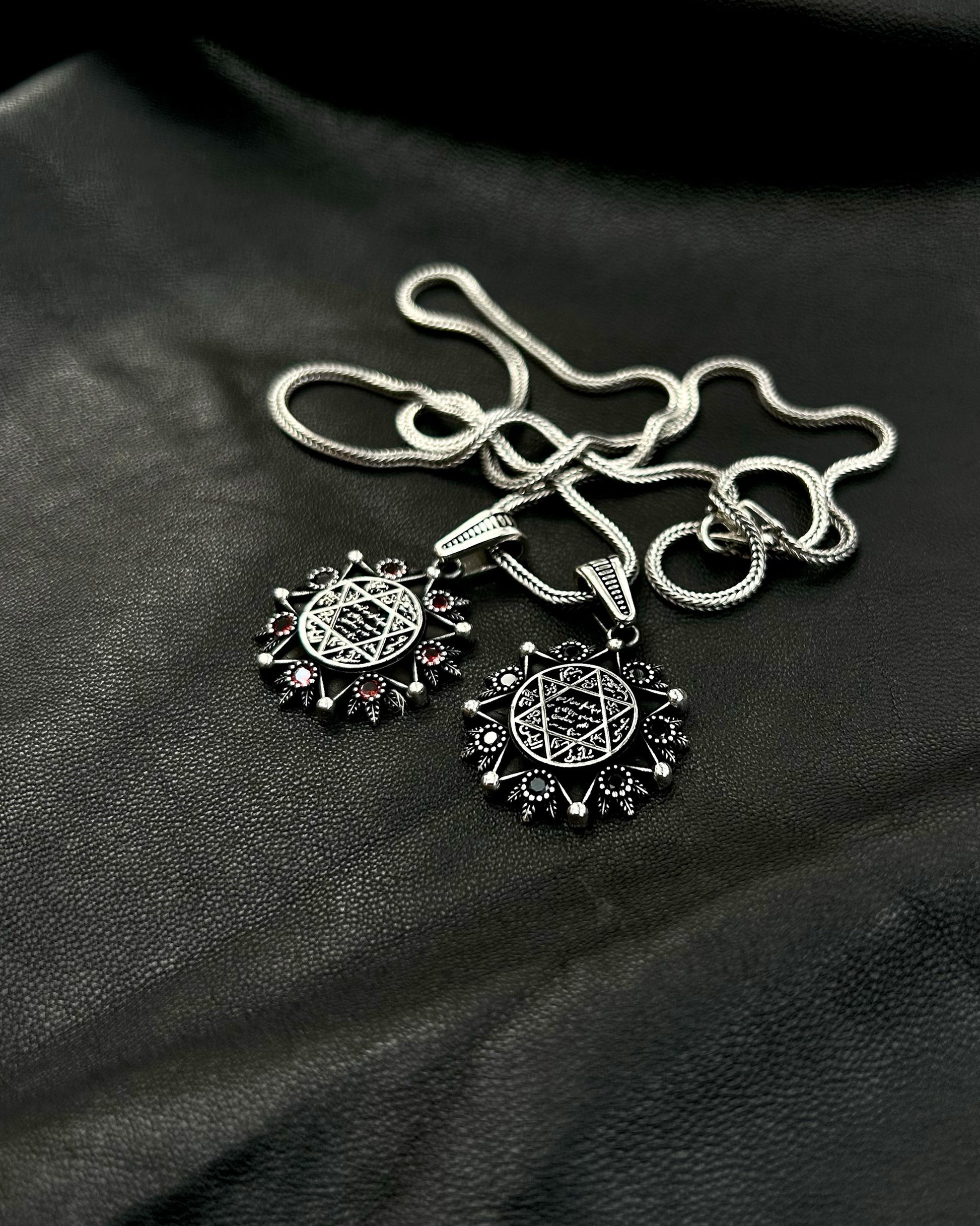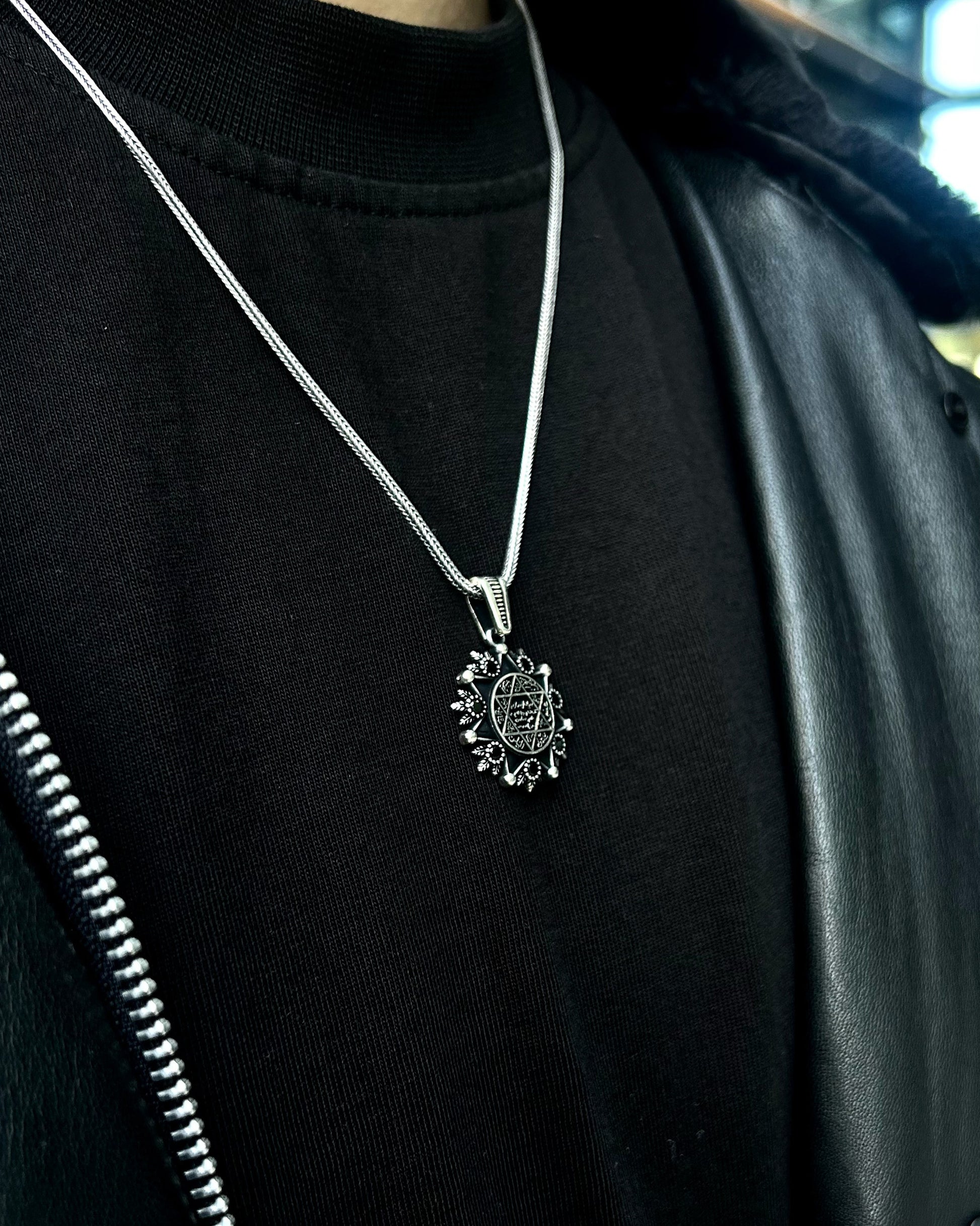 ▶ Süleyman Mührü'nün kadim gücü, bu modern tasarımda parlayan bir yıldız formunda hayat buluyor. 925 ayar gümüş üzerine işlenen bu zarif tılsım, merkezdeki koruyucu enerjiyi sekiz yöne yayan ilahi bir kalkanı simgeler. Net hatları ve detaylı işçiliğiyle bu kolye, stilinize hem güçlü bir manevi koruma hem de karizmatik bir parlaklık katacaktır.