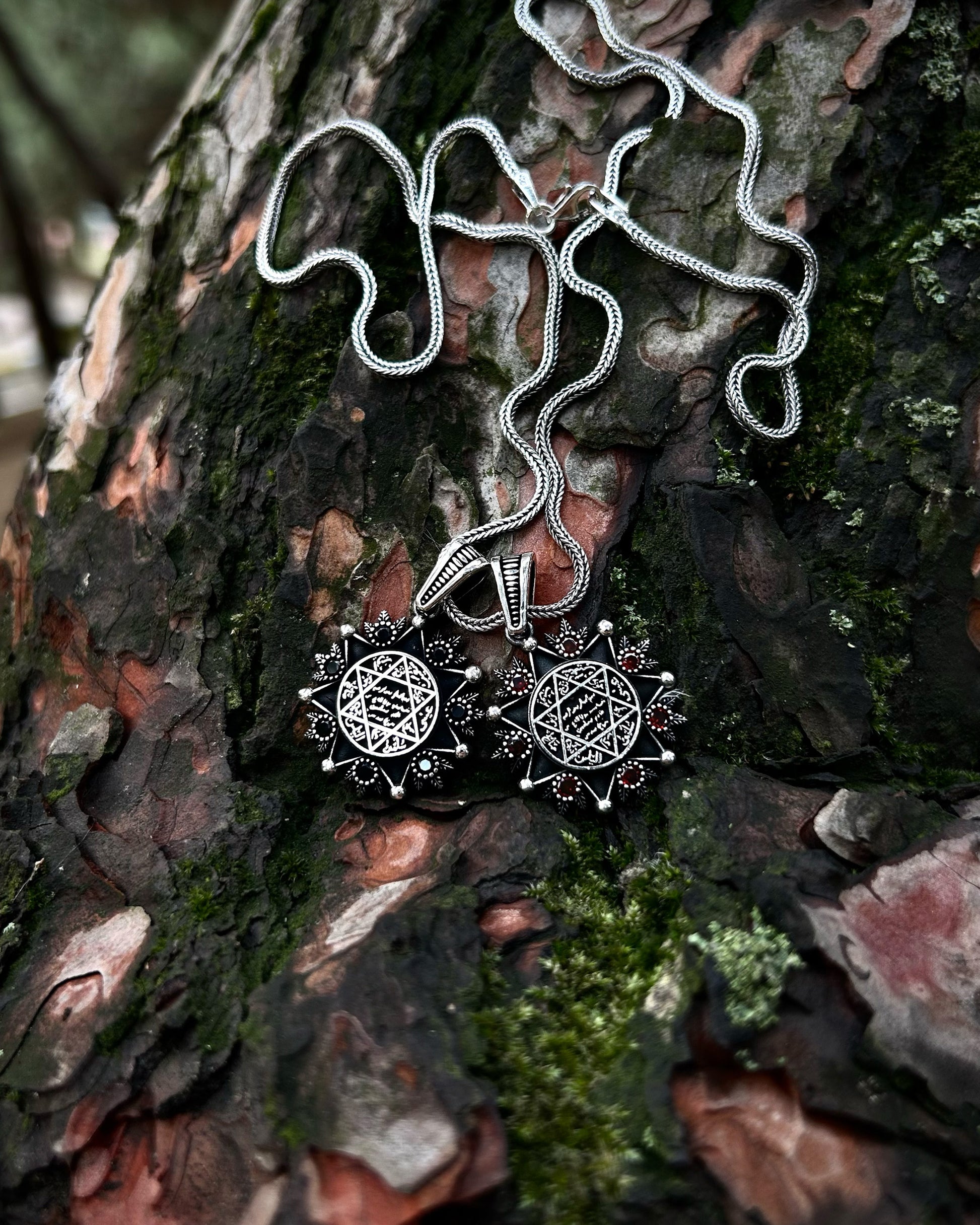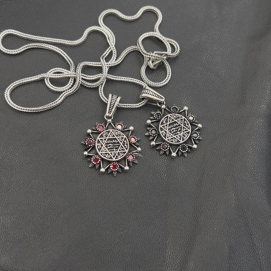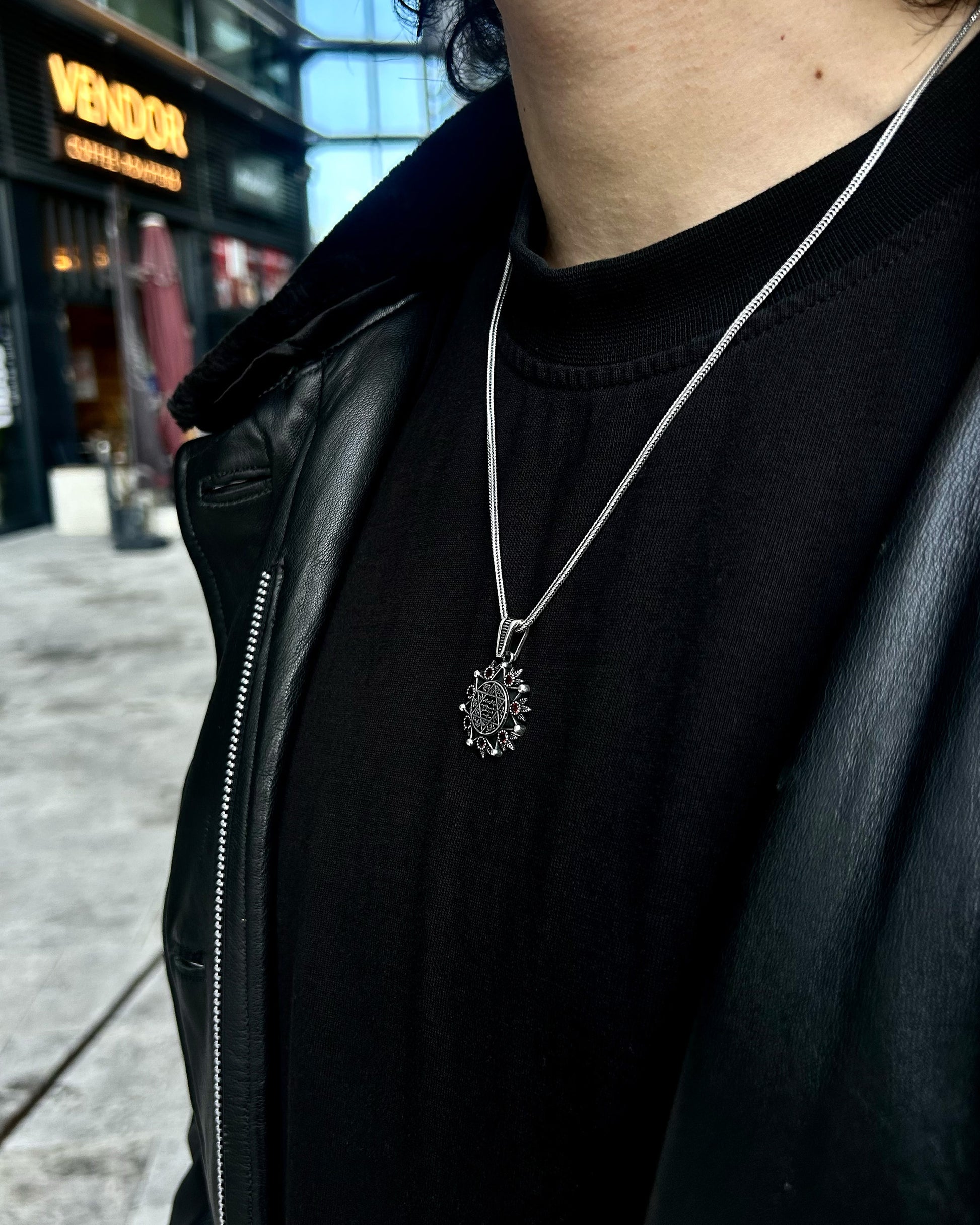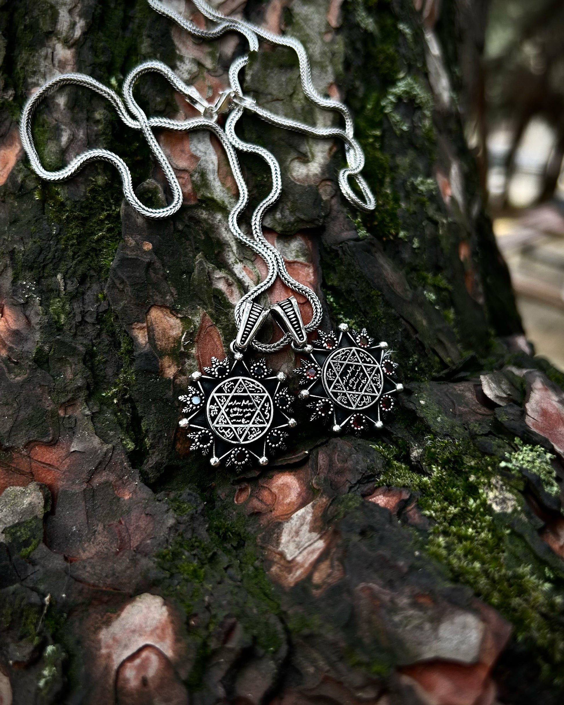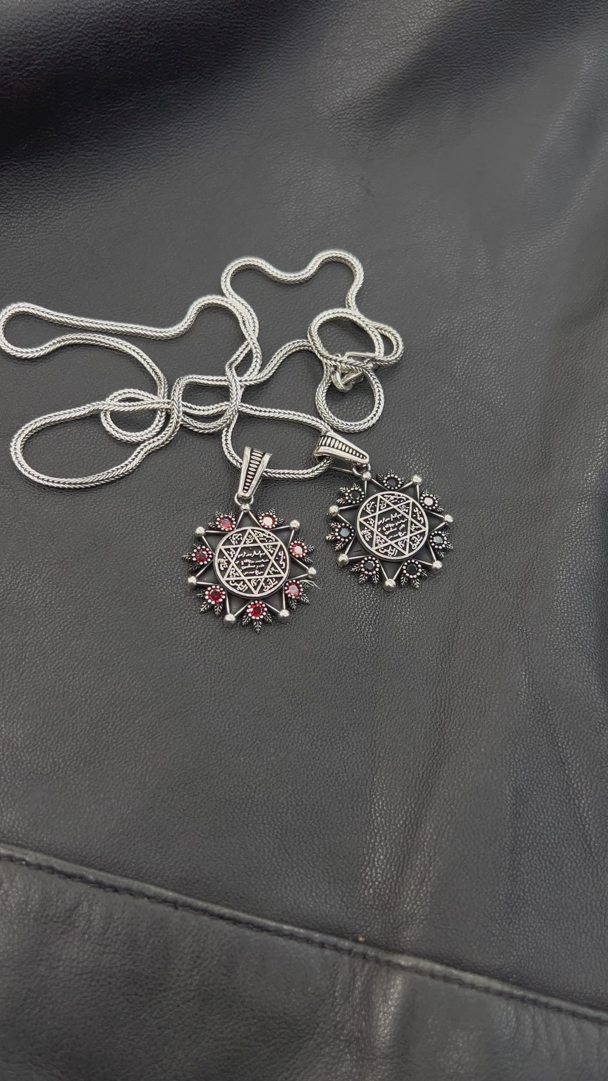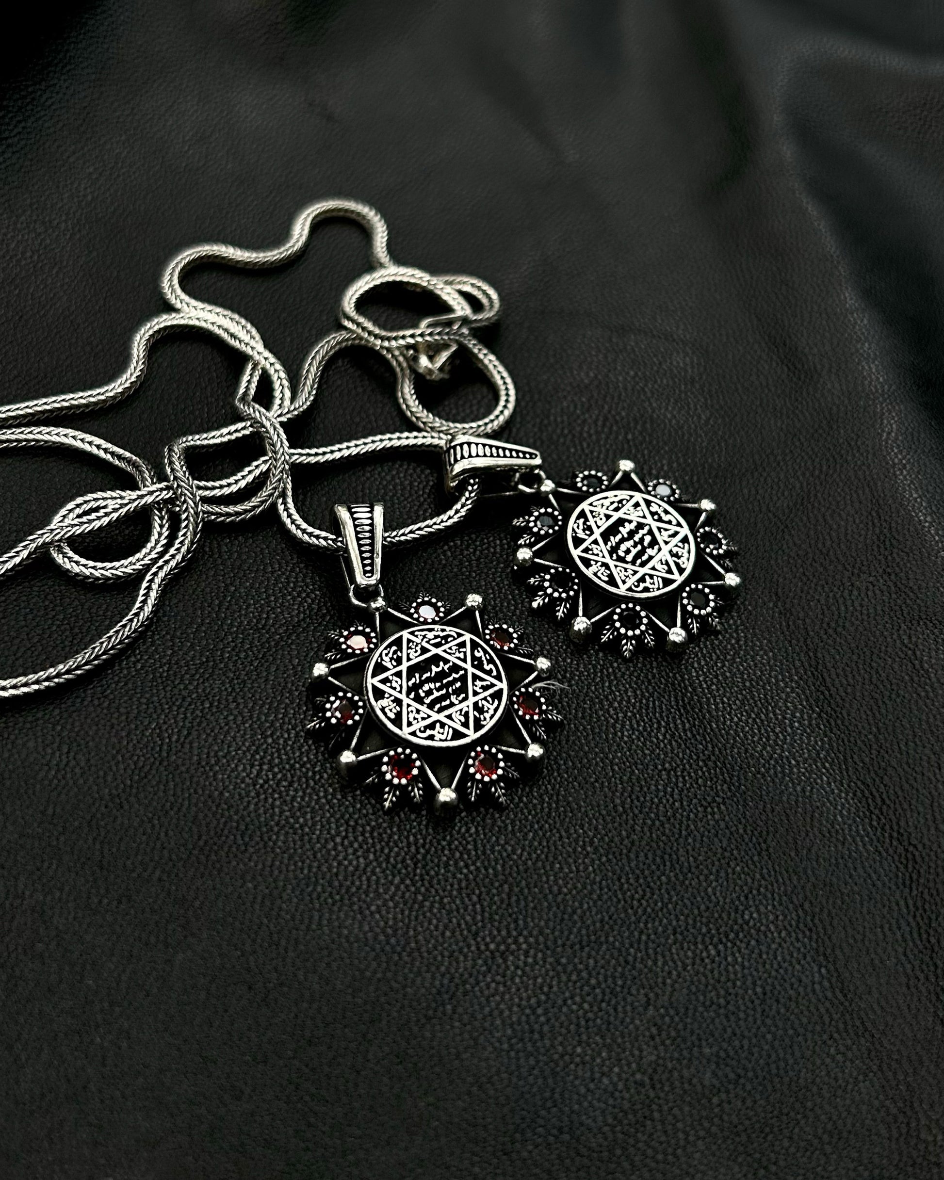 ▶ Süleyman Mührü'nün kadim gücü, bu modern tasarımda parlayan bir yıldız formunda hayat buluyor. 925 ayar gümüş üzerine işlenen bu zarif tılsım, merkezdeki koruyucu enerjiyi sekiz yöne yayan ilahi bir kalkanı simgeler. Net hatları ve detaylı işçiliğiyle bu kolye, stilinize hem güçlü bir manevi koruma hem de karizmatik bir parlaklık katacaktır.