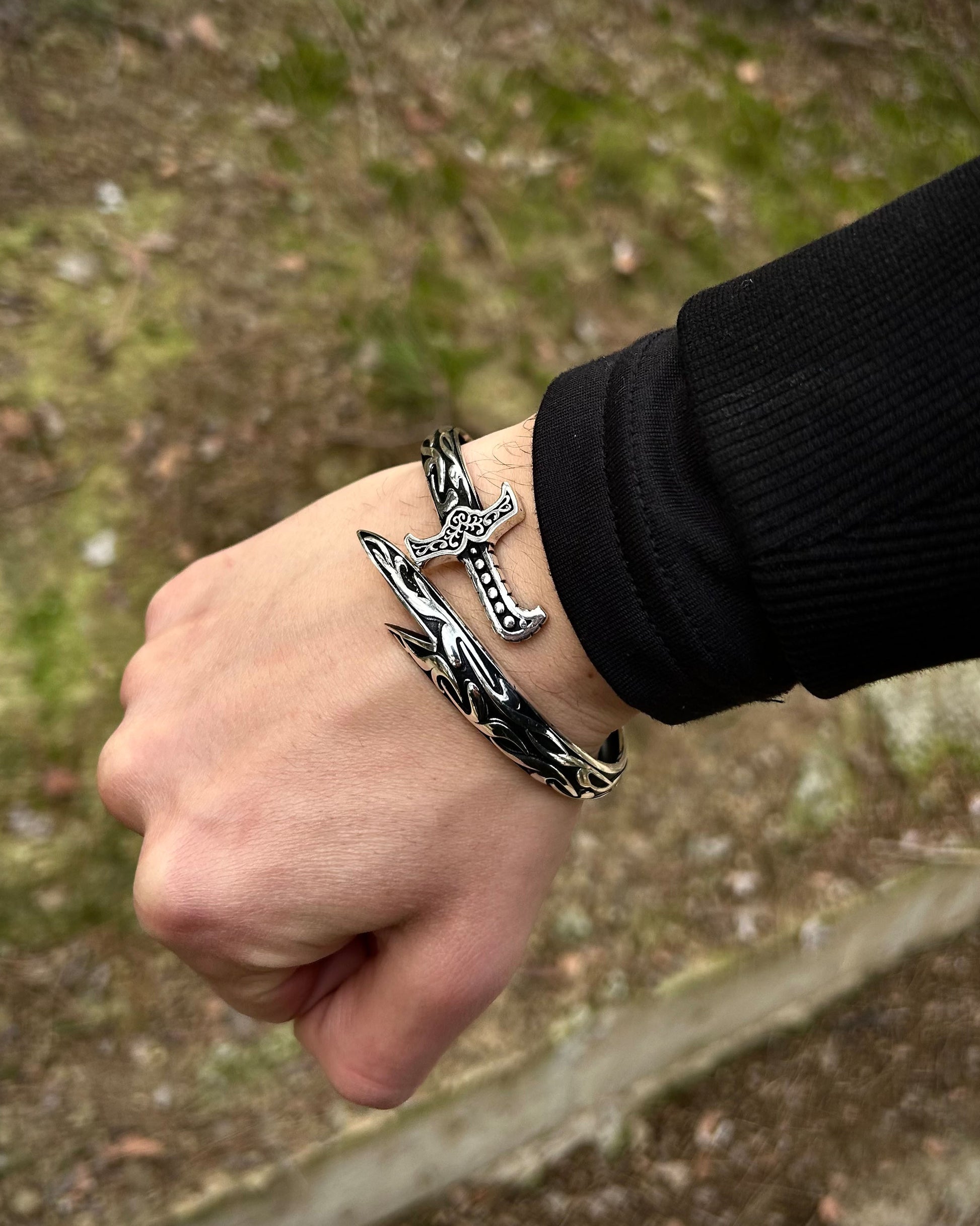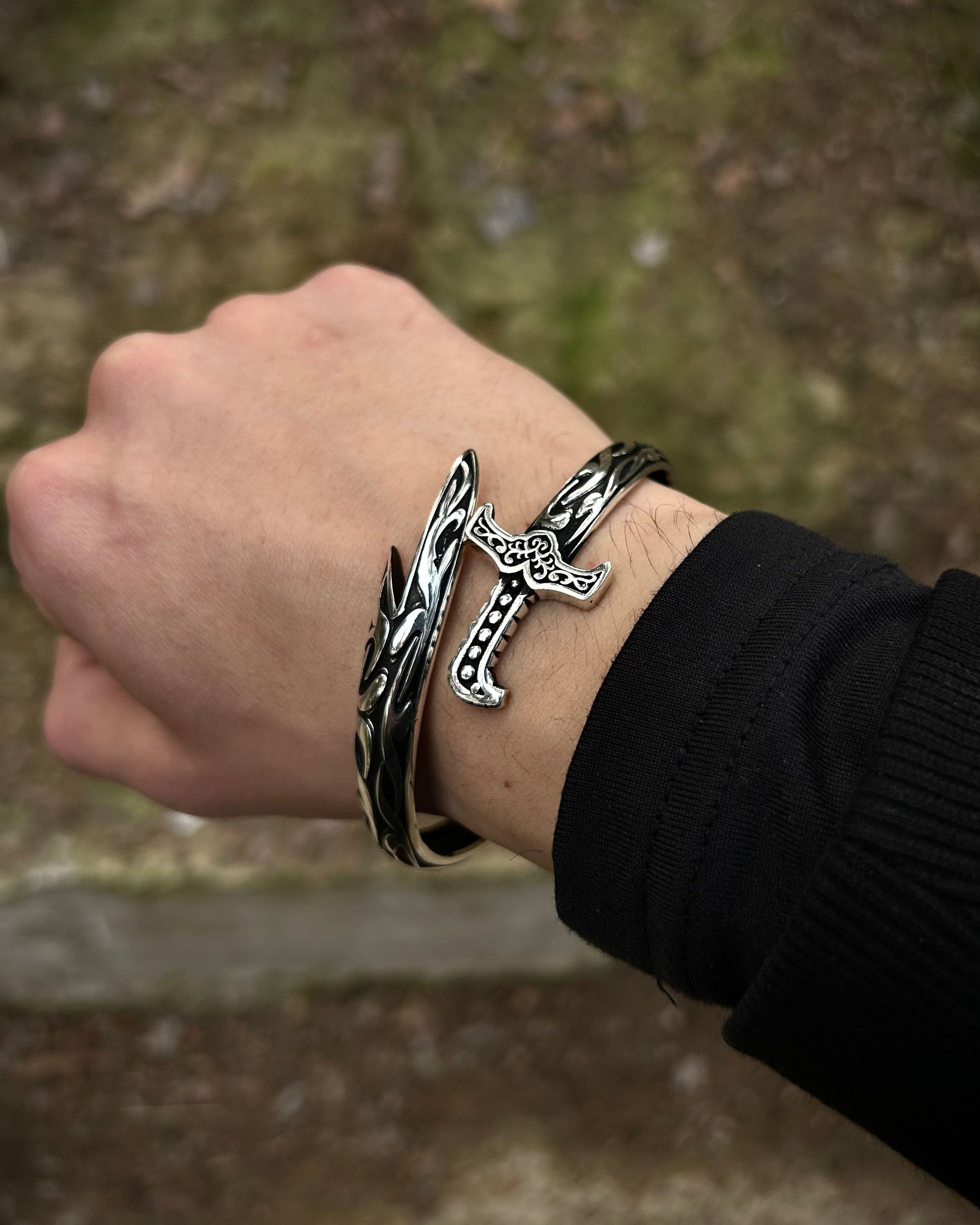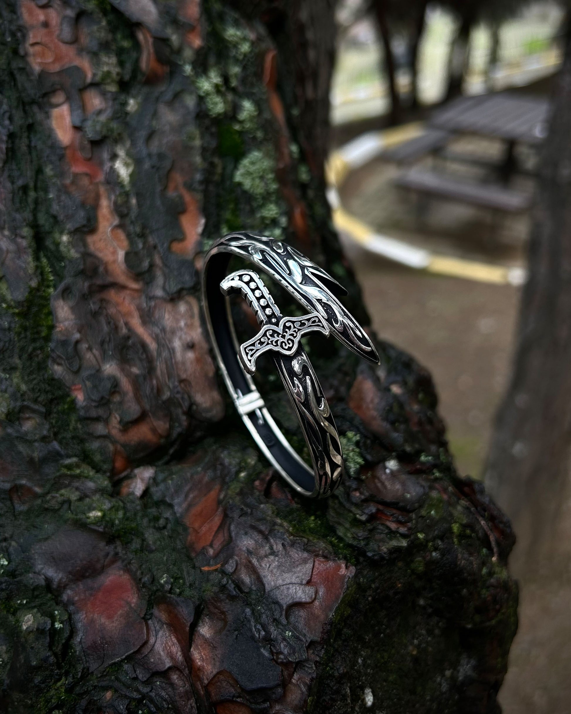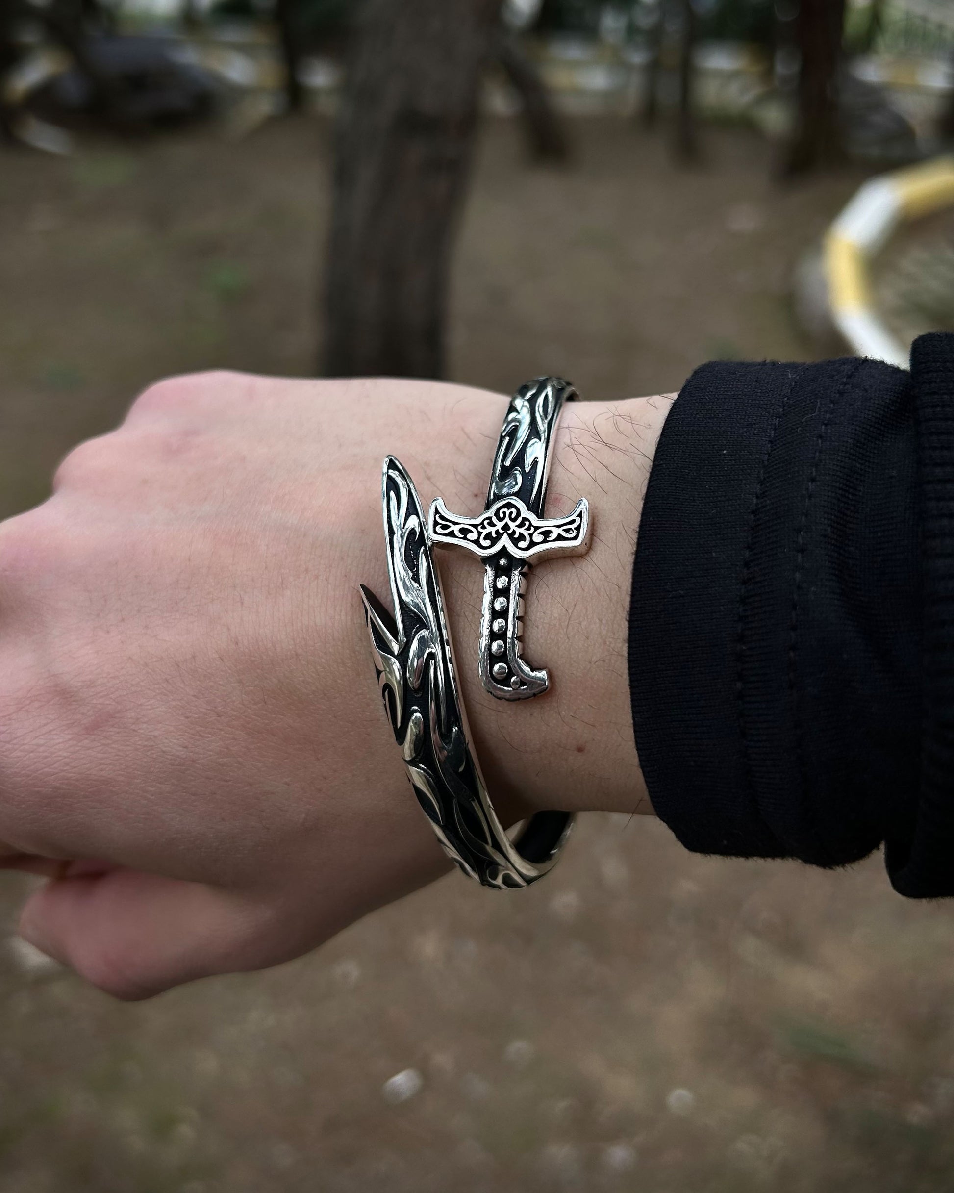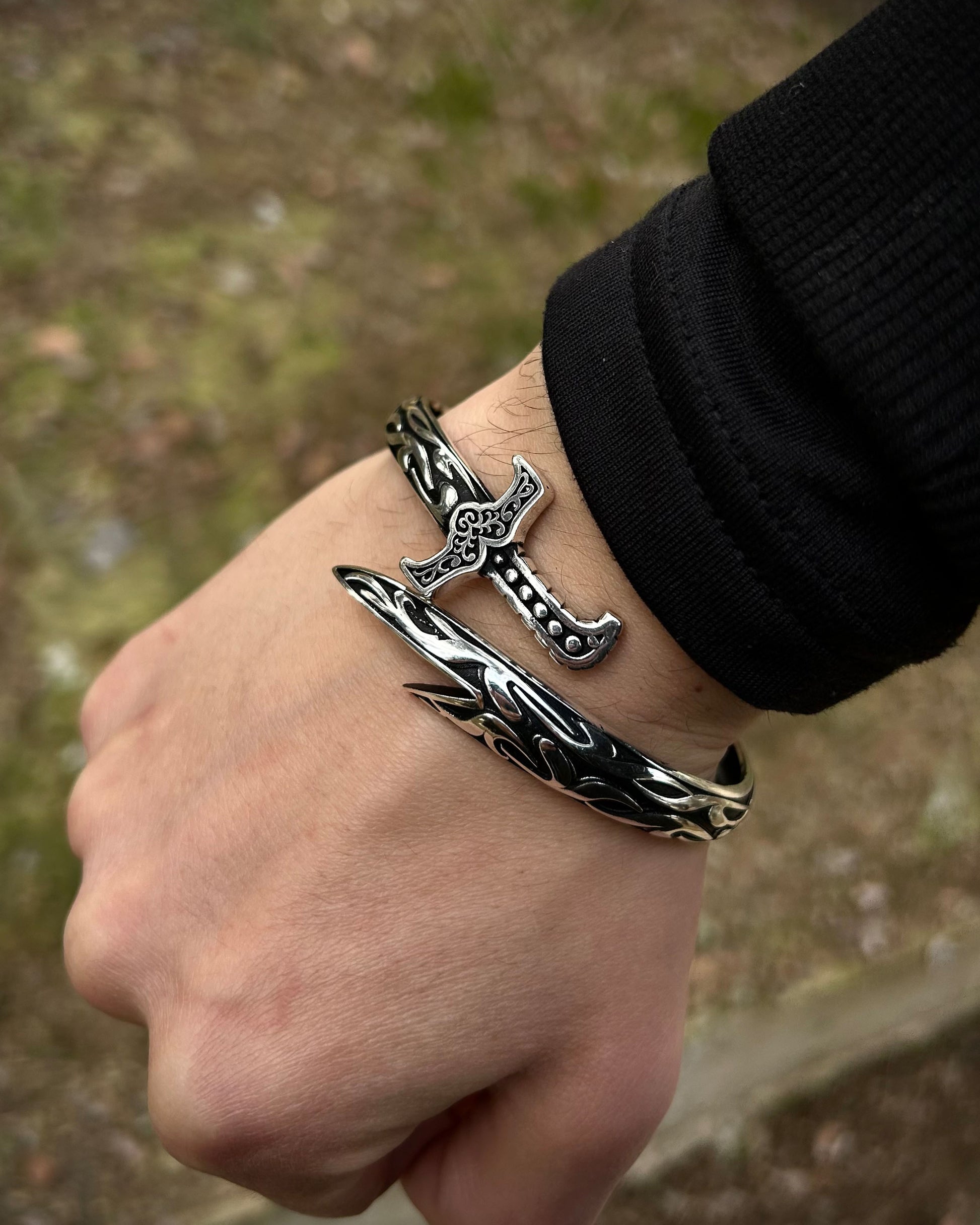 925 ayar gümüşten el işçiliğiyle üretilmiş bu cuff bilezik, oksitli yüzeyi ve kılıç formuyla dikkat çeker. Ayarlanabilir yapısı sayesinde farklı bilek ölçülerine kolayca uyum sağlar.