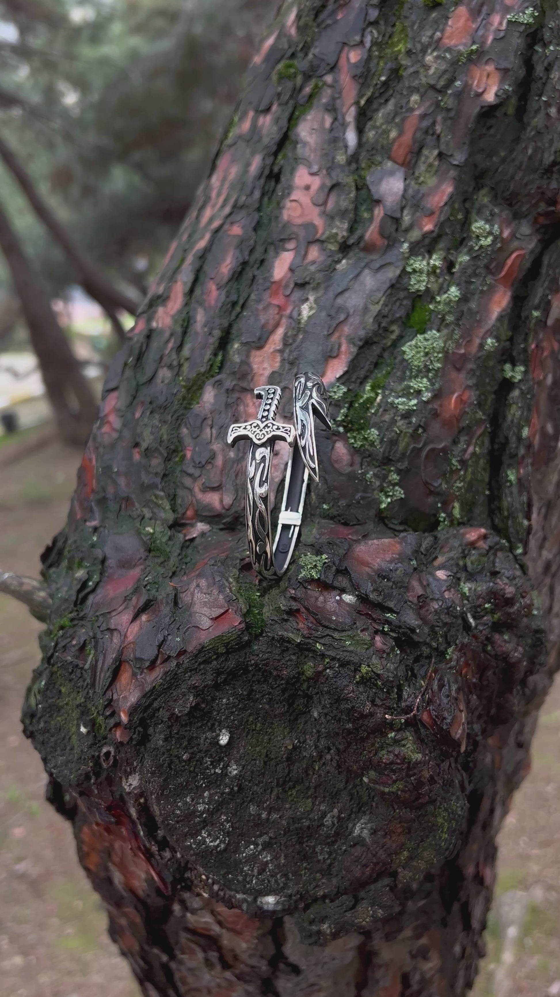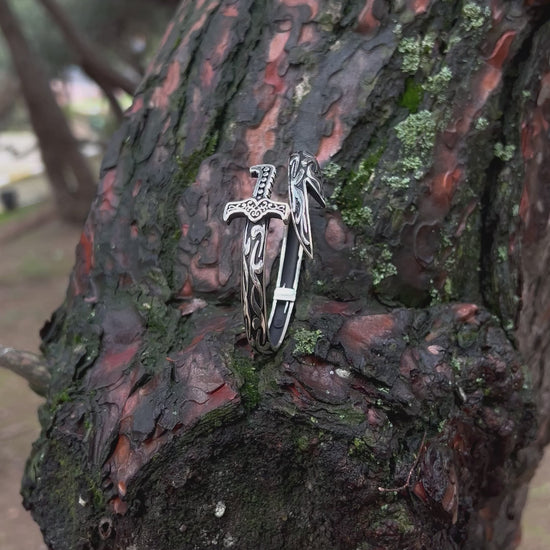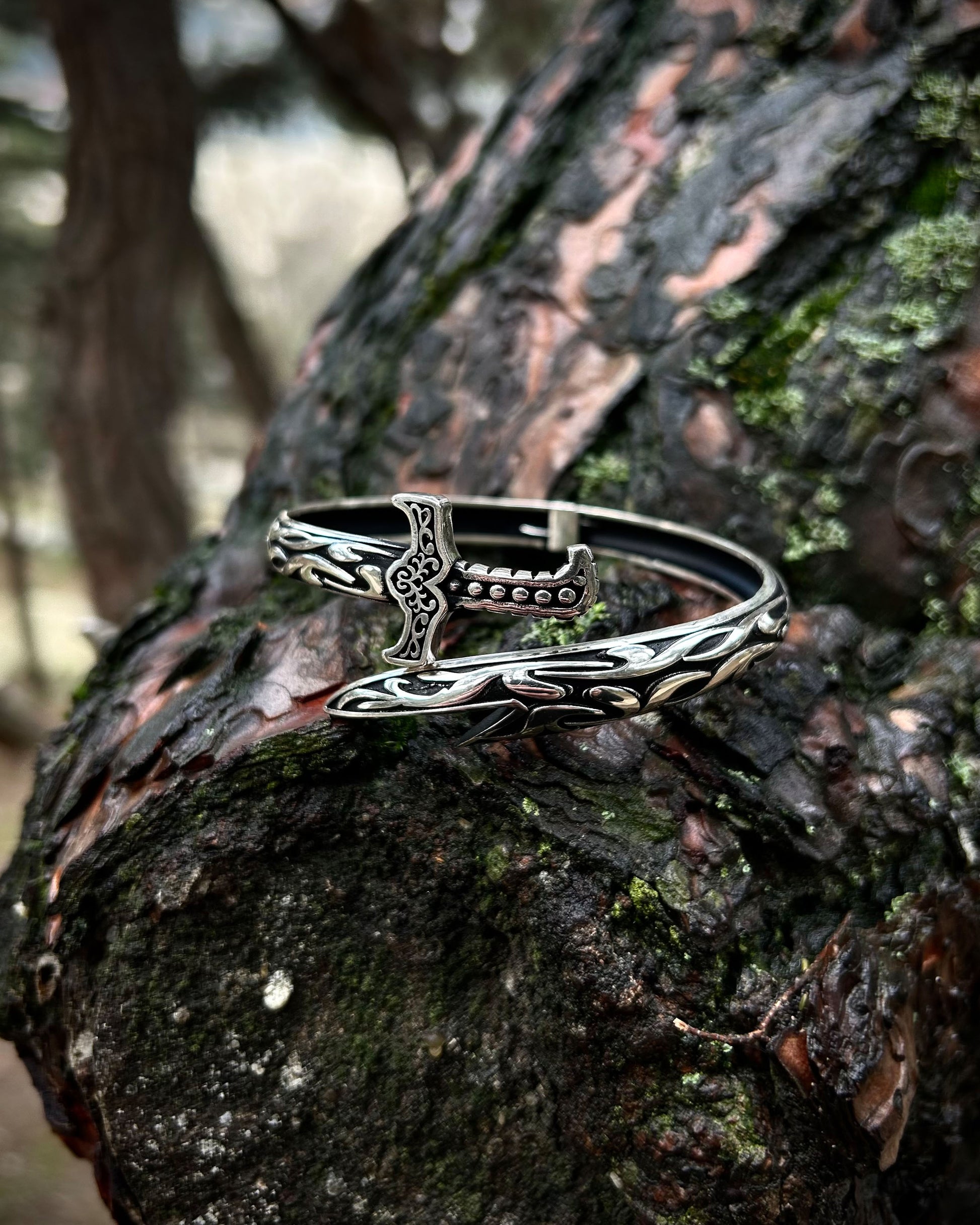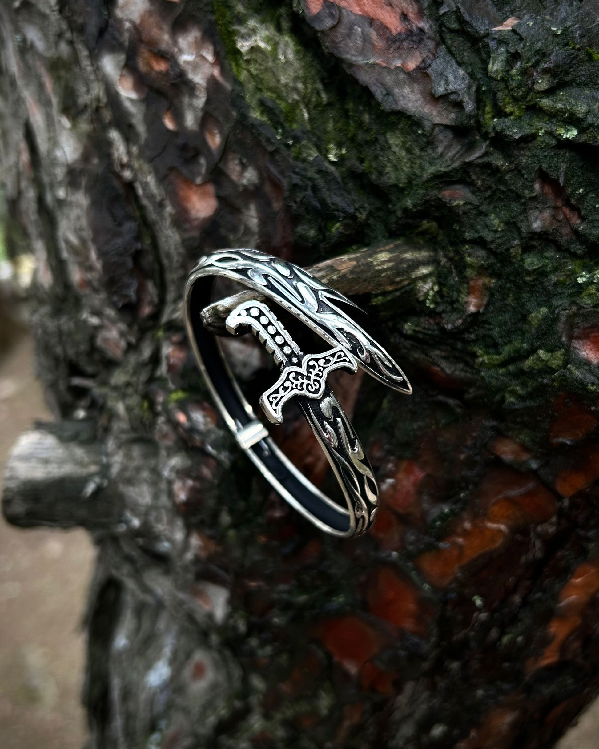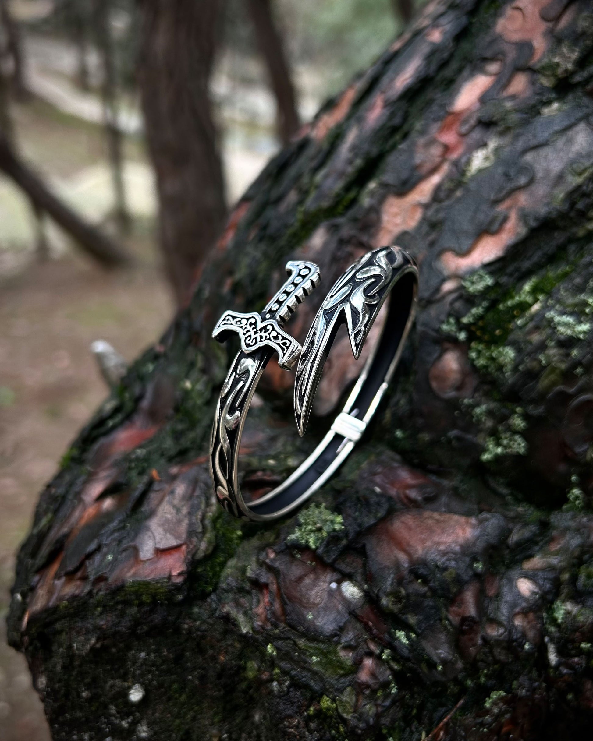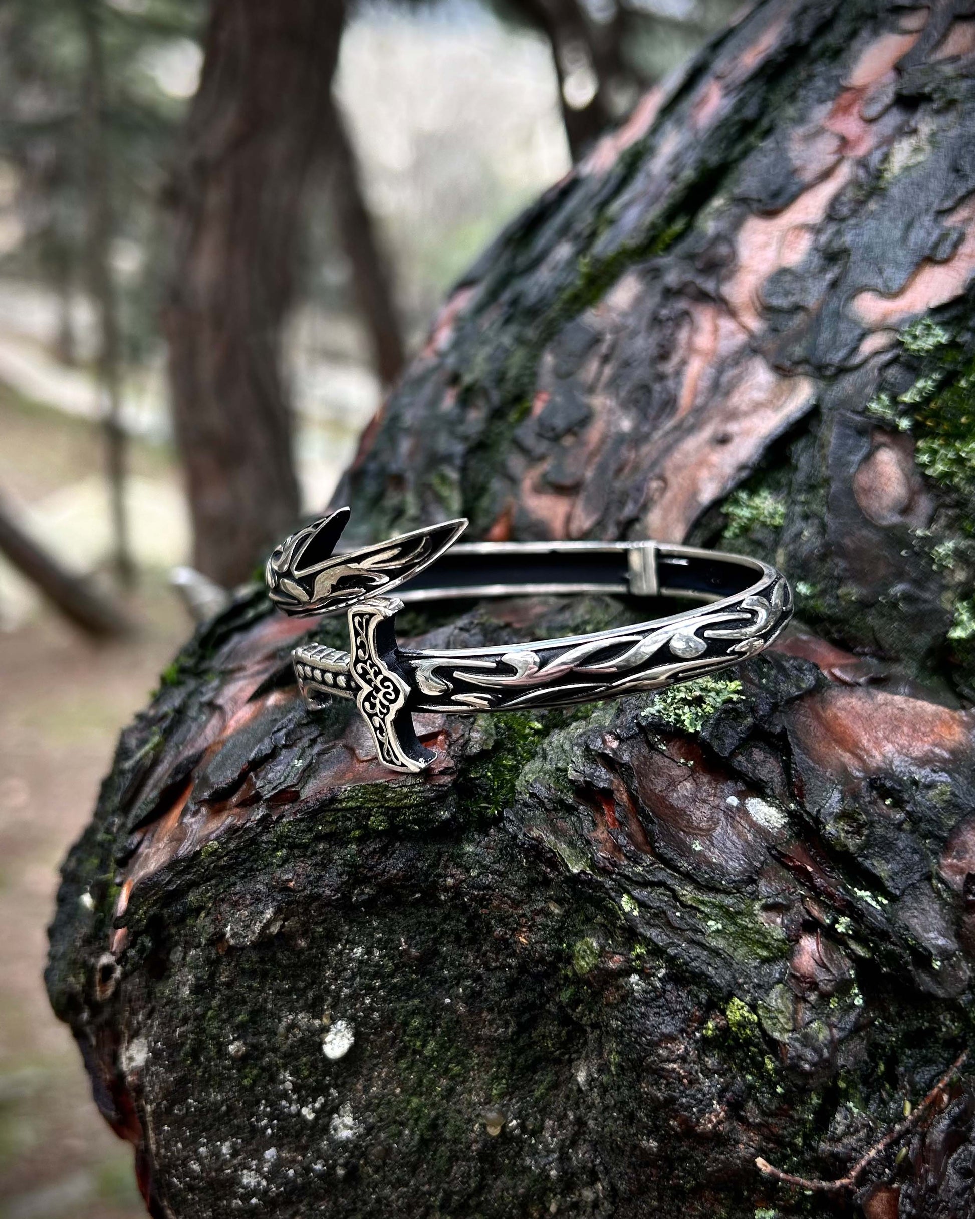 925 ayar gümüşten el işçiliğiyle üretilmiş bu cuff bilezik, oksitli yüzeyi ve kılıç formuyla dikkat çeker. Ayarlanabilir yapısı sayesinde farklı bilek ölçülerine kolayca uyum sağlar.