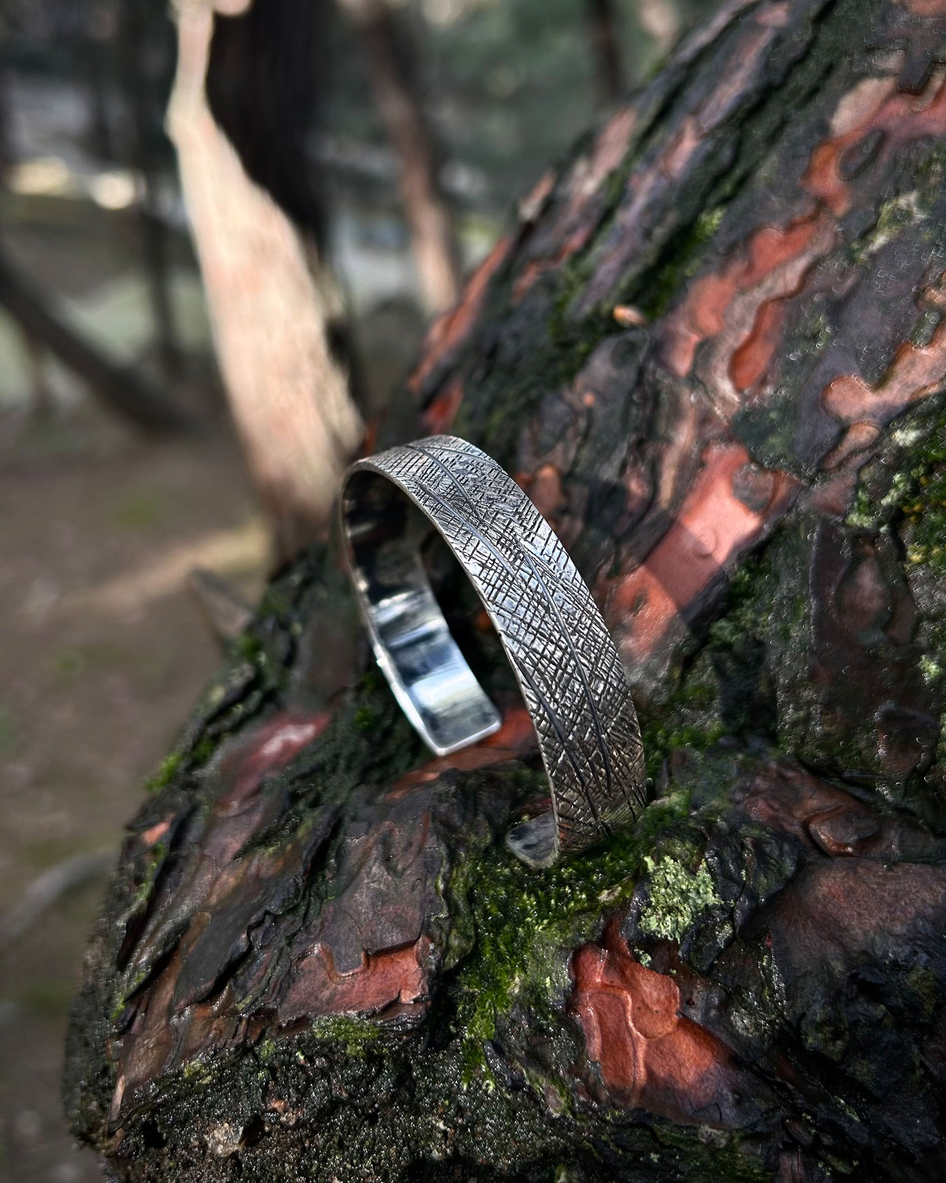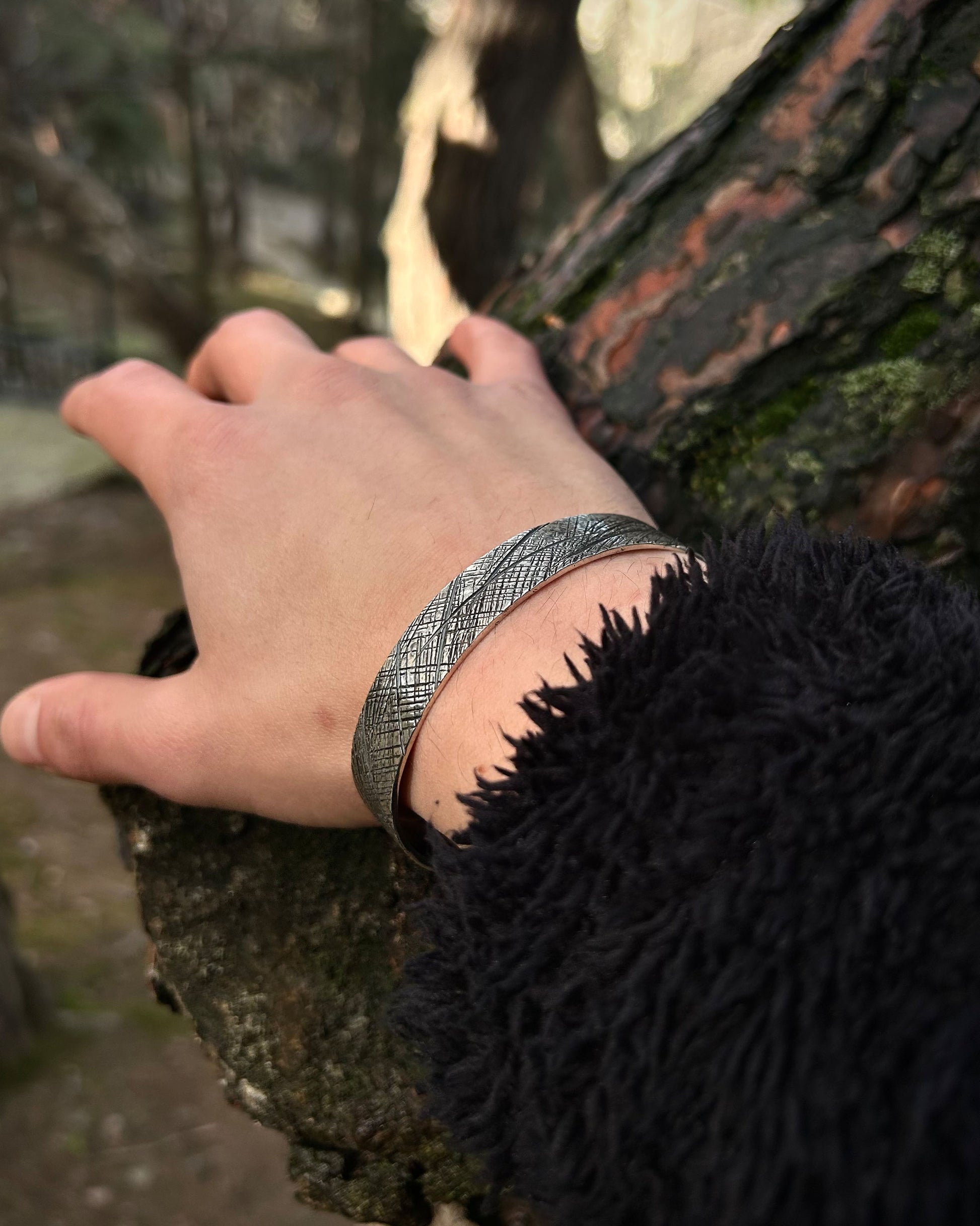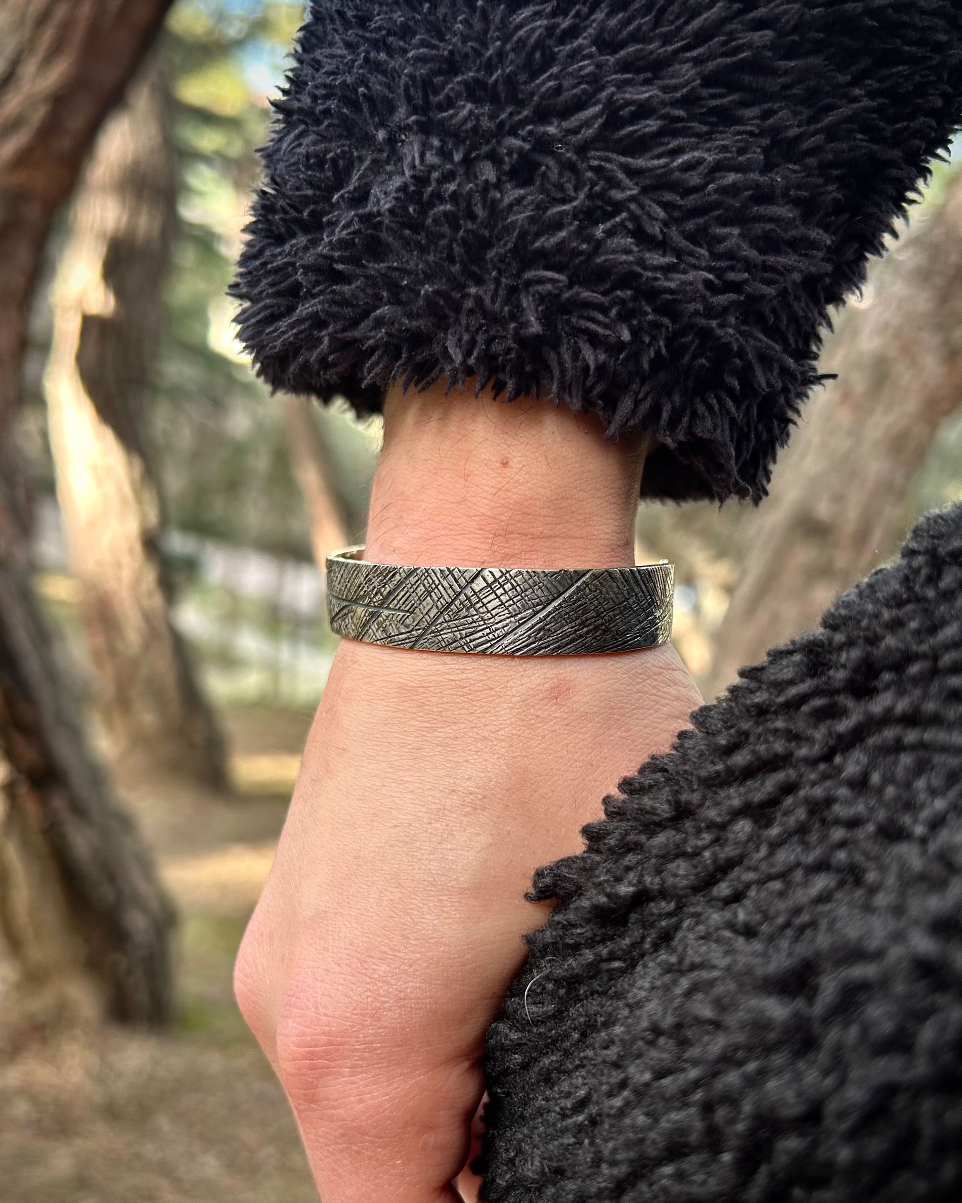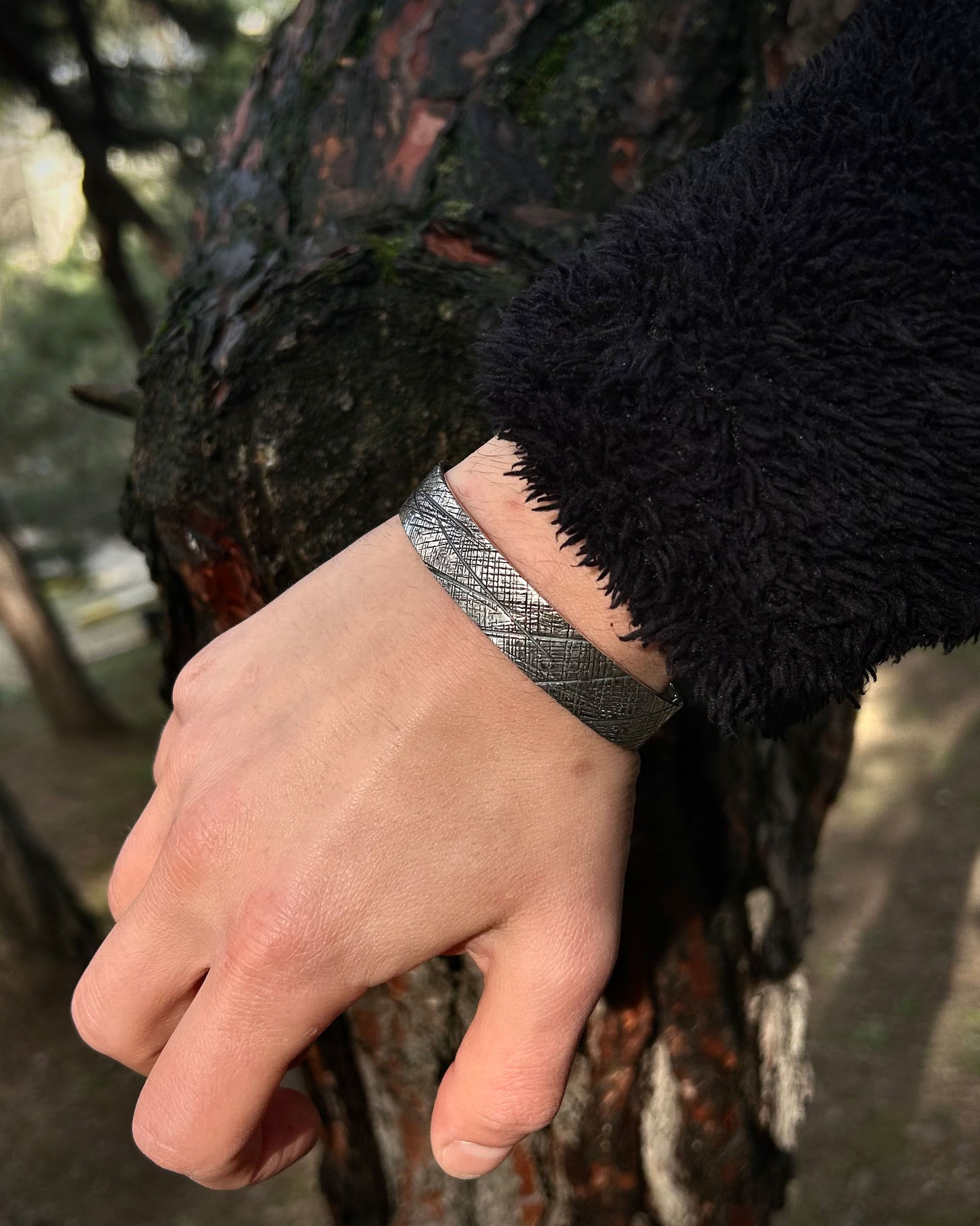 925 ayar gümüşten el işçiliğiyle üretilmiş, eskitme (savaş çizikleri) yüzeyli bilezik, ayarlanabilir yapısı sayesinde farklı bilek ölçülerine uyum sağlar.