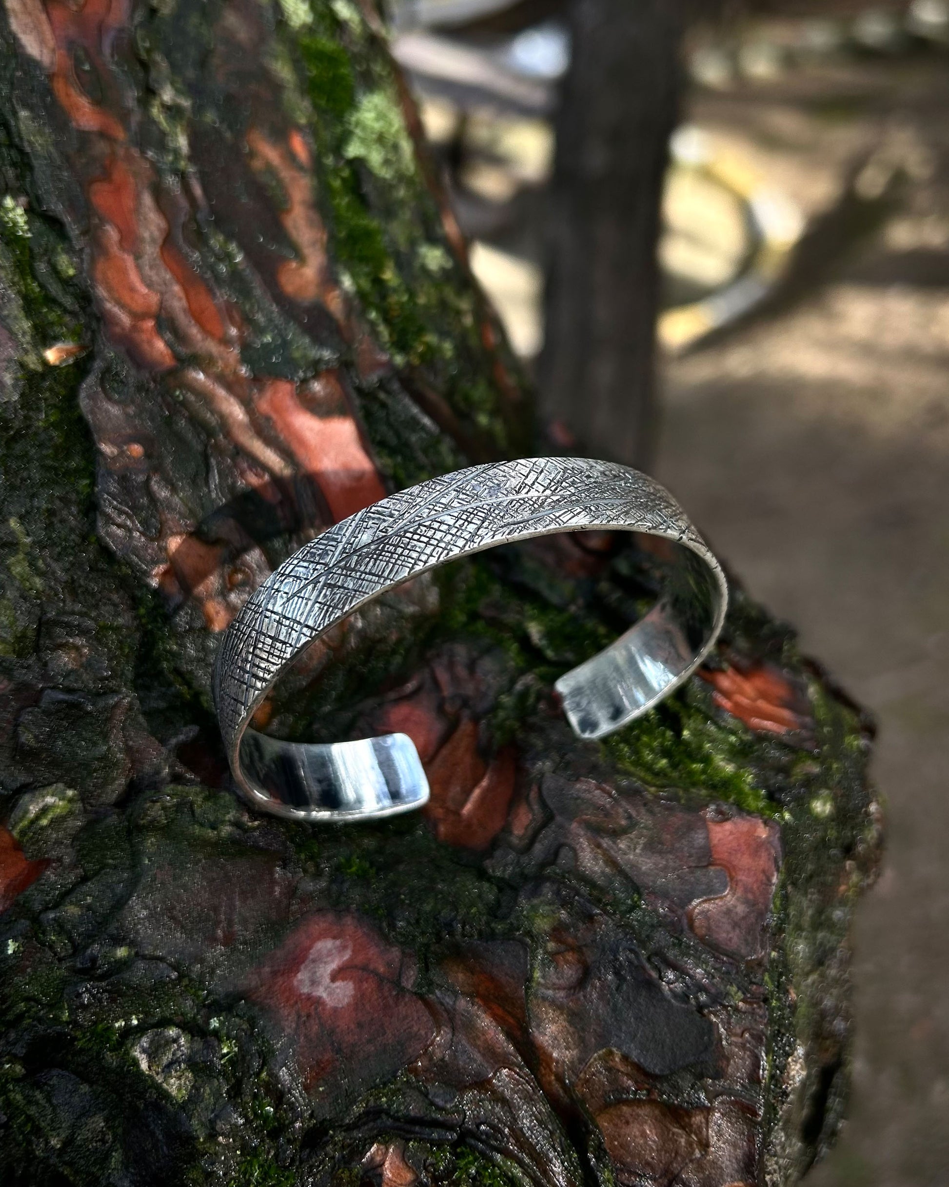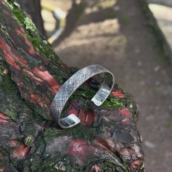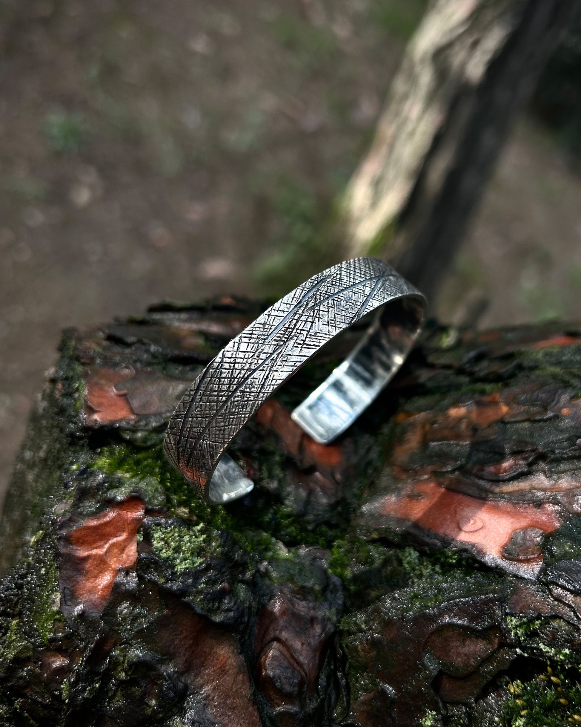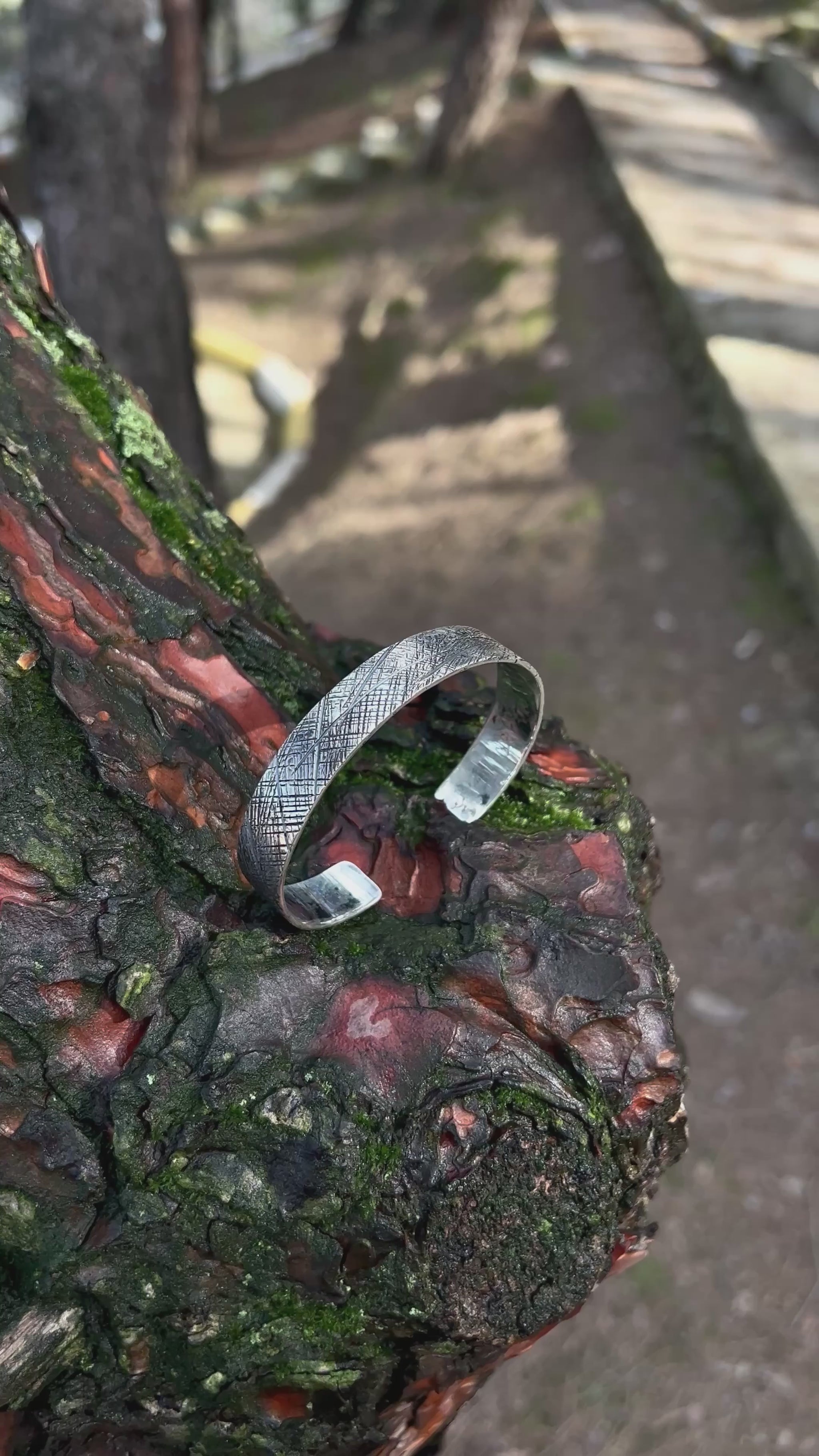 925 ayar gümüşten el işçiliğiyle üretilmiş, eskitme (savaş çizikleri) yüzeyli bilezik, ayarlanabilir yapısı sayesinde farklı bilek ölçülerine uyum sağlar.